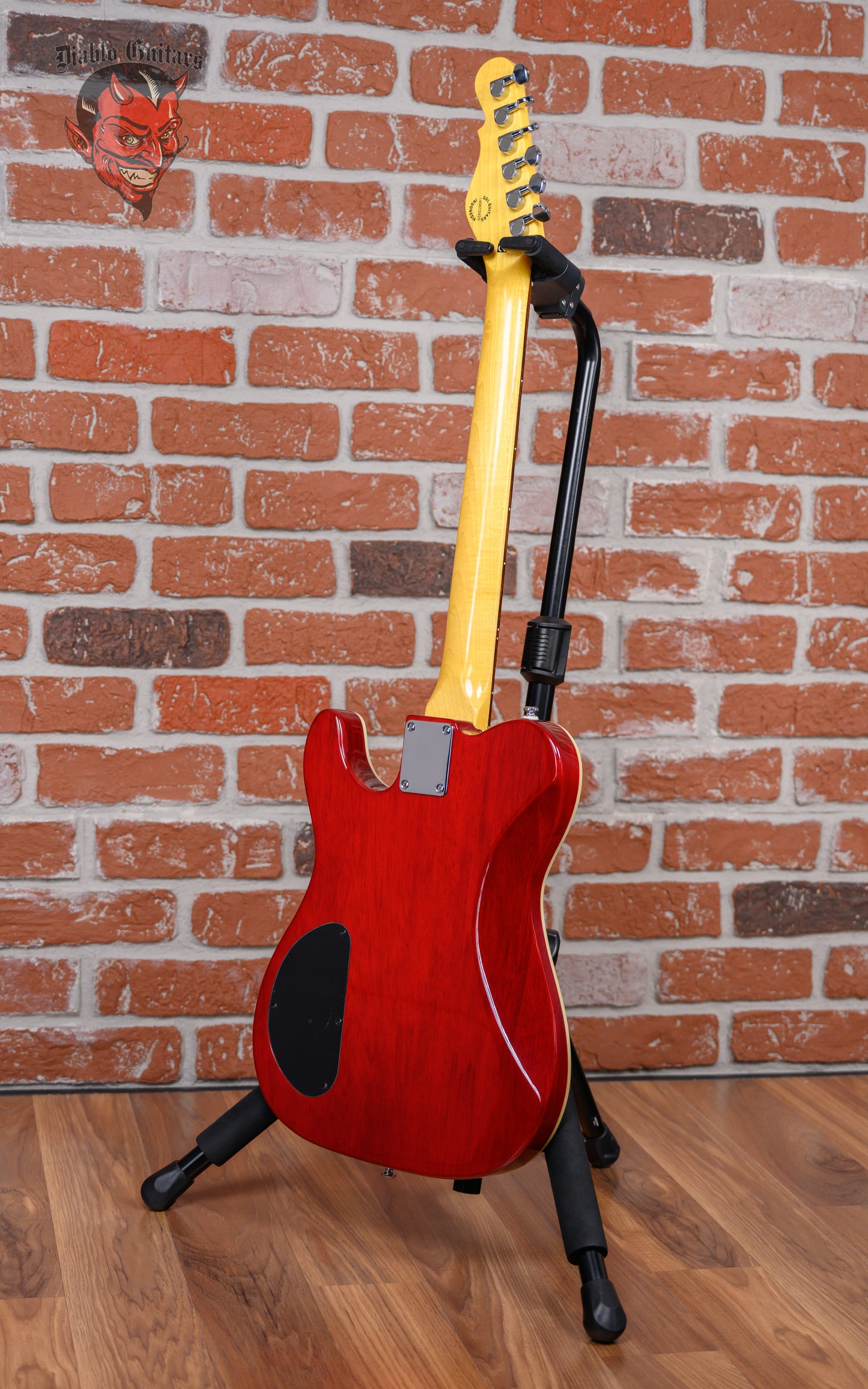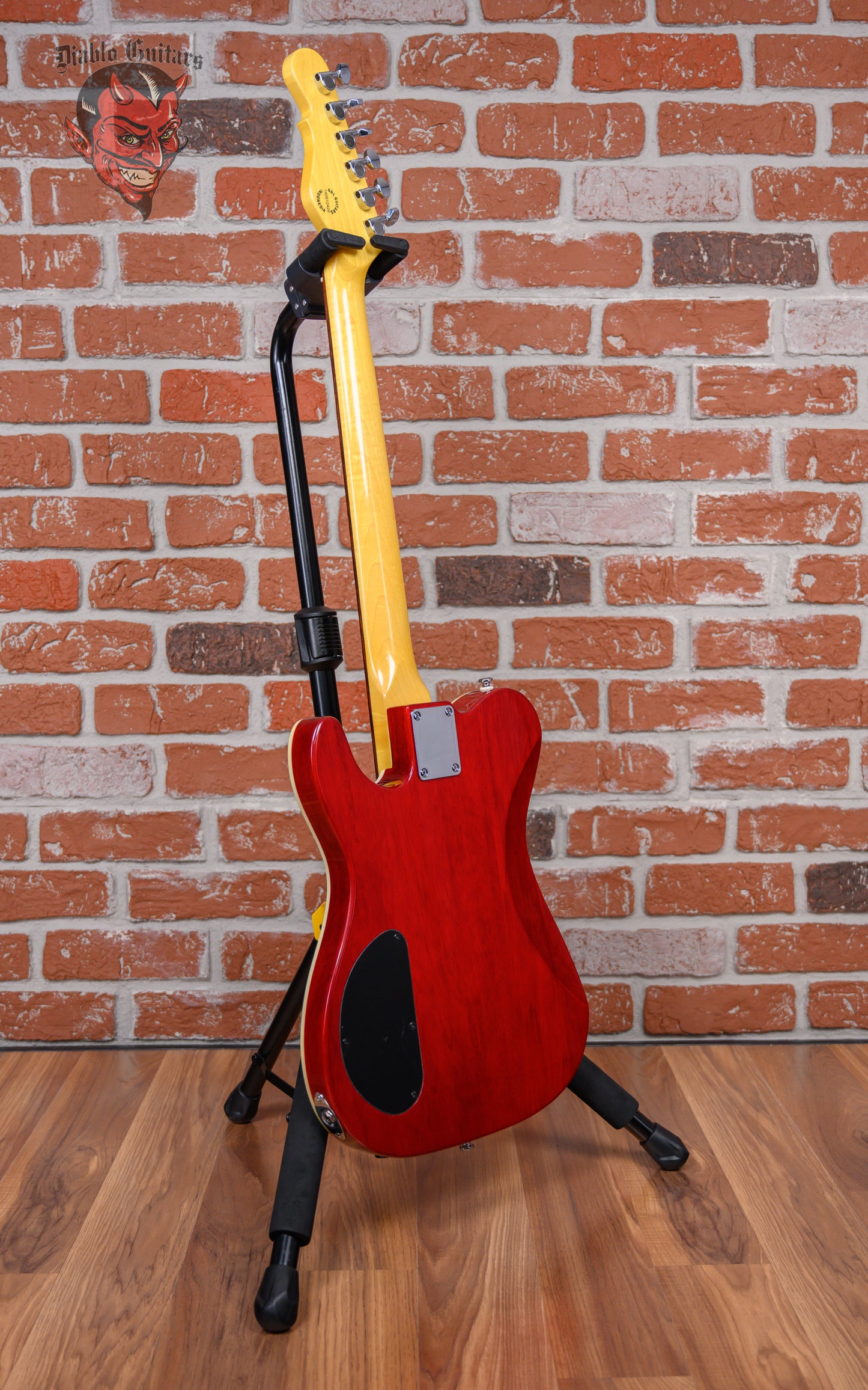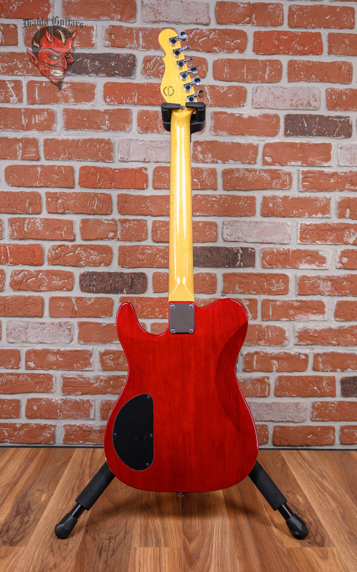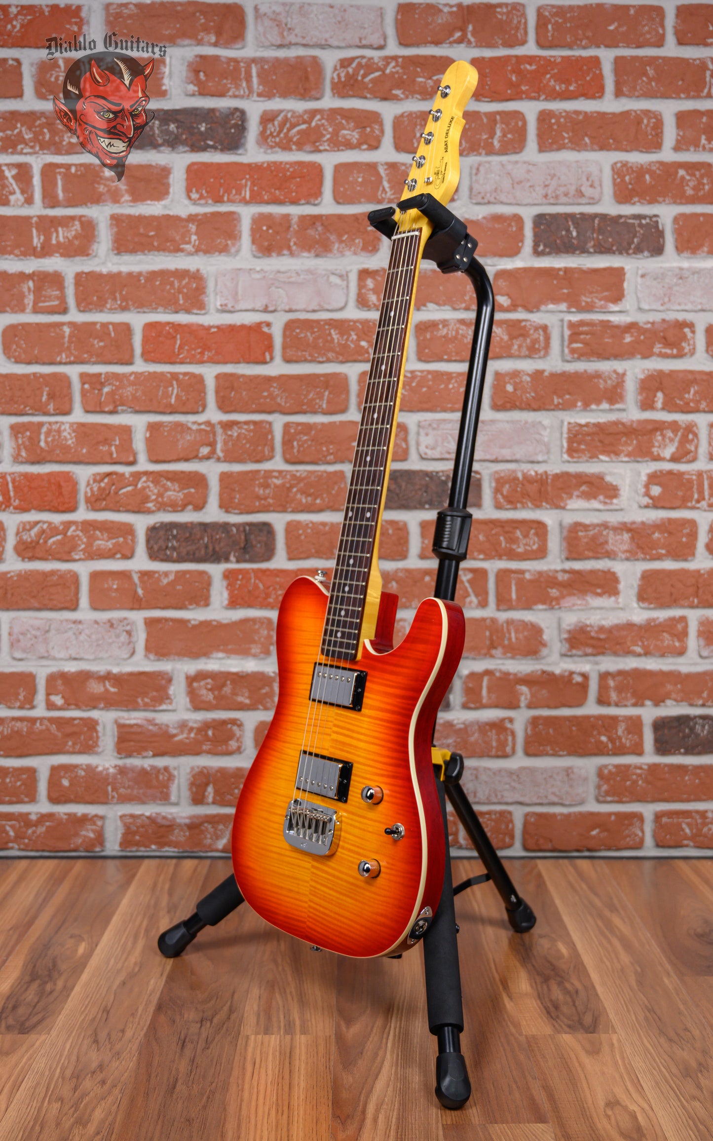 G&L Tribute ASAT Deluxe Carved Top in Cherry Sunburst finish made in 2014 with Gigbag. This guitar features a solid mahogany body with a bound flamed maple top, hard rock maple neck and rosewood fingerboard. Equipped with a G&L PTP6042 in the neck position and a G&L PTP6043 in the bridge position. Controlled by 1 volume pot, 1 tone pot with push/pull coil tap and a 3-Way toggle switch. The 25.5" scale length neck has white dot inlays and white side markers with 22 medium frets on a 12" radius with a Classic C profile. The hardware is comprised of chrome sealed die-cast tuning machines with cloche heads, a synthetic nut, a G&L Saddle Lock bridge and chrome knurled dome knobs.
