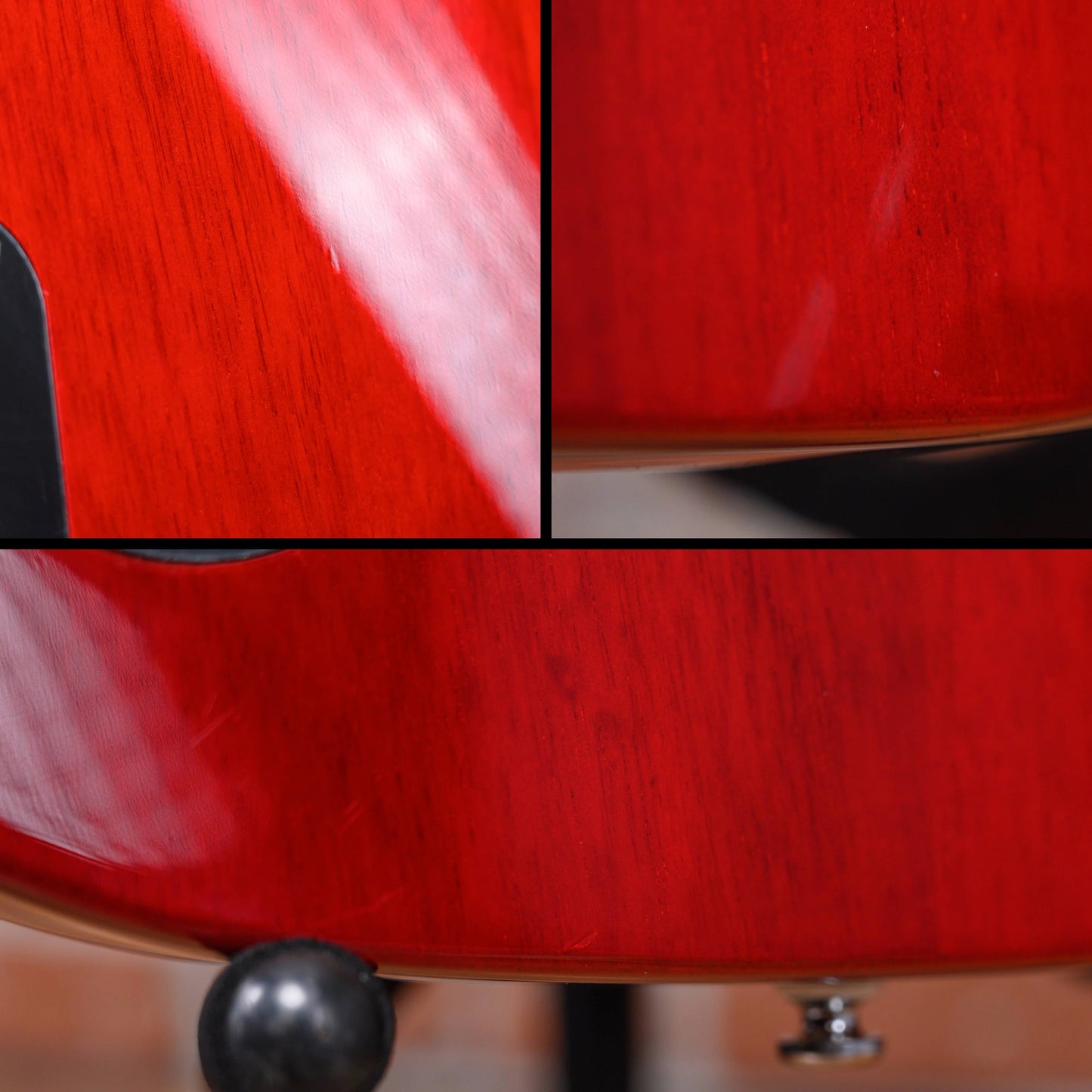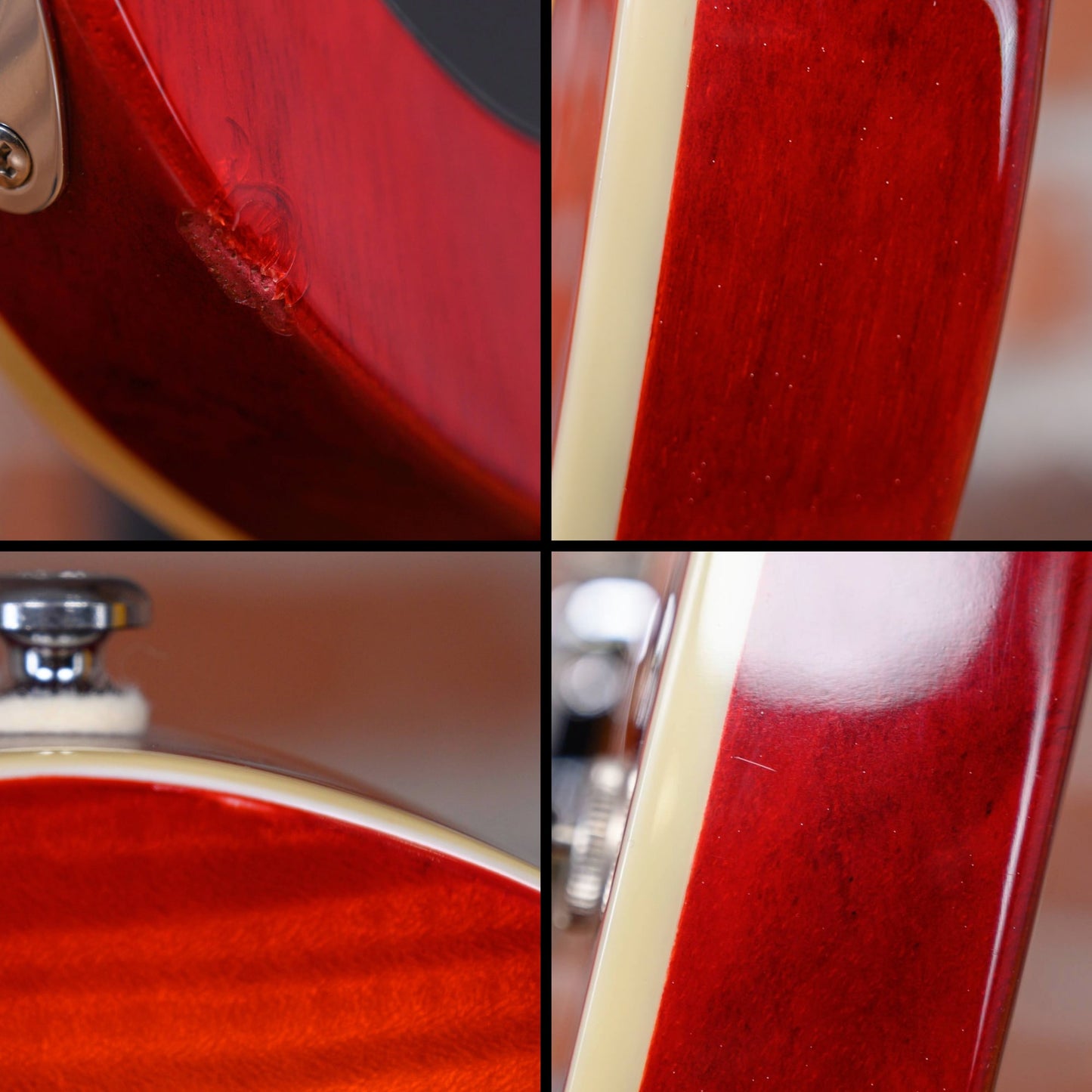 This guitar is in overall very good condition. The tuners show some sign of age with light surface marks. There is some light finish delamination on the treble side of the fretboard. There is a small ding on the bass side of the neck pocket. There are some light dings and scuffs on the body and a dent near the output jack. (See pics)