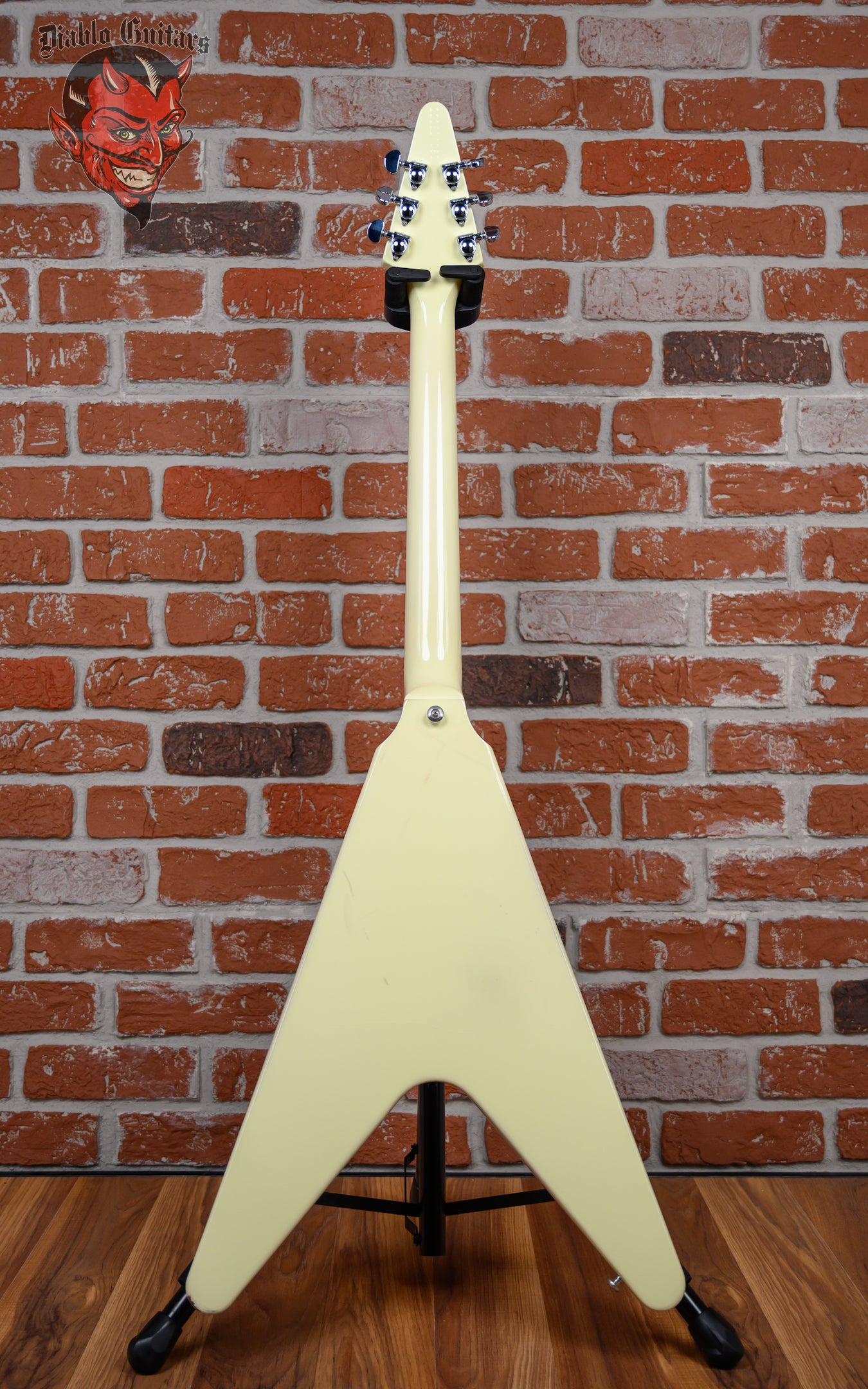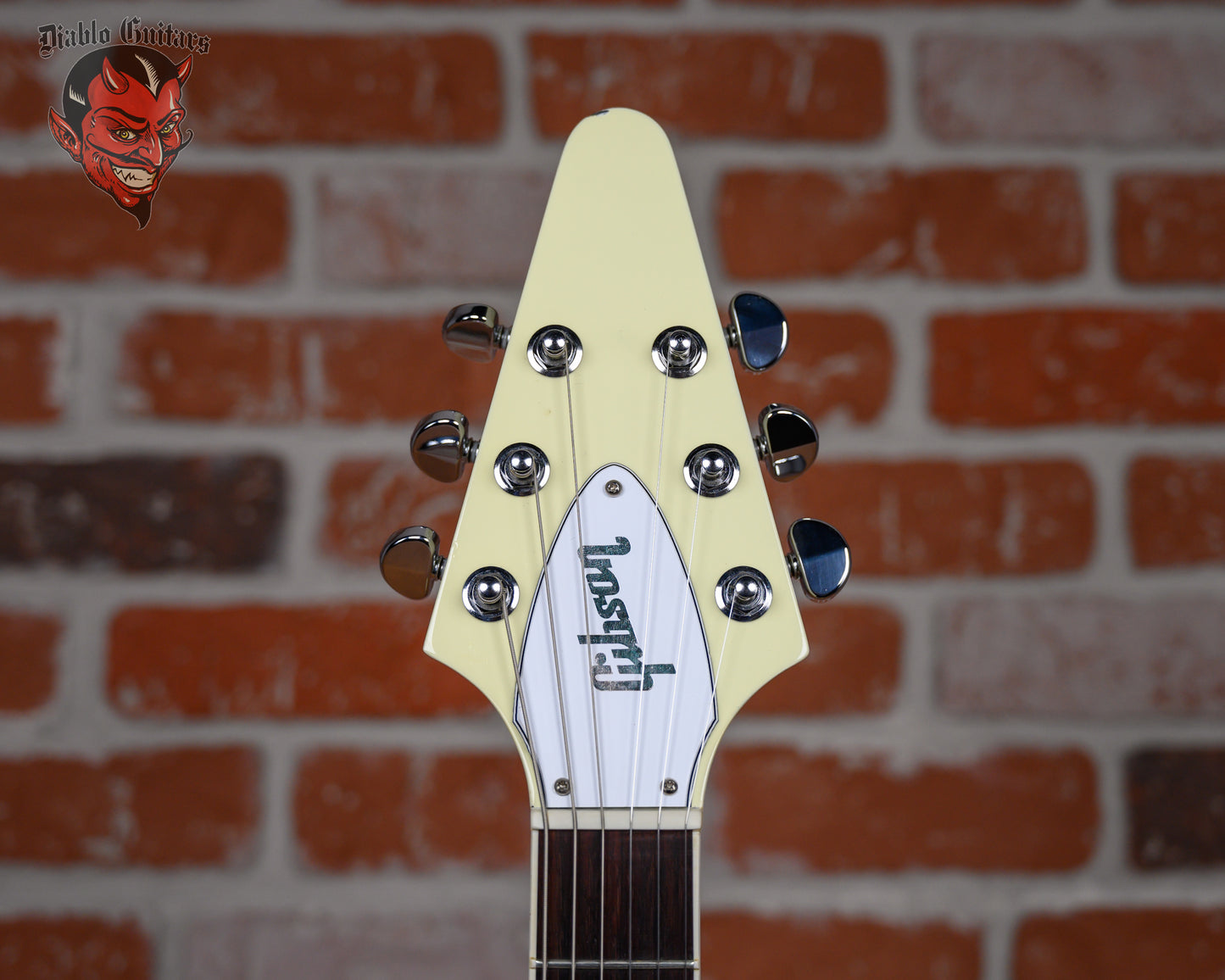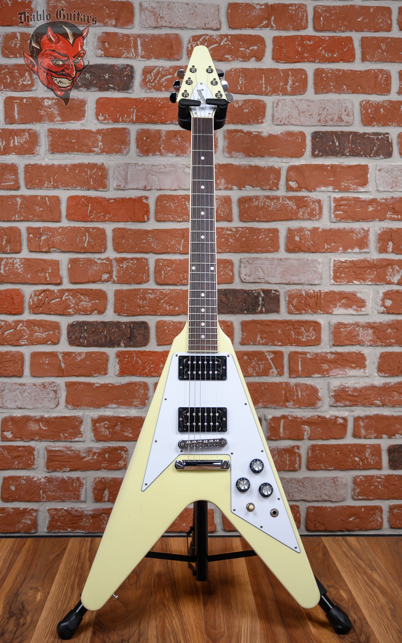 Gibson 70's Flying V in Classic White finish made in 2022 with Original Hard Shell Case. This guitar features a solid mahogany body, mahogany neck and bound rosewood fingerboard with a color matched headstock. Equipped with a Gibson RHY 70s Tribute in the neck position and a Gibson Lead 70s Tribute in the bridge position. Controlled by 2 volume, 1 tone pot and a 3-Way toggle switch. The 24.75" scale length neck has pearloid dot inlays and black side markers with 22 medium jumbo frets on a 12" radius with a slim taper profile. The hardware is comprised of chrome Grover Rotomatic tuning machines with kidney heads, a graph tech nut, a Gibson Nashville Tune-O-Matic Bridge, and top hat reflector knobs with a 5-Ply White pickguard.