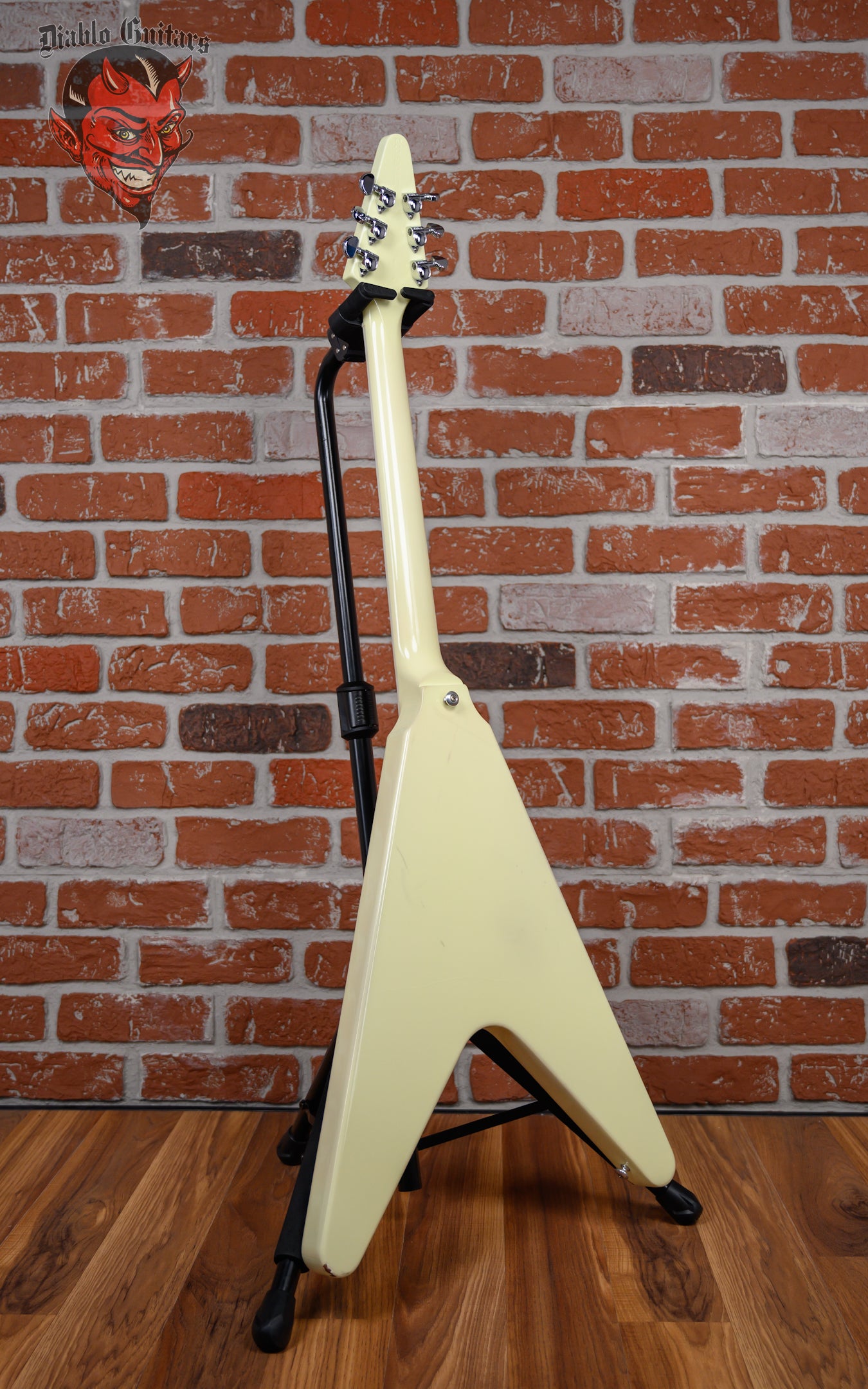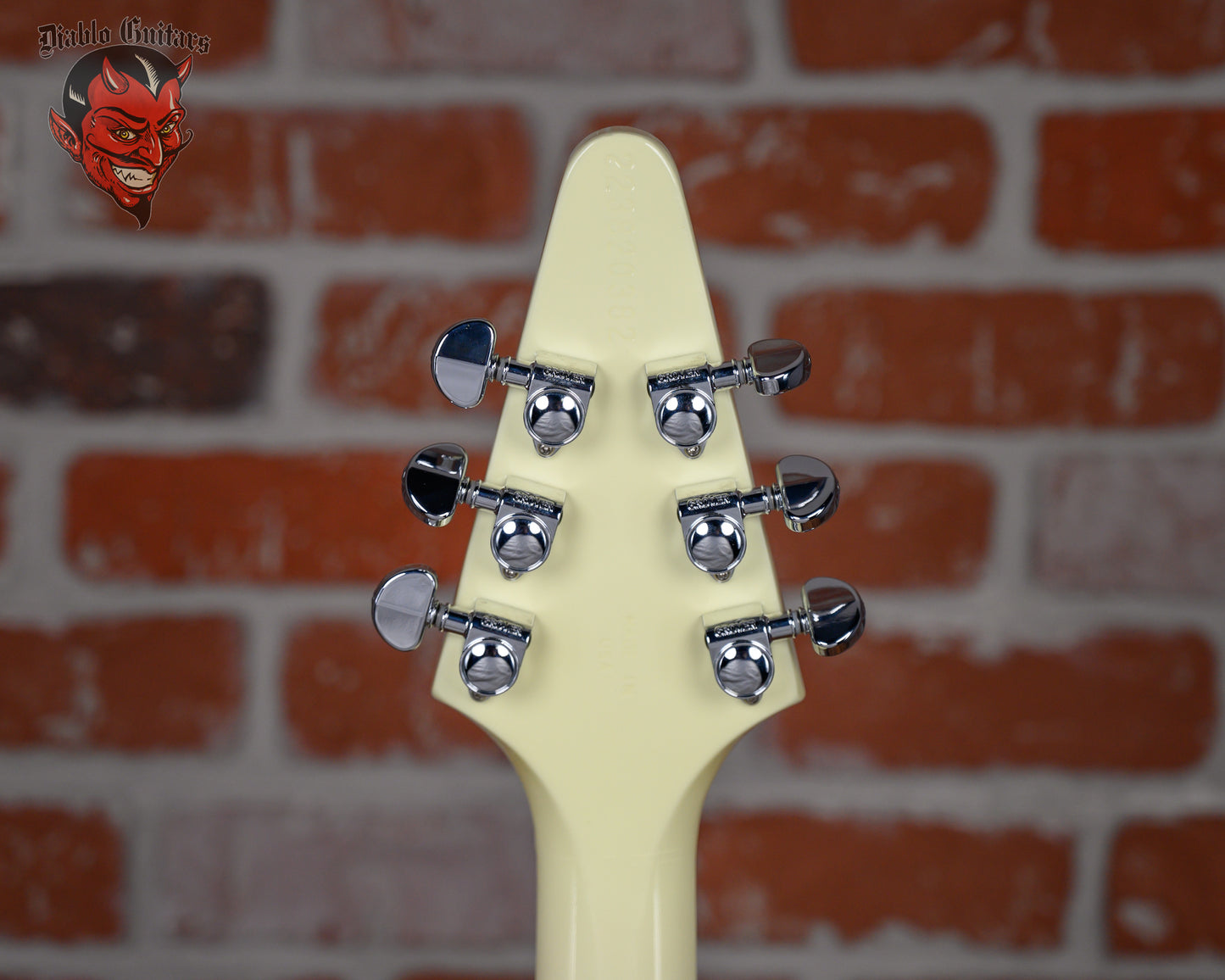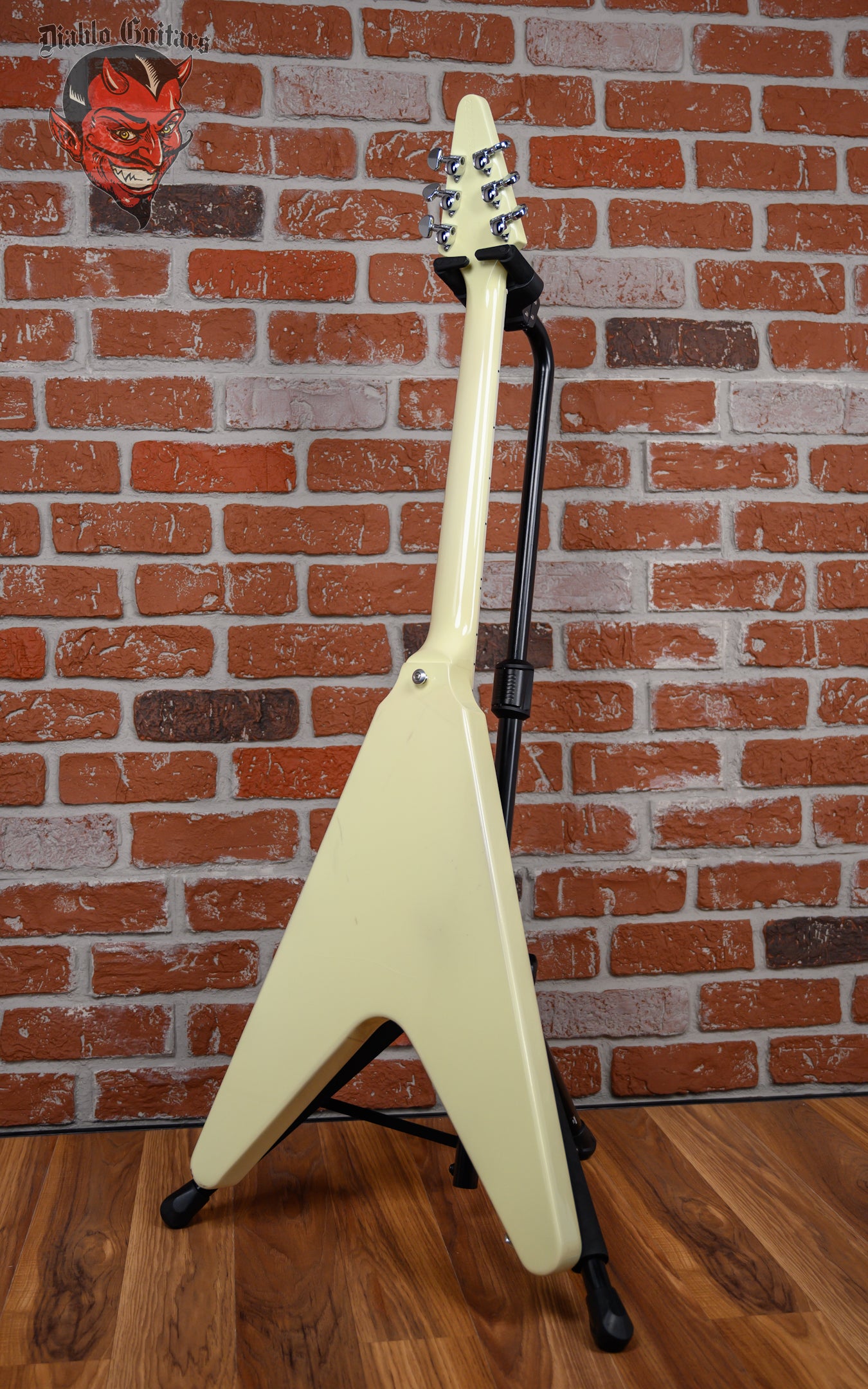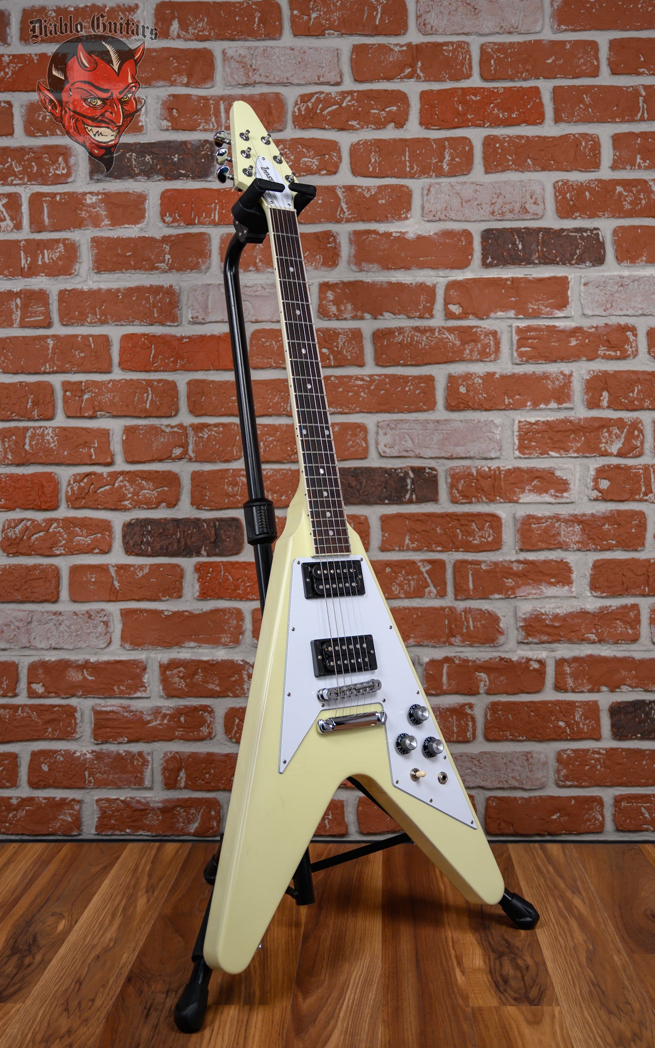 Gibson 70's Flying V in Classic White finish made in 2022 with Original Hard Shell Case. This guitar features a solid mahogany body, mahogany neck and bound rosewood fingerboard with a color matched headstock. Equipped with a Gibson RHY 70s Tribute in the neck position and a Gibson Lead 70s Tribute in the bridge position. Controlled by 2 volume, 1 tone pot and a 3-Way toggle switch. The 24.75" scale length neck has pearloid dot inlays and black side markers with 22 medium jumbo frets on a 12" radius with a slim taper profile. The hardware is comprised of chrome Grover Rotomatic tuning machines with kidney heads, a graph tech nut, a Gibson Nashville Tune-O-Matic Bridge, and top hat reflector knobs with a 5-Ply White pickguard.