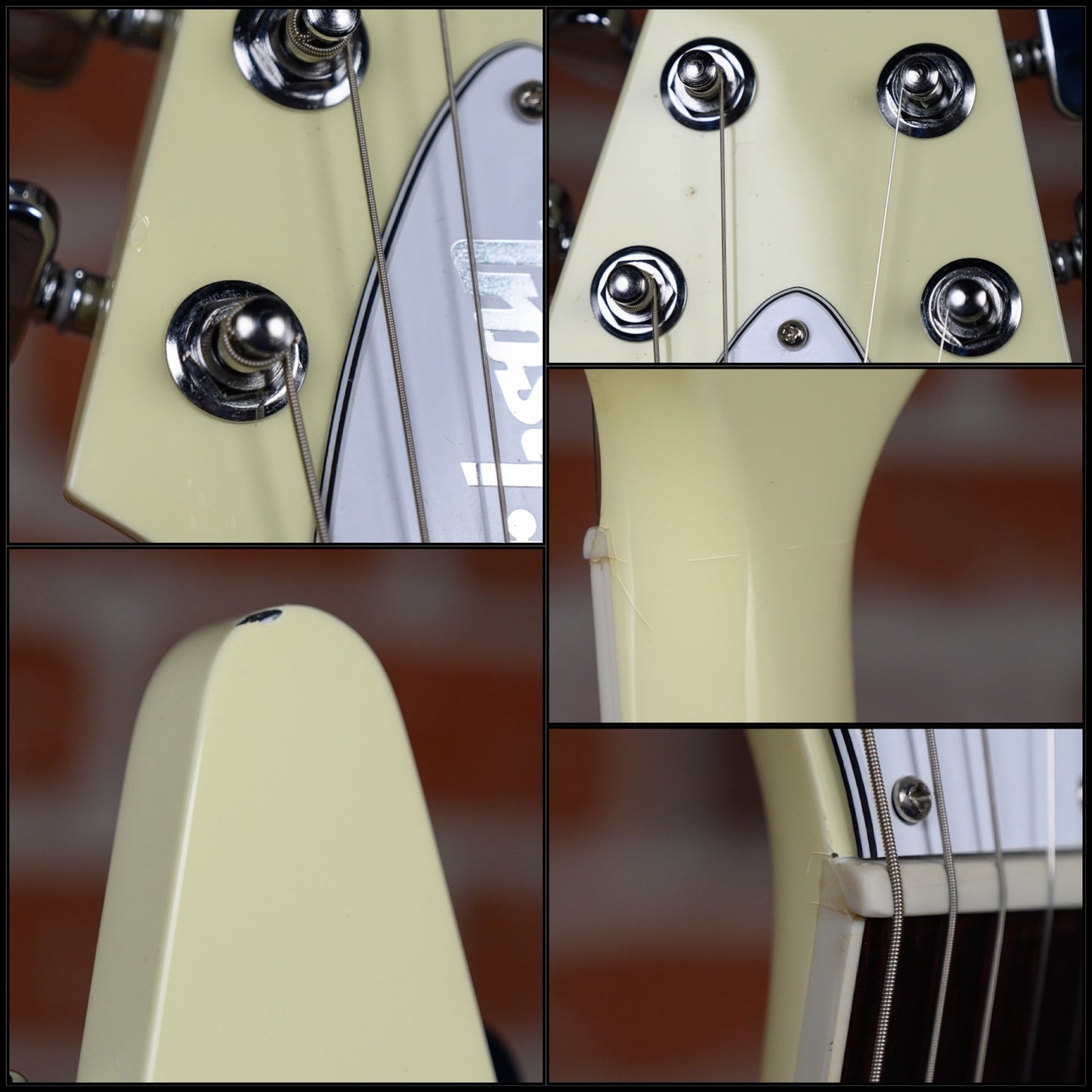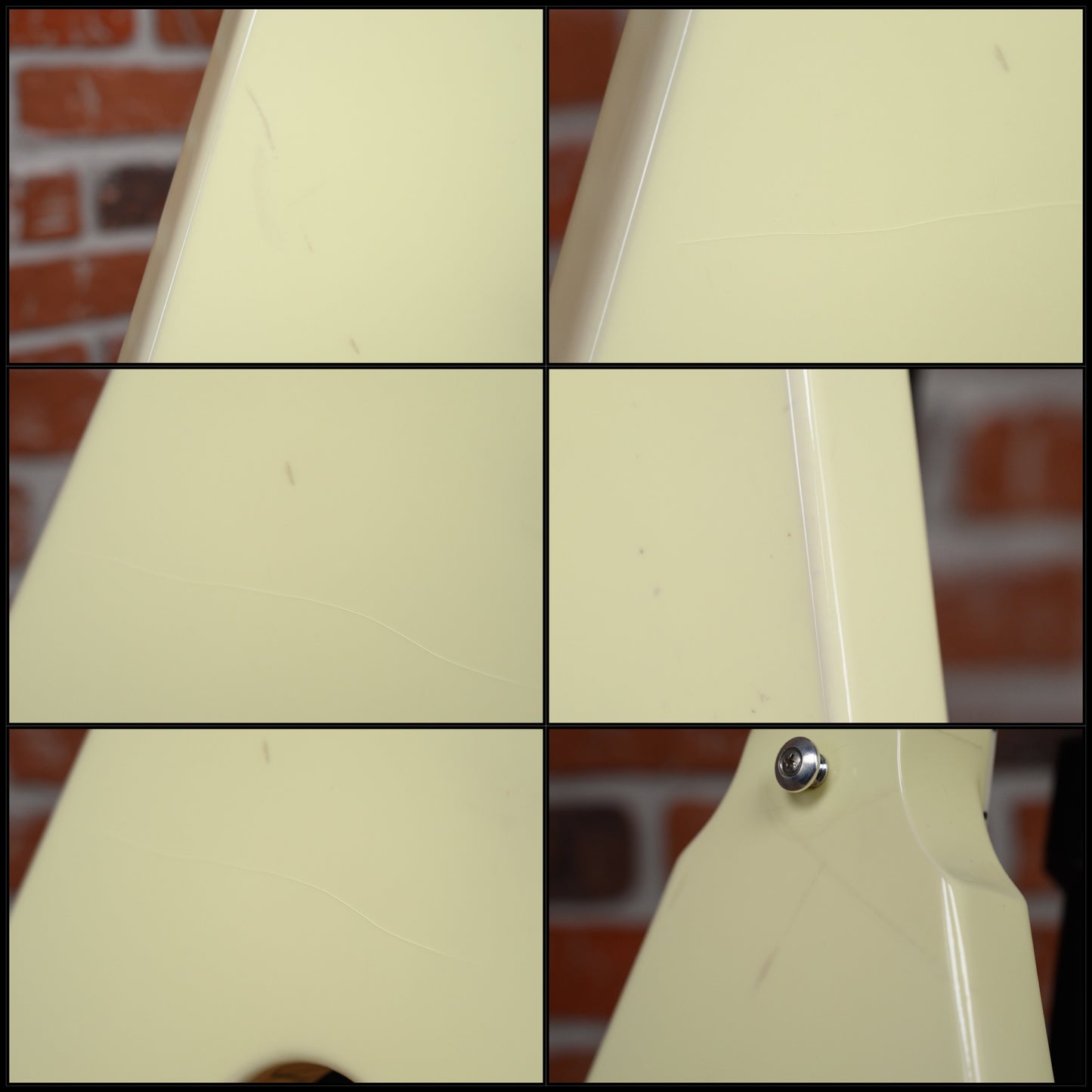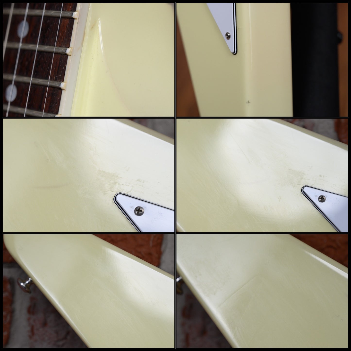 This guitar is in overall very good condition with some signs of play. The finish was some sighs of wear and some light discoloration. It has some finish check throughout the instrument, some surface marks, light surface scratches and some light dings& dimples. the headstock top front edge and rear lower edge of bottom wing has some finish chipping. (See Pics)