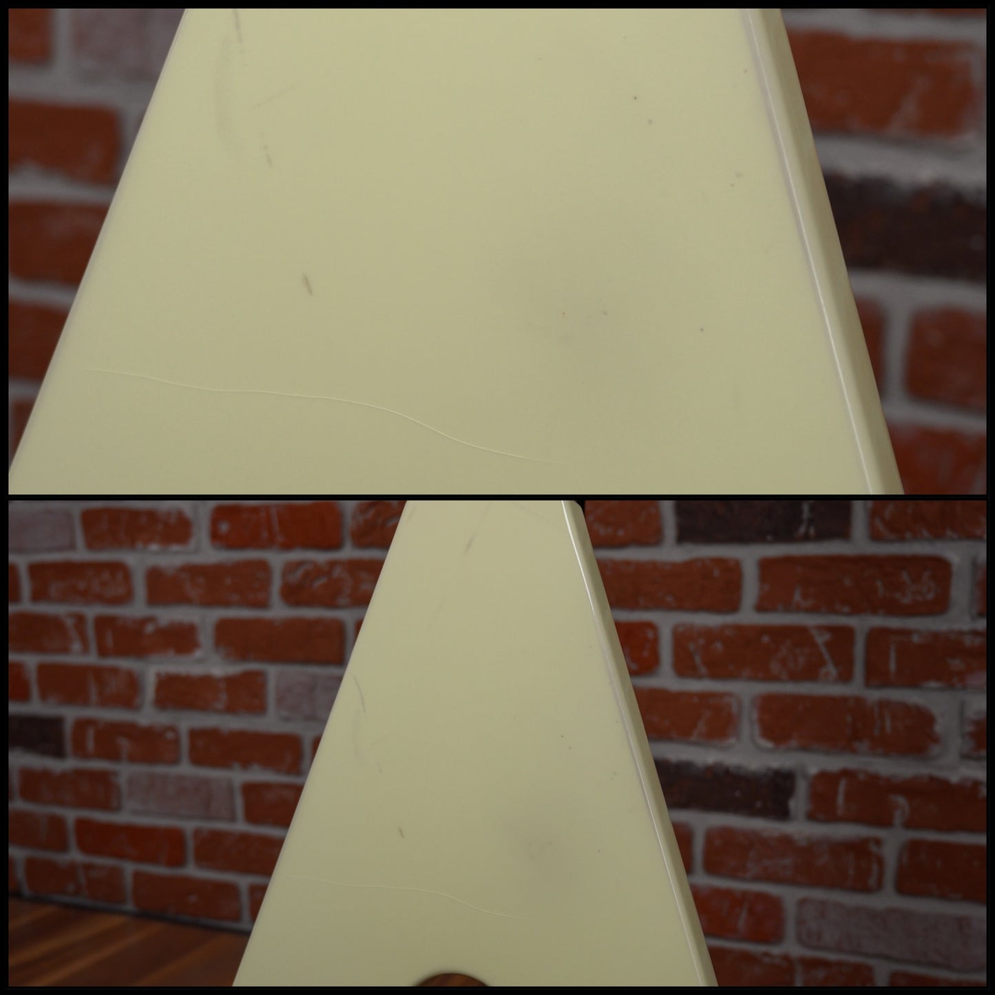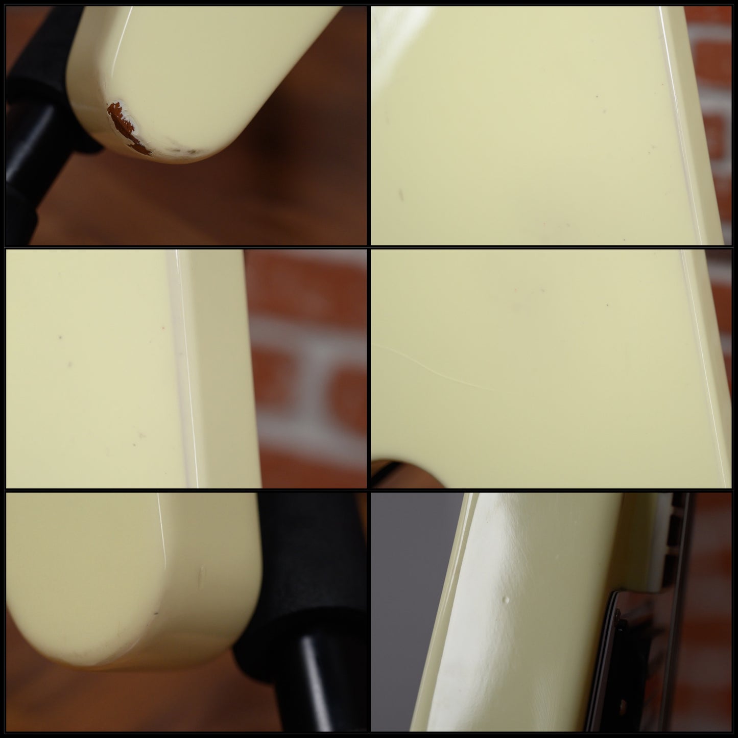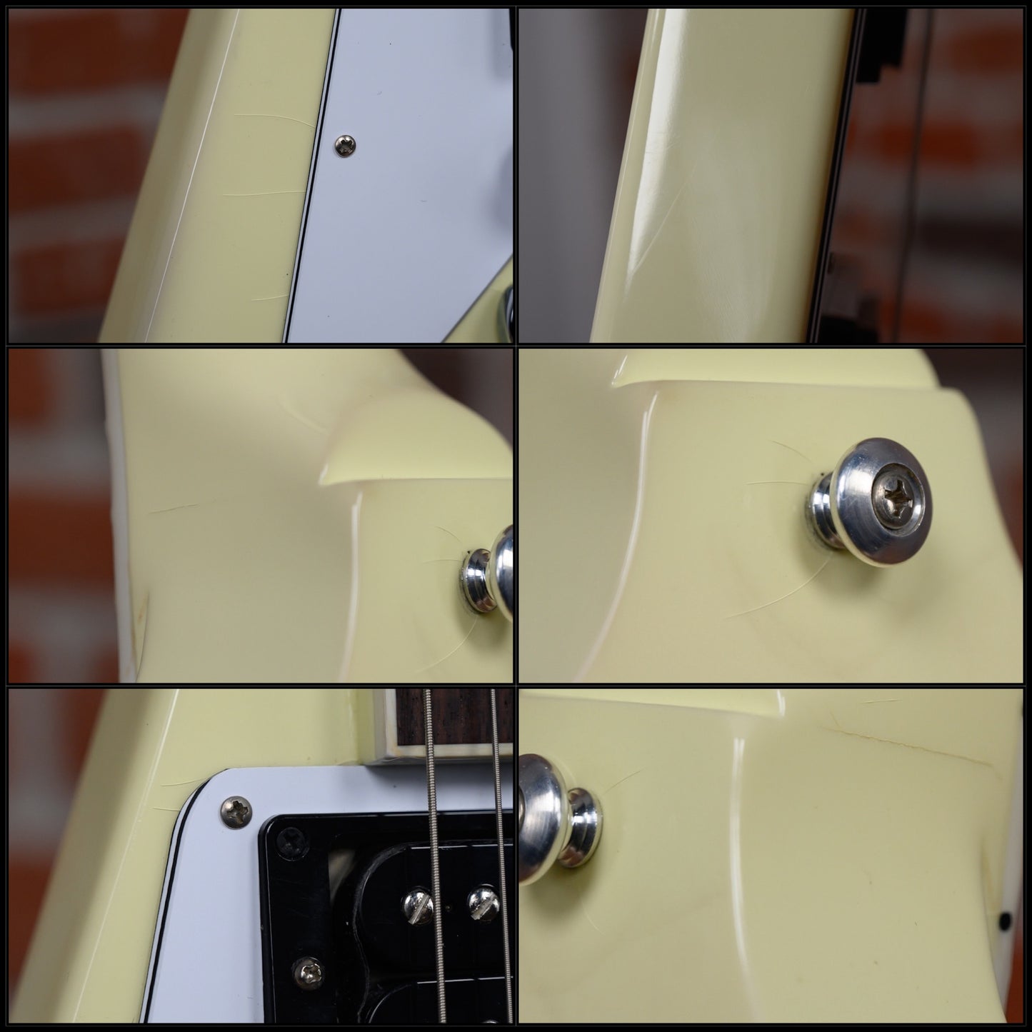 This guitar is in overall very good condition with some signs of play. The finish was some sighs of wear and some light discoloration. It has some finish check throughout the instrument, some surface marks, light surface scratches and some light dings& dimples. the headstock top front edge and rear lower edge of bottom wing has some finish chipping. (See Pics)