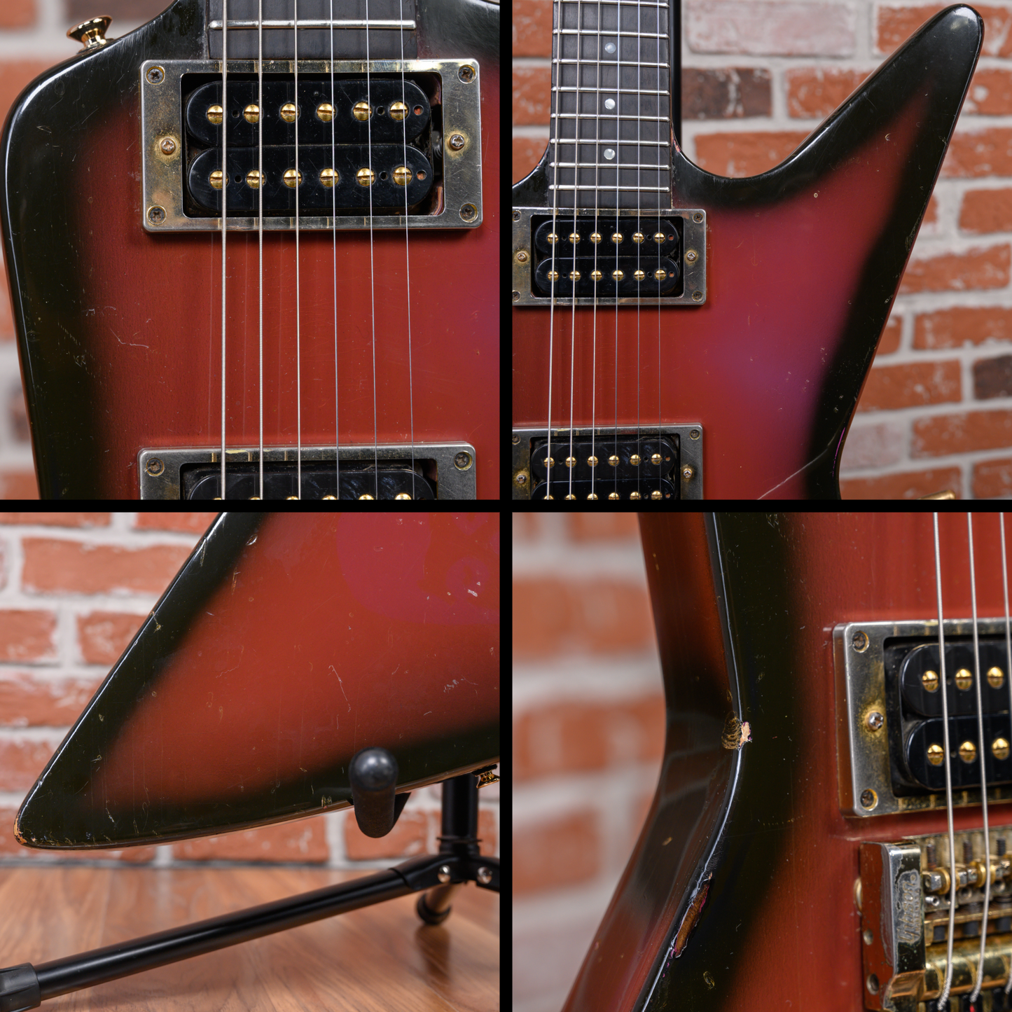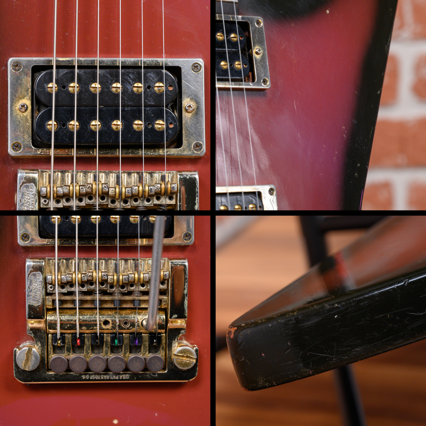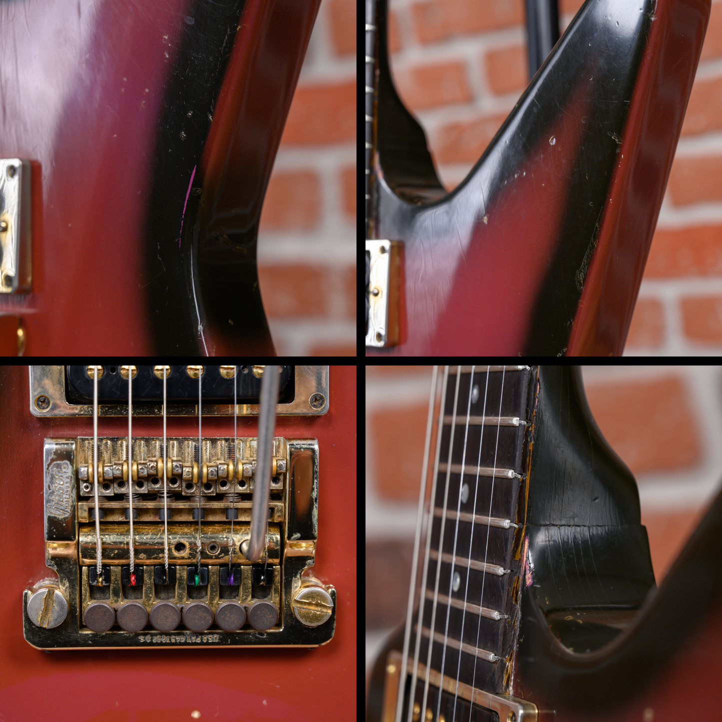 This guitar is in overall good condition. There is finish checking, light surface marks and small dings/dents throughout. At some point in its life, the bridge, frets, nut and strap buttons were changed. The clear coat has aged the purple into a more red-like color except for a patch near the pickups and a faint spot below the bridge where a crimson ghost decal was applied. The truss rod cover was modified for the installation of the new bridge. Much of the gold plating on the hardware is worn. The back of the body has some belt rash. The neck has some clear coat chipping along the sides from the refret. The output jack plate is missing a screw. (See Pics)
