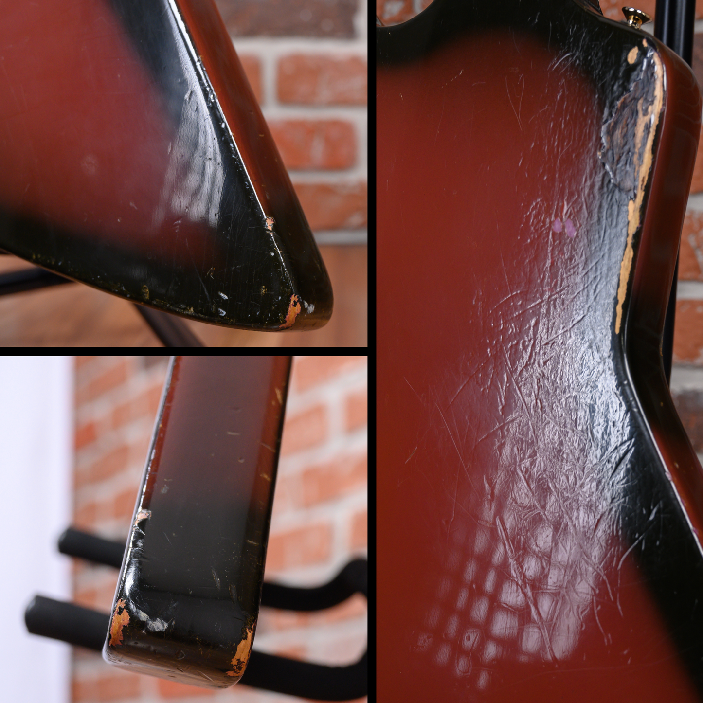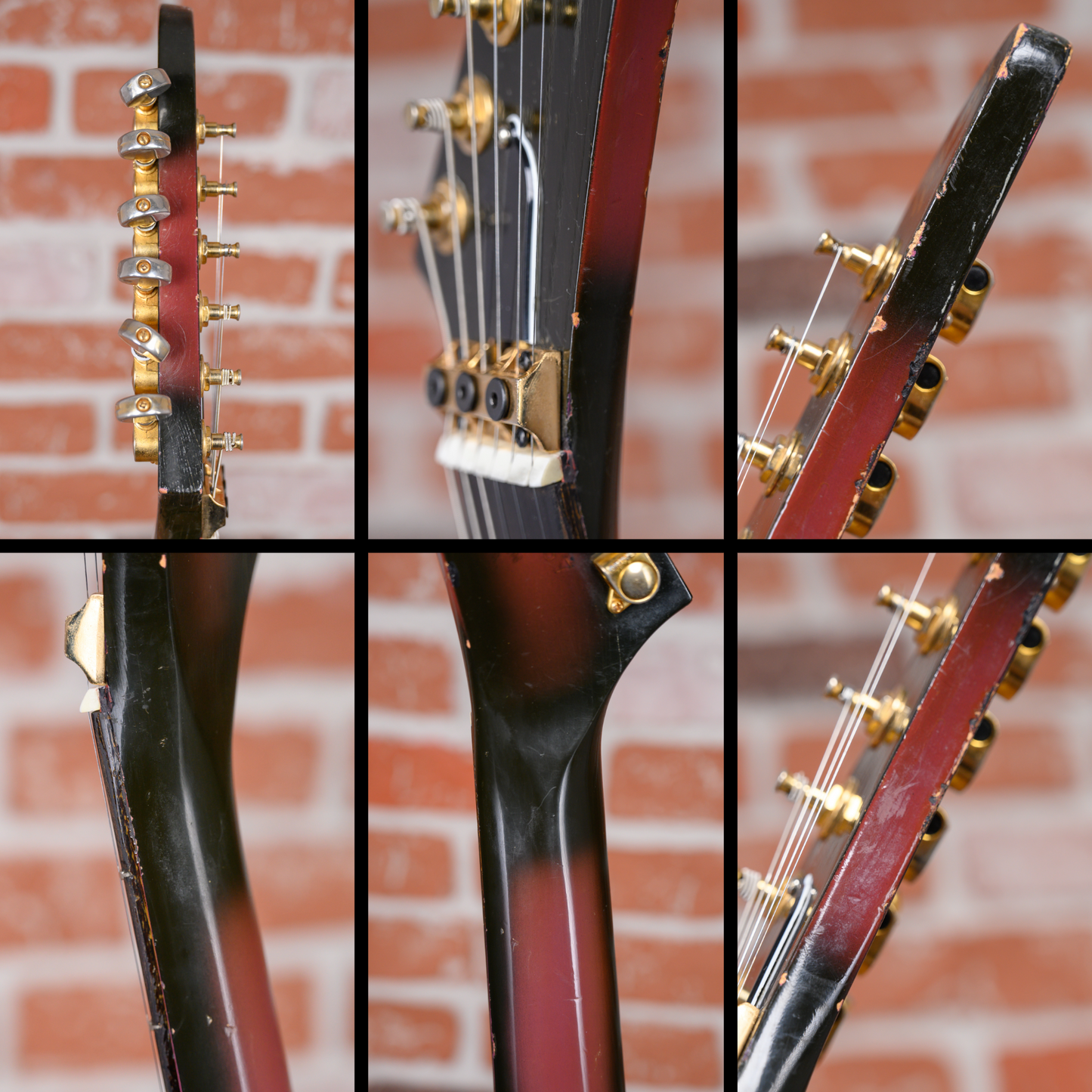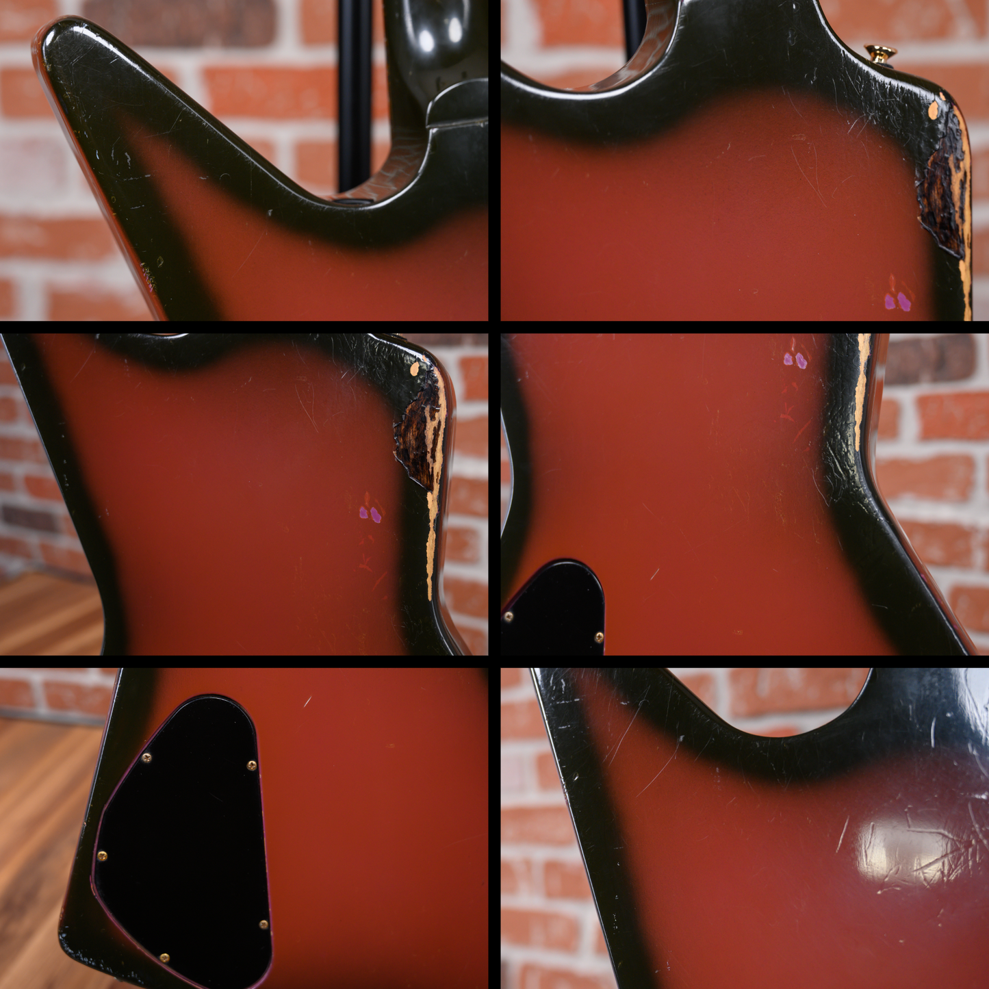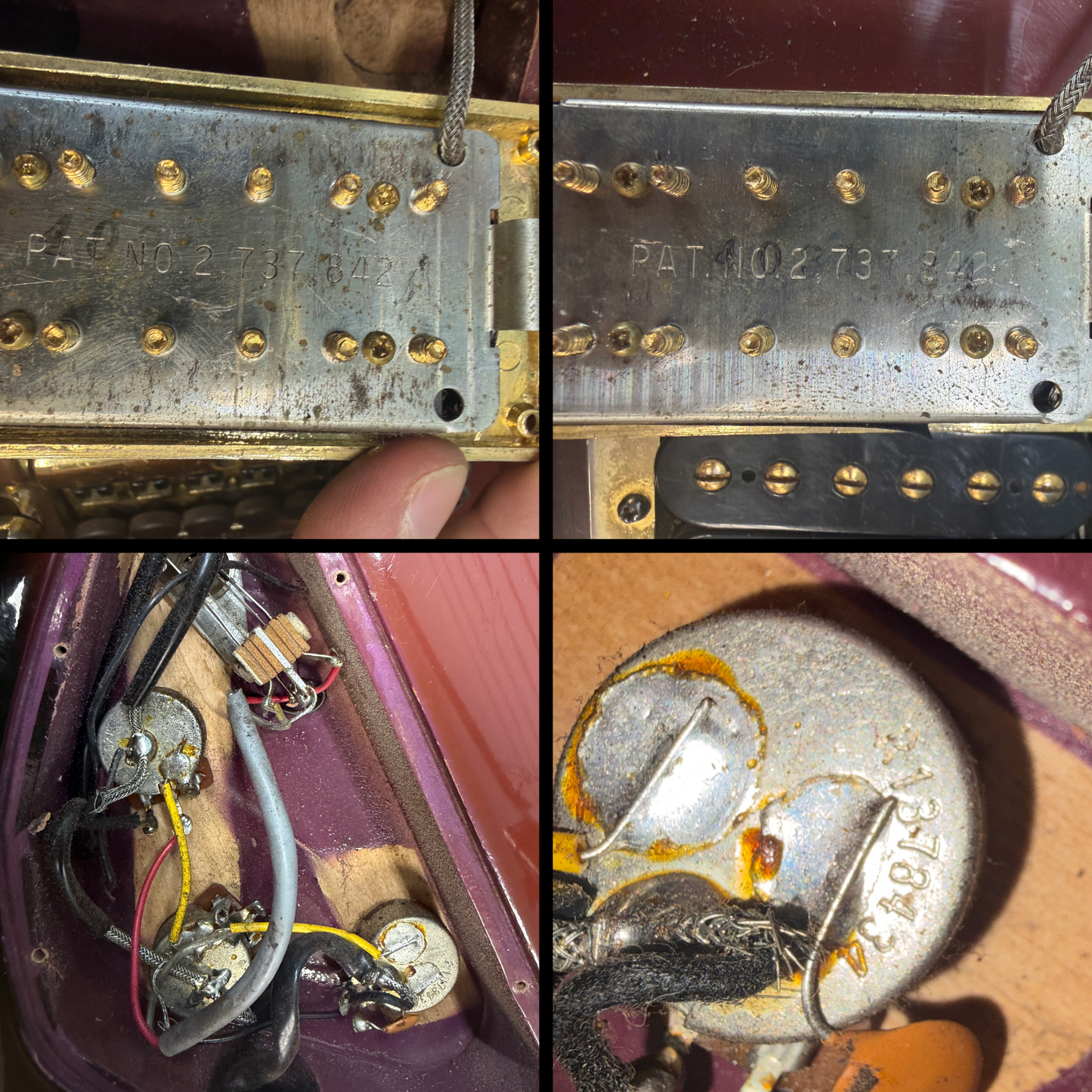 This guitar is in overall good condition. There is finish checking, light surface marks and small dings/dents throughout. At some point in its life, the bridge, frets, nut and strap buttons were changed. The clear coat has aged the purple into a more red-like color except for a patch near the pickups and a faint spot below the bridge where a crimson ghost decal was applied. The truss rod cover was modified for the installation of the new bridge. Much of the gold plating on the hardware is worn. The back of the body has some belt rash. The neck has some clear coat chipping along the sides from the refret. The output jack plate is missing a screw. (See Pics)