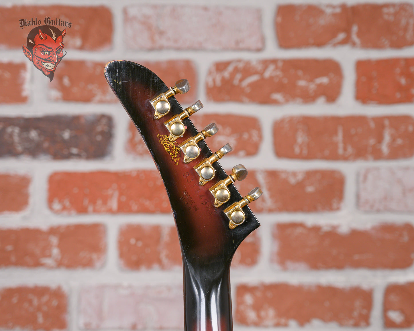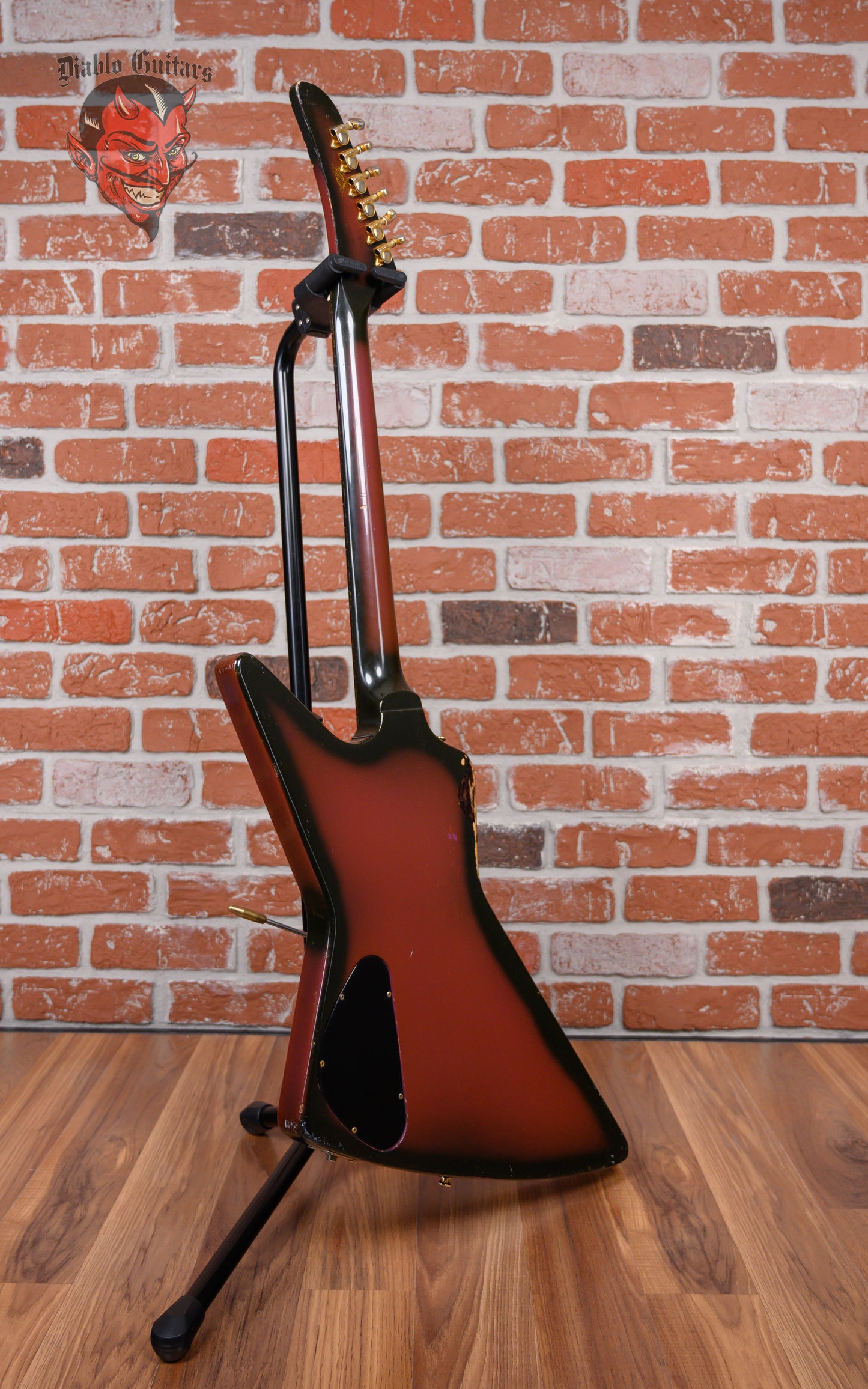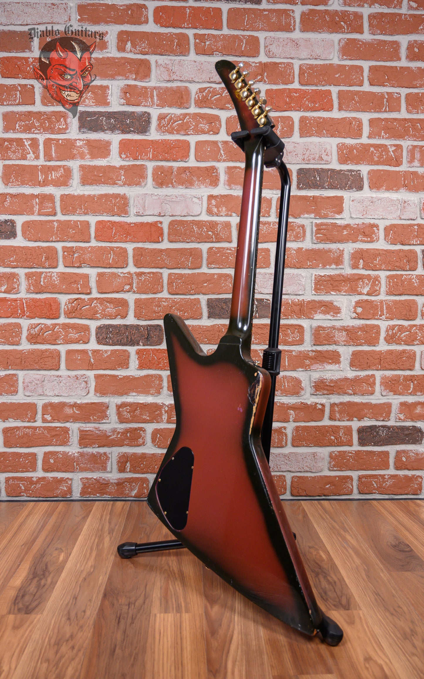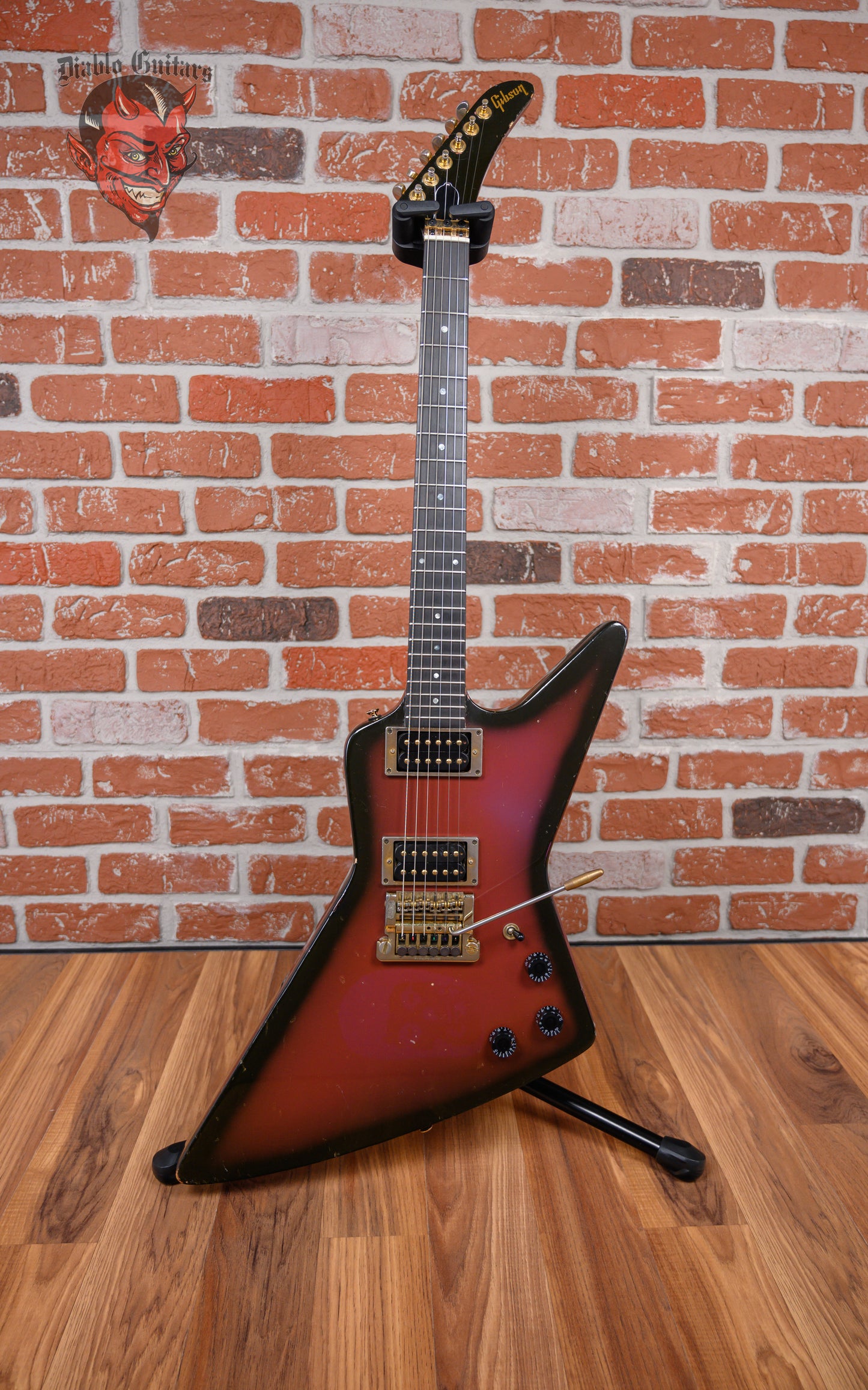 Vintage Gibson Custom Shop Explorer in Purple Burst finish made in 1984 with Hard Shell Case. This guitar features a solid mahogany body, mahogany neck and rosewood fingerboard. Equipped with its original set of Gibson Dirty Fingers humbuckers in the neck and bridge positions. Controlled by 2 volume pots, 1 tone pot and a 3-way toggle switch comprised of its original CTS pots dating to the 34th week of 1984. The 24.75" scale length neck has pearloid dot inlays and white side markers with 22 medium jumbo frets on a 12" radius with a slim taper profile. The hardware is comprised of gold Grover Mini-Rotomatic tuning machines with mini kidney bean heads, a bone nut, a Kahler-made Gibson Super-Tune Vibrola bridge and black speed knobs.