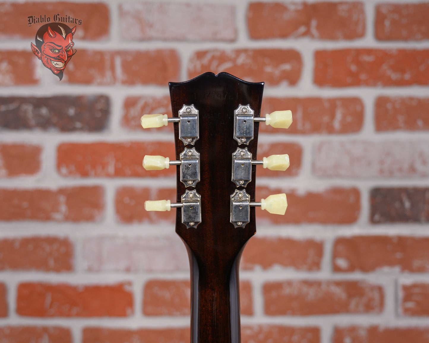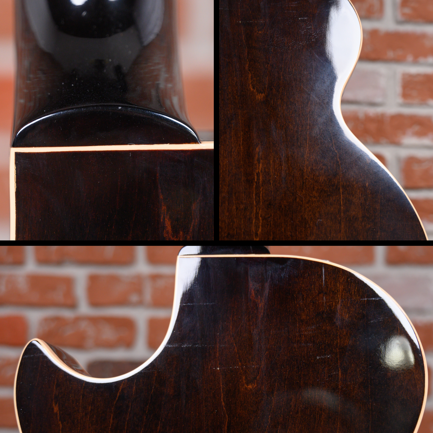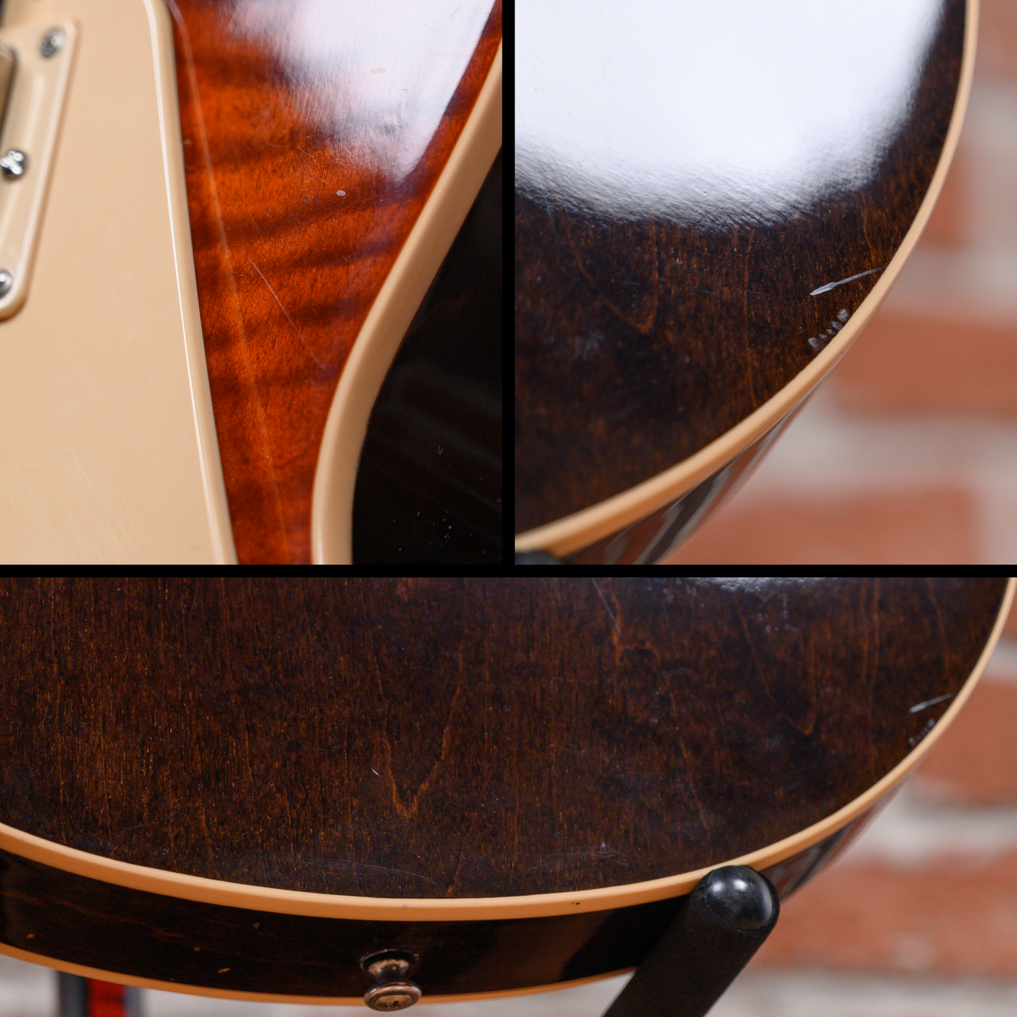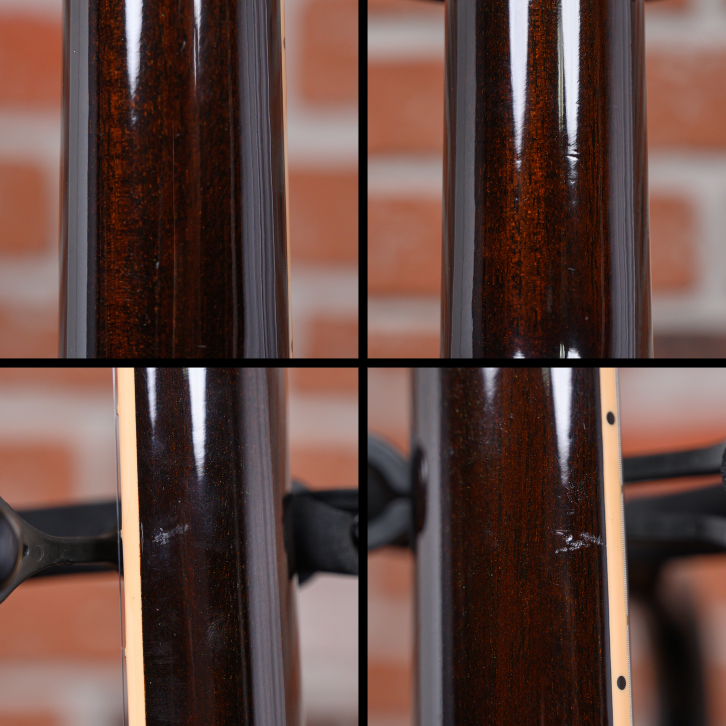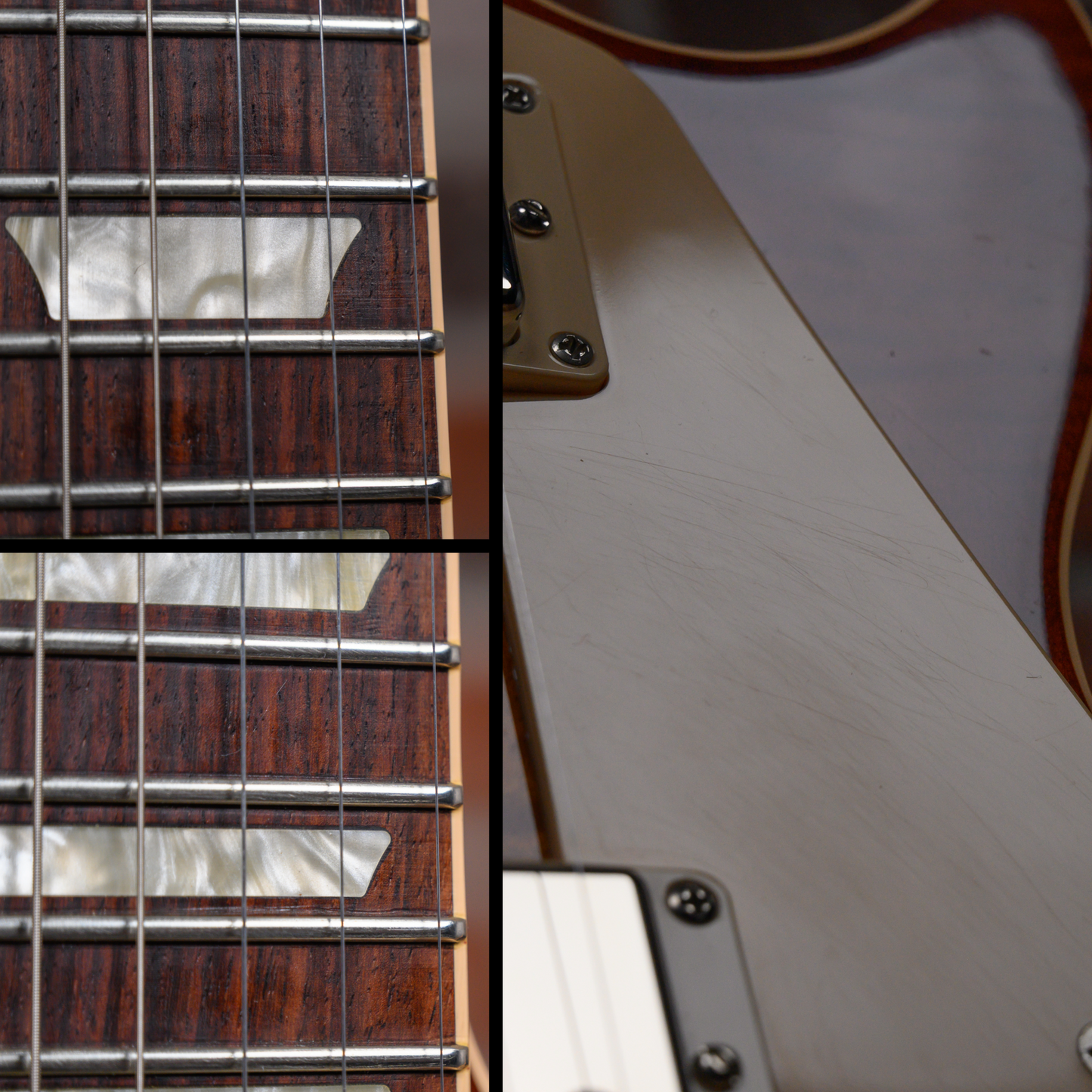 This guitar is in overall excellent condition. The finish on the headstock has some light bubbling around the corners. The back of the neck has some light surface marks, light divots, and some small scuffs around the 7th and 9th frets. There are some light surface marks on the horn on the front of the body as well as some picking marks on the pickguard. The back of the body has some horizontal marks in the finish across the top. There are also some areas of hazy finish. (See Pics)