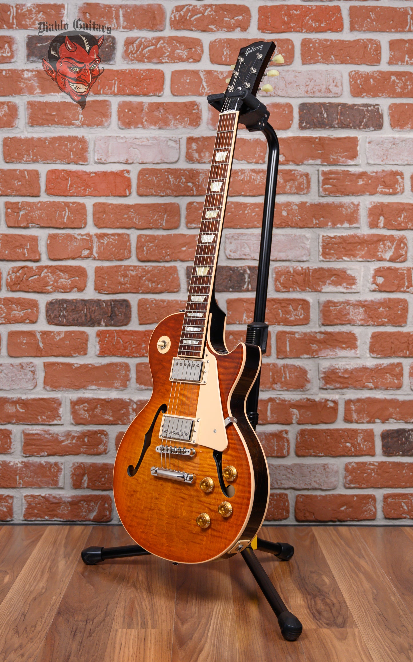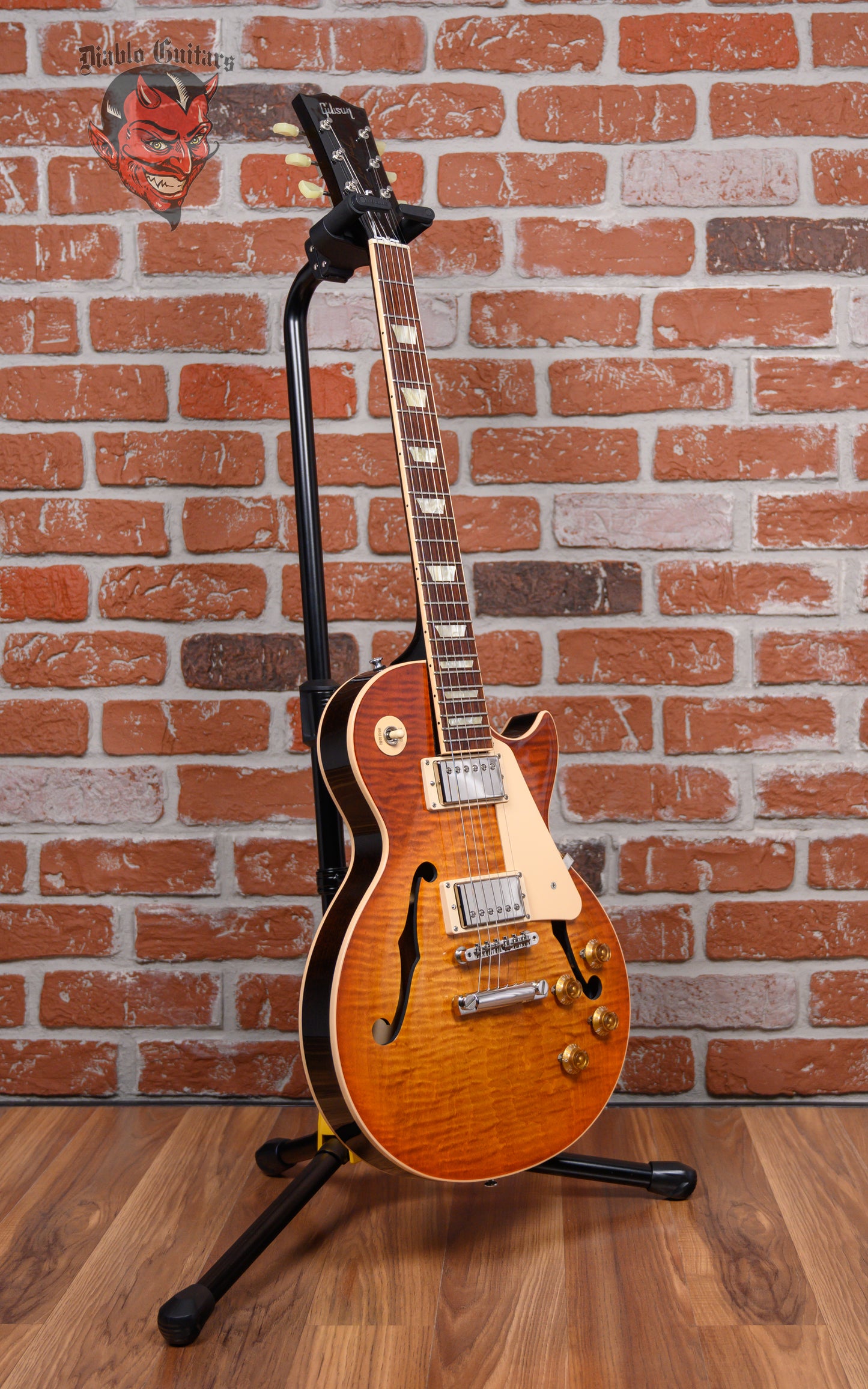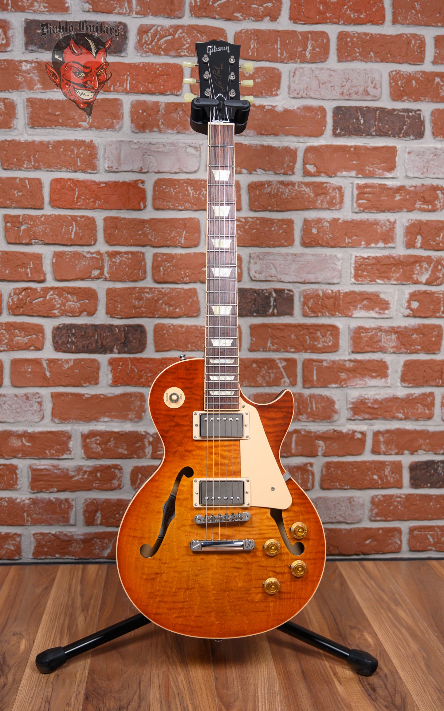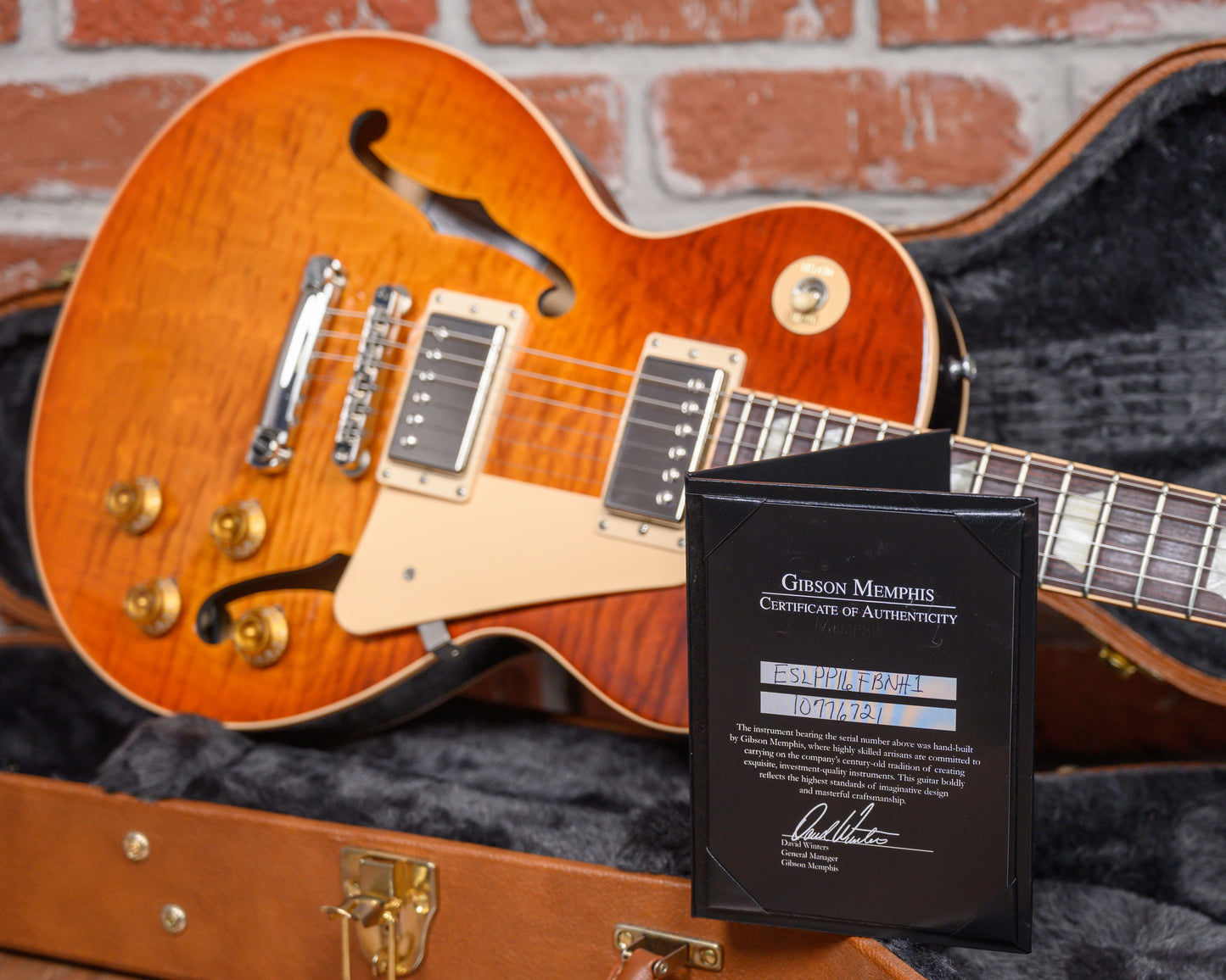 Gibson ES-Les Paul in Faded Lightburst finish made in 2016 with Original Hard Shell Case. This guitar features a double bound semi-hollow maple/poplar/maple back & sides body with a figured maple top, mahogany neck and bound rosewood fingerboard. Equipped with a set of Gibson MHS humbuckers in the neck and bridge positions. Controlled by 2 volume pots, 2 tone pots and a 3-way toggle switch. The 24.75" scale length neck has pearloid trapezoid inlays and black side markers with 22 medium jumbo frets on a 12" radius with a rounded "C" profile. The hardware is comprised of Kluson Single Line Single Ring tuning machines with tulip heads, a bone nut, a Gibson ABR-1 Tune-O-Matic bridge with titanium saddles and gold top hat knobs with a single-ply cream pickguard.