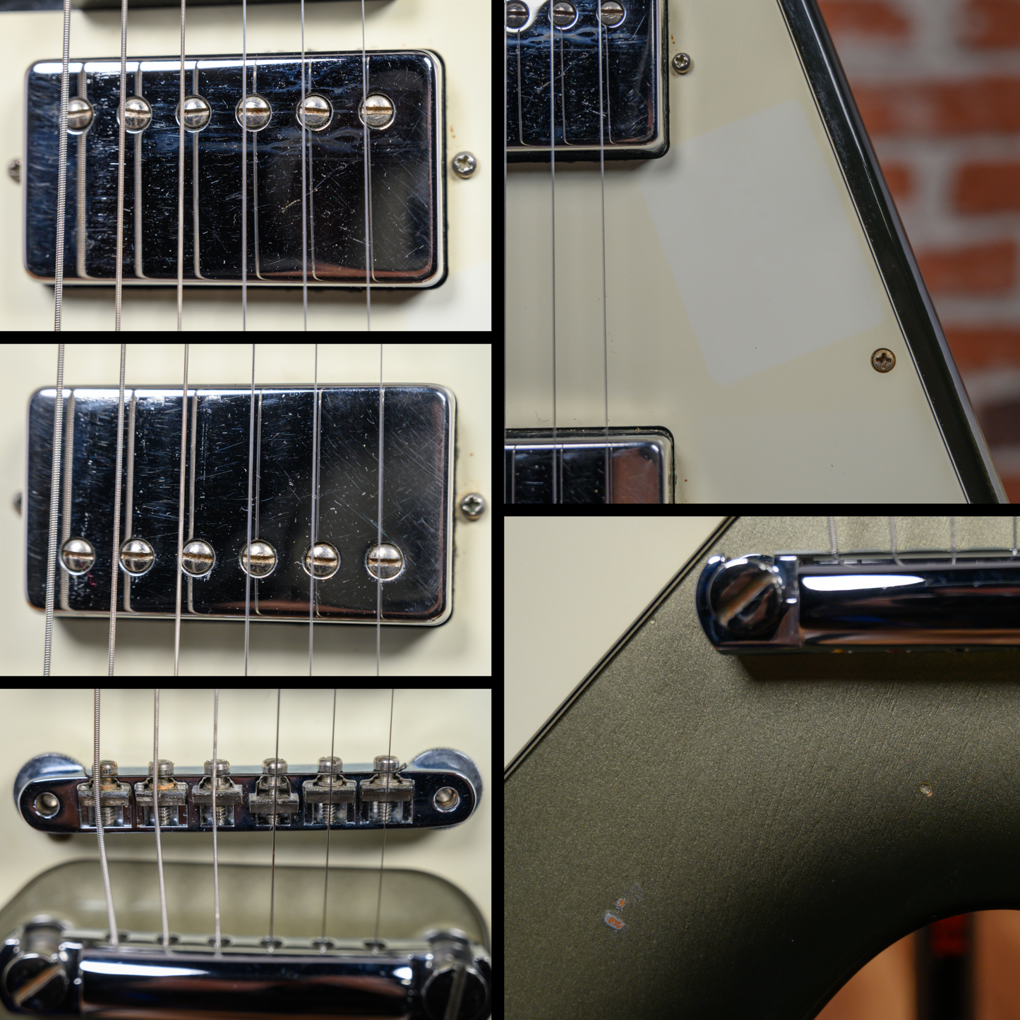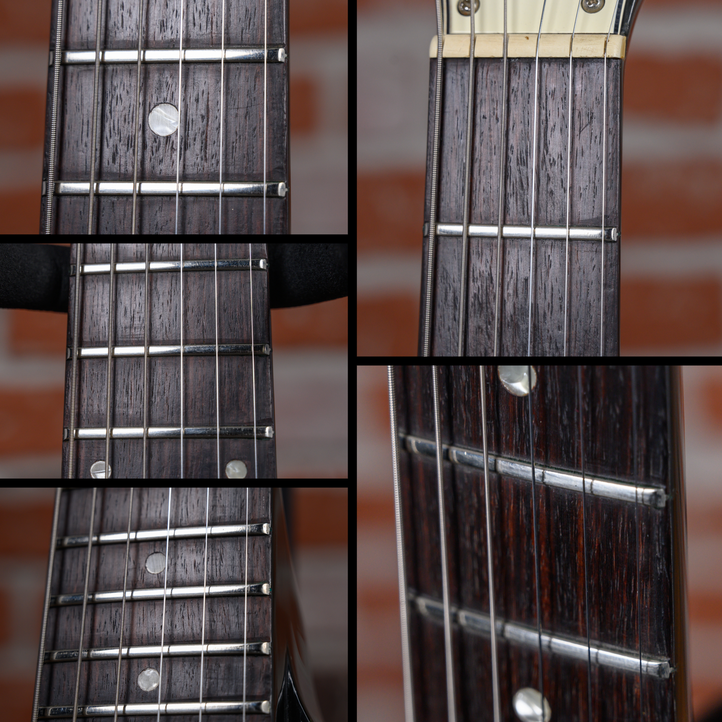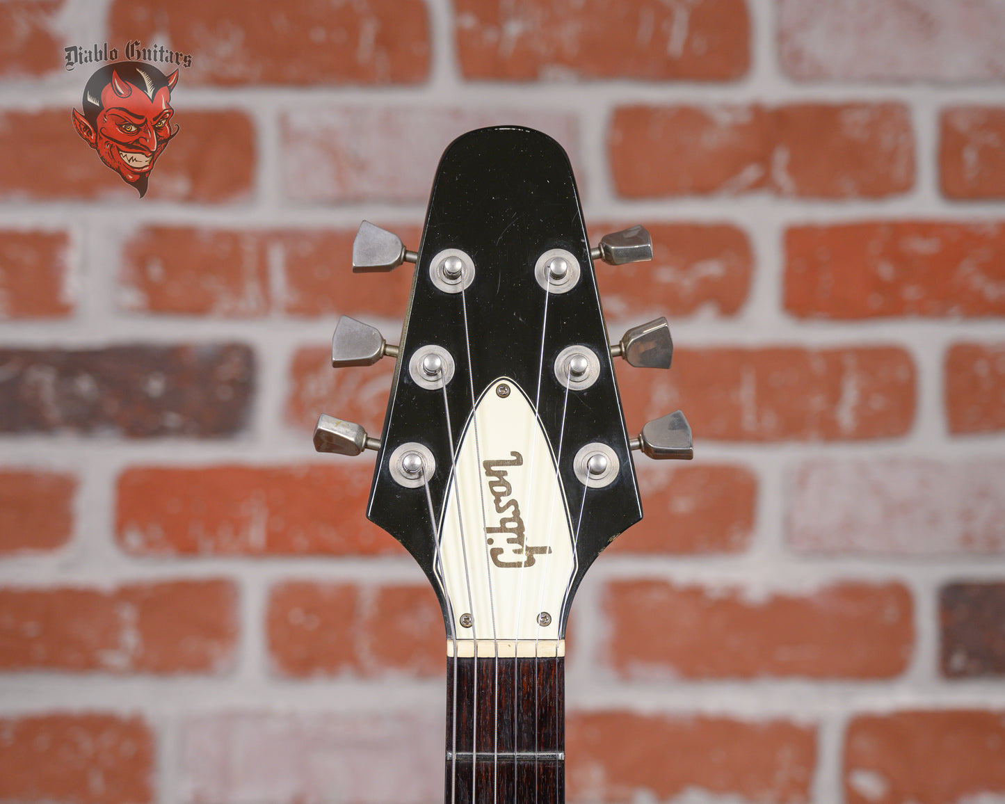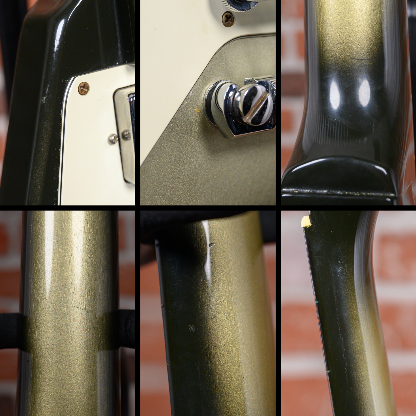 This guitar is in overall very good condition. There are light surface marks and minor dings throughout the guitar. The top has a couple of small finish chips and the back has a small amount of belt rash. The bottoms of the points have finish chips and small dings. The frets are on the flatter side and some have light divots. The pickguard has an outline of a previously applied sticker. (See Pics)