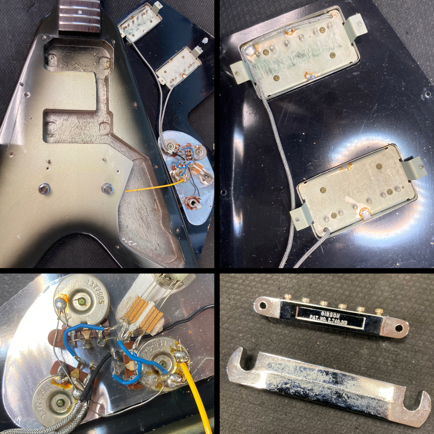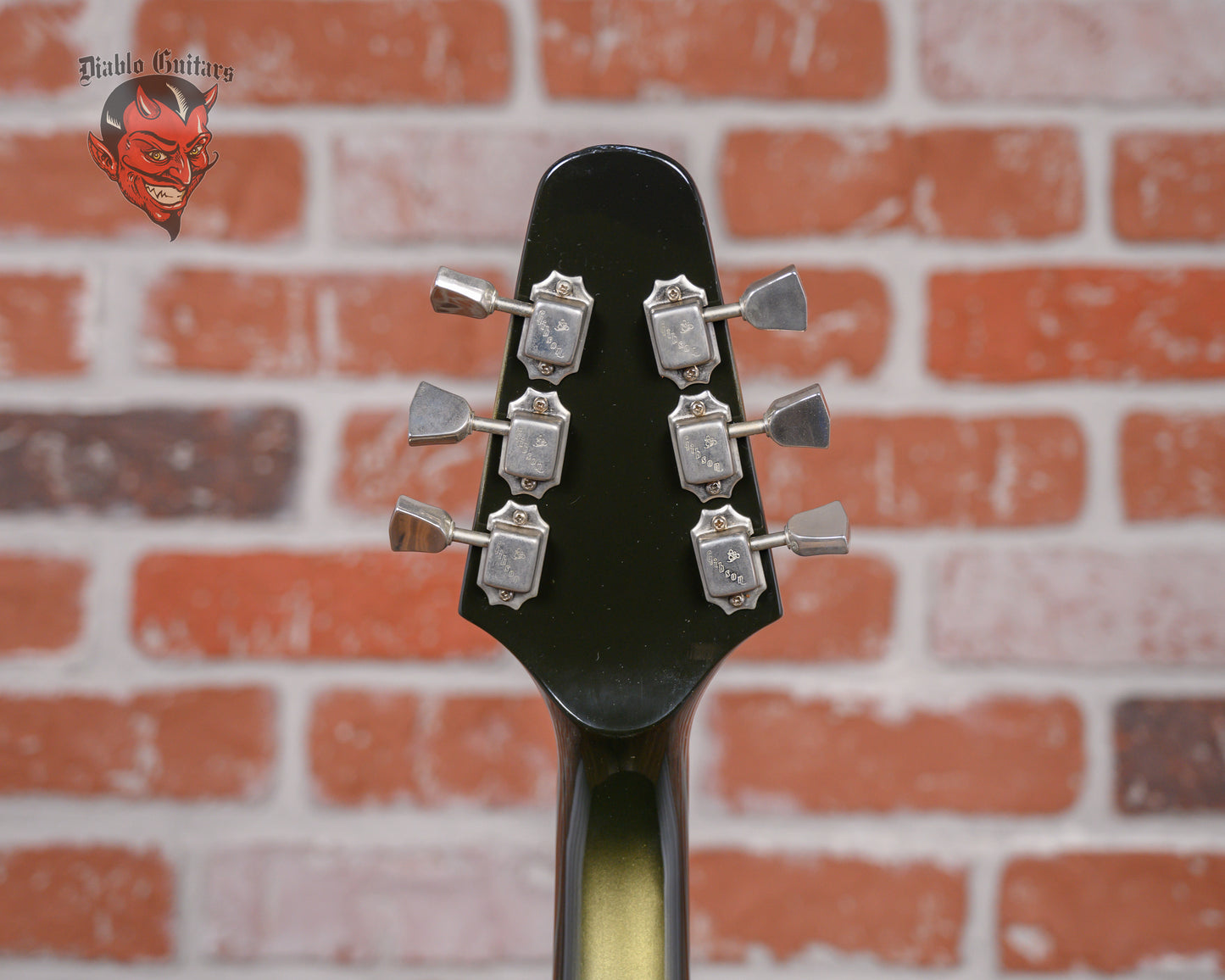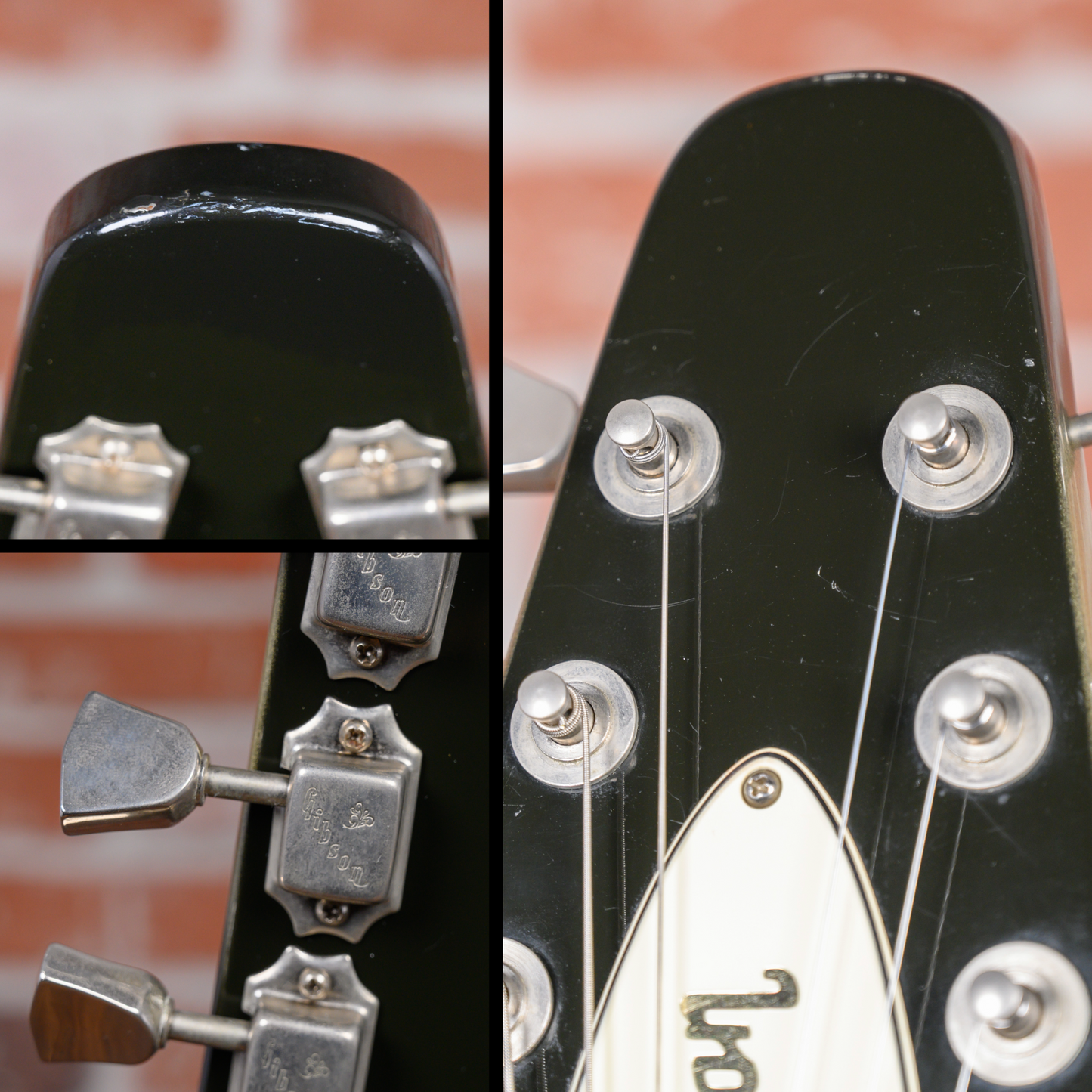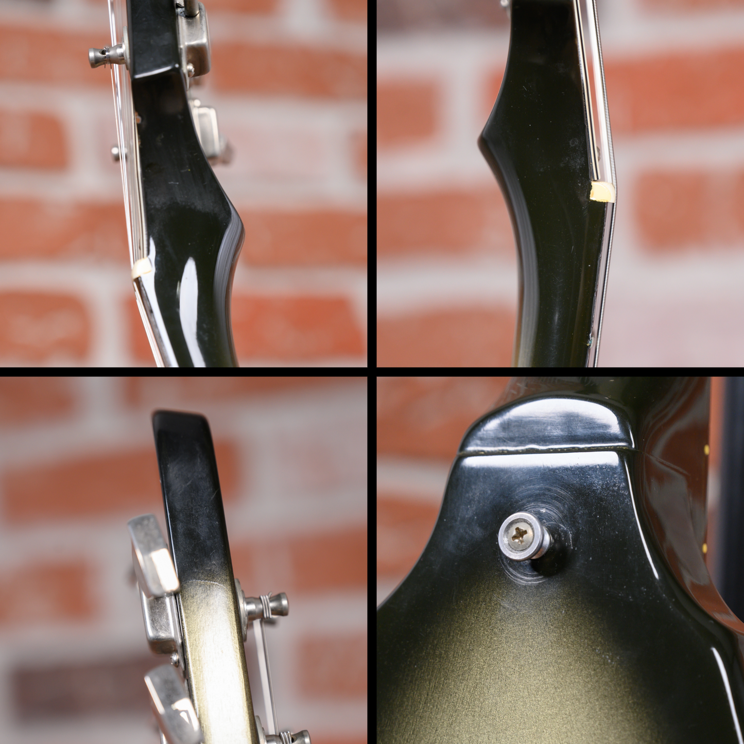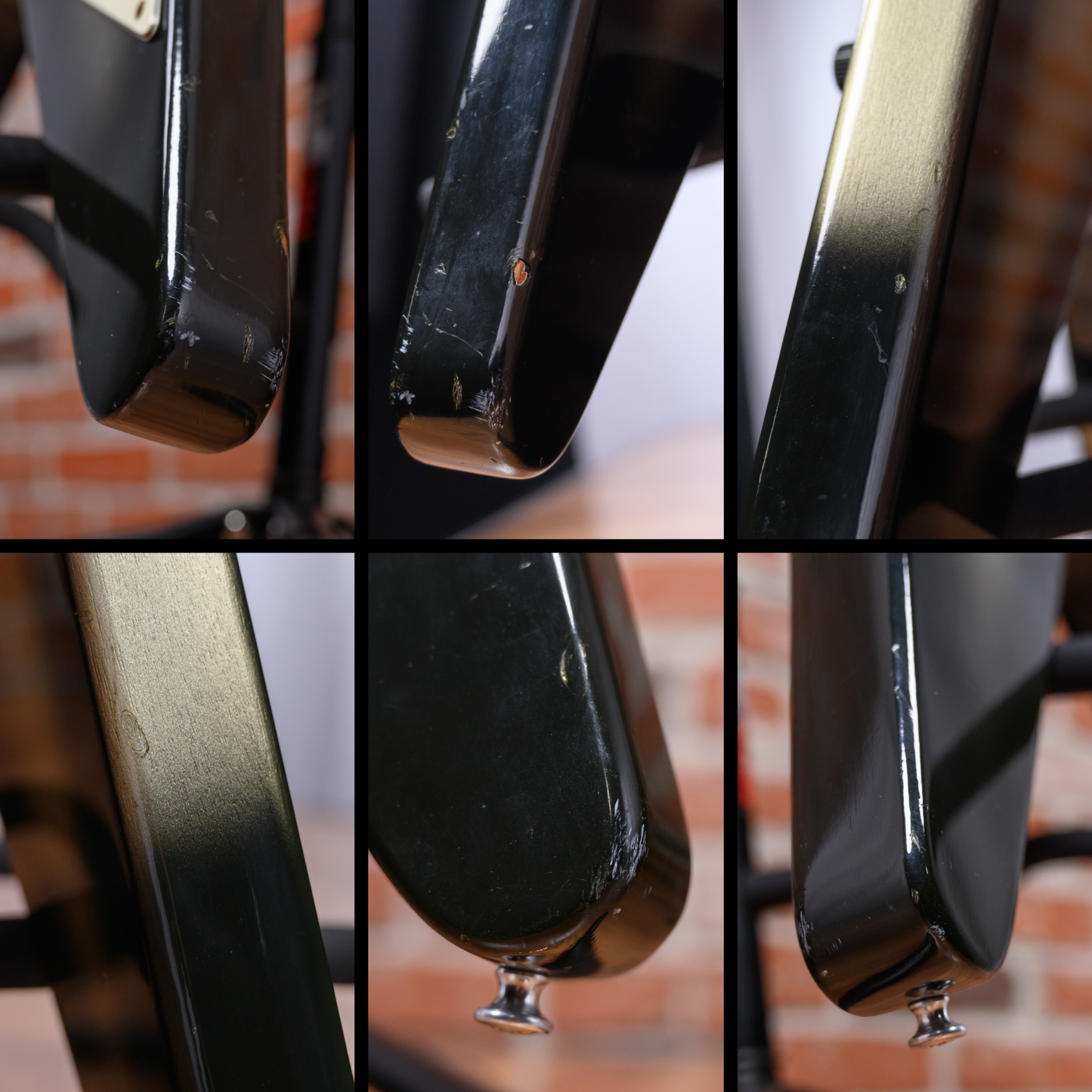 This guitar is in overall very good condition. There are light surface marks and minor dings throughout the guitar. The top has a couple of small finish chips and the back has a small amount of belt rash. The bottoms of the points have finish chips and small dings. The frets are on the flatter side and some have light divots. The pickguard has an outline of a previously applied sticker. (See Pics)