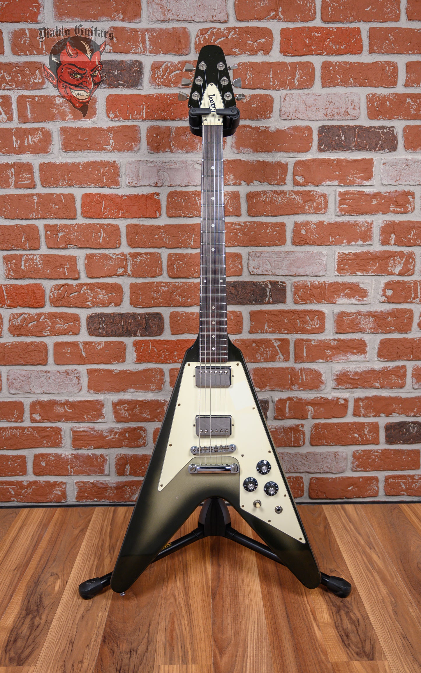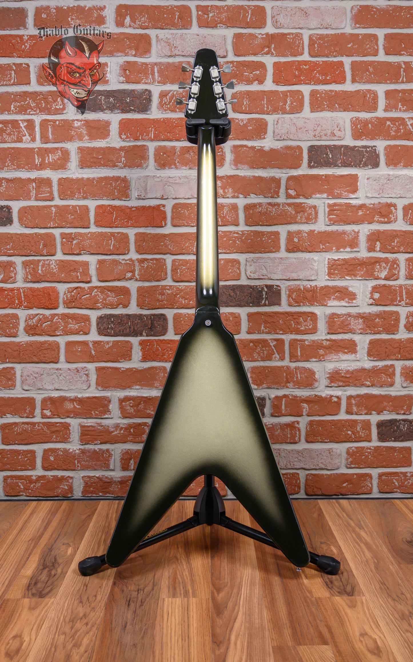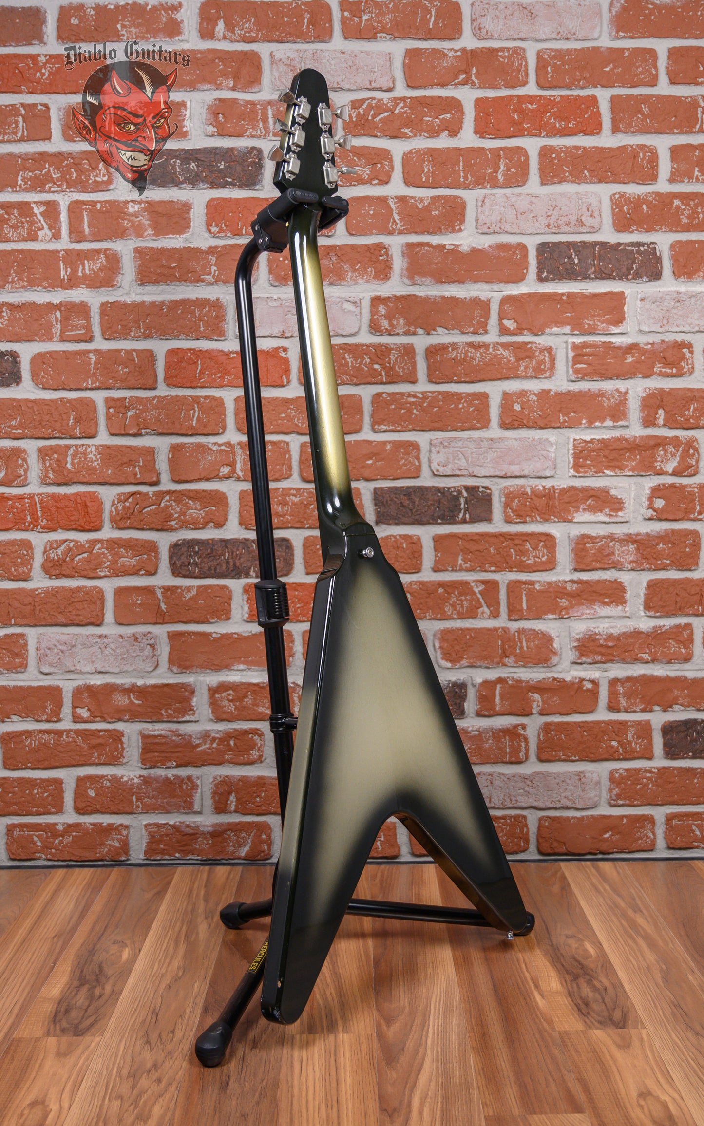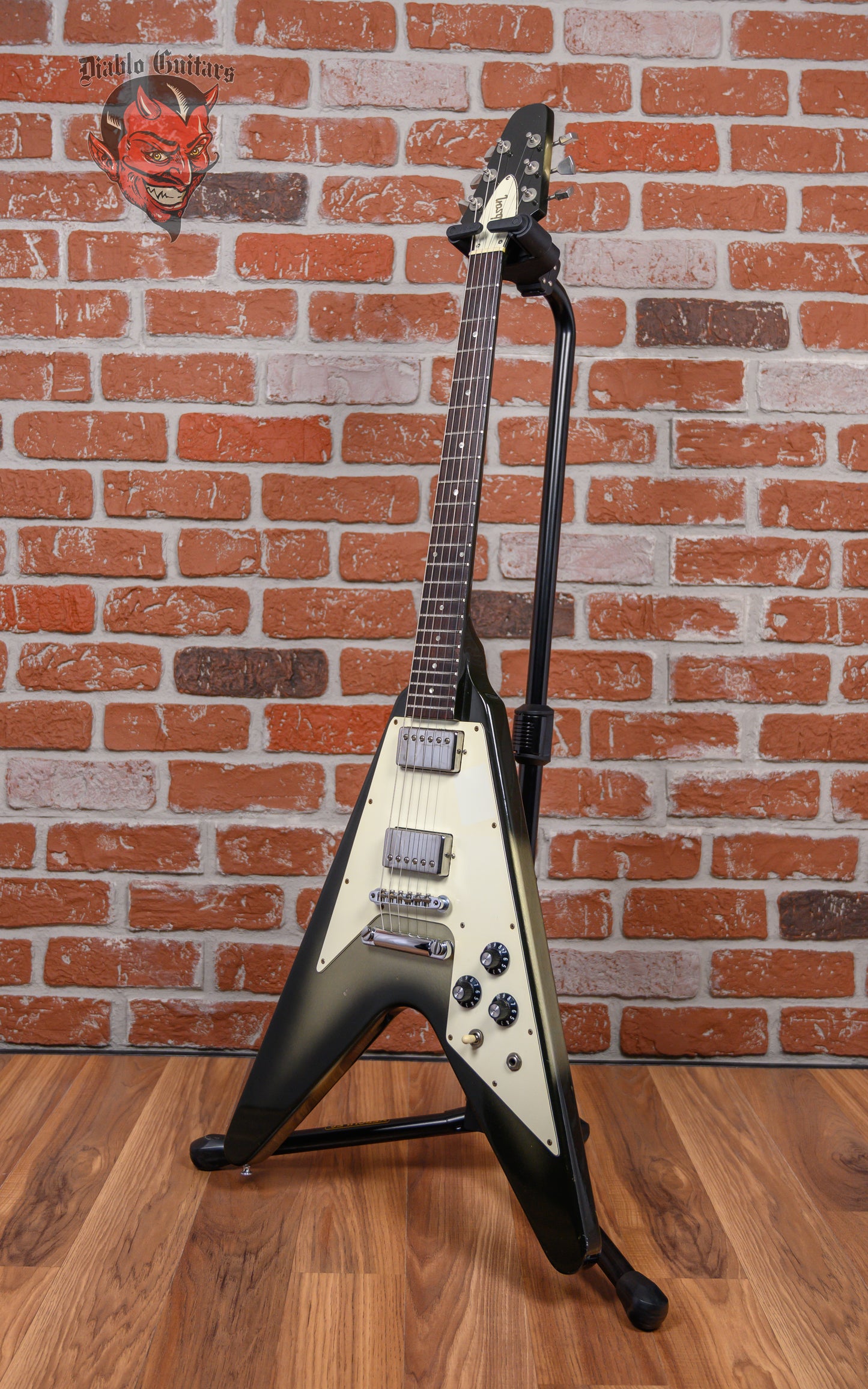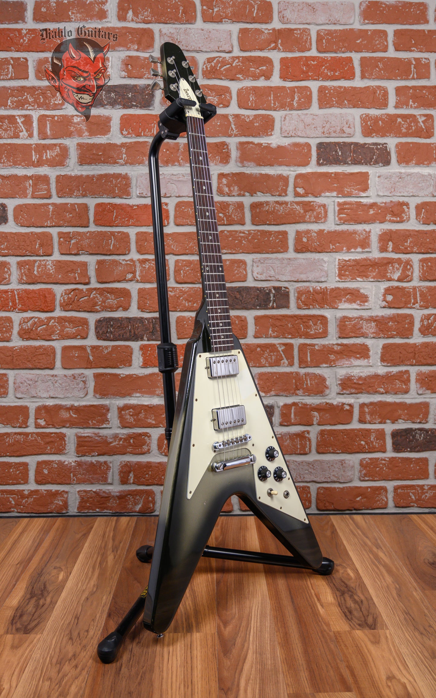 Vintage Gibson Flying V in Silverburst finish made in 1981 with Original Hard Shell Case. This guitar features a solid mahogany body, 3-piece mahogany neck and rosewood fingerboard. Equipped with its original set of Gibson "Patent Stamp" humbuckers in the neck bridge positions. Controlled by 2 volume pots, 1 tone pot and a 3-way toggle switch comprised of its original CTS pots dating to the 5th week of 1979. The 24.75" scale length neck has pearloid dot inlays and white side markers with 22 medium jumbo frets on a 12" radius with a slim taper profile. The hardware is comprised of nickel Gibson embossed Flower tuning machines with keystone heads, a corian nut, a Gibson ABR-1 Tune-O-Matic bridge and witch hat knobs with a 3-ply white-on-black pickguard.