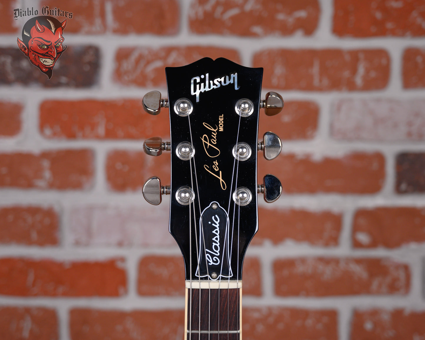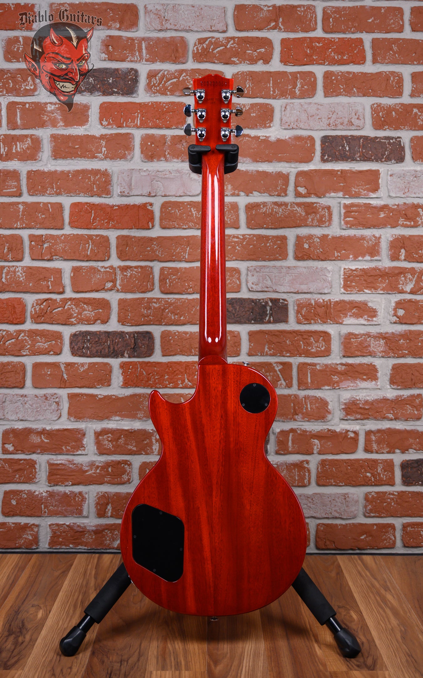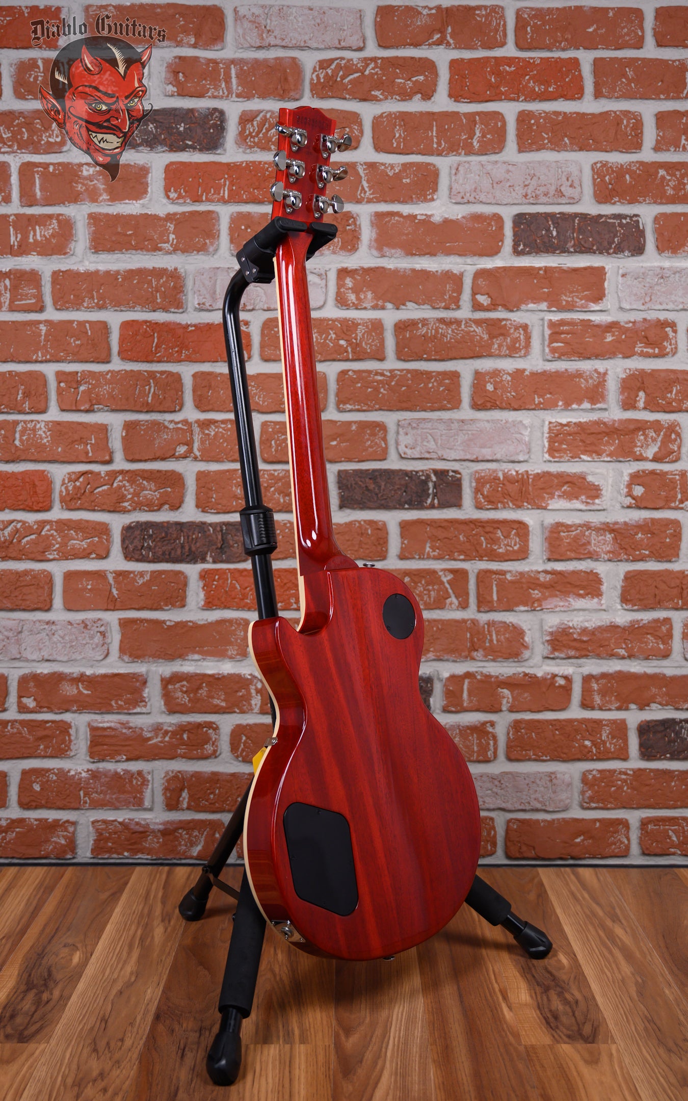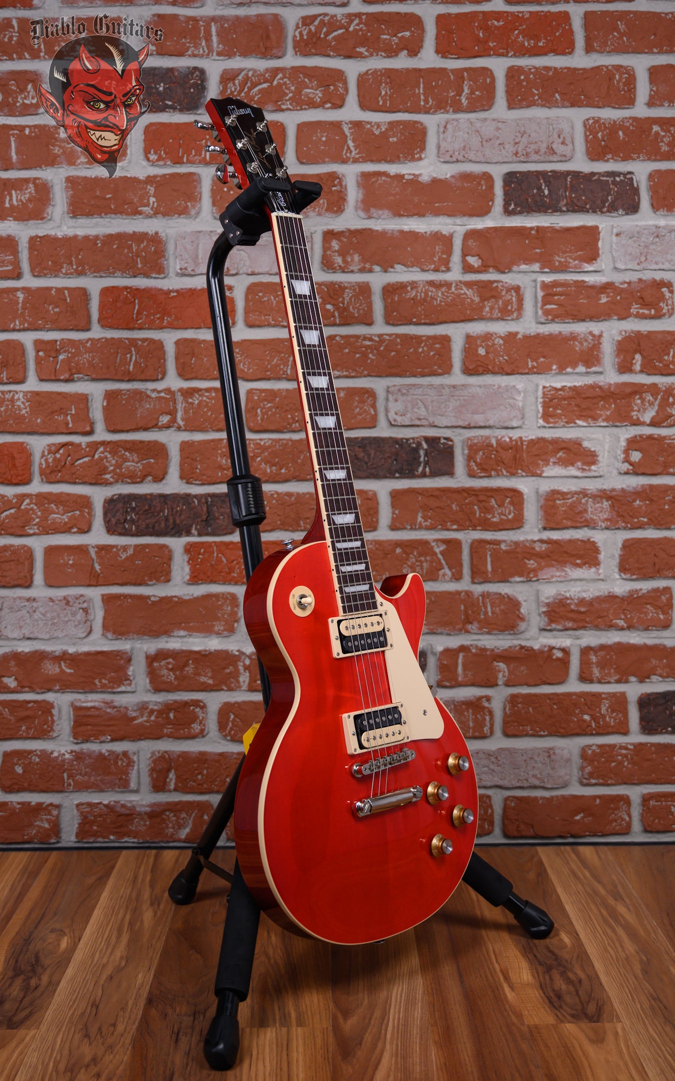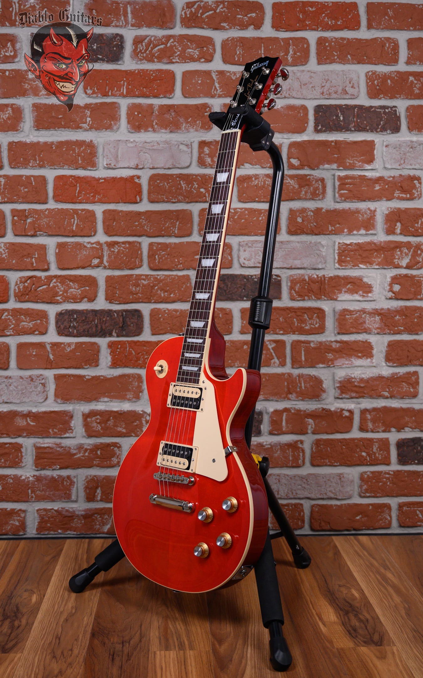 Gibson Les Paul Classic in Translucent Cherry finish made in 2023 with Original Hard Shell Case. This guitar features a Solid Mahogany body with a bound Maple top, Mahogany neck and bound Indian Rosewood fingerboard. Equipped with a Gibson Rhy 61 in the neck position and a Gibson lead 61 in the bridge position. Controlled by 2 Volume with push/pull coil taps, 2 Tone pot with push/pull phase & pure bypass and a 3-Way Toggle Switch. The 24.75" scale length neck has Pearloid Trapezoid inlays and Black side markers with 22 Medium Jumbo frets on a 12" radius with a 60's Slim Taper profile. The hardware is comprised of Nickel Grover Rotomatic tuning machines with Kidney heads, a Graph Tech nut, a Gibson ABR-1 Tune-O-Matic Bridge and Gold Top Hat reflector knobs with a Single Ply Cream pickguard.