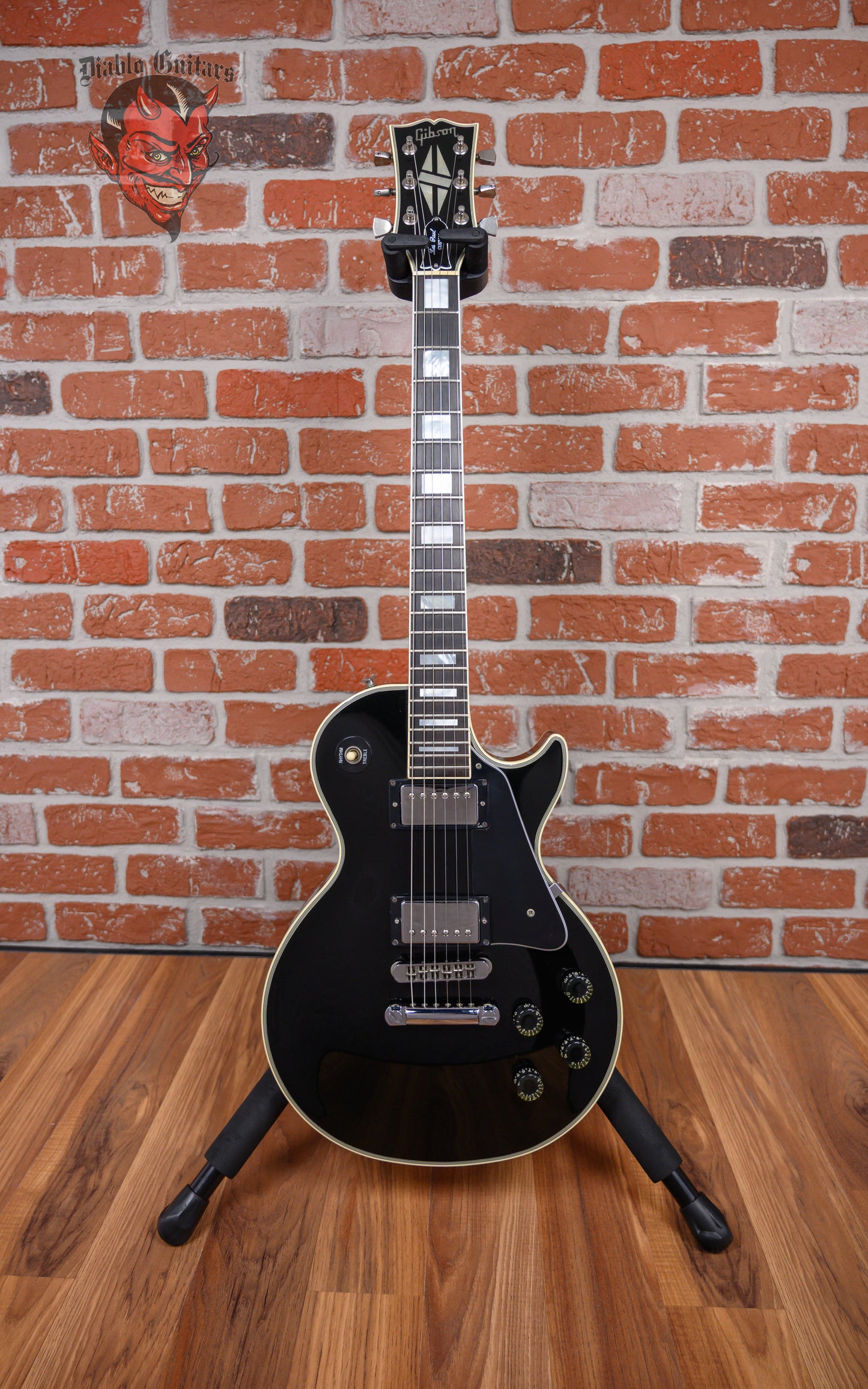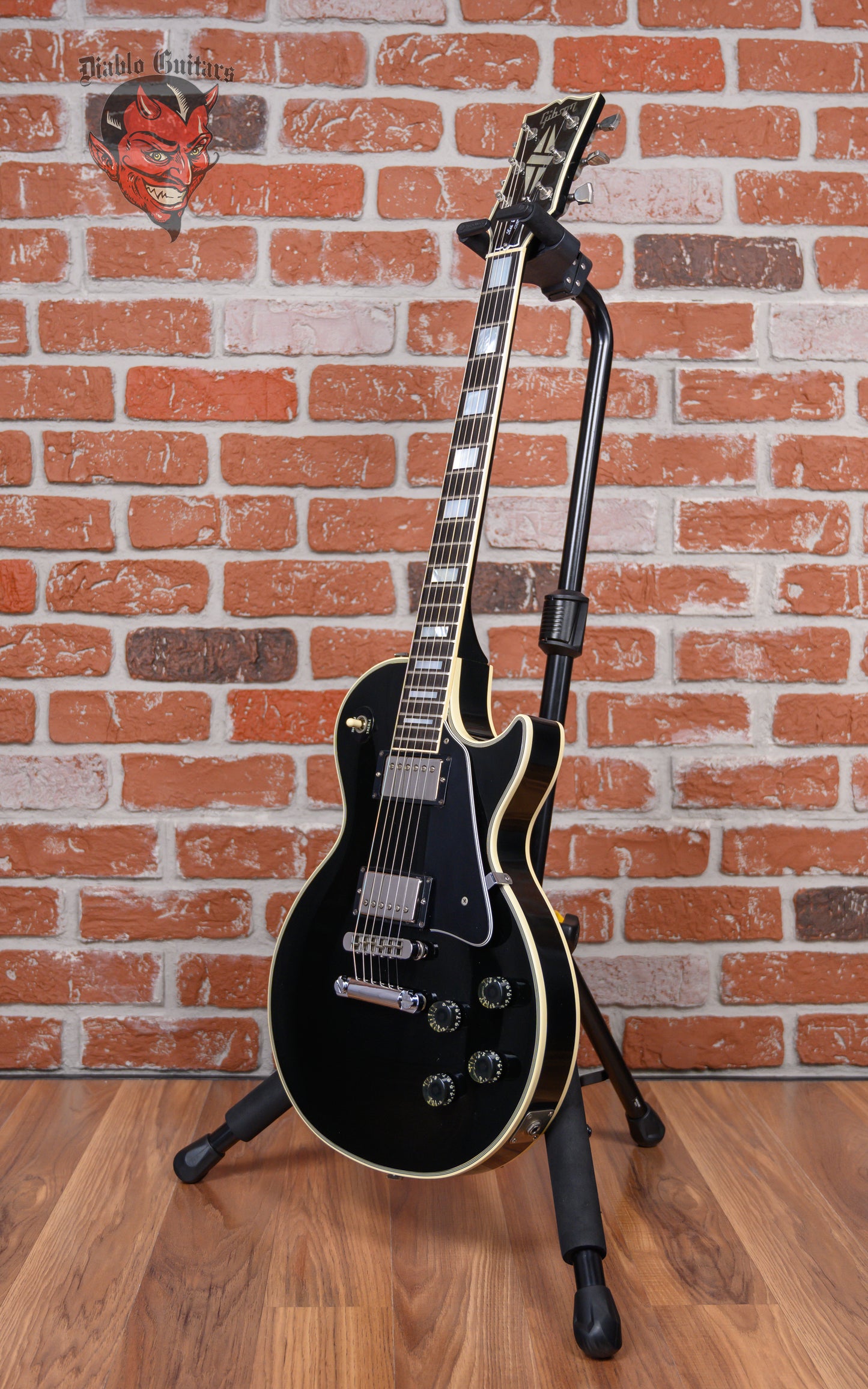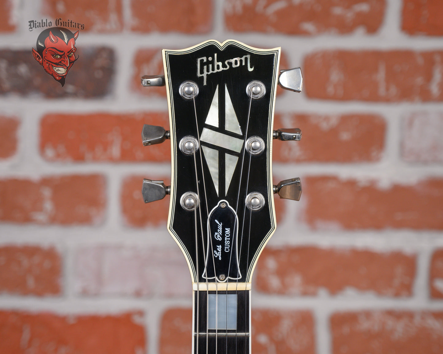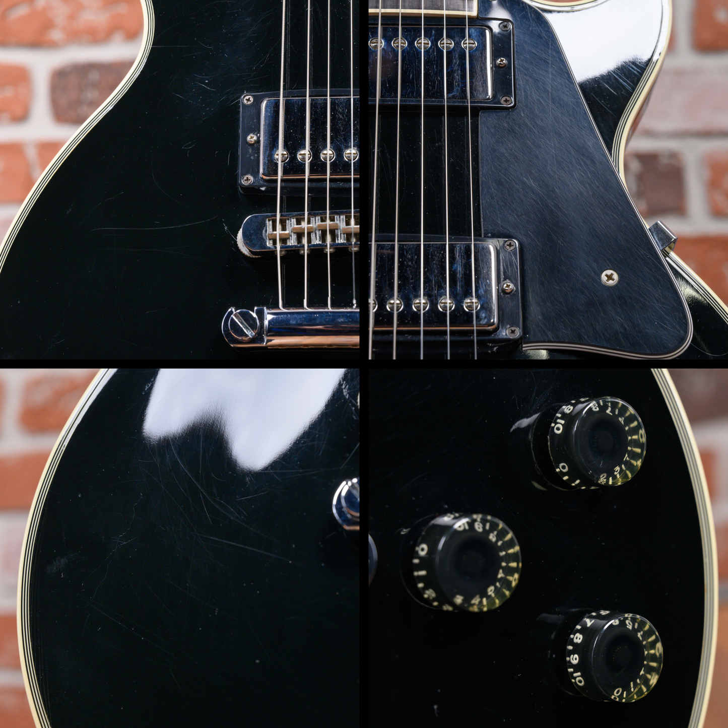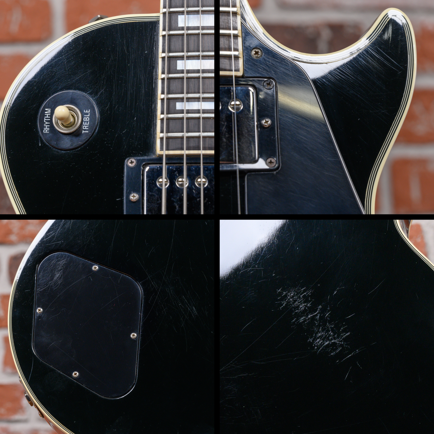 Vintage Gibson Les Paul Custom in Ebony finish made in 1982 with Original Chainsaw Case. This guitar features a double bound solid mahogany body with a maple top, 3-piece maple neck and bound ebony fingerboard with a bound headstock. Equipped with its original set of Gibson Patent Stamp humbuckers in the neck and bridge positions that are controlled by 2 volume pots, 2 tone pots and a 3-way toggle switch comprised of its original CTS pots dating to the 35th week of 1981. The 24.75" scale length neck has mother of pearl block inlays and black side markers with 22 medium jumbo frets on a 12" radius with a slim taper profile. The hardware is comprised of chrome Gibson Crank Winders tuning machines with keystone heads, a corian nut, a Schaller-made Gibson Tune-O-Matic bridge and black speed knobs with a 5-ply black on white pickguard.