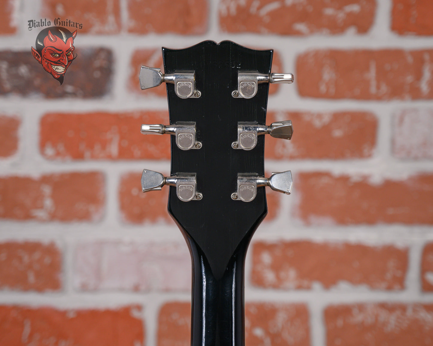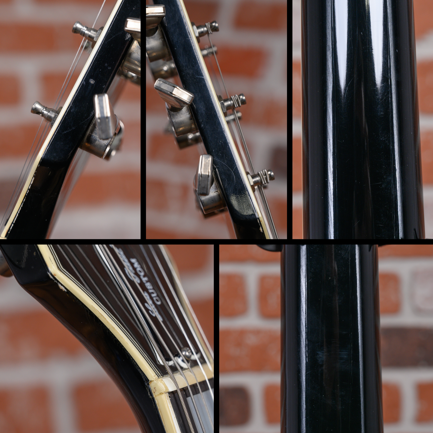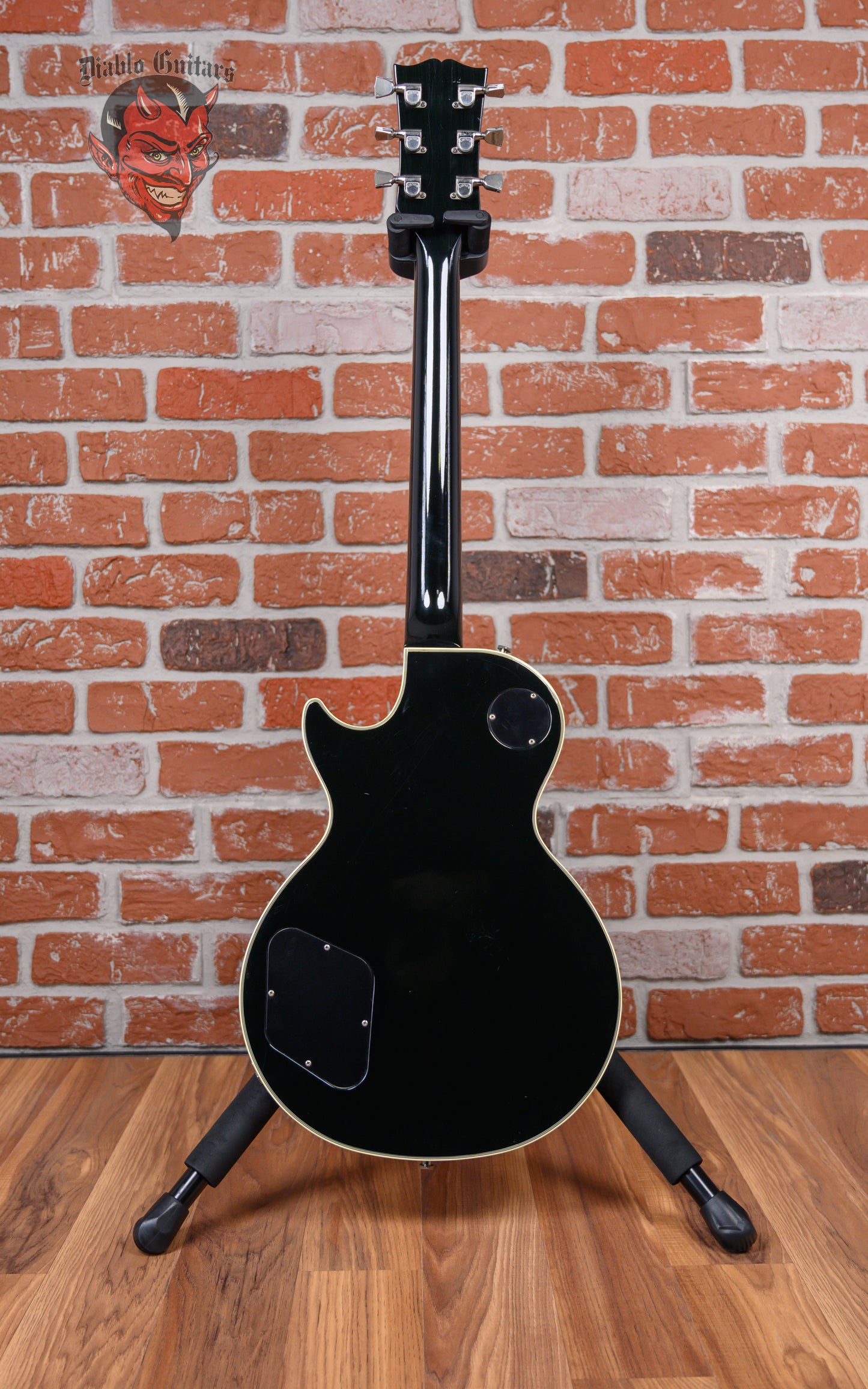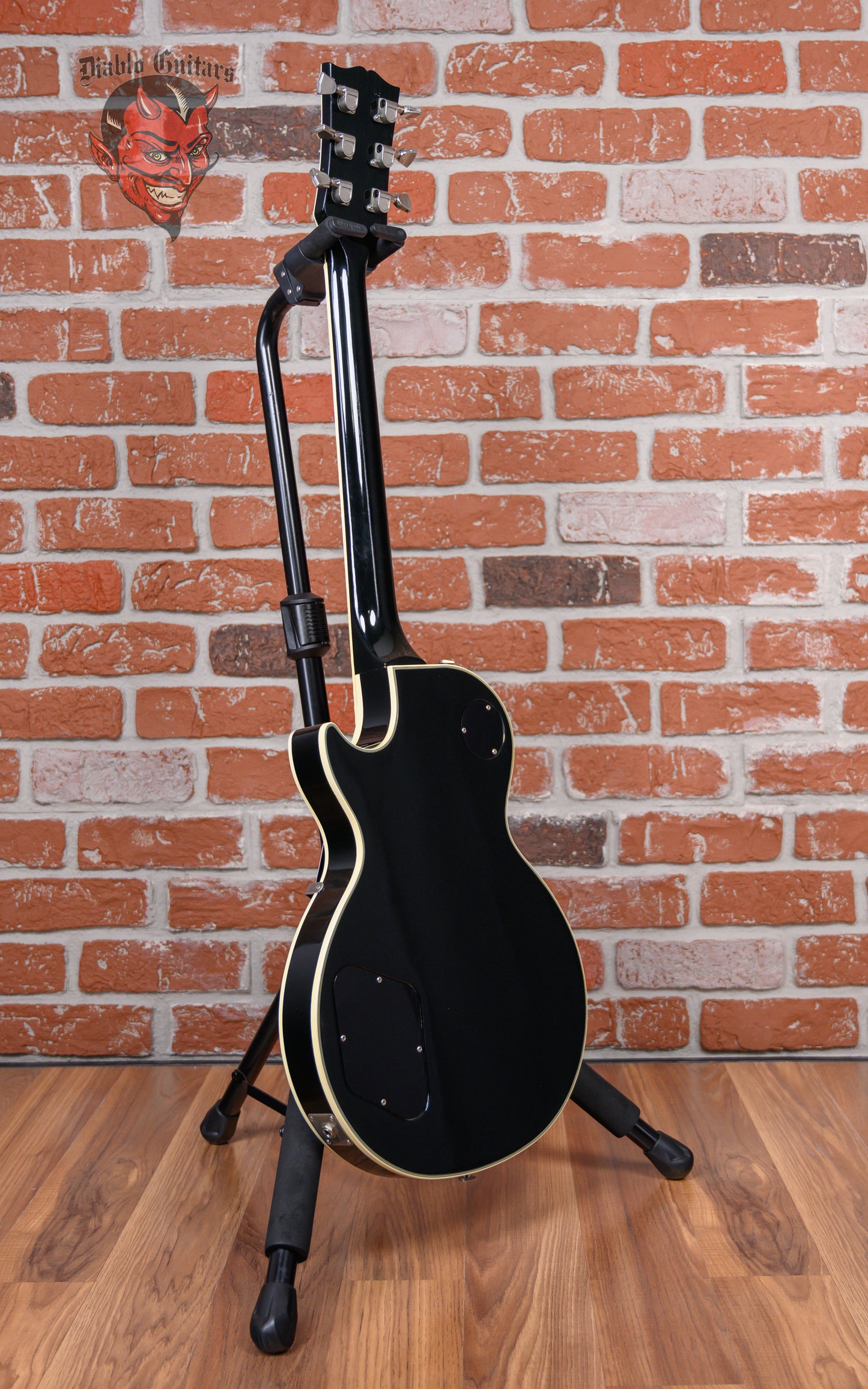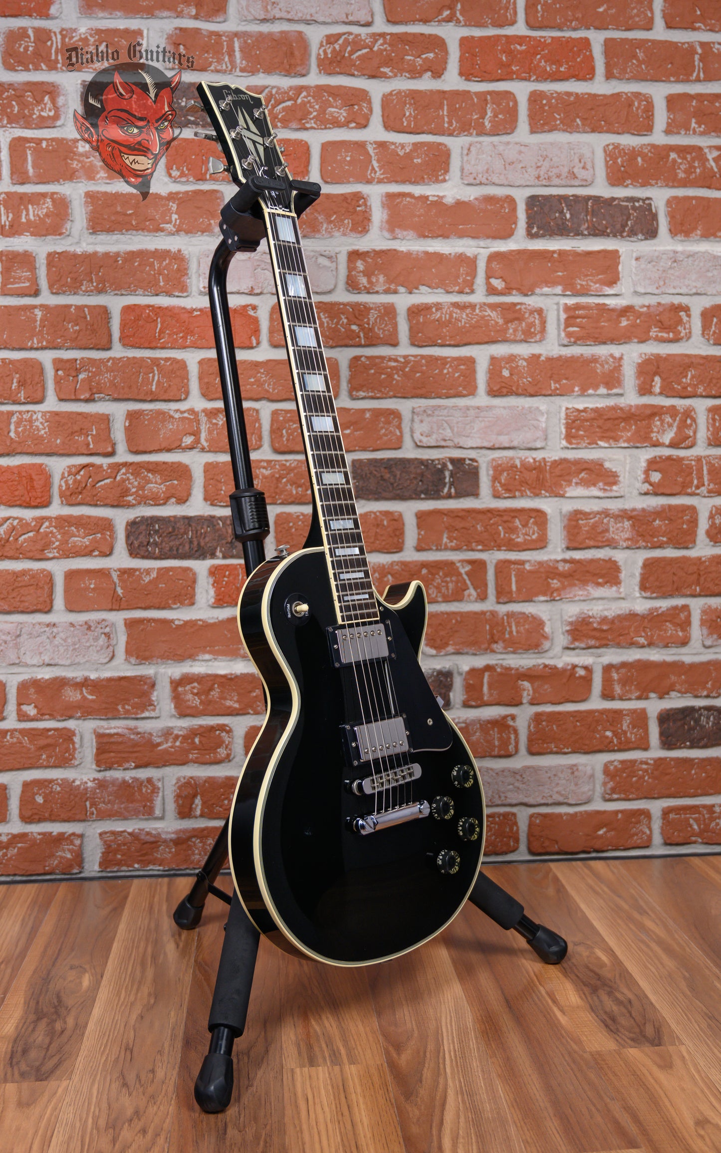 Vintage Gibson Les Paul Custom in Ebony finish made in 1982 with Original Chainsaw Case. This guitar features a double bound solid mahogany body with a maple top, 3-piece maple neck and bound ebony fingerboard with a bound headstock. Equipped with its original set of Gibson Patent Stamp humbuckers in the neck and bridge positions that are controlled by 2 volume pots, 2 tone pots and a 3-way toggle switch comprised of its original CTS pots dating to the 35th week of 1981. The 24.75" scale length neck has mother of pearl block inlays and black side markers with 22 medium jumbo frets on a 12" radius with a slim taper profile. The hardware is comprised of chrome Gibson Crank Winders tuning machines with keystone heads, a corian nut, a Schaller-made Gibson Tune-O-Matic bridge and black speed knobs with a 5-ply black on white pickguard.