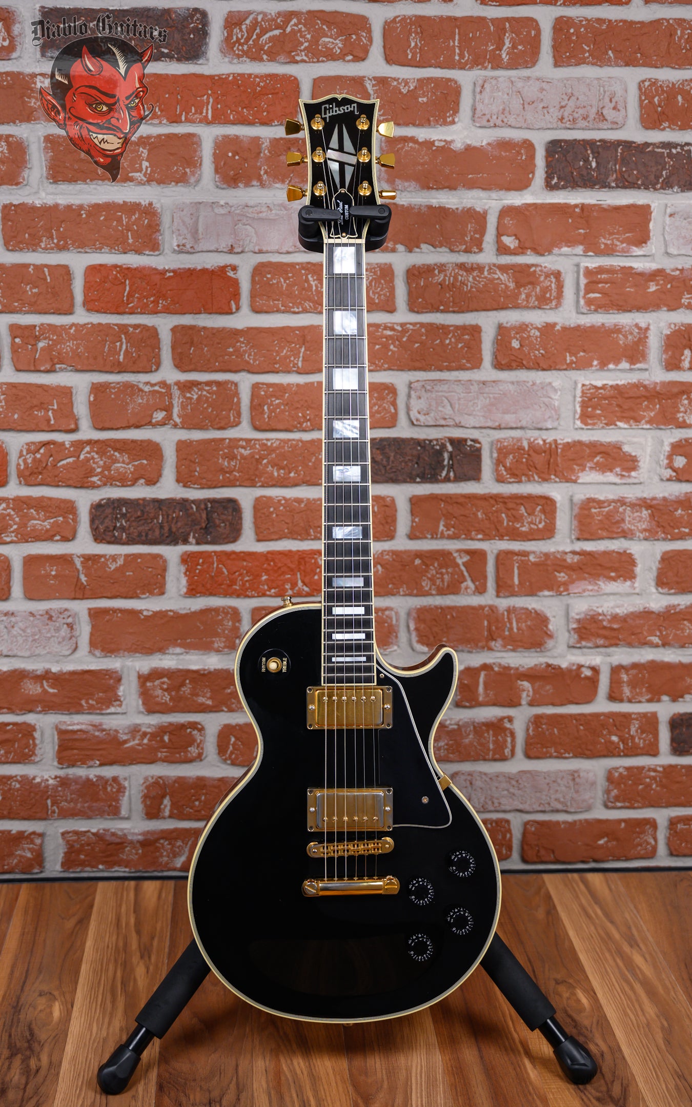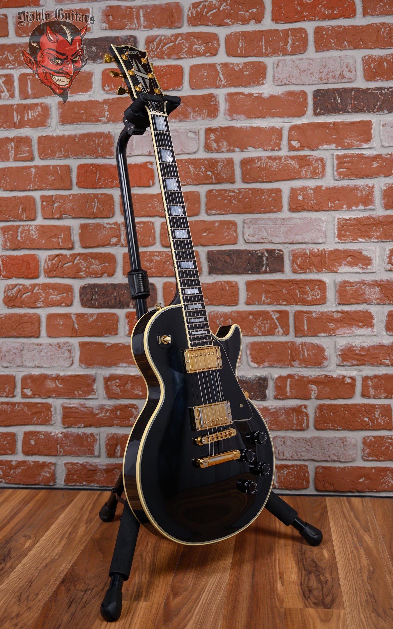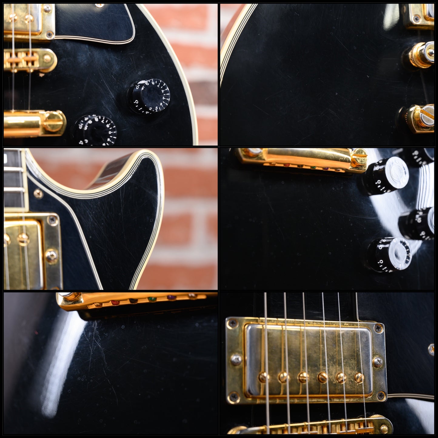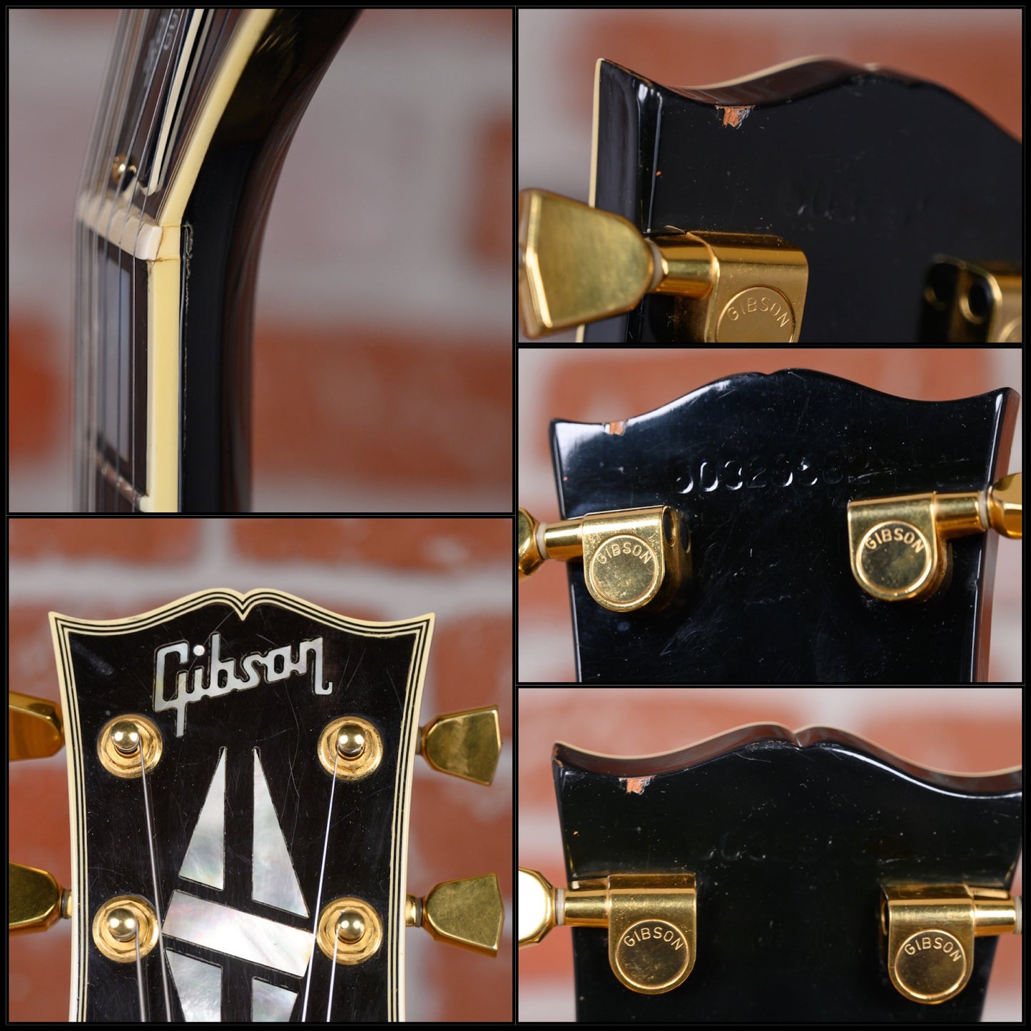 Vintage Gibson Les Paul Custom in Ebony finish made in 1989 with Original Hard Shell Case. This guitar features a double bound solid mahogany body with a maple top, mahogany neck and bound Ebony fingerboard with a bound headstock. Equipped with it‘s original set of Gibson "The Original" HB-R in the neck position and a Gibson HB-L in the bridge position. Controlled by 2 volume, 2 tone pots and a 3-Way toggle switch, comprised of it's original CTS pots dating the 28th week of 1988. The 24.75" scale length neck has mother of pearl block inlays and black side markers with 22 medium jumbo frets on a 12" radius with a slim taper profile. The hardware is comprised of gold Gibson Sealed Diecast tuning machines with keystone heads, a corian nut, a Gibson Nashville Tune-O-Matic Bridge and black speed knobs with a 5-Ply black pickguard.