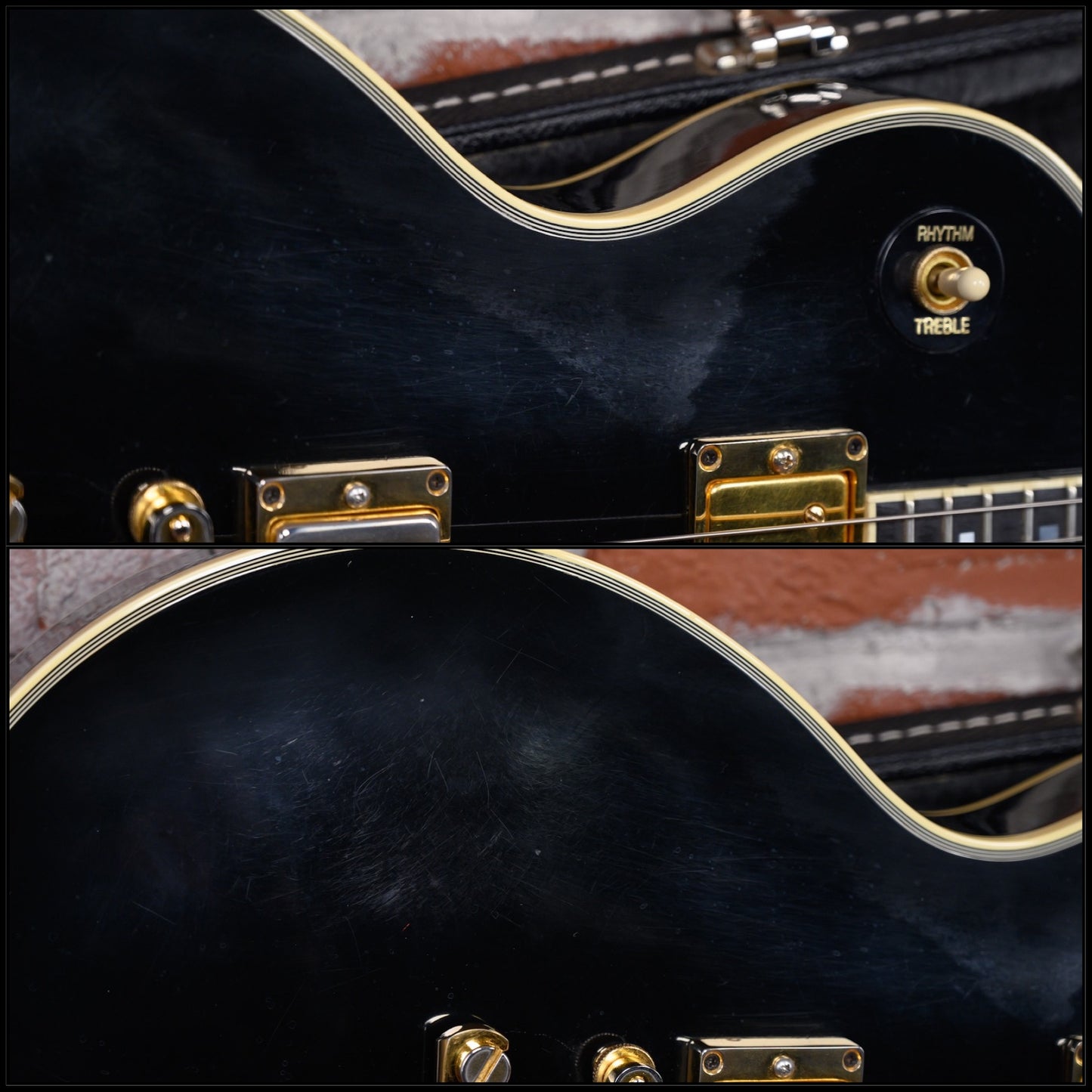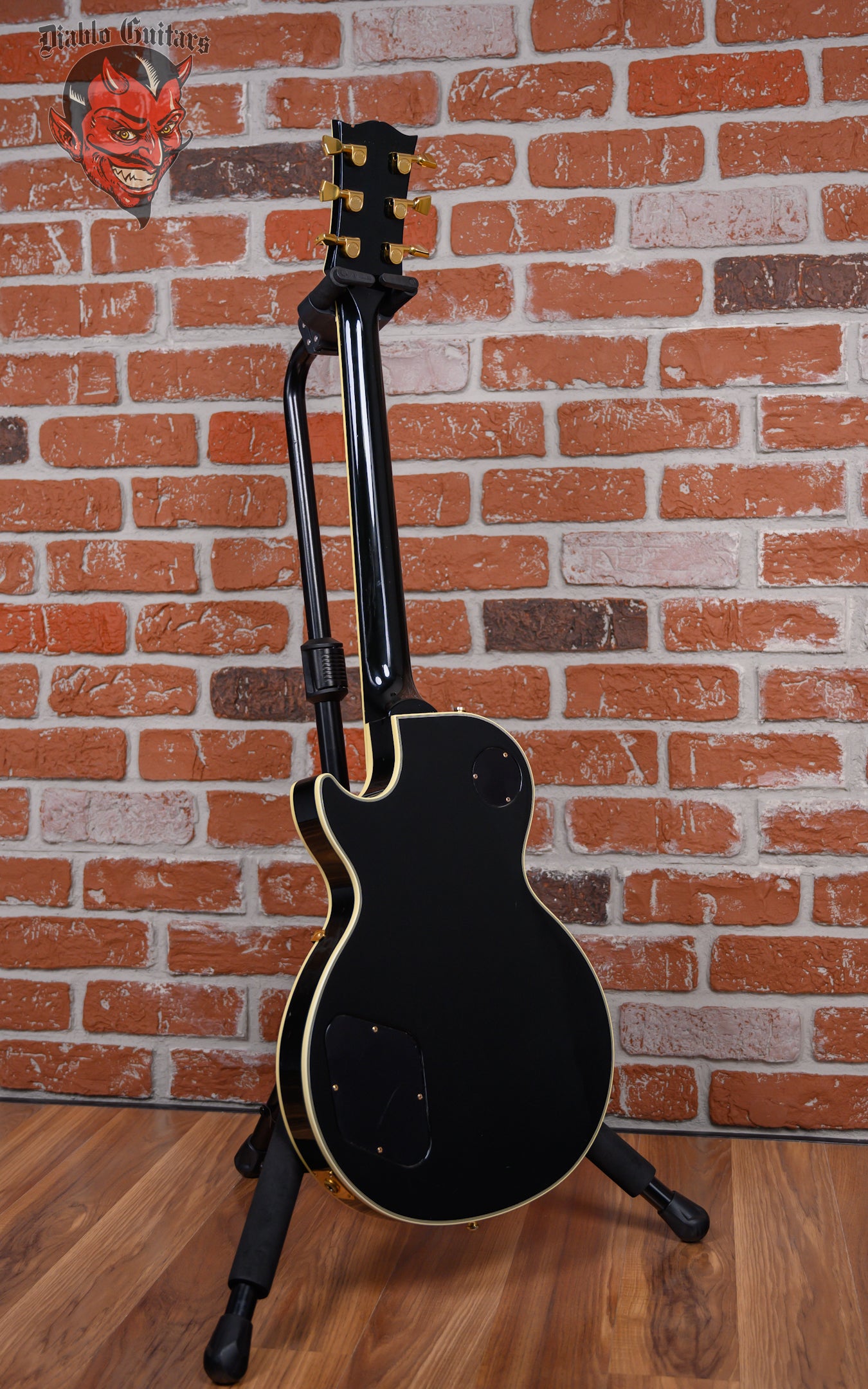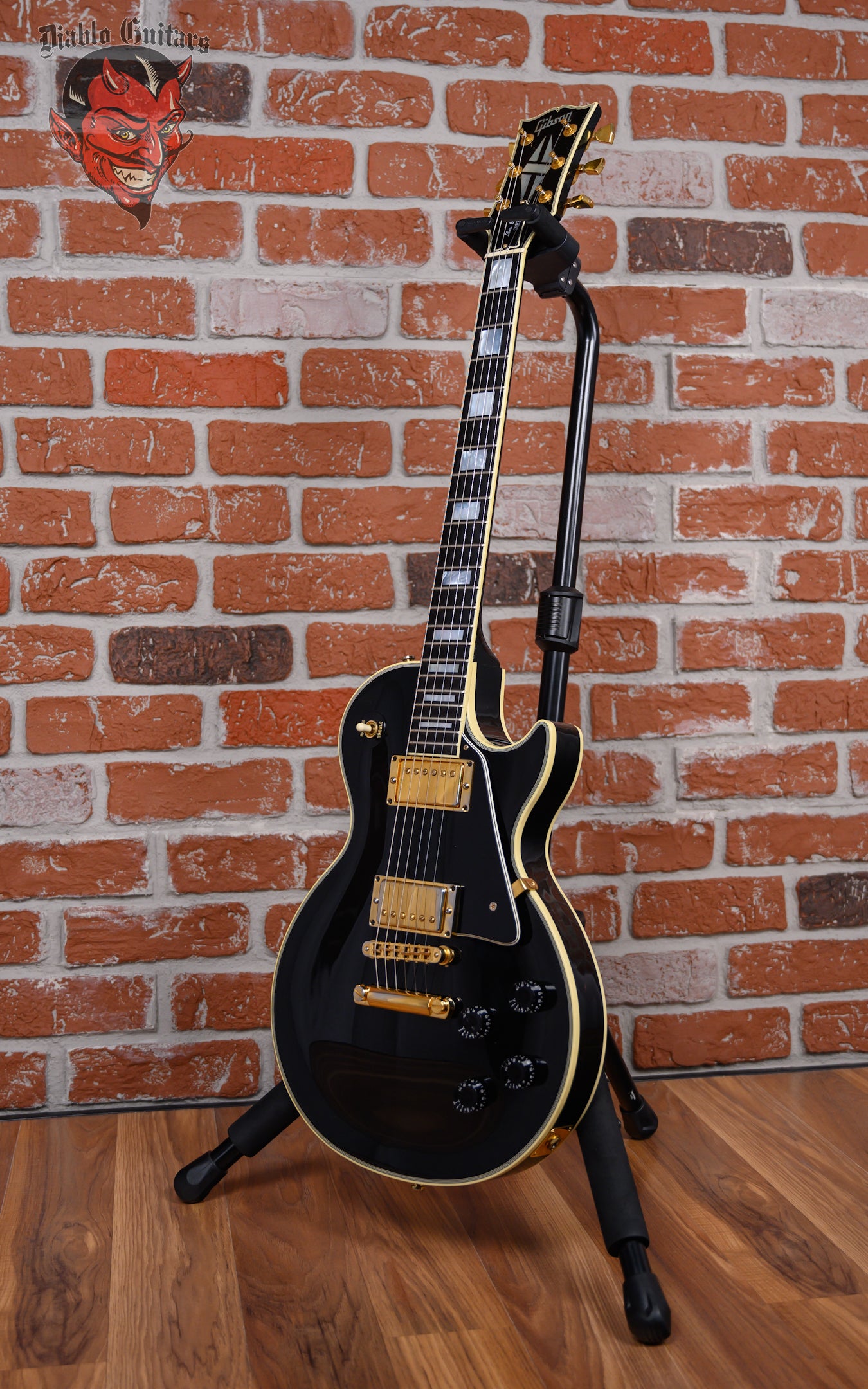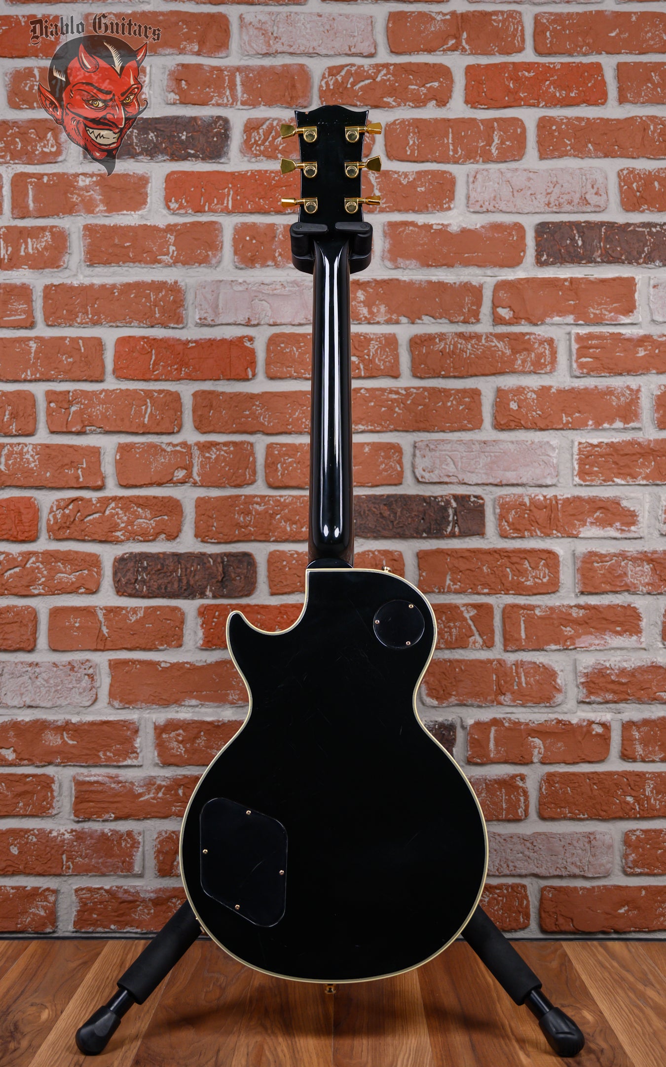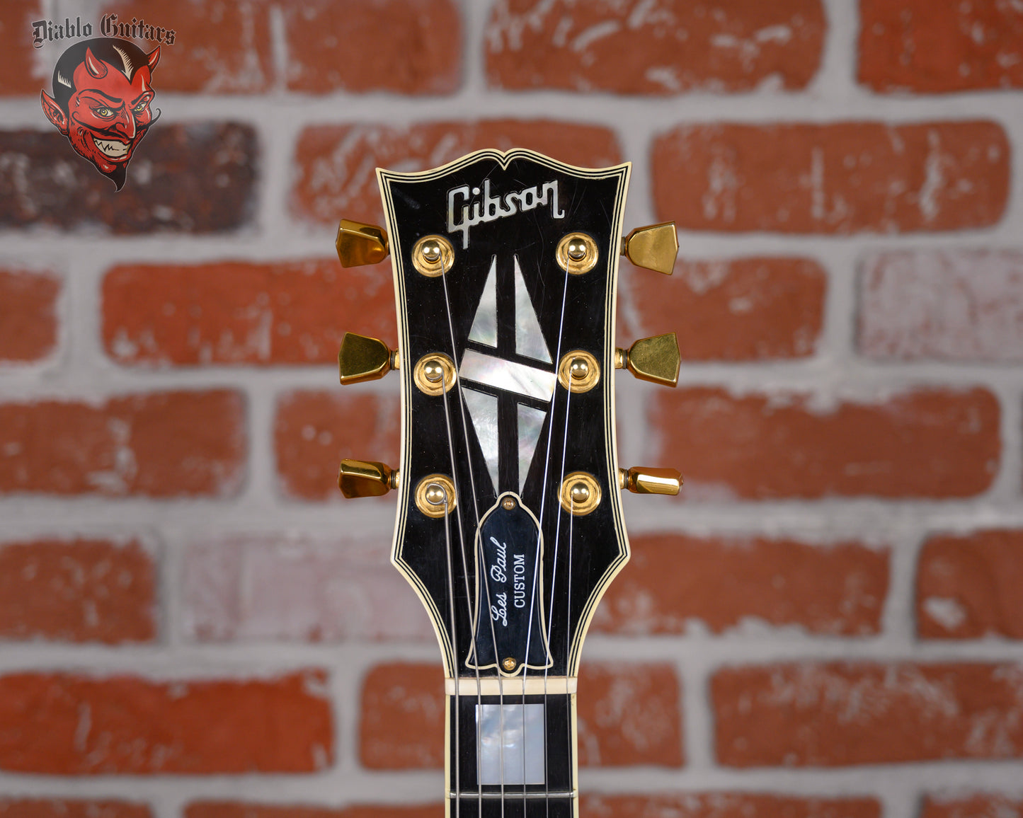 Vintage Gibson Les Paul Custom in Ebony finish made in 1989 with Original Hard Shell Case. This guitar features a double bound solid mahogany body with a maple top, mahogany neck and bound Ebony fingerboard with a bound headstock. Equipped with it‘s original set of Gibson "The Original" HB-R in the neck position and a Gibson HB-L in the bridge position. Controlled by 2 volume, 2 tone pots and a 3-Way toggle switch, comprised of it's original CTS pots dating the 28th week of 1988. The 24.75" scale length neck has mother of pearl block inlays and black side markers with 22 medium jumbo frets on a 12" radius with a slim taper profile. The hardware is comprised of gold Gibson Sealed Diecast tuning machines with keystone heads, a corian nut, a Gibson Nashville Tune-O-Matic Bridge and black speed knobs with a 5-Ply black pickguard.