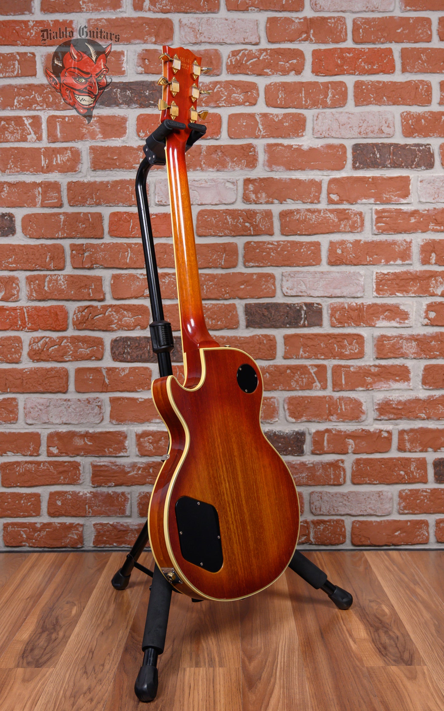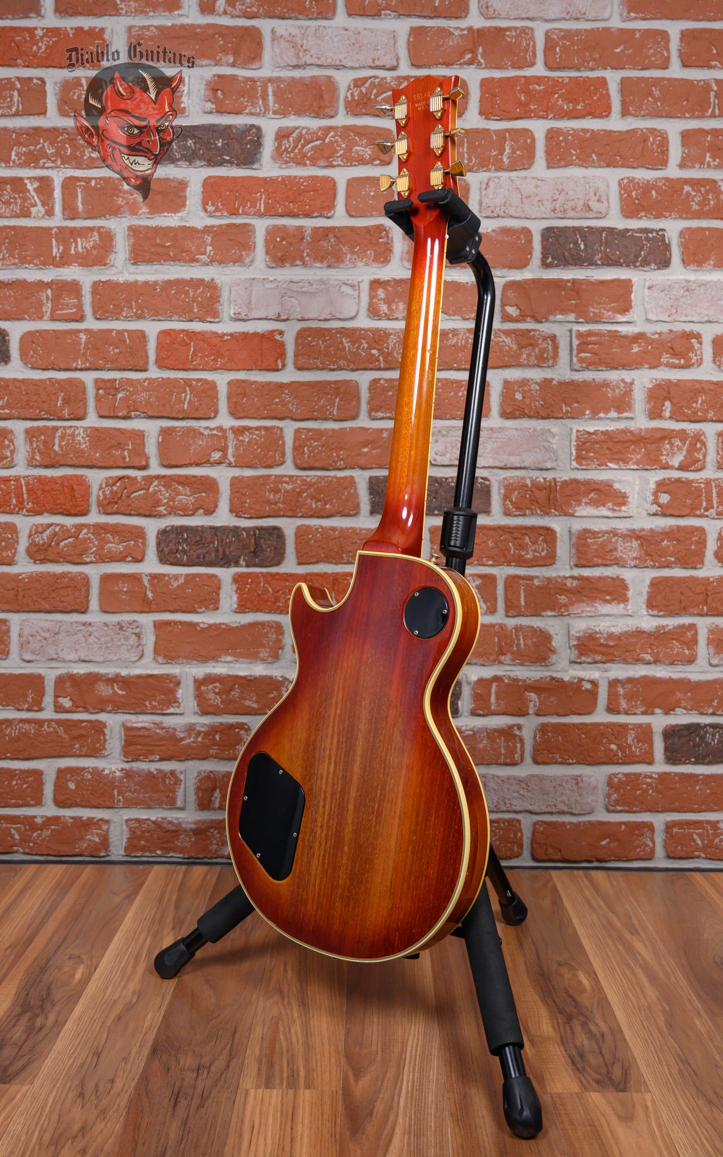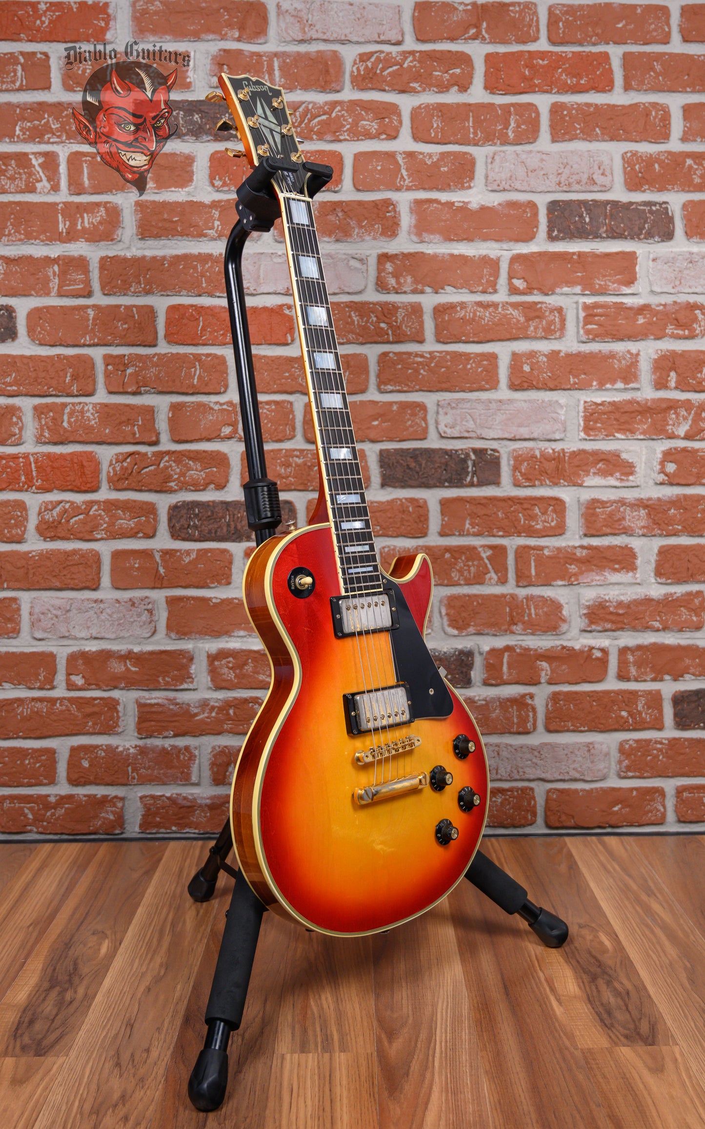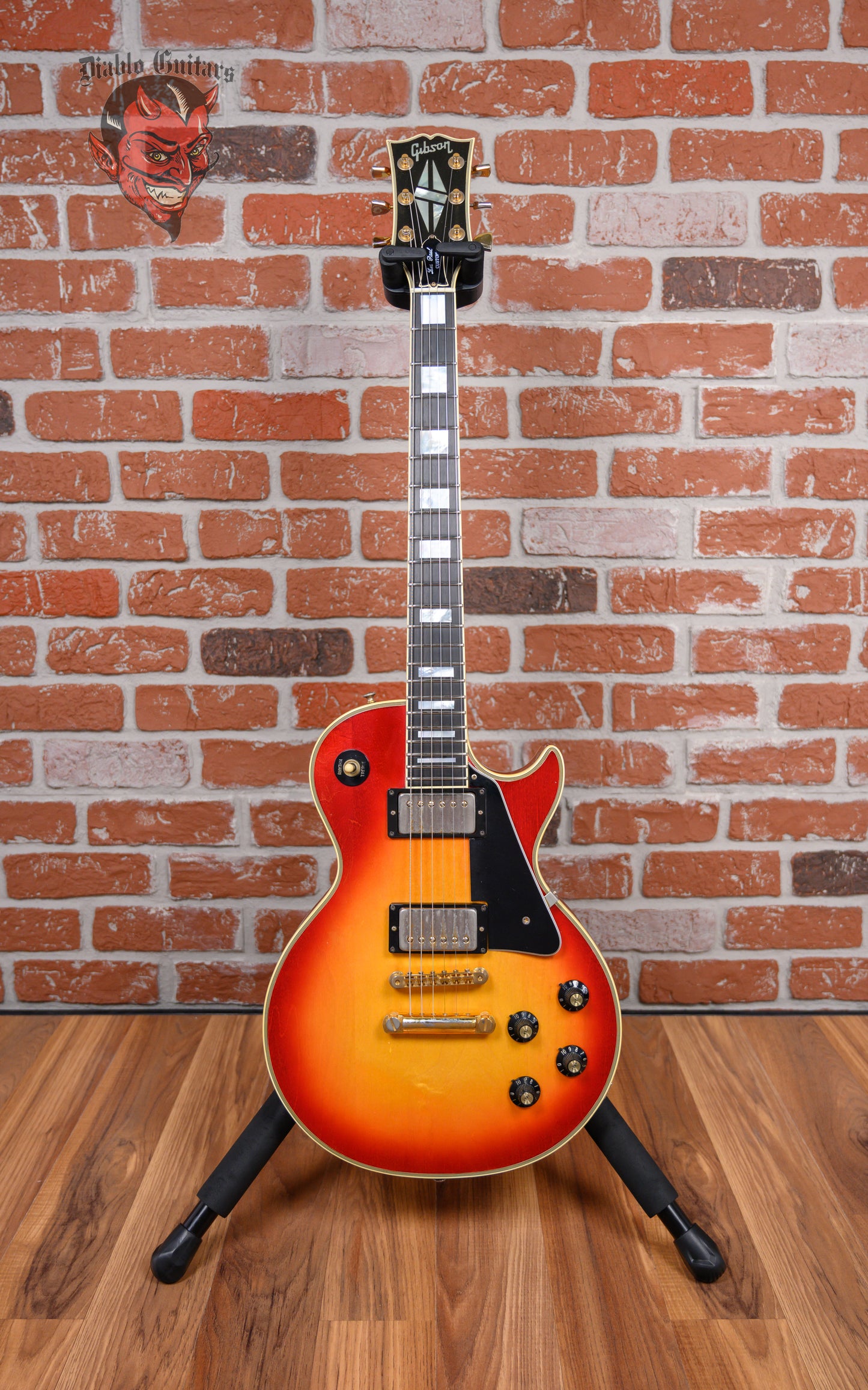 Vintage Gibson Les Paul Custom in Cherry Sunburst finish made in 1975 with Original Hard Shell Case. This guitar features a double bound solid 3-piece sandwiched mahogany/maple/mahogany body with a maple top, 3-piece mahogany neck and bound ebony fingerboard with a bound headstock. Equipped with its original set of Gibson Patent Stamp humbuckers in the neck and bridge positions. Controlled by 2 volume pots & 2 tone pots and a 3-way toggle switch comprised of its original CTS pots dating to the 39th week of 1975. The 24.75" scale length neck has mother of pearl block inlays and black side markers refretted with 22 medium jumbo frets on a 12" radius with a slim taper profile. The hardware is comprised of gold Kluson Waffle Back tuning machines with keystone heads, a bone nut, an upgraded Tone Pros AVR-2 Tune-O-Matic bridge and witch hat knobs with a 5-ply black on white pickguard.