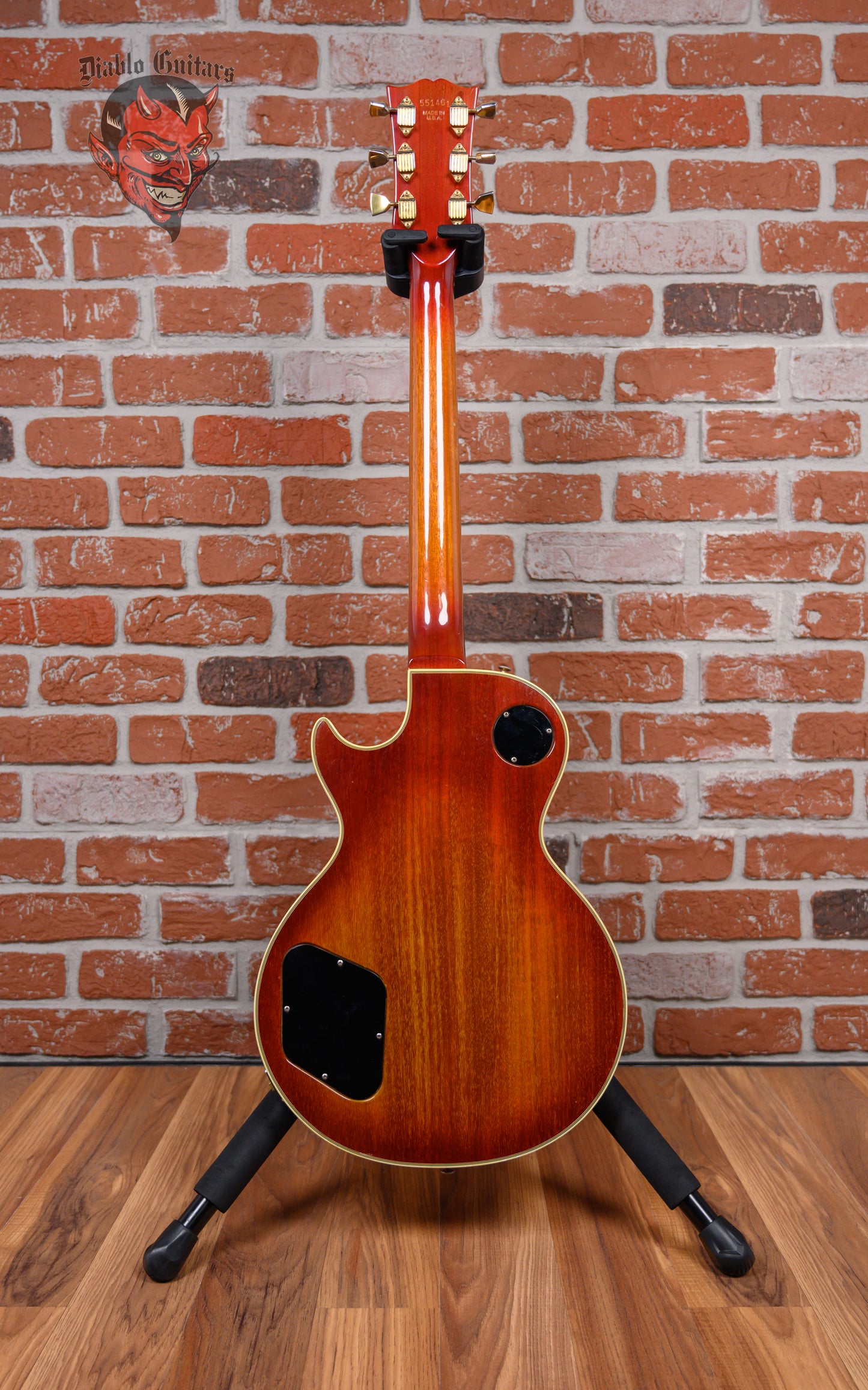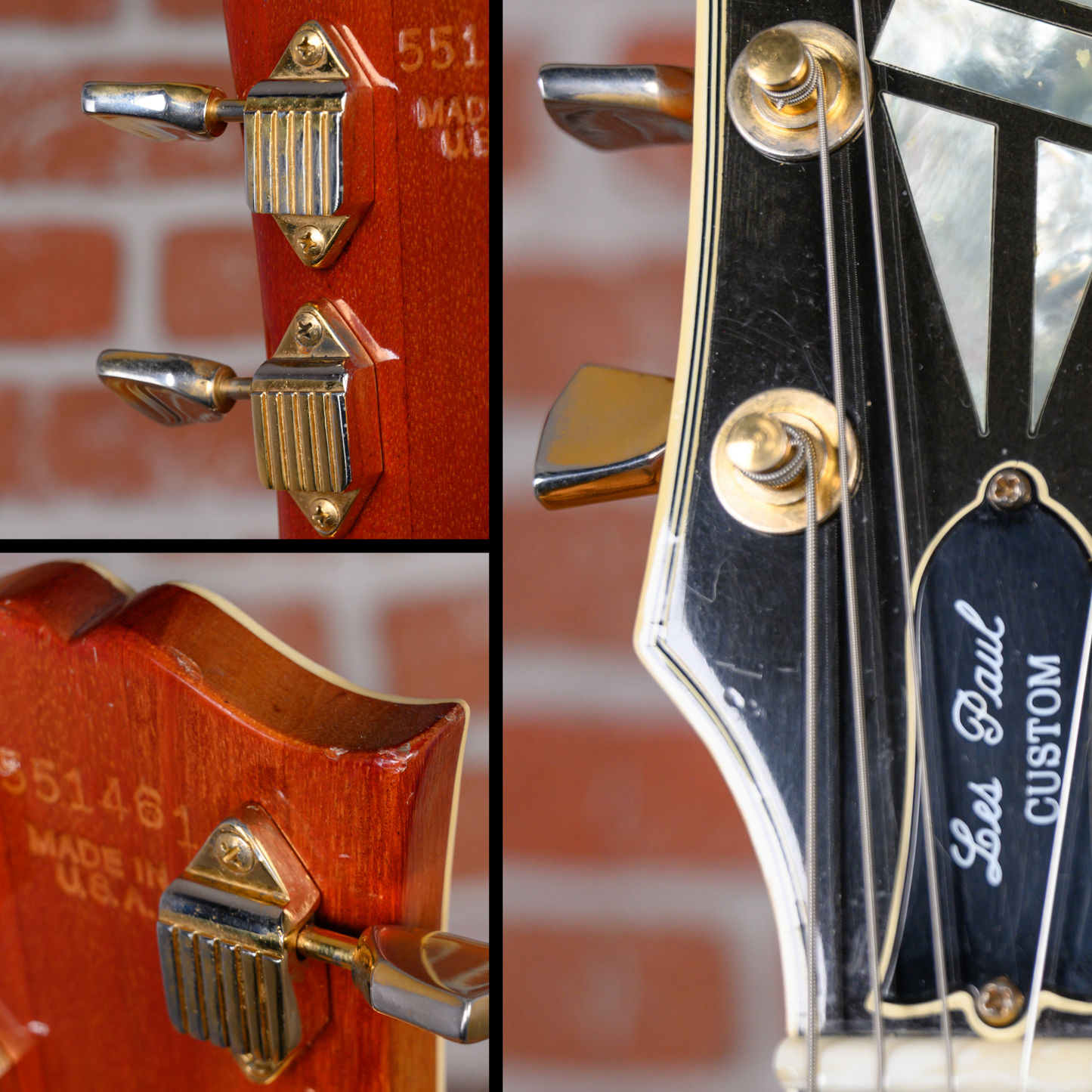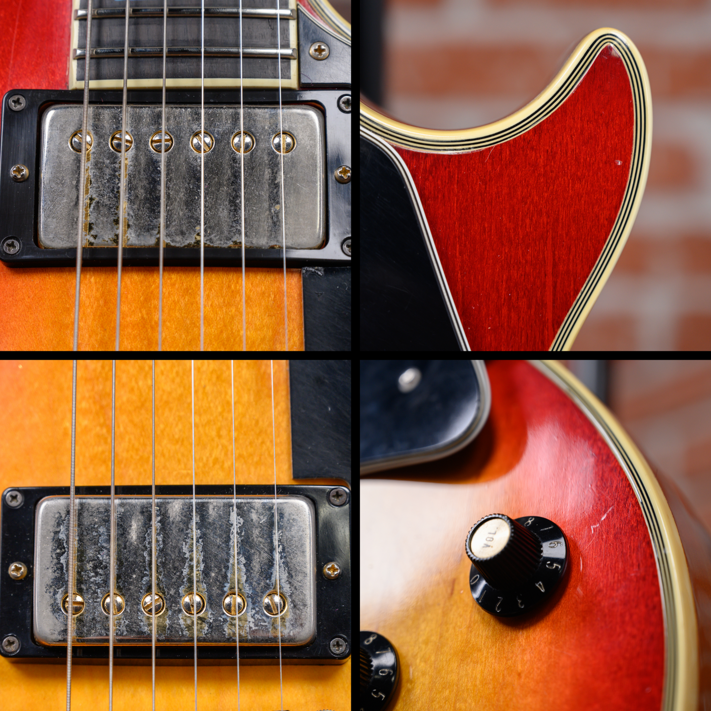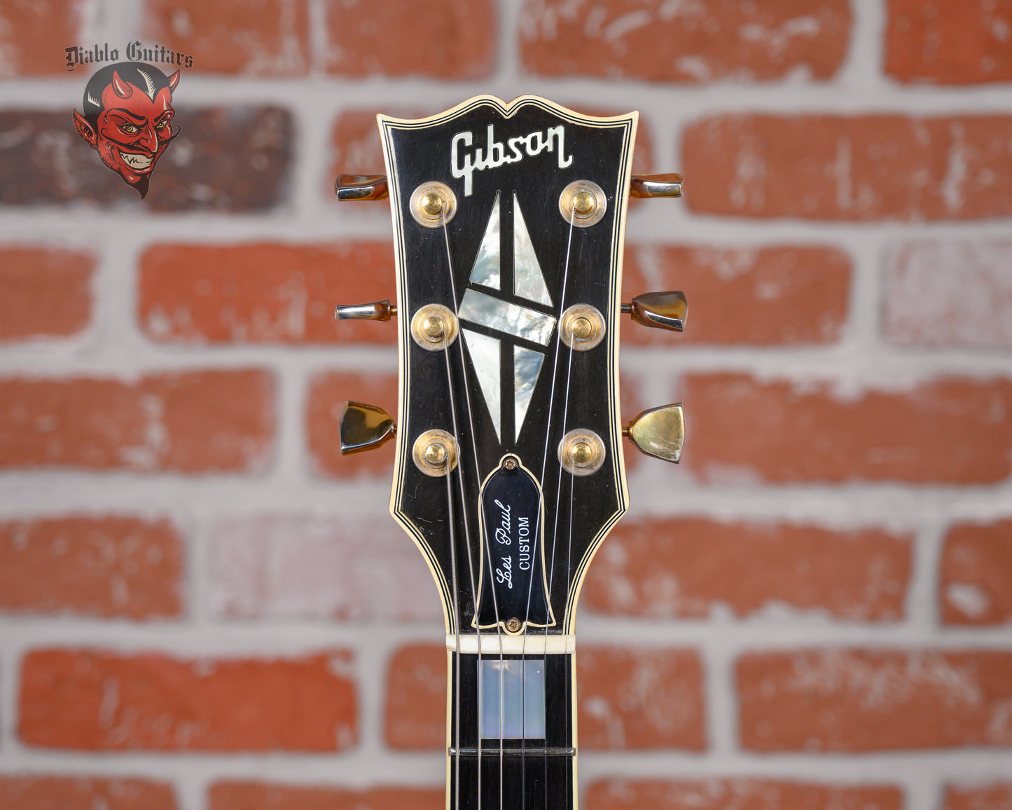 Vintage Gibson Les Paul Custom in Cherry Sunburst finish made in 1975 with Original Hard Shell Case. This guitar features a double bound solid 3-piece sandwiched mahogany/maple/mahogany body with a maple top, 3-piece mahogany neck and bound ebony fingerboard with a bound headstock. Equipped with its original set of Gibson Patent Stamp humbuckers in the neck and bridge positions. Controlled by 2 volume pots & 2 tone pots and a 3-way toggle switch comprised of its original CTS pots dating to the 39th week of 1975. The 24.75" scale length neck has mother of pearl block inlays and black side markers refretted with 22 medium jumbo frets on a 12" radius with a slim taper profile. The hardware is comprised of gold Kluson Waffle Back tuning machines with keystone heads, a bone nut, an upgraded Tone Pros AVR-2 Tune-O-Matic bridge and witch hat knobs with a 5-ply black on white pickguard.