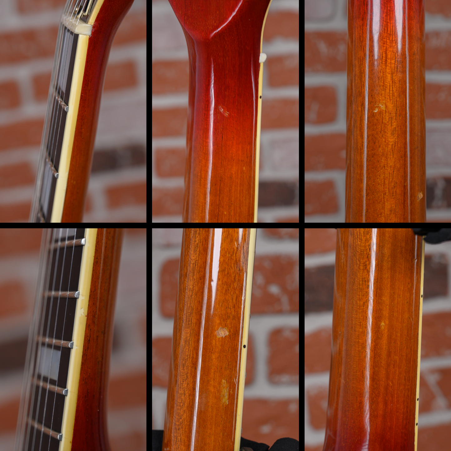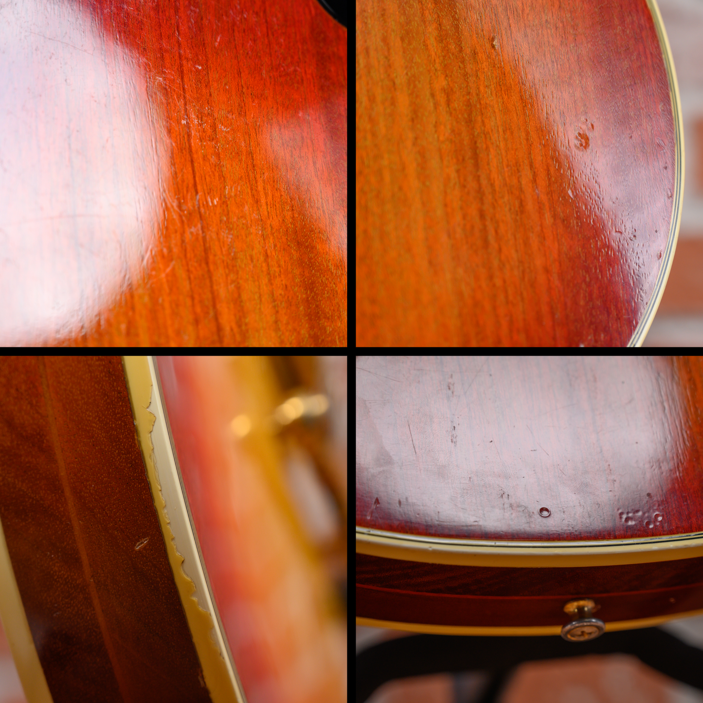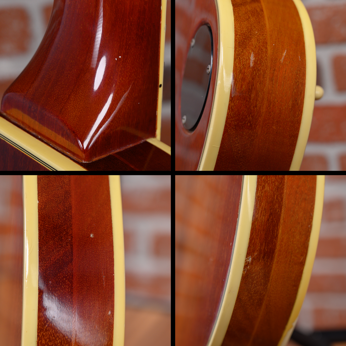 This guitar is in overall very good condition. At some point in its life it received a refret and a new nut. There is a ding on the nut on the bass end. There are light surface marks and small dings throughout. The plating on the hardware is worn on the tuners and parts of the bridge. There are some circular marks on the back of the body along with some belt rash and a few light dings. (See Pics)