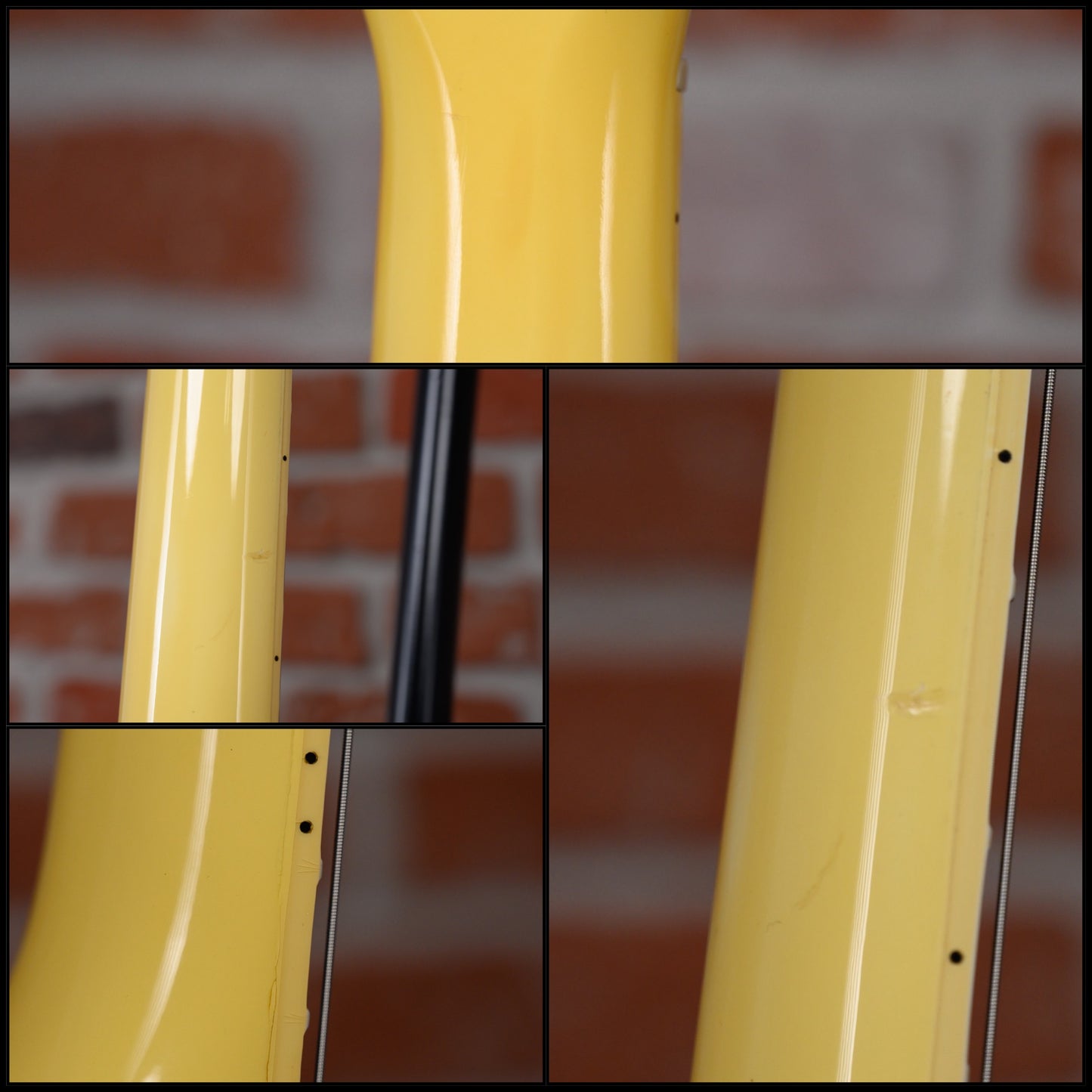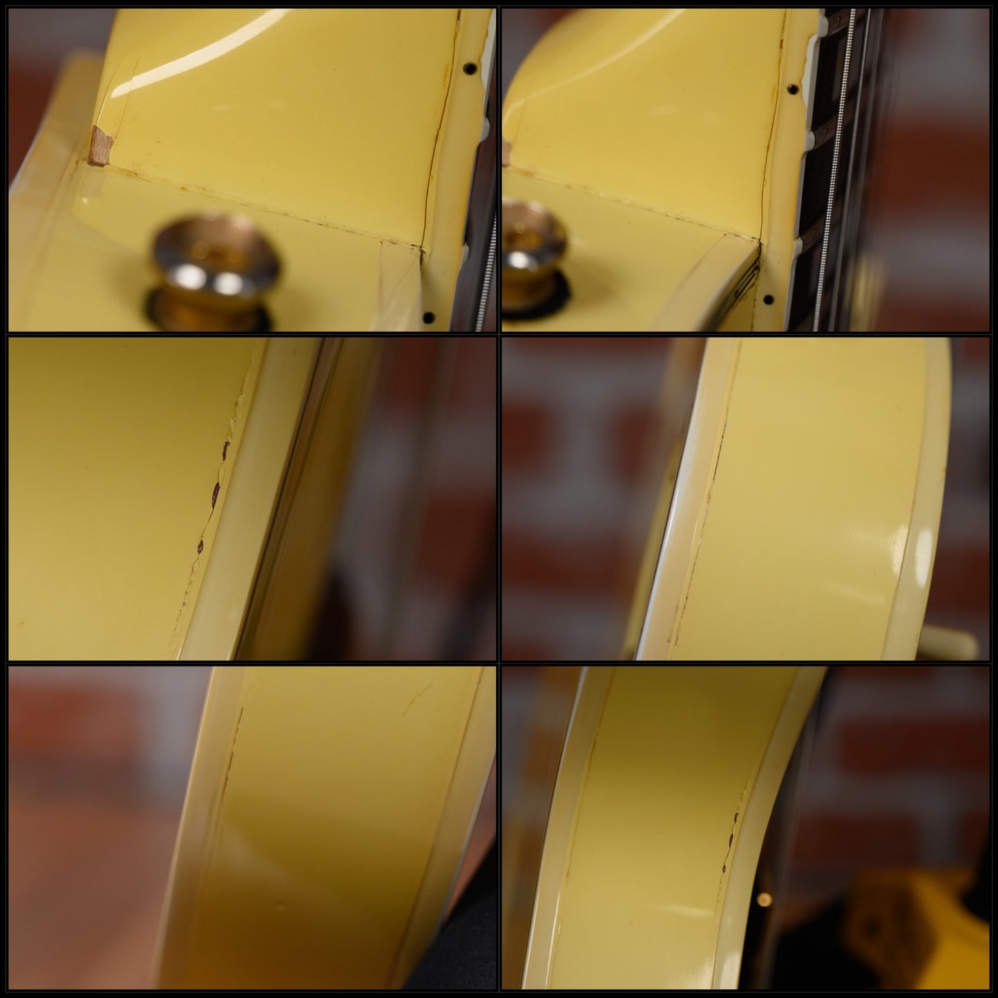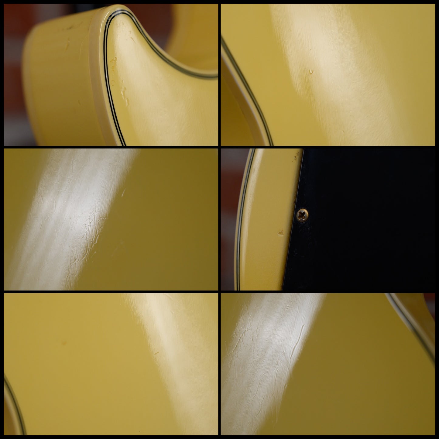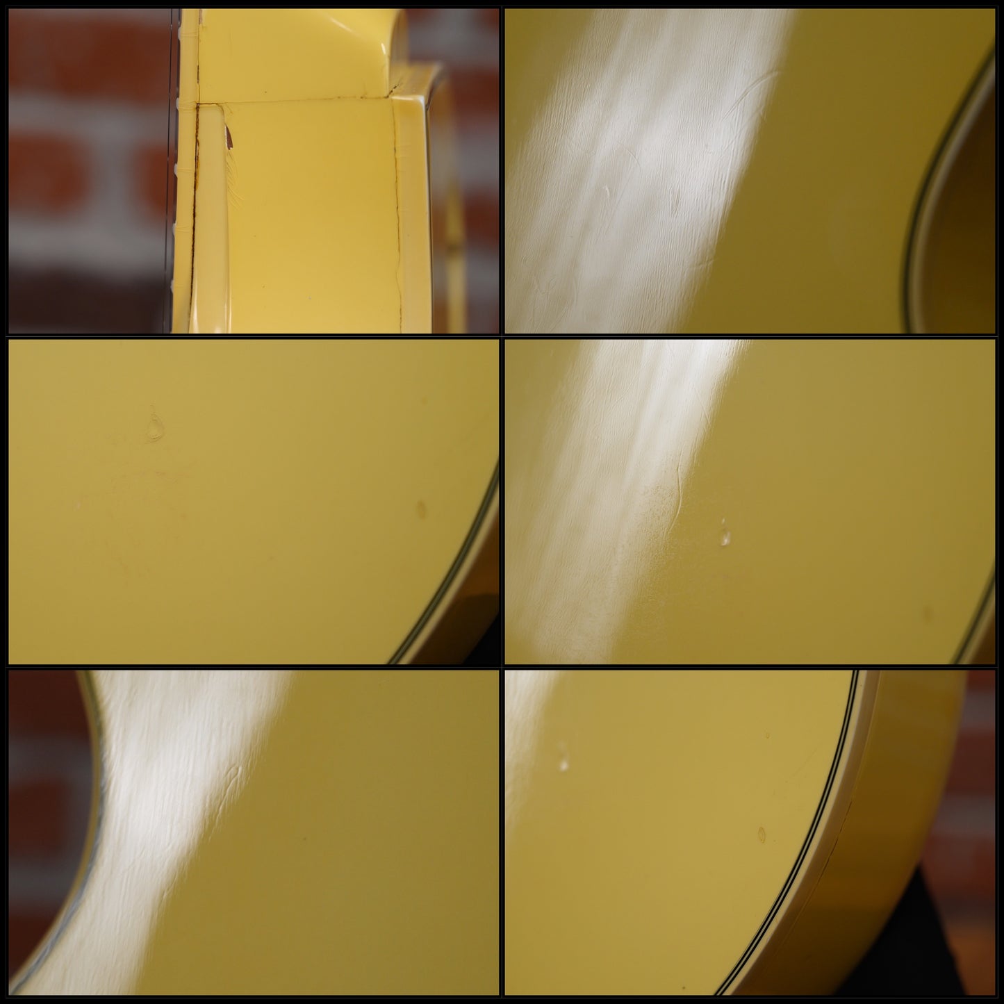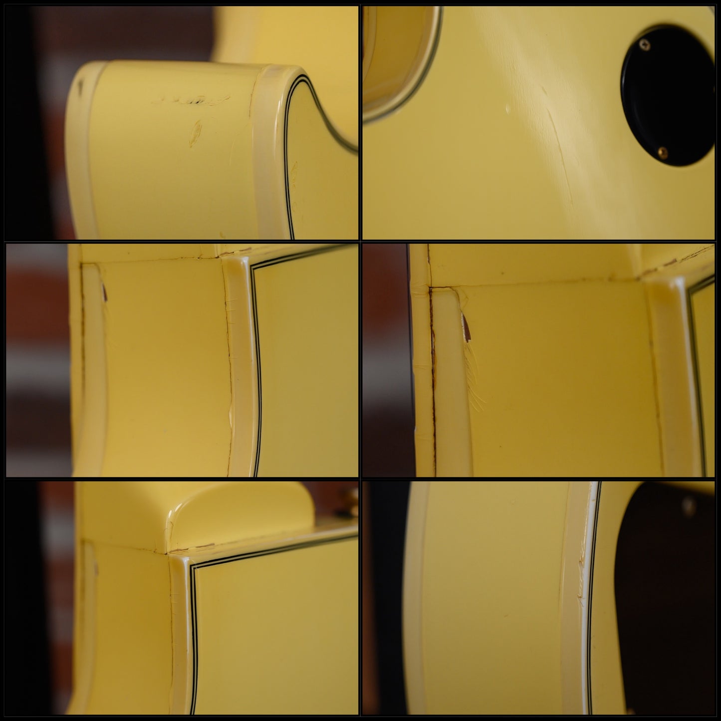 This guitar is in overall very good condition with signs of play and age. It has surface marks, some belt rash, a few dings/ dents and small finish chips and binding/ seam shrinkage marks and some finish splits along its binding and body edges which two have been filled and sealed to prevent further splitting, but still visible. (See Pics)