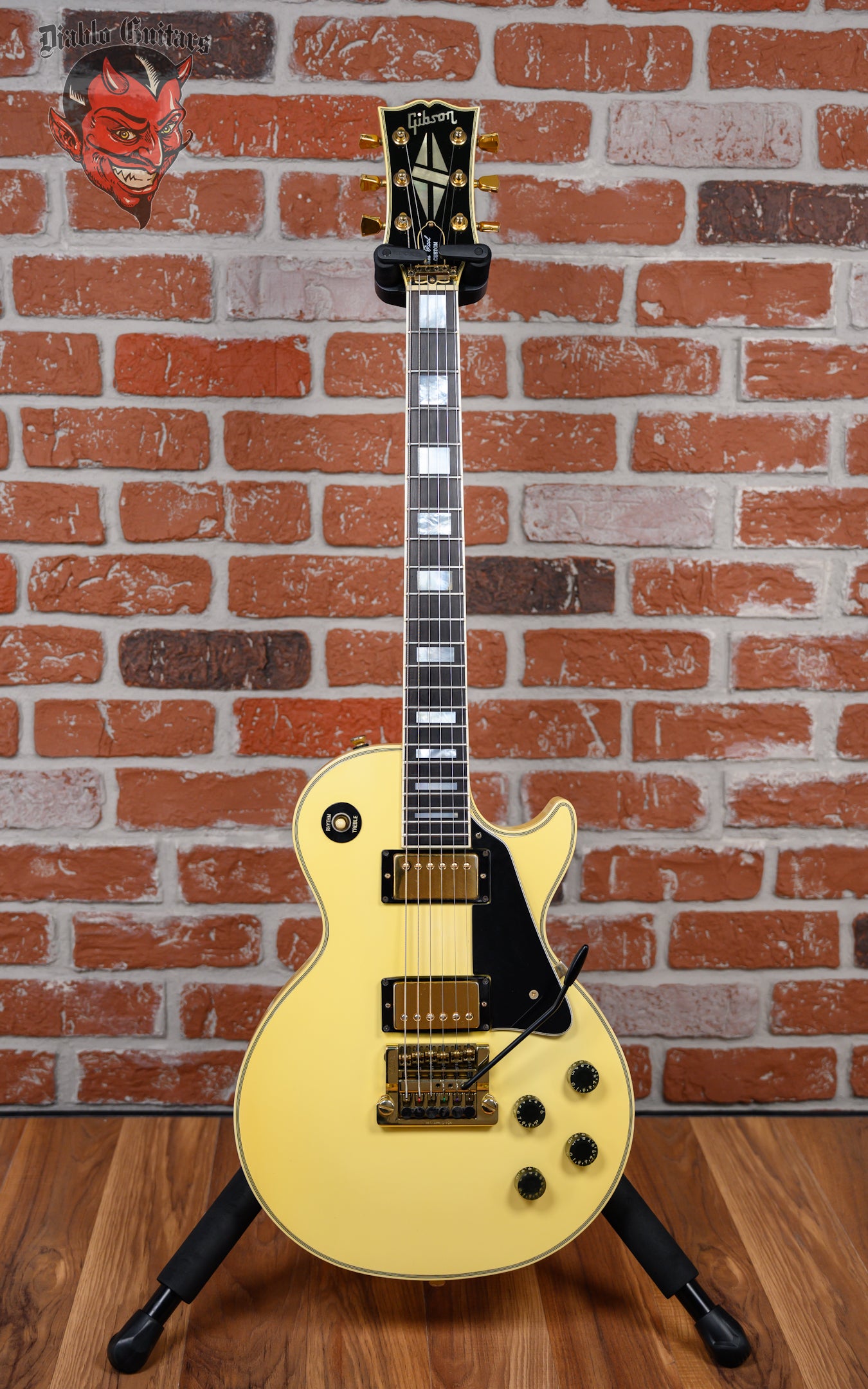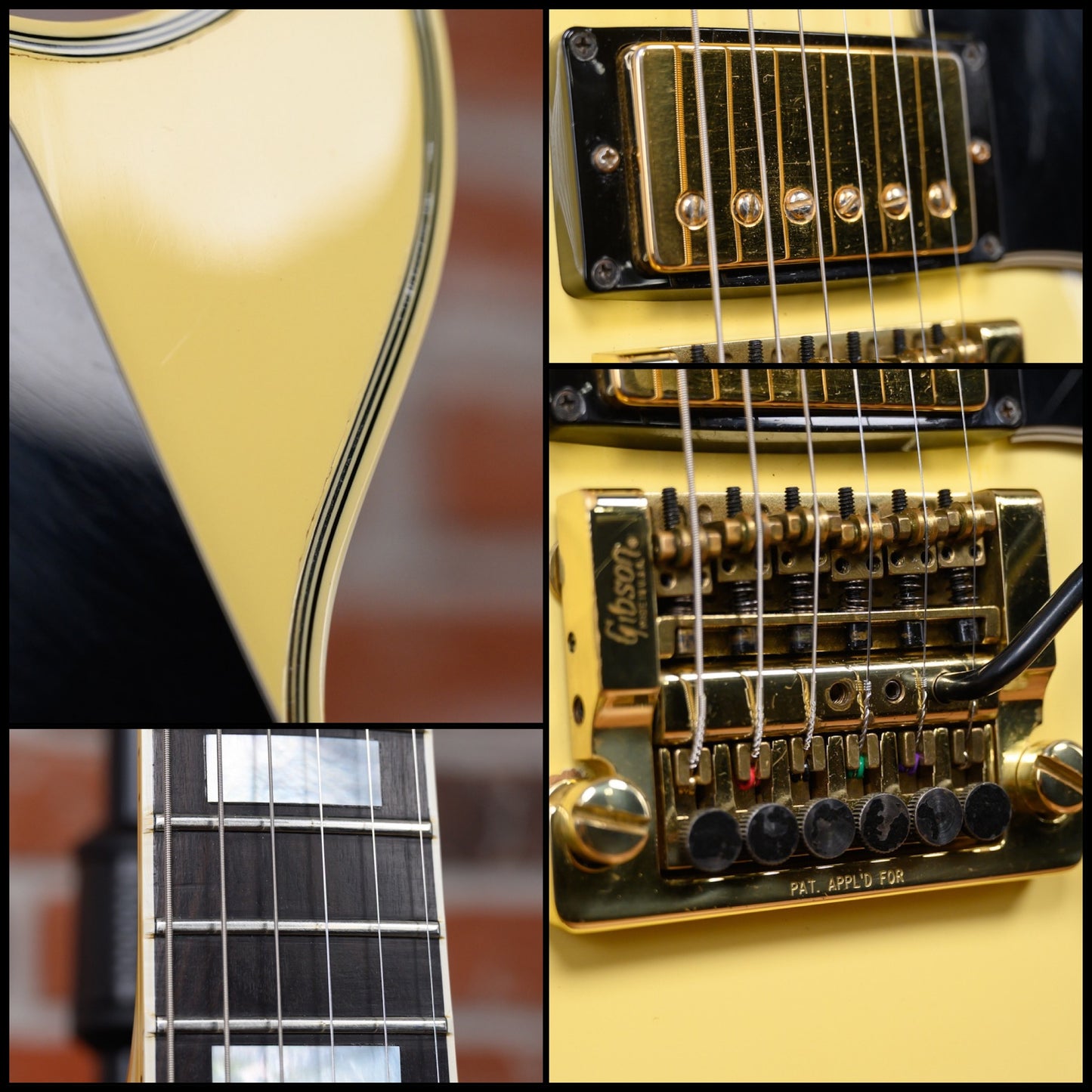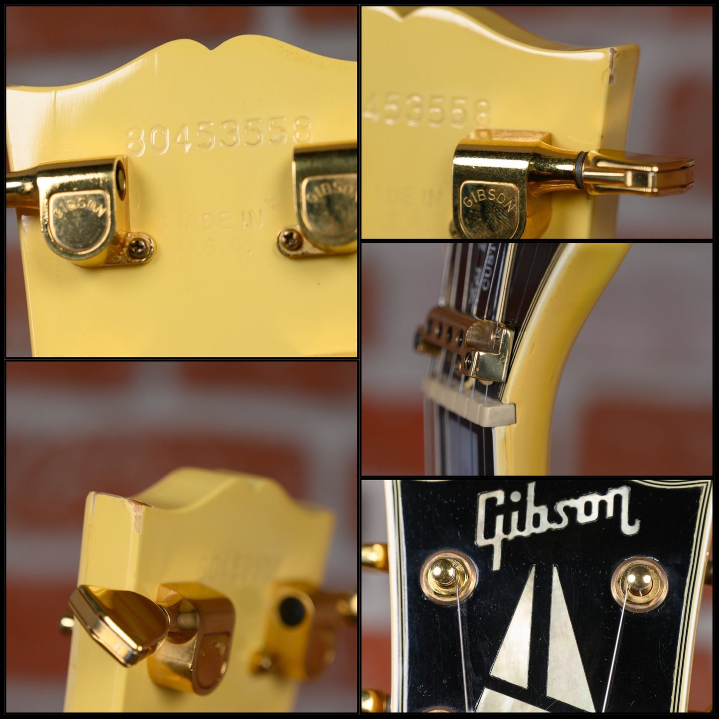 Vintage Gibson Les Paul Custom with Vibrola in Ivory finish made in 1983 with Original Hard Shell Case. This guitar features a double bound solid mahogany body with a maple top, 3-Piece maple neck and bound ebony fingerboard with a bound headstock. Equipped with its orginal Gibson Patent Number in the neck position and a later model Gibson 498T in the bridge position. Controlled by 2 volume, 2 tone pots and a 3-Way toggle switch comprised of its original CTS pots dating to the 52nd week of 1982. The 24.75" scale length neck has mother of pearl block inlays and black side markers with 22 medium jumbo frets on a 12" radius with a slim taper profile. The hardware is comprised of gold Gibson "The Crank" tuning machines with keystone heads, a corian nut with string lock, a Gibson branded Kahler Super Tune Vibrola bridge and black speed knobs with a 5-Ply black pickguard.