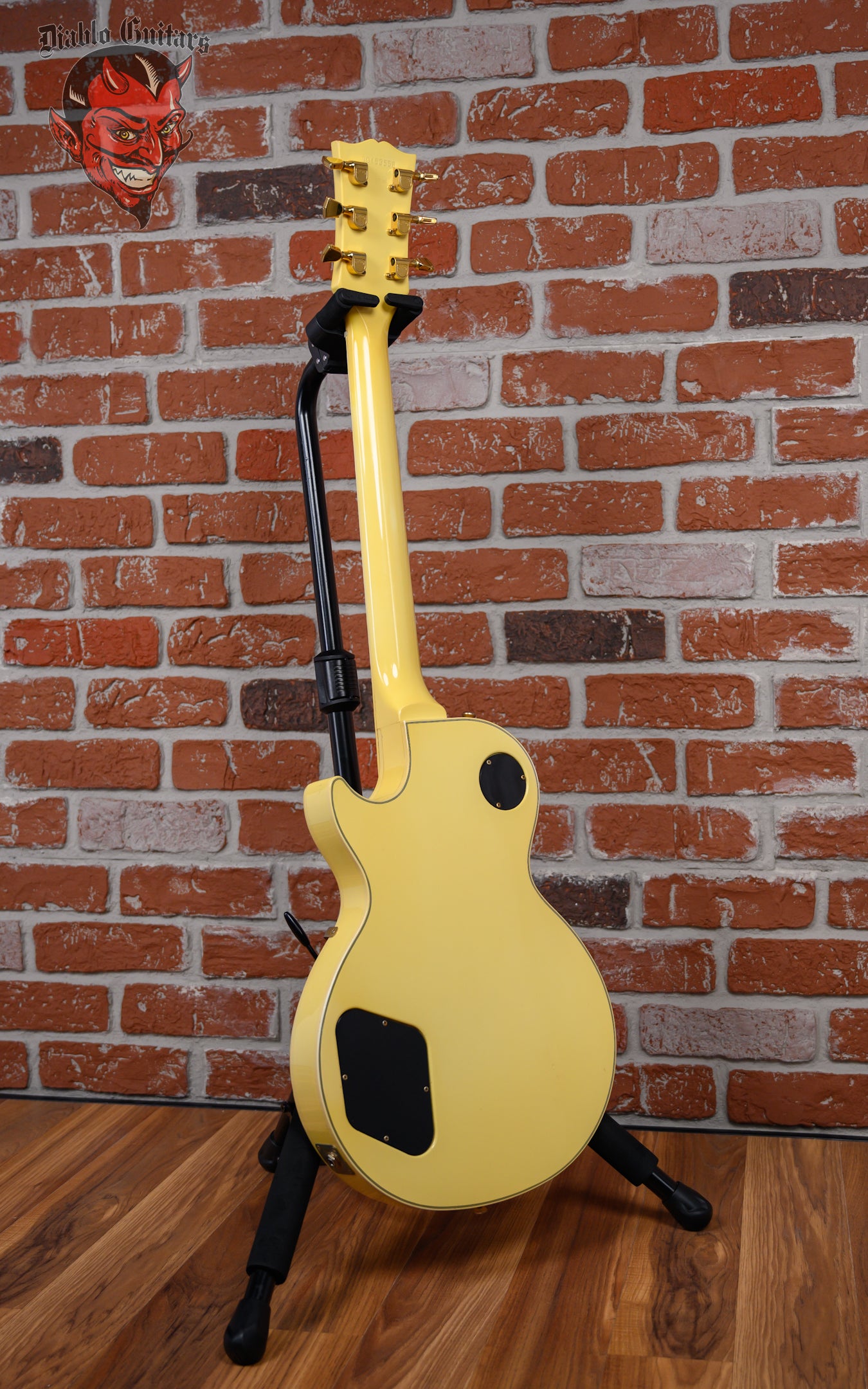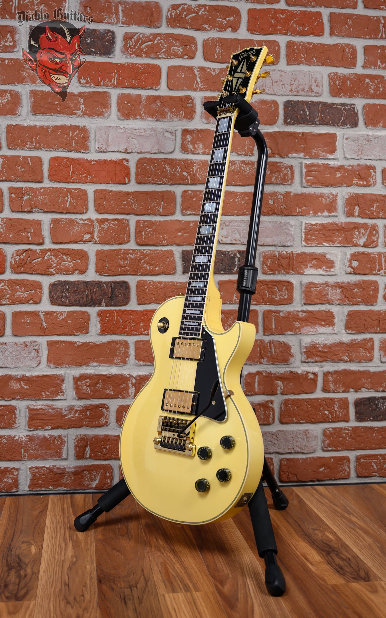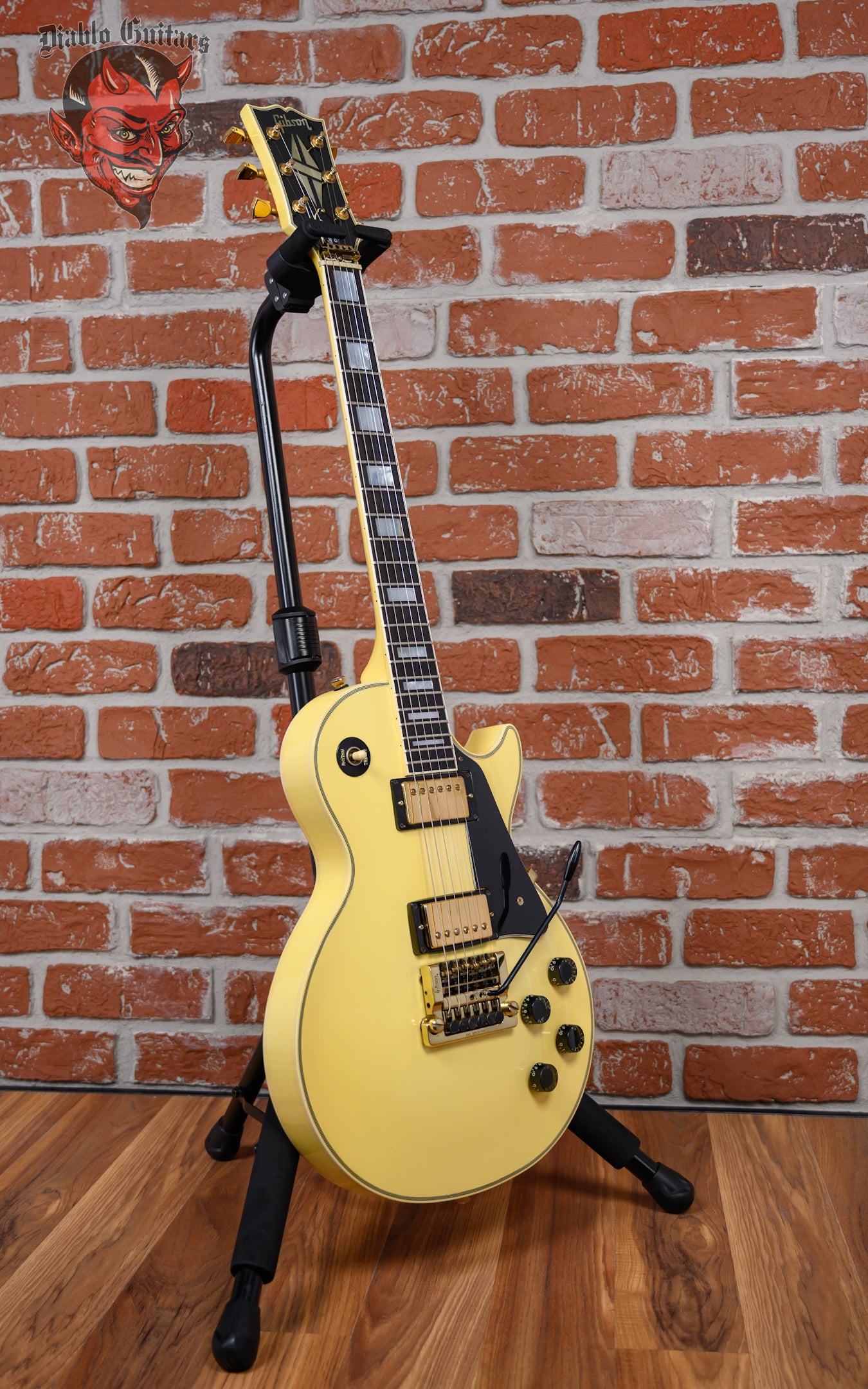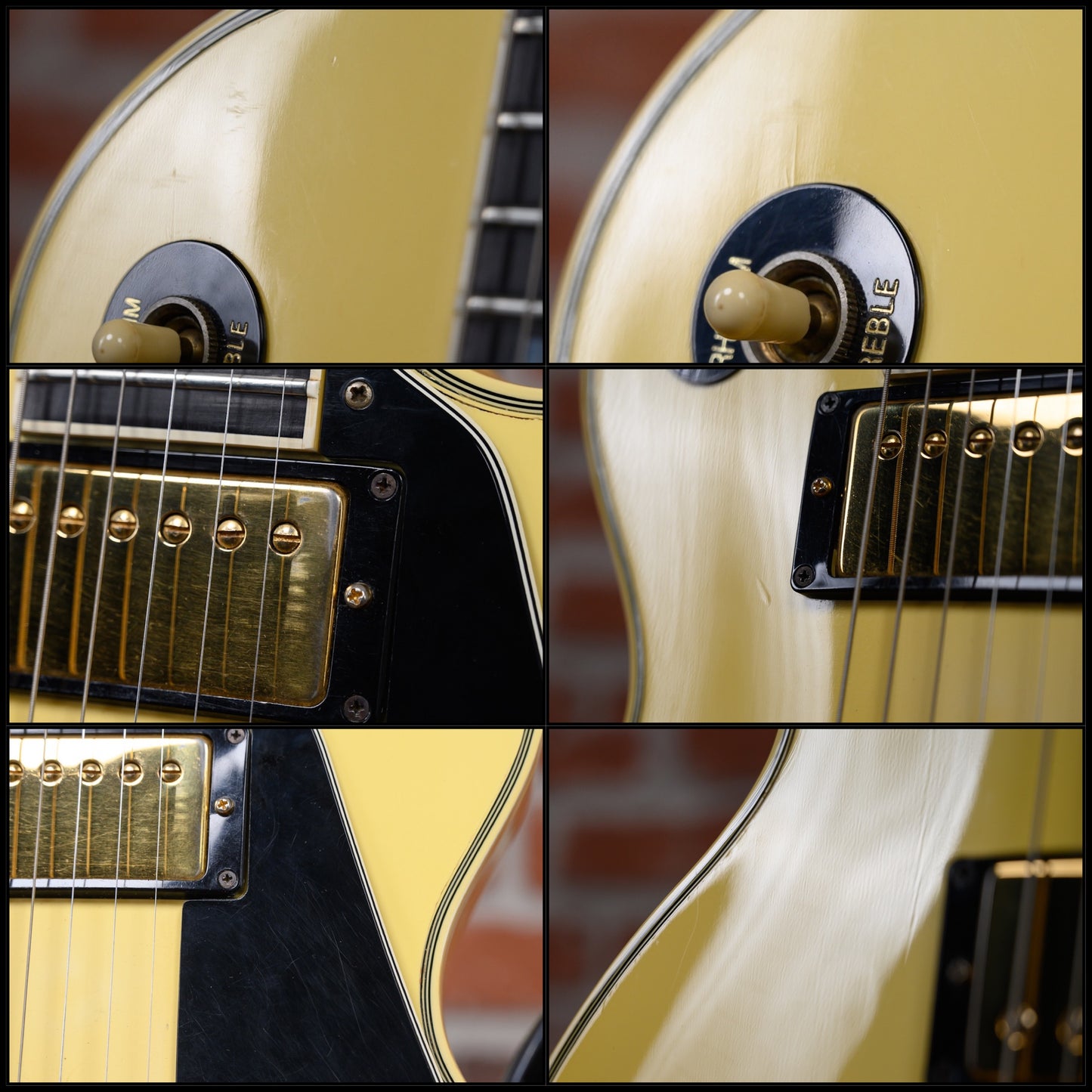 Vintage Gibson Les Paul Custom with Vibrola in Ivory finish made in 1983 with Original Hard Shell Case. This guitar features a double bound solid mahogany body with a maple top, 3-Piece maple neck and bound ebony fingerboard with a bound headstock. Equipped with its orginal Gibson Patent Number in the neck position and a later model Gibson 498T in the bridge position. Controlled by 2 volume, 2 tone pots and a 3-Way toggle switch comprised of its original CTS pots dating to the 52nd week of 1982. The 24.75" scale length neck has mother of pearl block inlays and black side markers with 22 medium jumbo frets on a 12" radius with a slim taper profile. The hardware is comprised of gold Gibson "The Crank" tuning machines with keystone heads, a corian nut with string lock, a Gibson branded Kahler Super Tune Vibrola bridge and black speed knobs with a 5-Ply black pickguard.