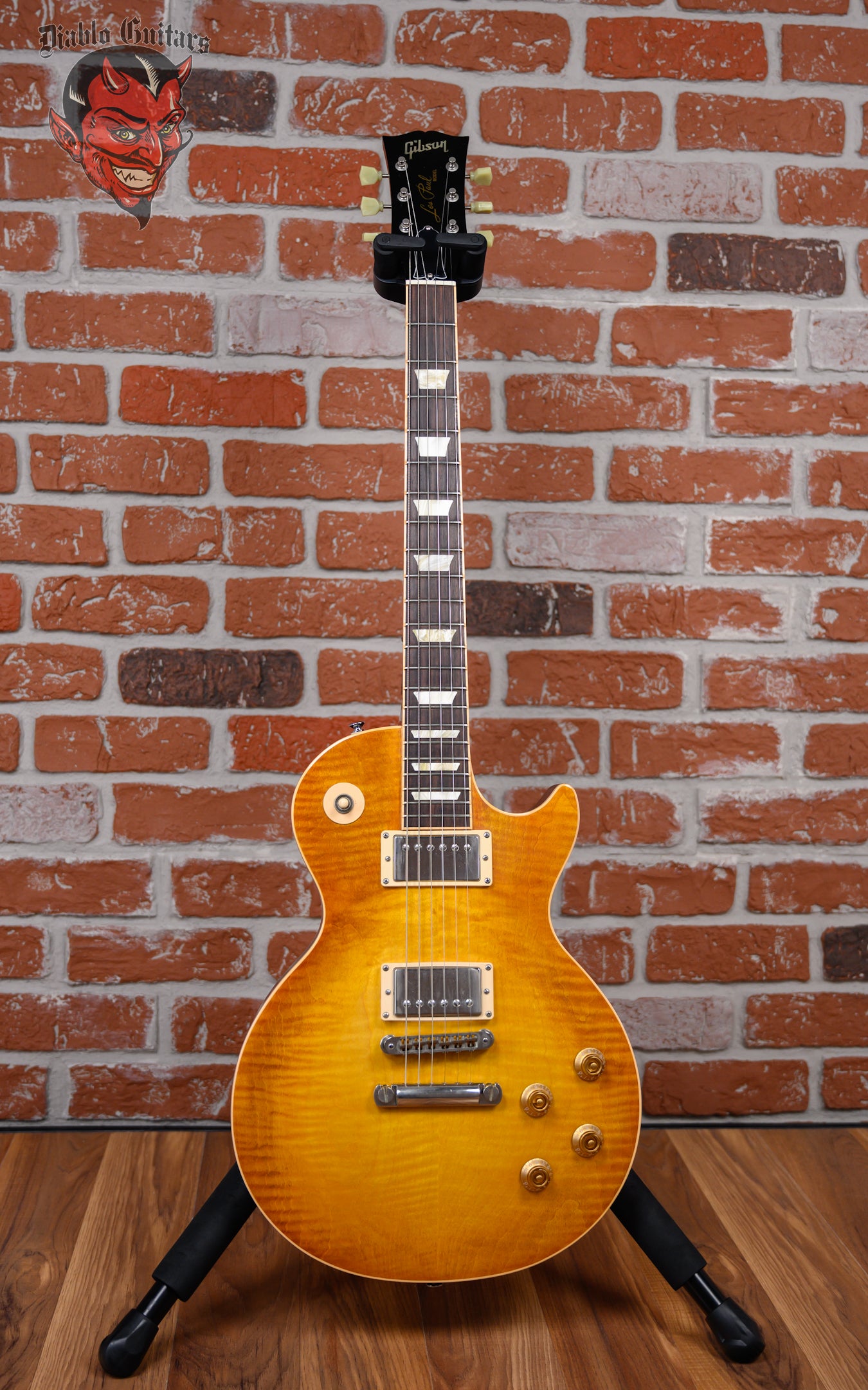 Gibson Les Paul Standard Faded Series in Satin Honey Burst finish made in 2005 with Original Hard Shell Case. This guitar features a solid mahogany body with a bound AA flame maple top, mahogany neck and bound rosewood fingerboard. Equipped with a Gibson Burstbucker Pro in the neck and bridge position. Controlled by 2 volume, 2 tone pots and a 3-Way toggle switch. The 24.75" scale length neck has pearloid trapezoid inlays and black side markers with 22 medium jumbo frets on a 12" radius with a slim taper profile. The hardware is comprised of nickel Gibson Vintage Deluxe tuning machines with keystone heads, a corian nut, a Gibson Nashville Tune-O-Matic Bridge, and gold top hat knobs.
