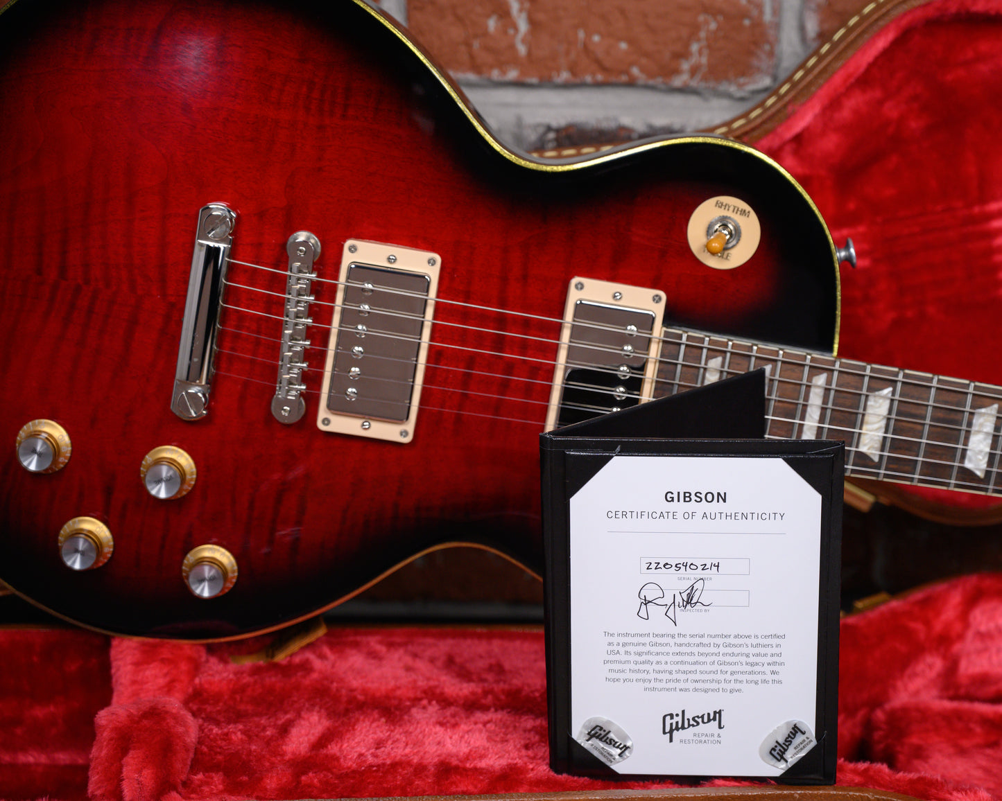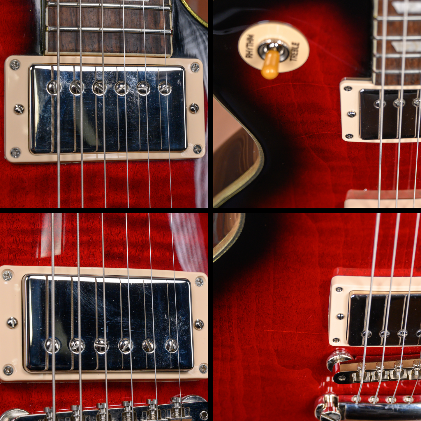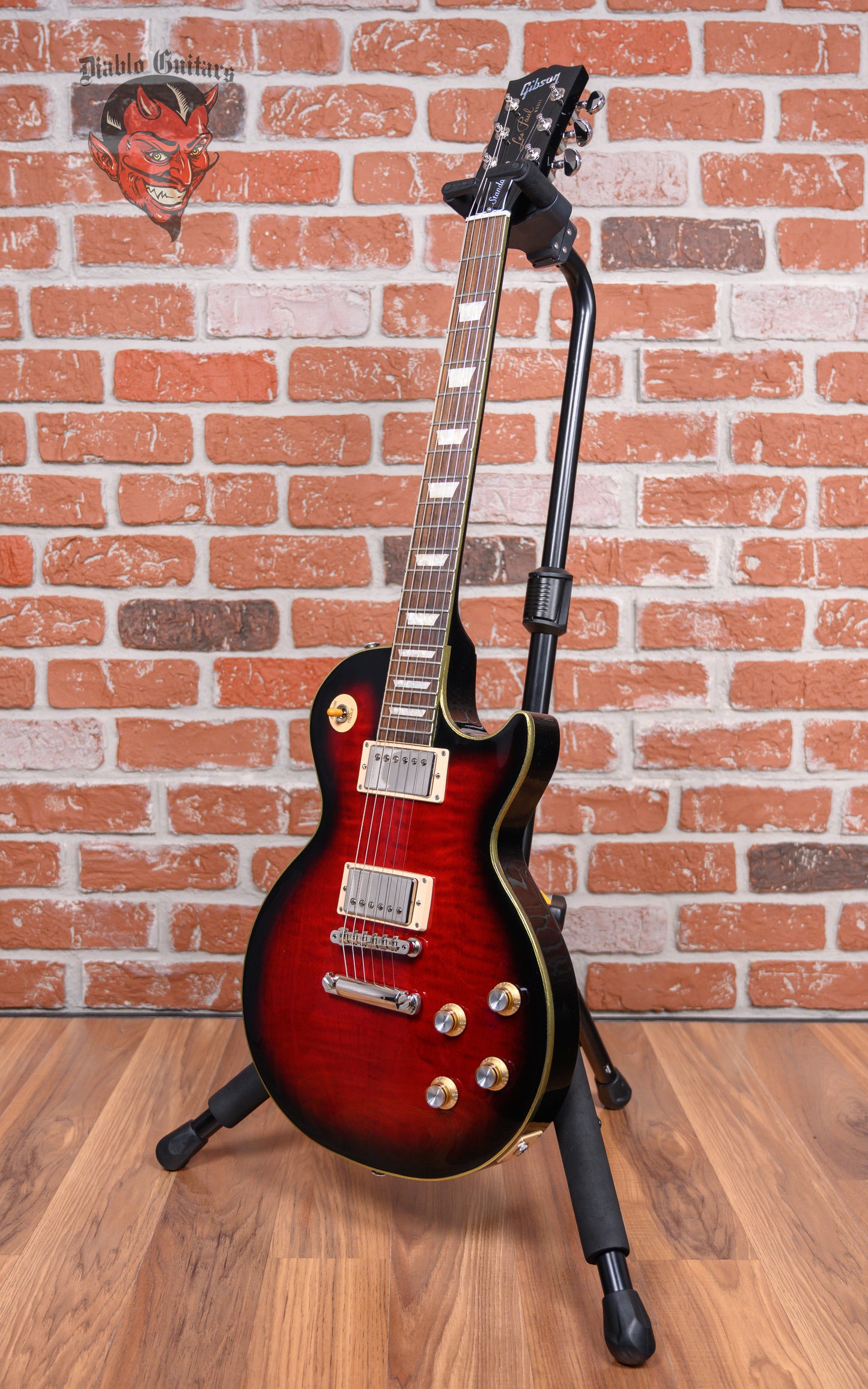 Gibson Mod Collection Les Paul Standard 60s in Dark Ruby finish made in 2024 with Original Hard Shell Case. This guitar features a solid mahogany body with a bound maple top, mahogany neck and bound rosewood fingerboard. Equipped with a Gibson Rhythm 61 in the neck position and a Gibson Lead 61 in the bridge position. Controlled by 2 volume pots, 2 tone pots and a 3-way toggle switch. The 24.75" scale length neck has pearloid trapezoid inlays and black side markers with 22 medium jumbo frets on a 12" radius with a slim taper profile. The hardware is comprised of chrome Grover Rotomatic tuning machines with kidney heads, a bone nut, a Gibson ABR-1 Tune-O-Matic bridge and gold top hat knobs.