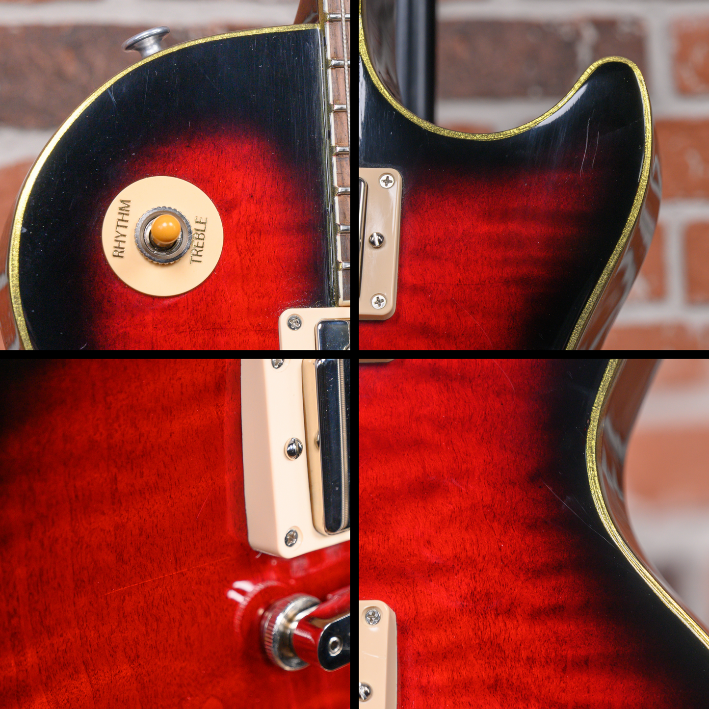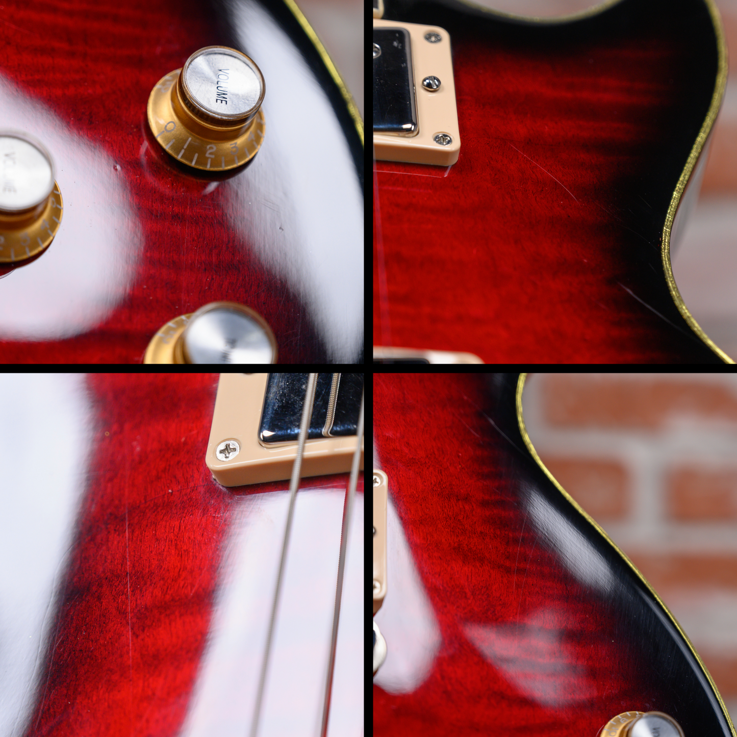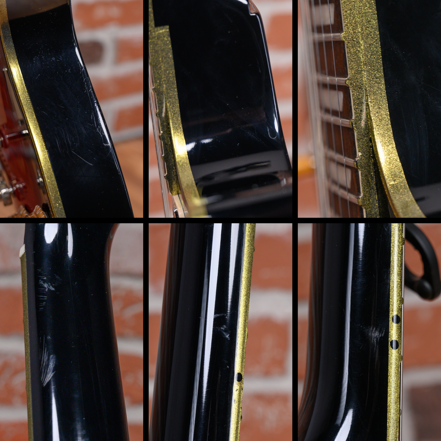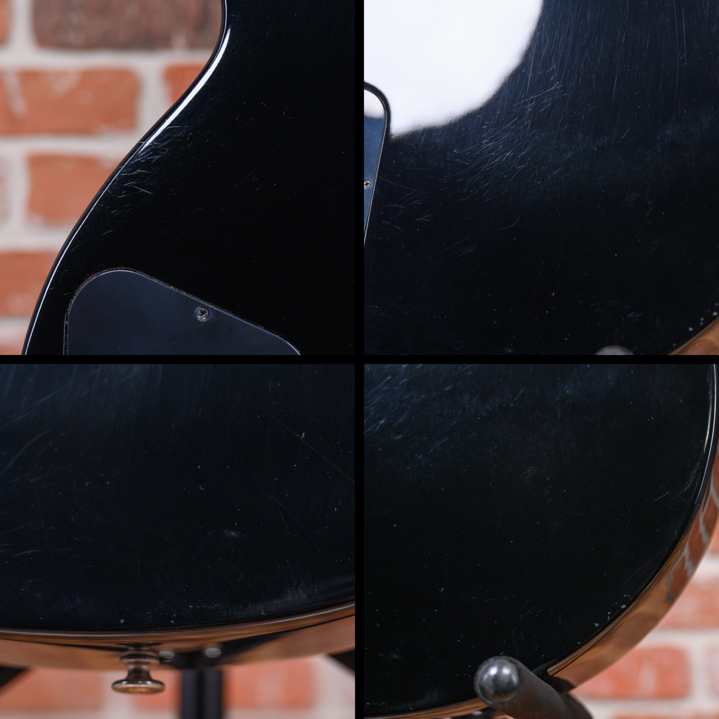 This guitar is in overall very good condition. The headstock has some light surface marks and some indentations from a clip-on tuner. Some of the tuning machines have plating wear. There are some light scuffs on the back of the neck. The body has light surface marks, some belt rash, and a few finish splits under hardware screws. (See Pics)