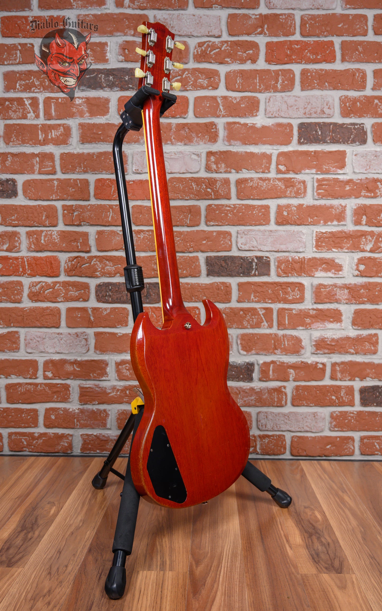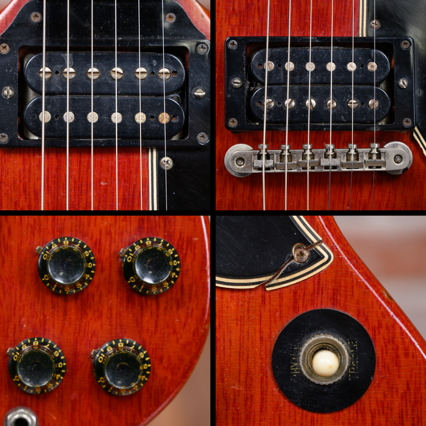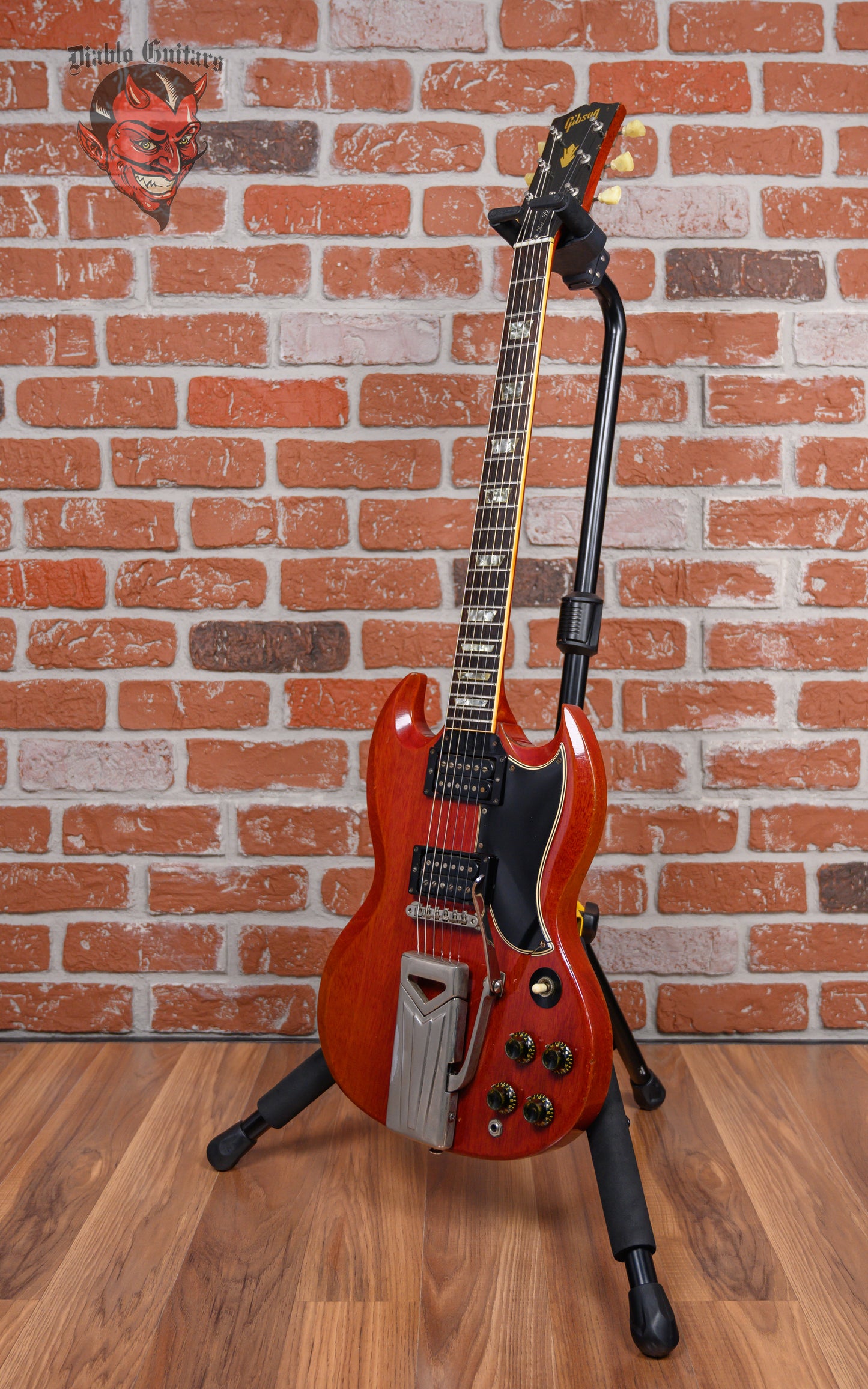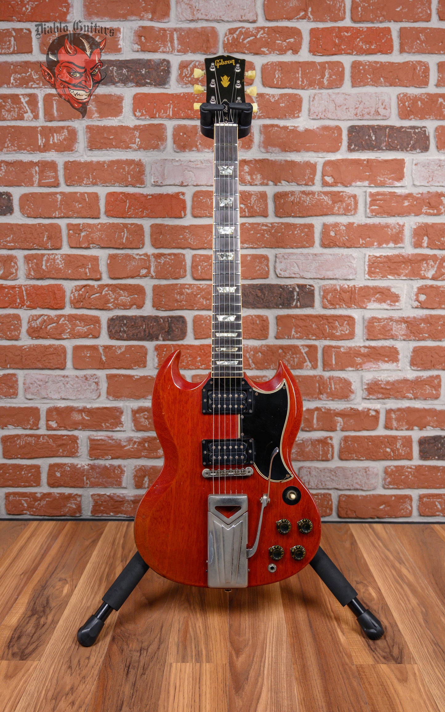 Vintage Gibson SG Les Paul Standard in Cherry finish made in 1961 with Original Hard Shell Case. This guitar features a solid mahogany body, mahogany neck and bound Brazilian rosewood fingerboard. Equipped with its original set of Gibson PAFs in the neck and bridge positions. Controlled by 2 volume pots, 2 tone pots and a 3-way toggle switch comprised of its original Centralab pots dating to the 3rd week of 1961. The 24.75" scale length neck has pearloid trapezoid inlays and black side markers with 22 vintage frets on a 12" radius with a slim taper profile. The hardware is comprised of nickel Kluson Single Ring Single Line tuning machines with keystone heads, a bone nut, a Gibson ABR-1 Tune-O-Matic bridge w/ Sideways Vibrola and black top hat knobs with a 5-ply black on white pickguard.