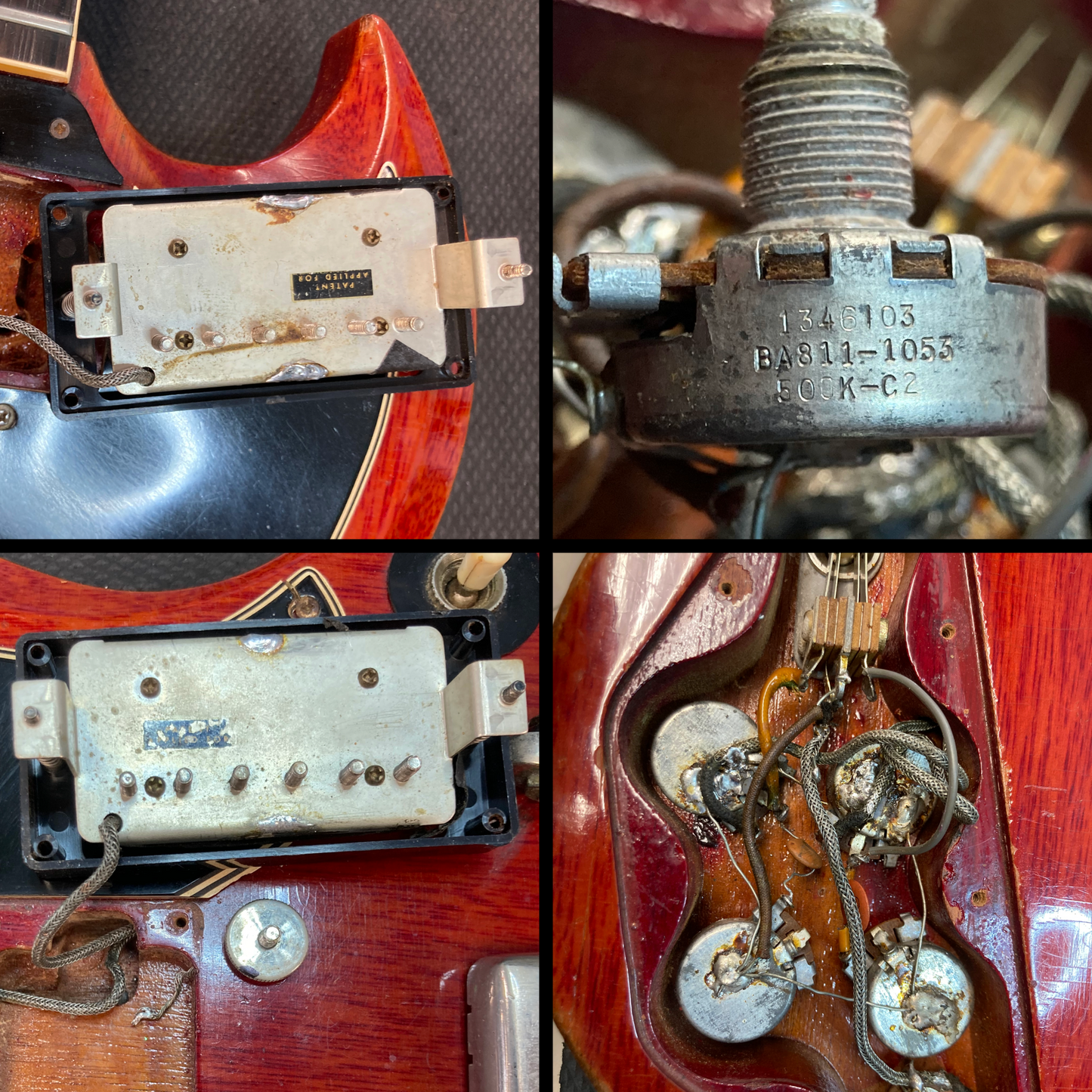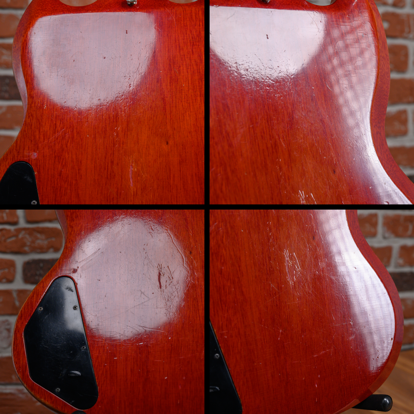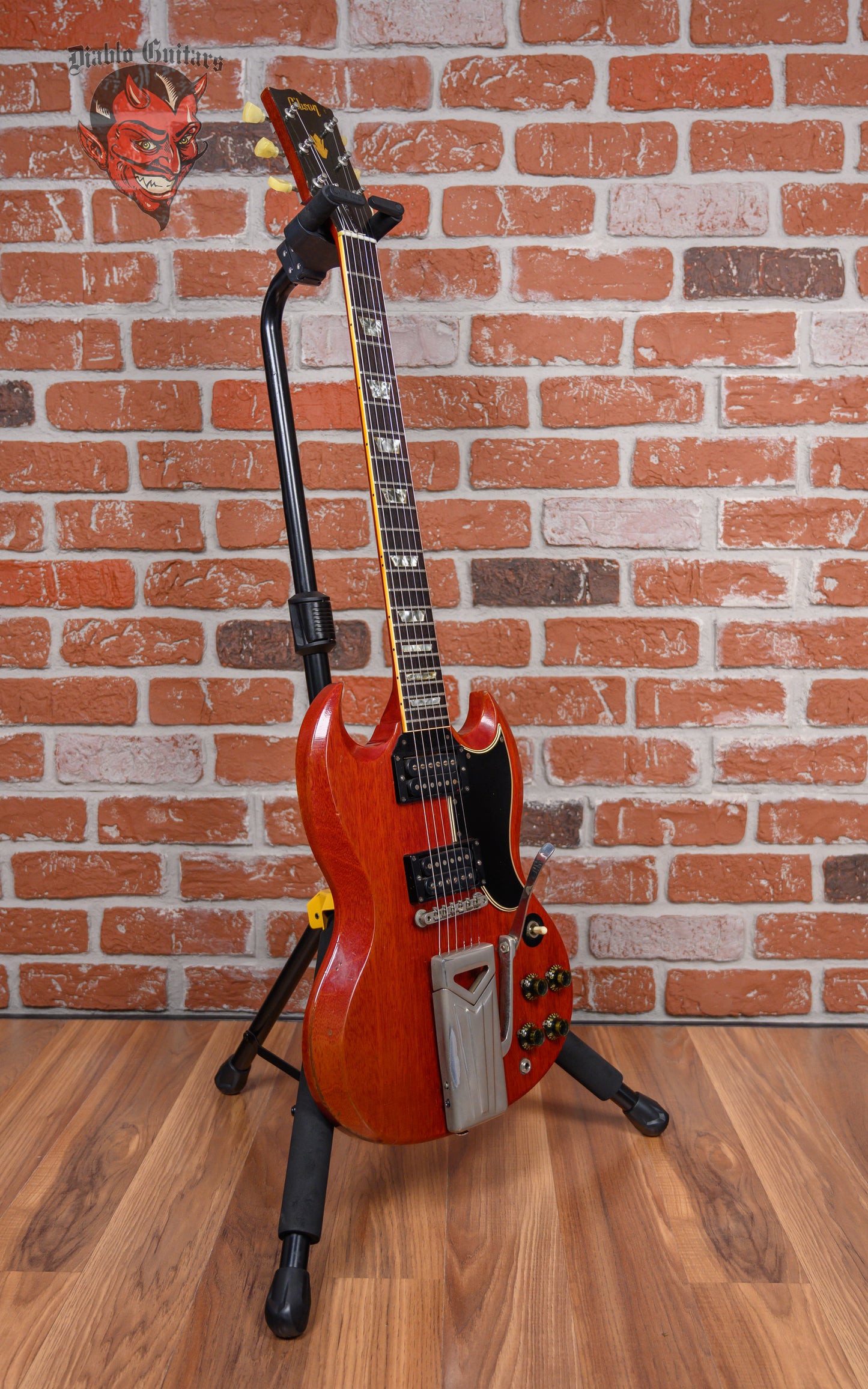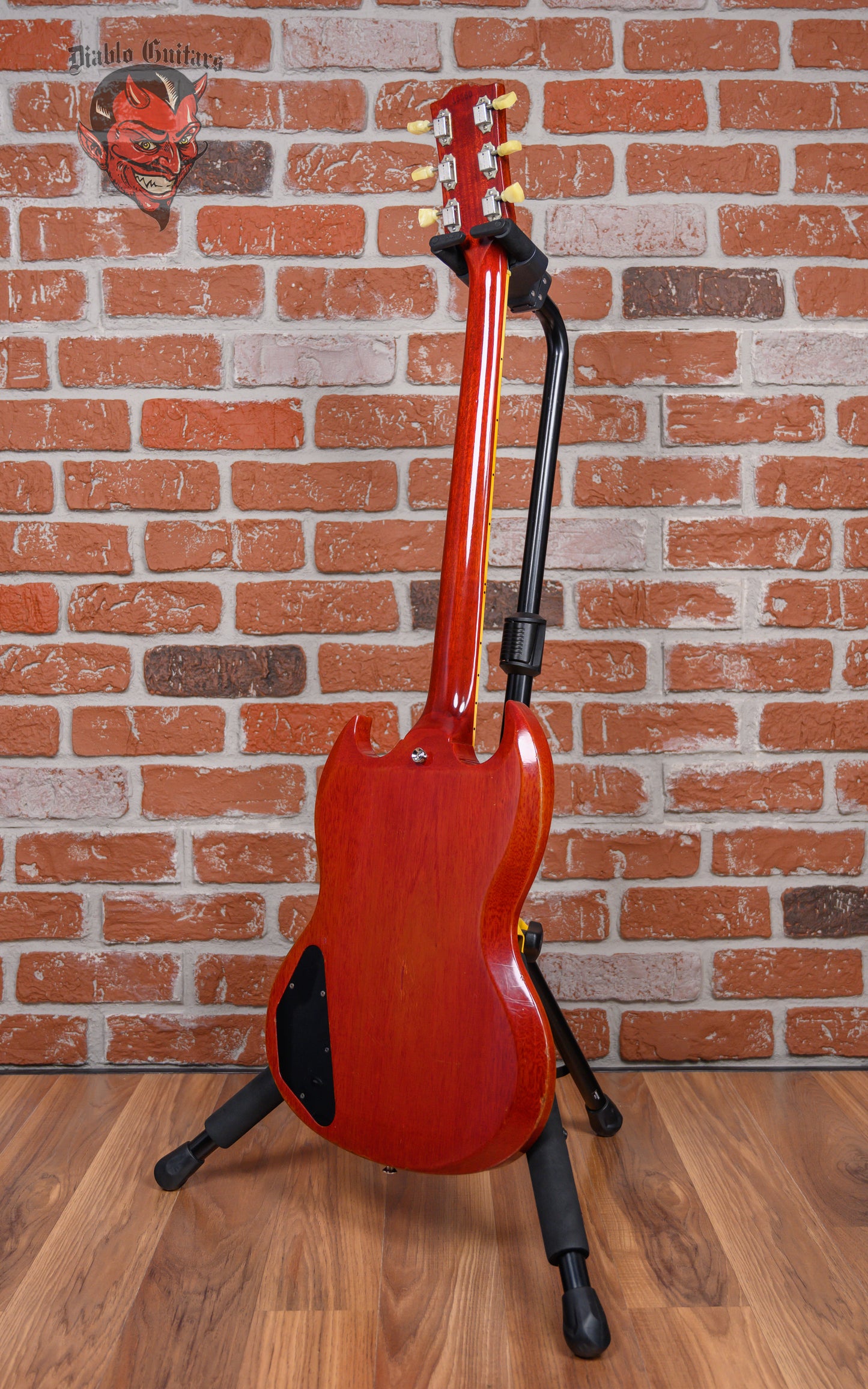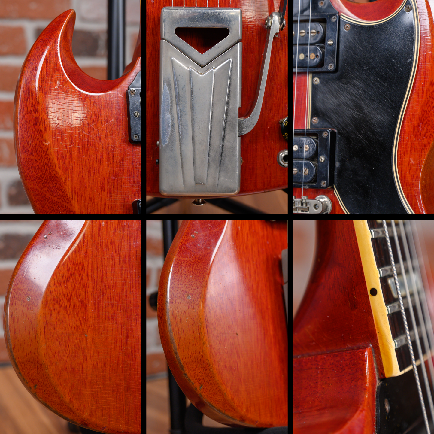 Vintage Gibson SG Les Paul Standard in Cherry finish made in 1961 with Original Hard Shell Case. This guitar features a solid mahogany body, mahogany neck and bound Brazilian rosewood fingerboard. Equipped with its original set of Gibson PAFs in the neck and bridge positions. Controlled by 2 volume pots, 2 tone pots and a 3-way toggle switch comprised of its original Centralab pots dating to the 3rd week of 1961. The 24.75" scale length neck has pearloid trapezoid inlays and black side markers with 22 vintage frets on a 12" radius with a slim taper profile. The hardware is comprised of nickel Kluson Single Ring Single Line tuning machines with keystone heads, a bone nut, a Gibson ABR-1 Tune-O-Matic bridge w/ Sideways Vibrola and black top hat knobs with a 5-ply black on white pickguard.