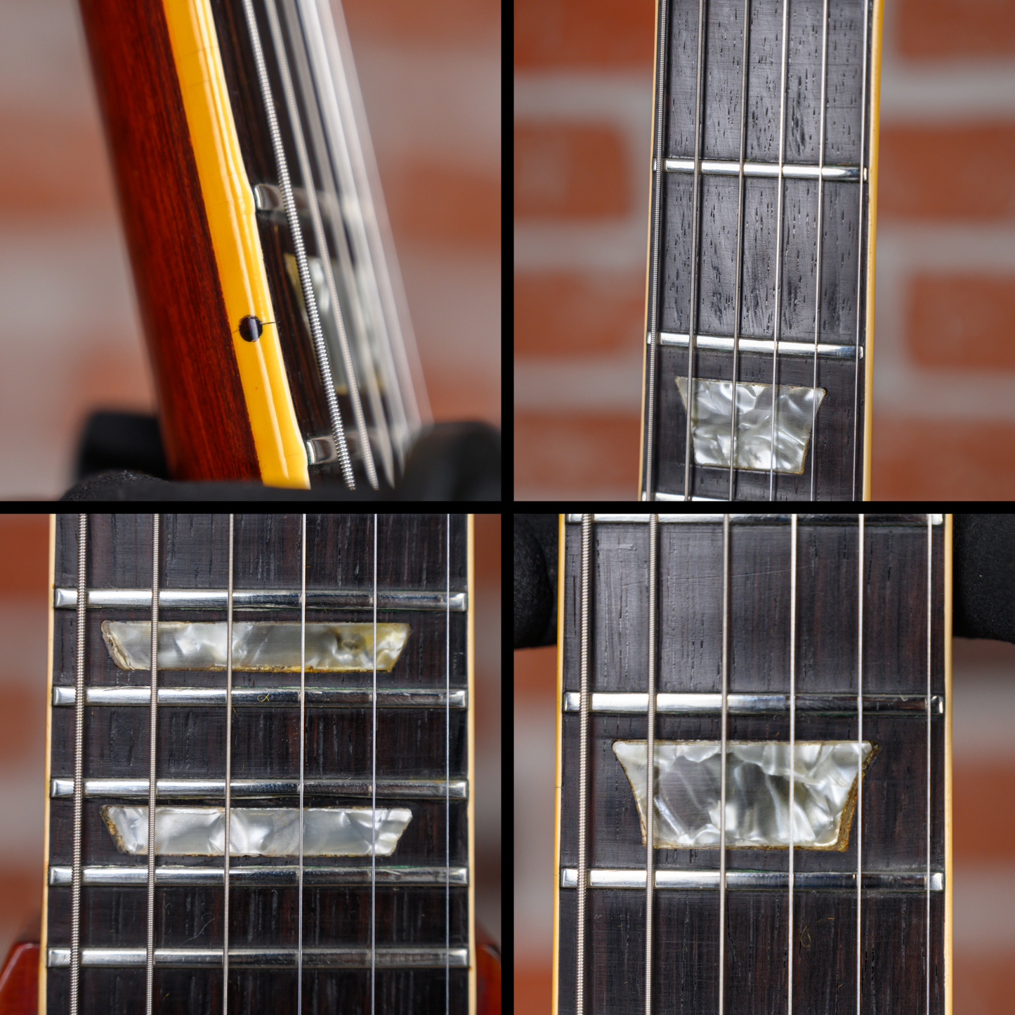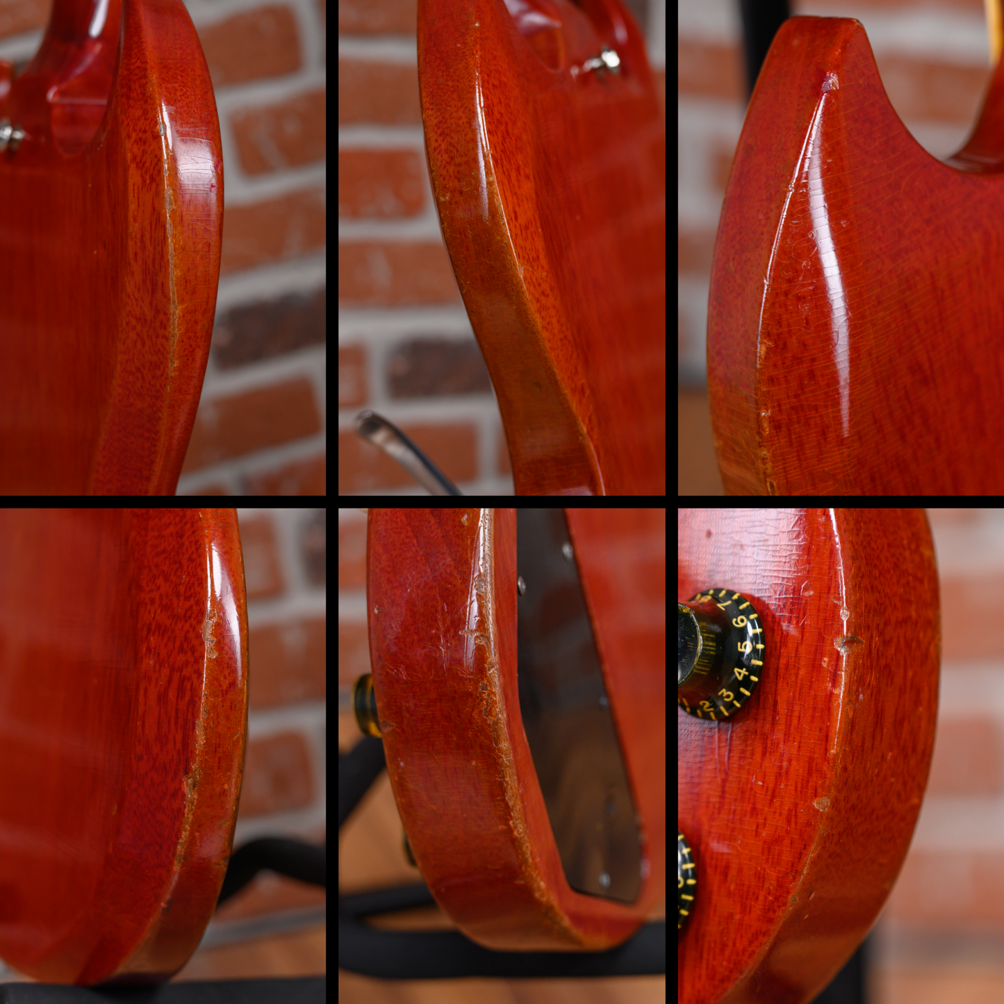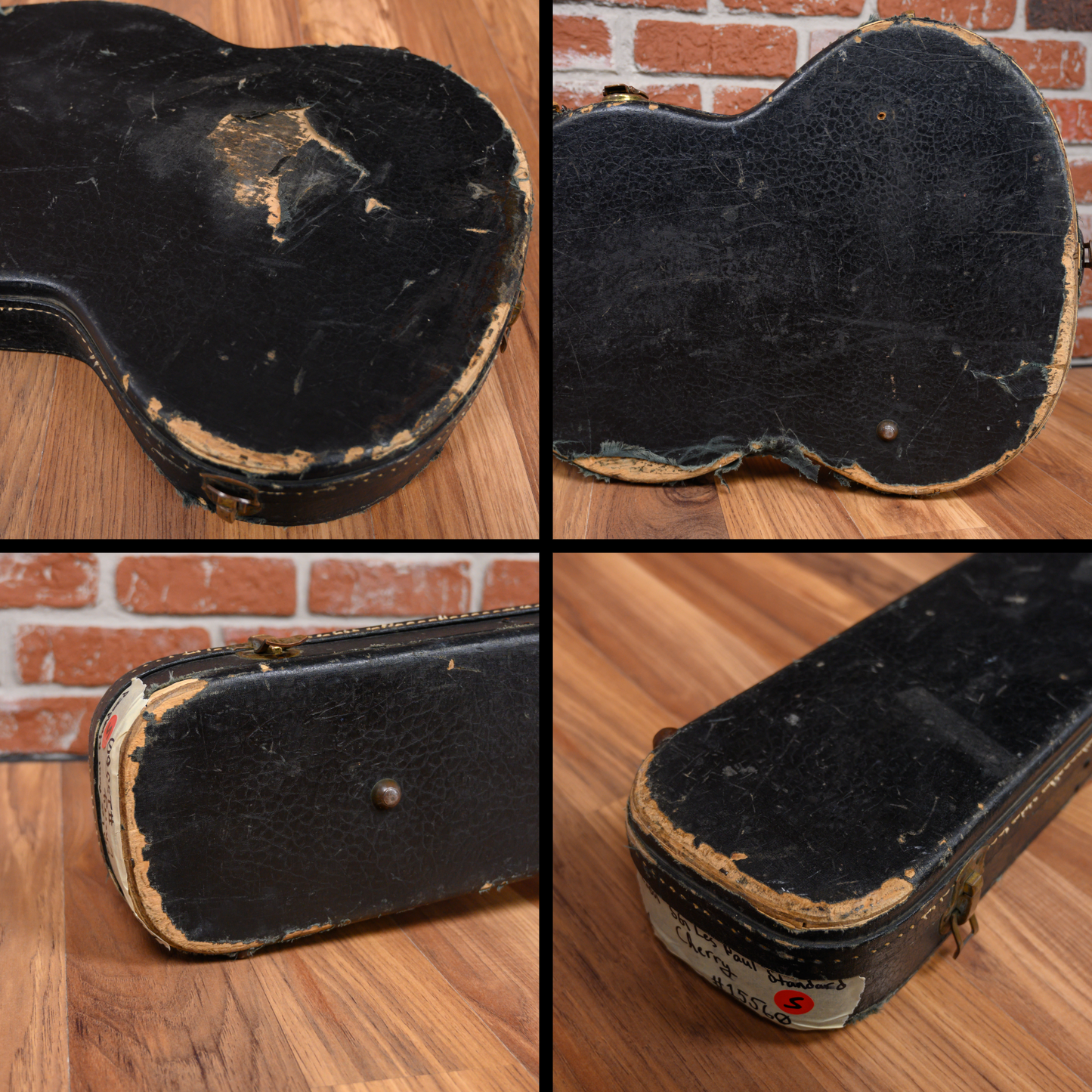 This guitar is in overall good condition for its age. There is finish checking throughout the guitar along with dings, dents and surface marks. There are some divots and flat spots in on some of the frets. The pickguard is cracked near the pickup selector. There is small patch of finish fill and cosmetic repair on the heel of the neck. We believe the neck was refinished at some point in its life but was not reset. There is a split on the headstock under the high E tuning machine that was repaired at some point. The outside of the case is worn and down to bare wood in spots but functions as expected. (See Pics)