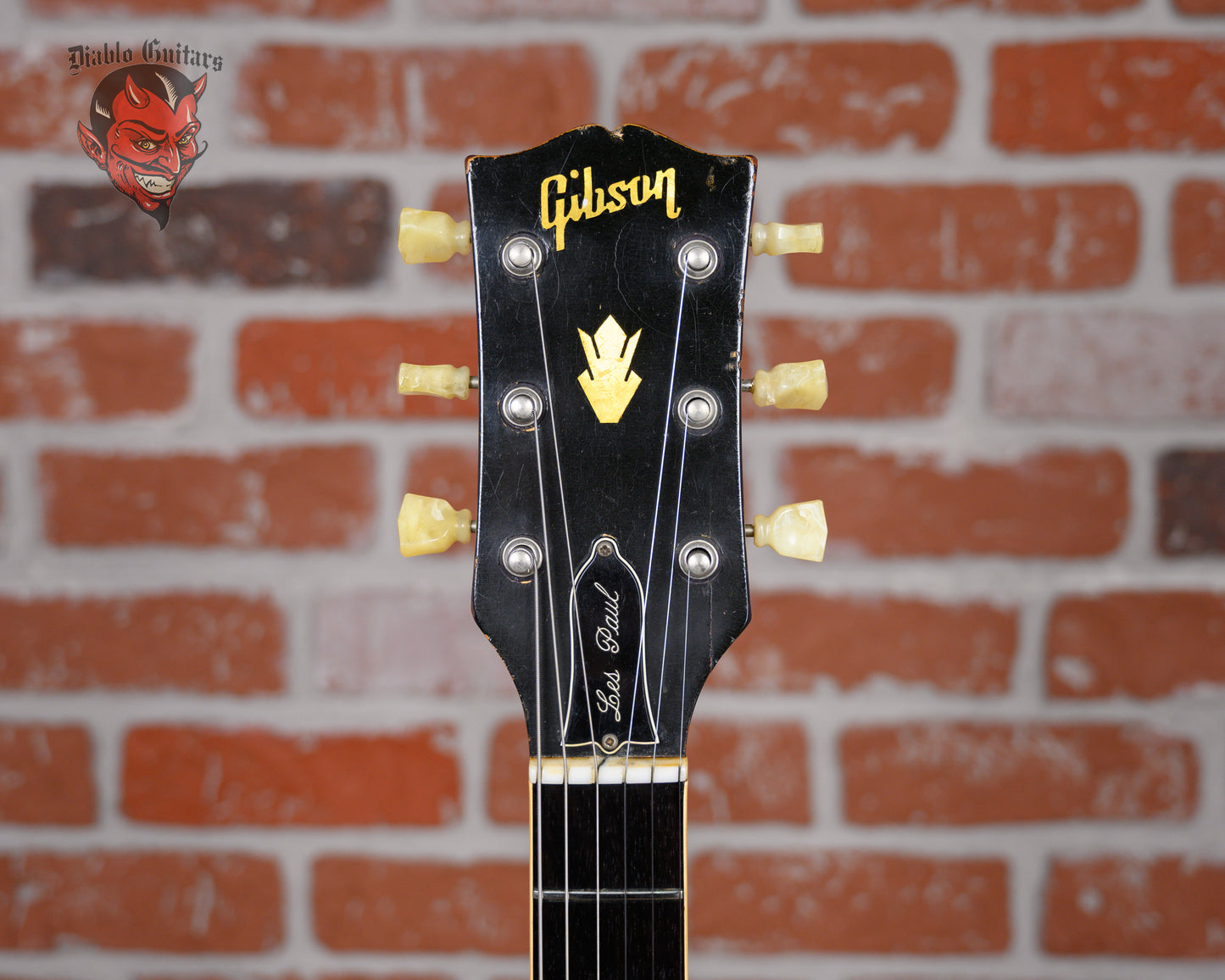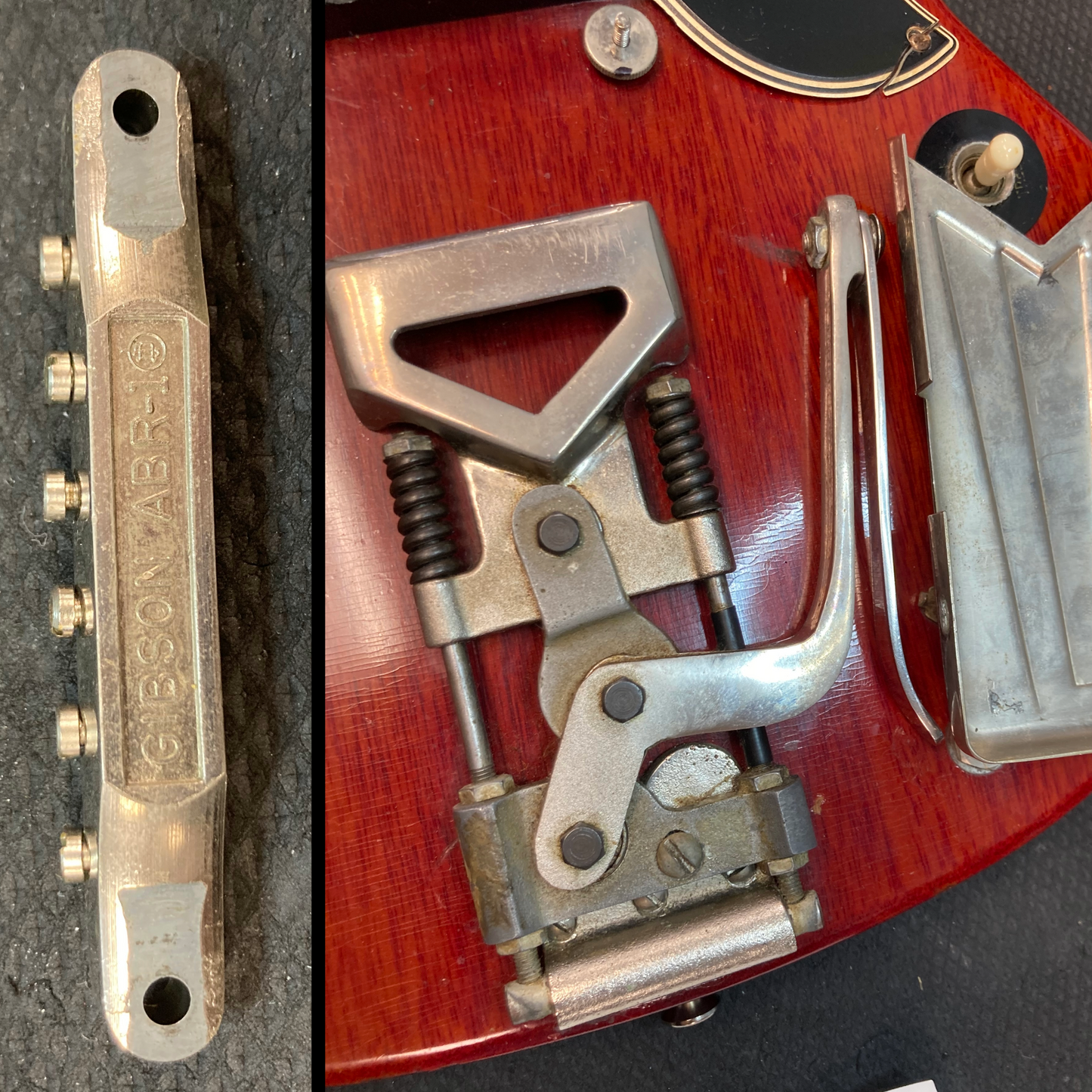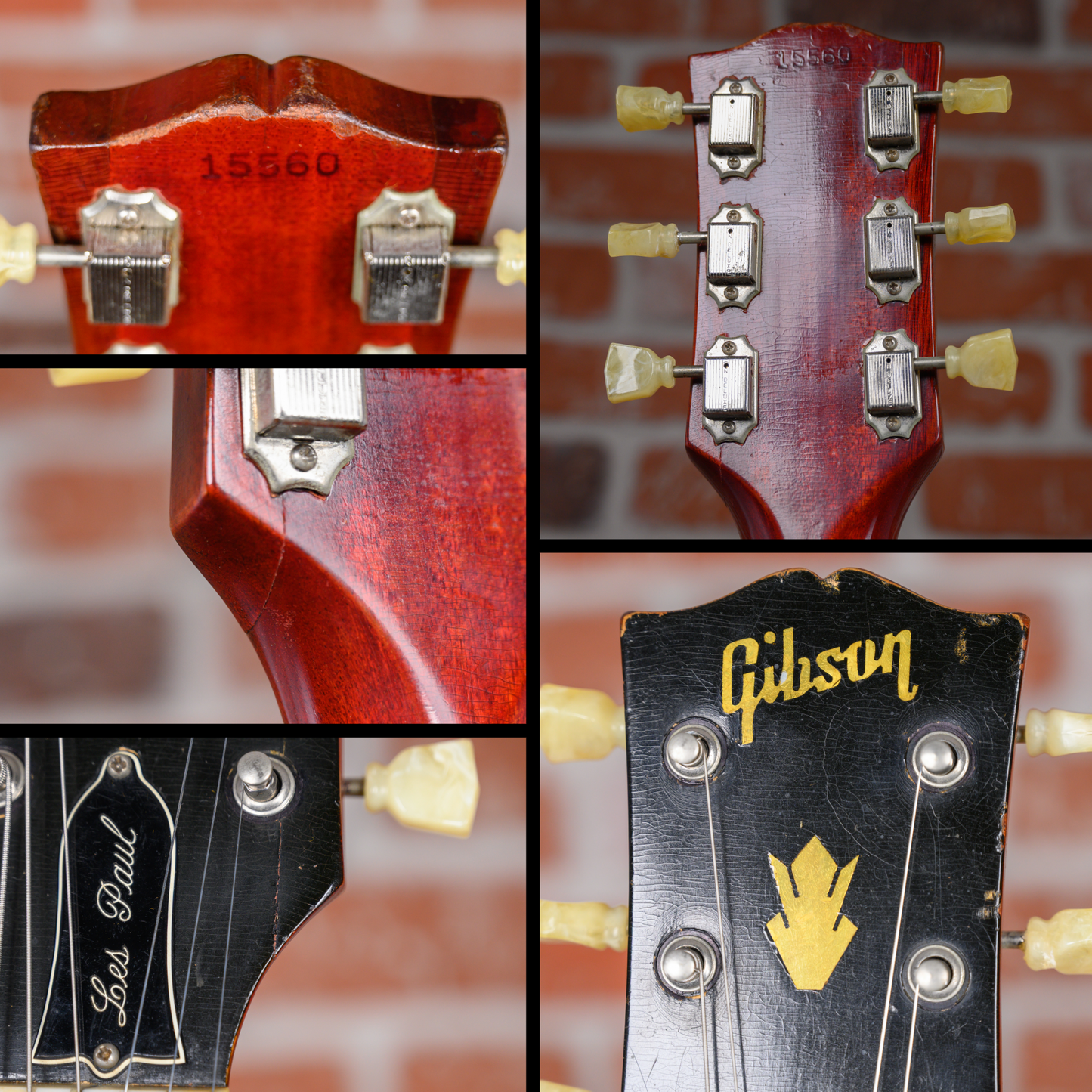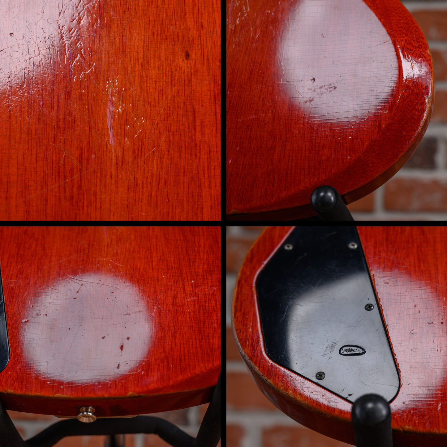 This guitar is in overall good condition for its age. There is finish checking throughout the guitar along with dings, dents and surface marks. There are some divots and flat spots in on some of the frets. The pickguard is cracked near the pickup selector. There is small patch of finish fill and cosmetic repair on the heel of the neck. We believe the neck was refinished at some point in its life but was not reset. There is a split on the headstock under the high E tuning machine that was repaired at some point. The outside of the case is worn and down to bare wood in spots but functions as expected. (See Pics)