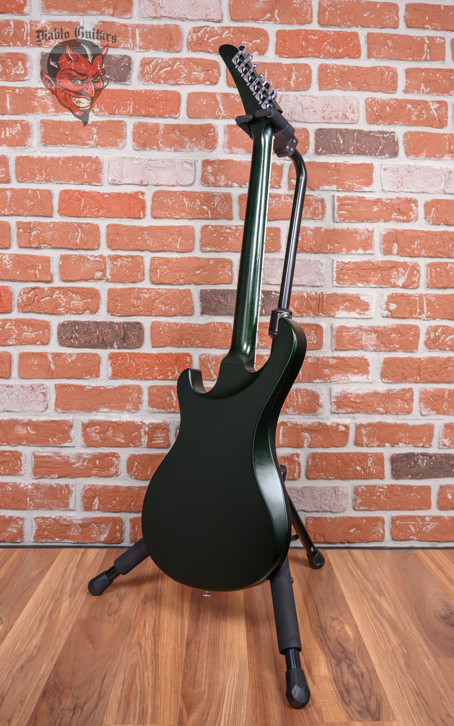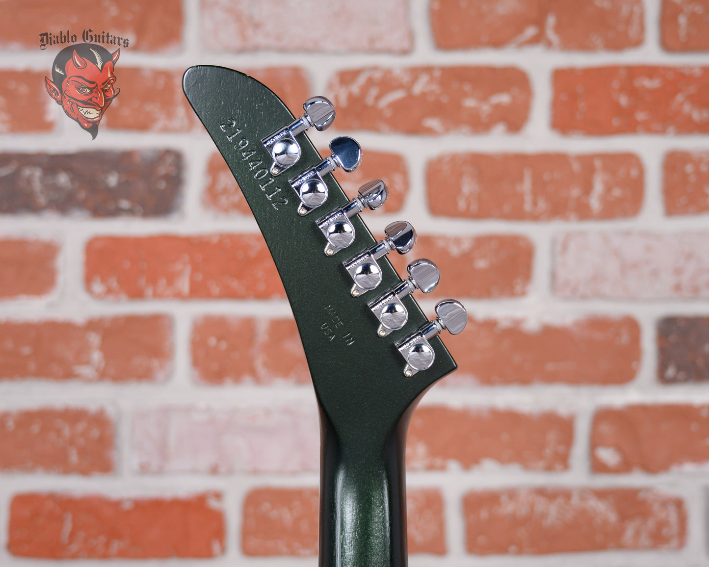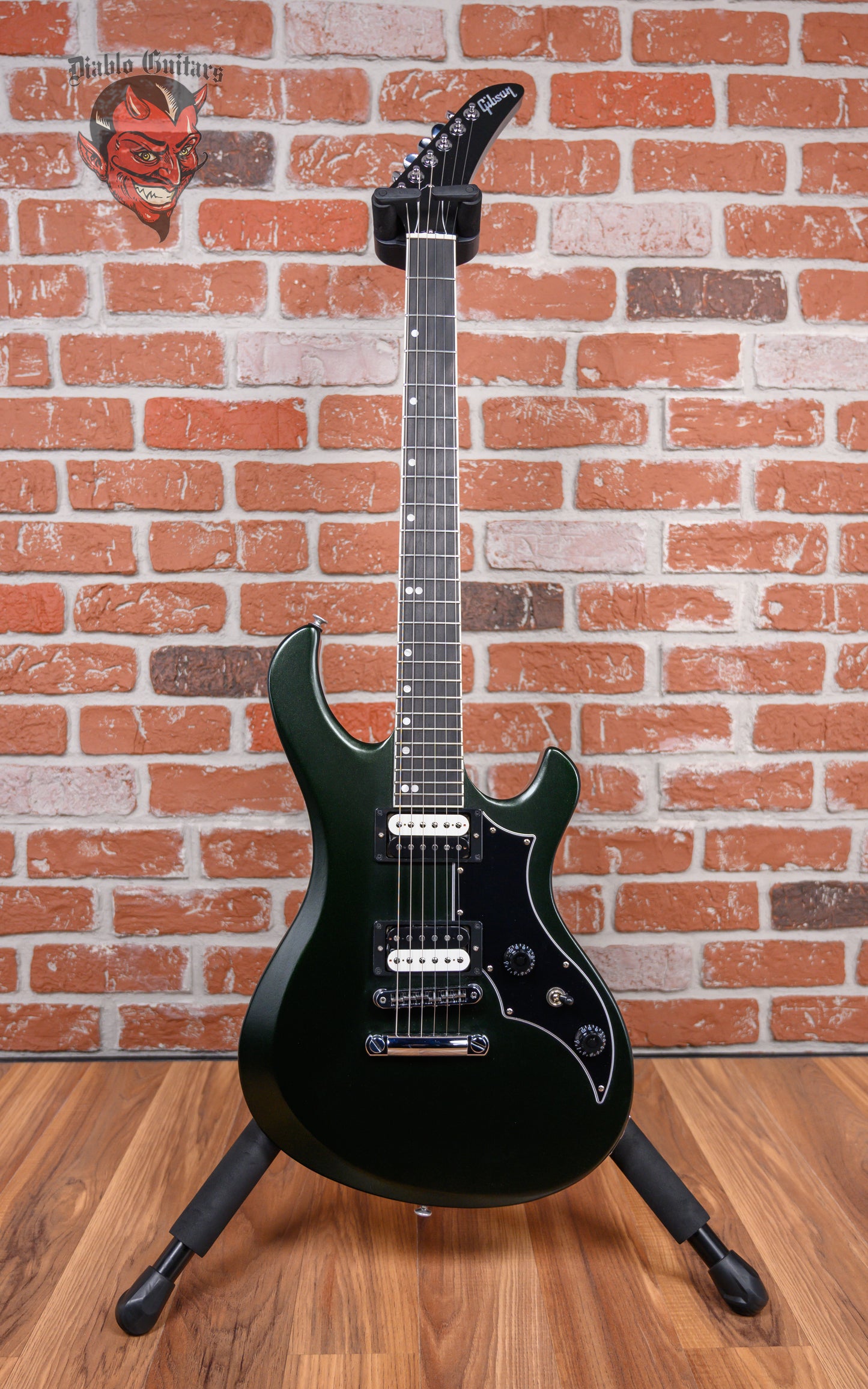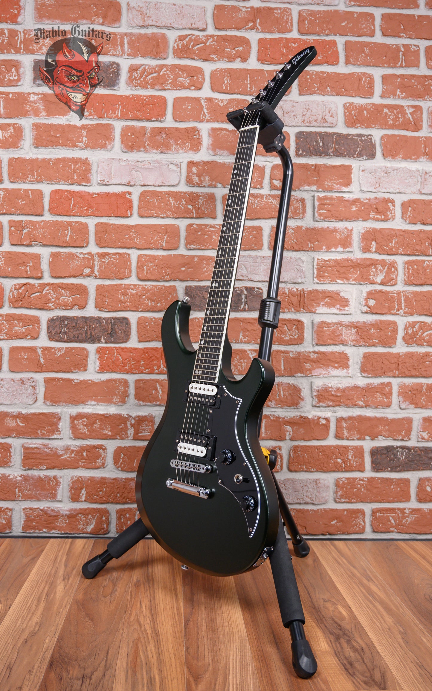 Gibson Victory in Dark Green Satin finish made in 2024 with Original Hard Shell Case. This guitar features a solid mahogany body, mahogany neck and bound ebony fingerboard with an Explorer-style Scimitar headstock. Equipped with a set of Gibson 80's Tribute humbuckers in the neck and bridge positions. Controlled by 1 push/pull volume pot with coil split, 1 push/pull tone pot with inner/outer coil select and a 3-way toggle switch. The 25.5" scale length neck has acrylic dot inlays and black side markers with 24 medium jumbo frets on a compound 10"-16" radius with a slim taper profile. The hardware is comprised of chrome Grover Mini-Rotomatic tuning machines with mini kidney bean heads, a Graph Tech nut, a Gibson Nashville Tune-O-Matic bridge and black top hat knobs with a 5-ply black on white pickguard.