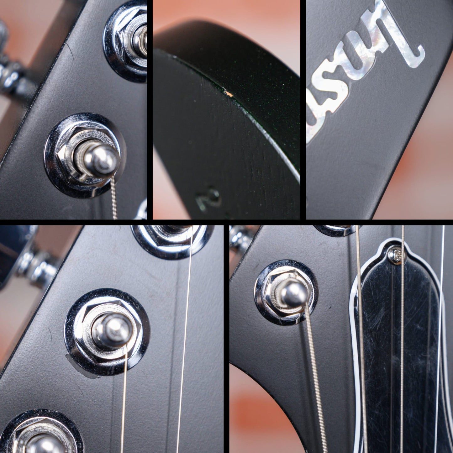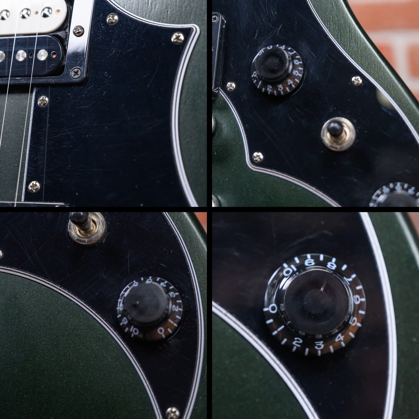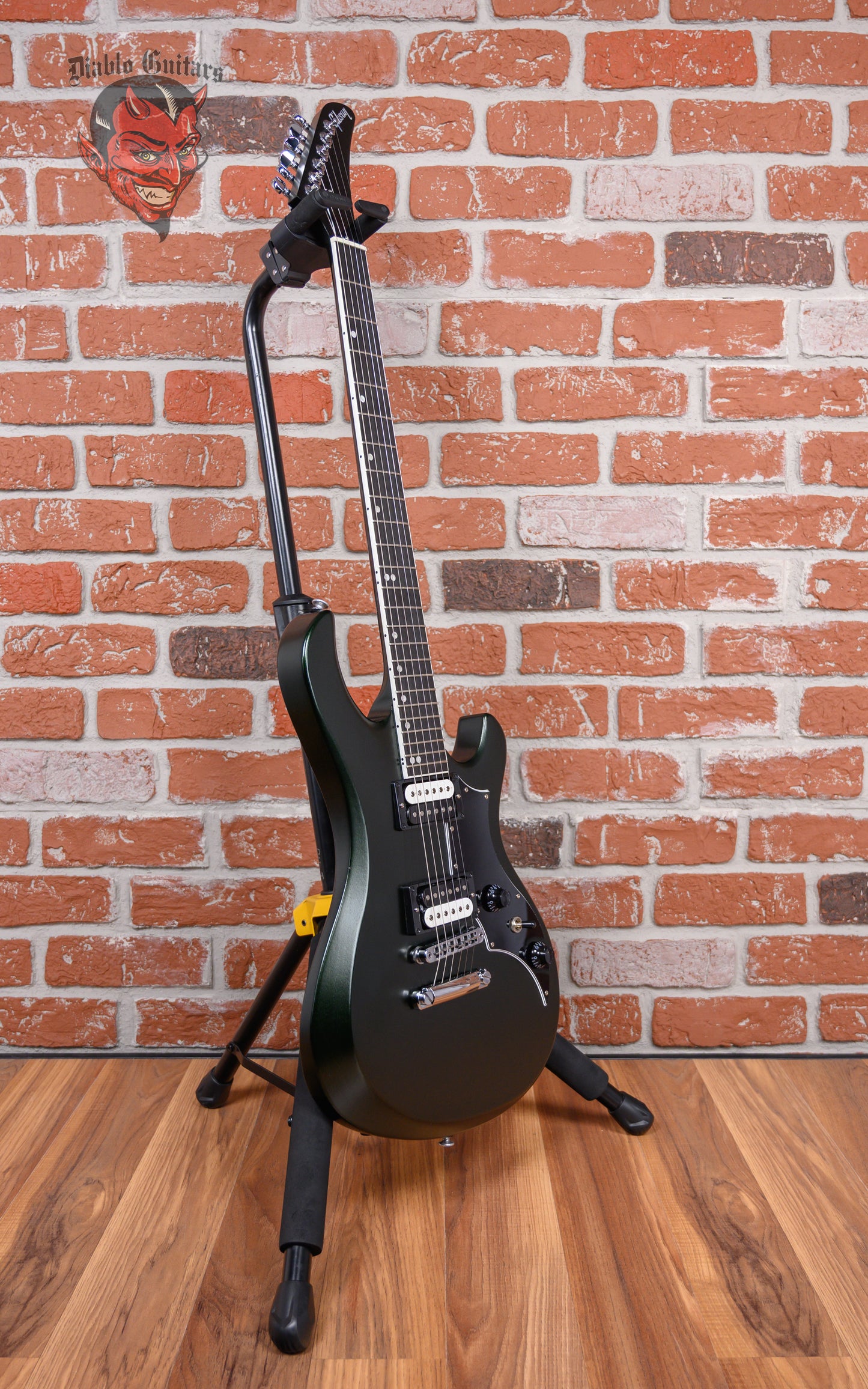 Gibson Victory in Dark Green Satin finish made in 2024 with Original Hard Shell Case. This guitar features a solid mahogany body, mahogany neck and bound ebony fingerboard with an Explorer-style Scimitar headstock. Equipped with a set of Gibson 80's Tribute humbuckers in the neck and bridge positions. Controlled by 1 push/pull volume pot with coil split, 1 push/pull tone pot with inner/outer coil select and a 3-way toggle switch. The 25.5" scale length neck has acrylic dot inlays and black side markers with 24 medium jumbo frets on a compound 10"-16" radius with a slim taper profile. The hardware is comprised of chrome Grover Mini-Rotomatic tuning machines with mini kidney bean heads, a Graph Tech nut, a Gibson Nashville Tune-O-Matic bridge and black top hat knobs with a 5-ply black on white pickguard.
