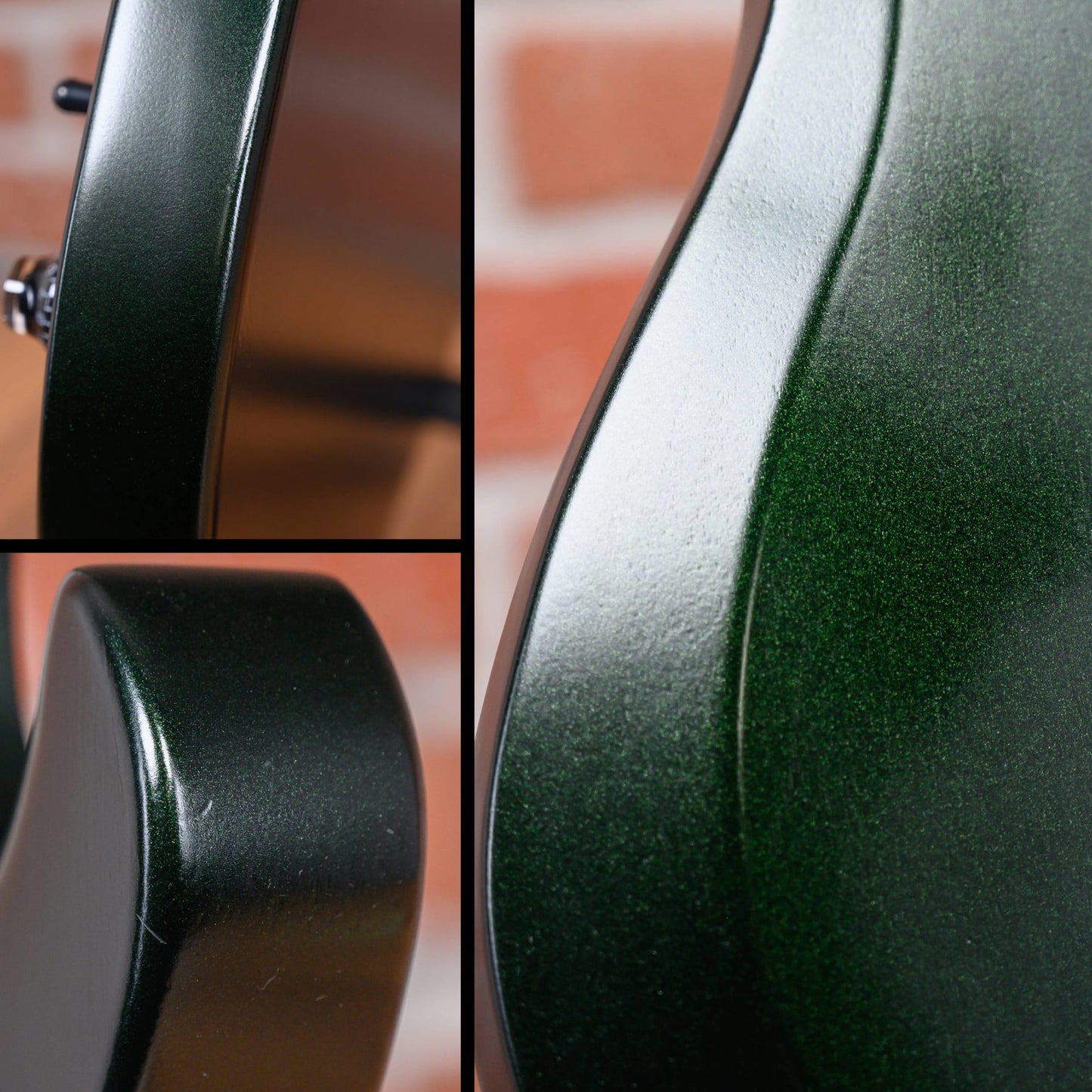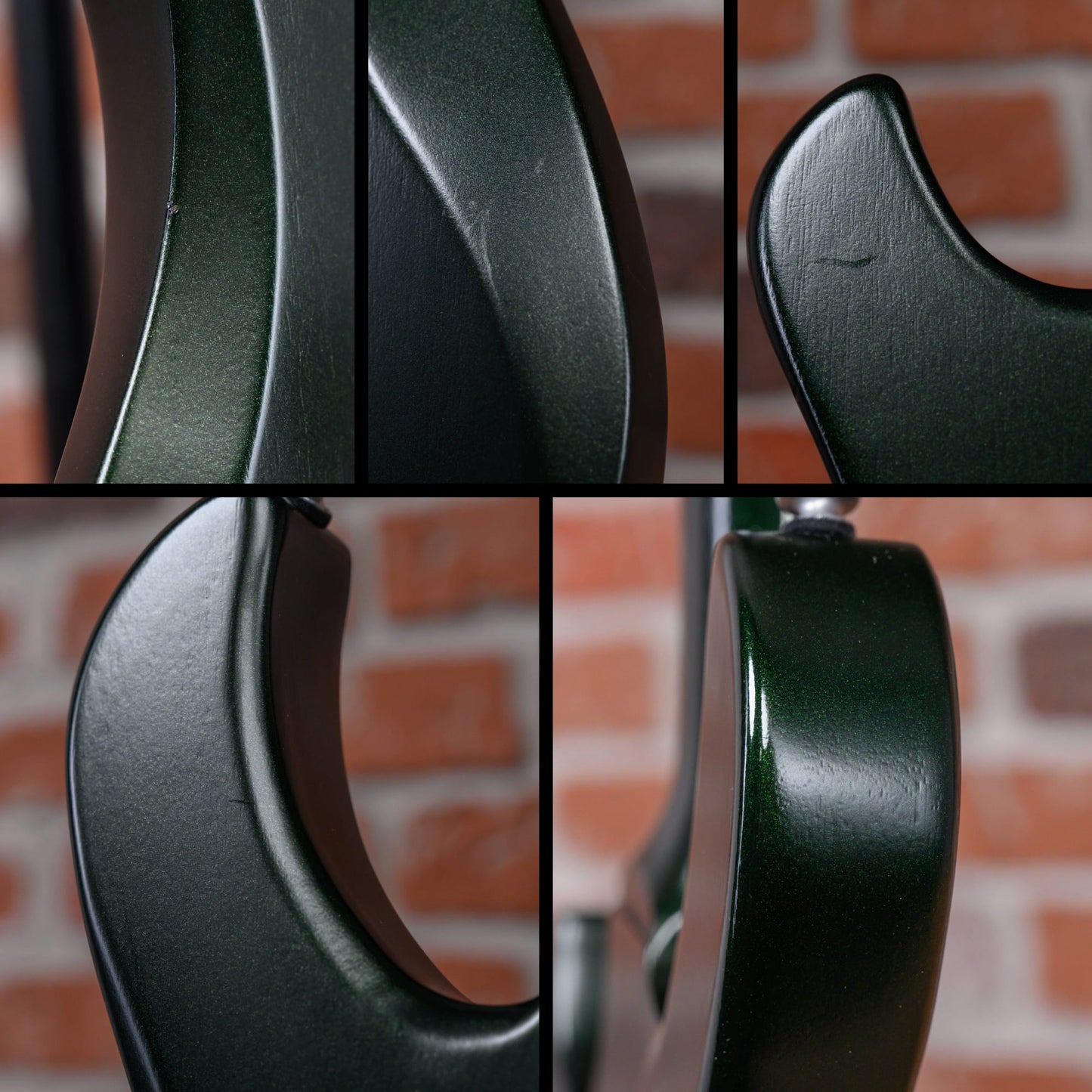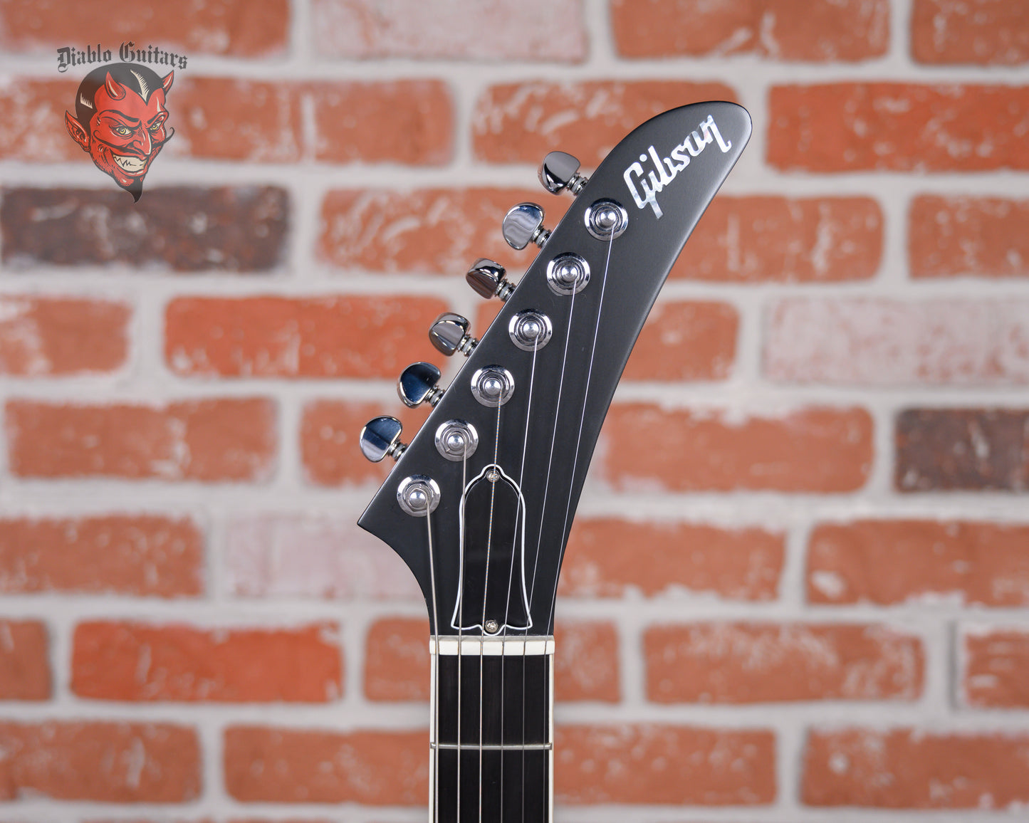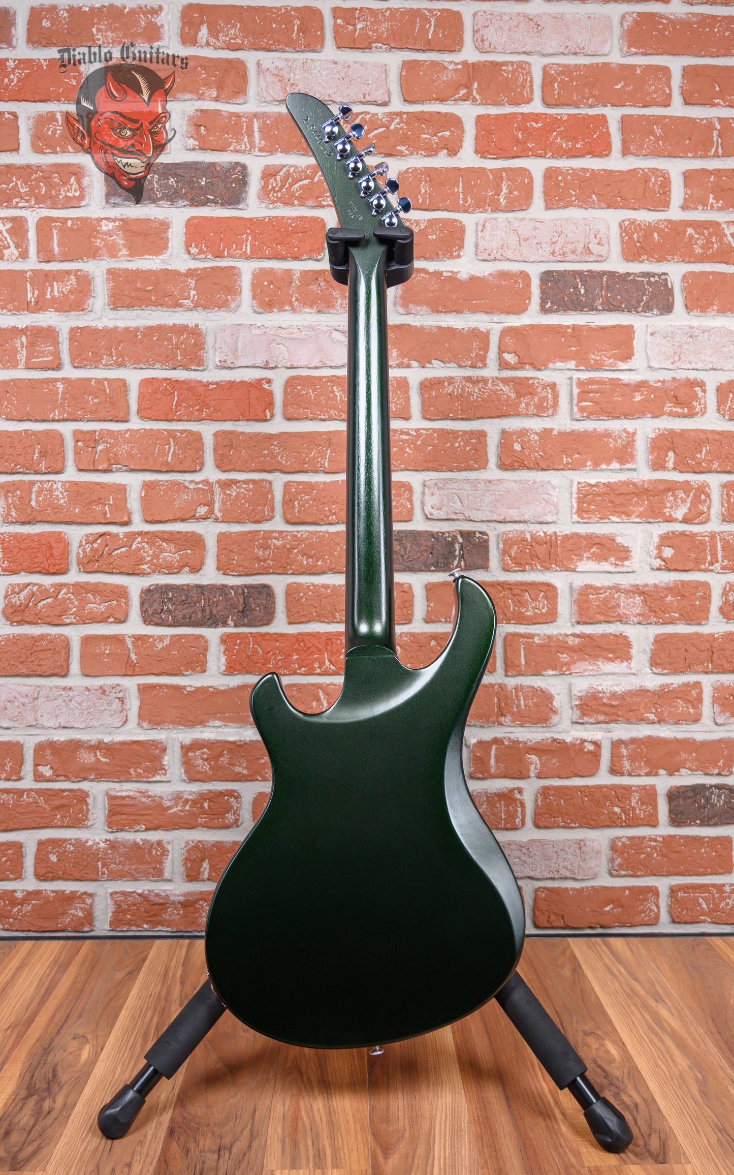 Gibson Victory in Dark Green Satin finish made in 2024 with Original Hard Shell Case. This guitar features a solid mahogany body, mahogany neck and bound ebony fingerboard with an Explorer-style Scimitar headstock. Equipped with a set of Gibson 80's Tribute humbuckers in the neck and bridge positions. Controlled by 1 push/pull volume pot with coil split, 1 push/pull tone pot with inner/outer coil select and a 3-way toggle switch. The 25.5" scale length neck has acrylic dot inlays and black side markers with 24 medium jumbo frets on a compound 10"-16" radius with a slim taper profile. The hardware is comprised of chrome Grover Mini-Rotomatic tuning machines with mini kidney bean heads, a Graph Tech nut, a Gibson Nashville Tune-O-Matic bridge and black top hat knobs with a 5-ply black on white pickguard.