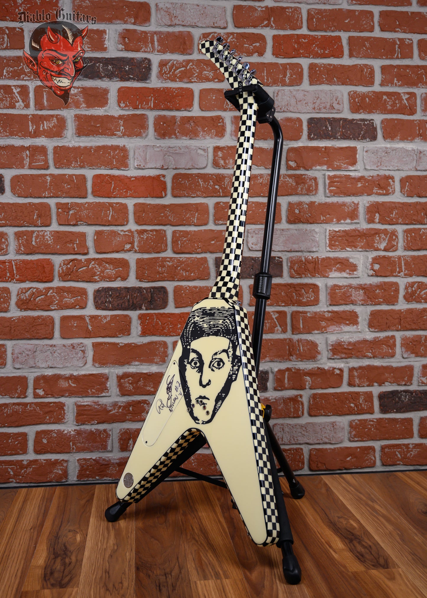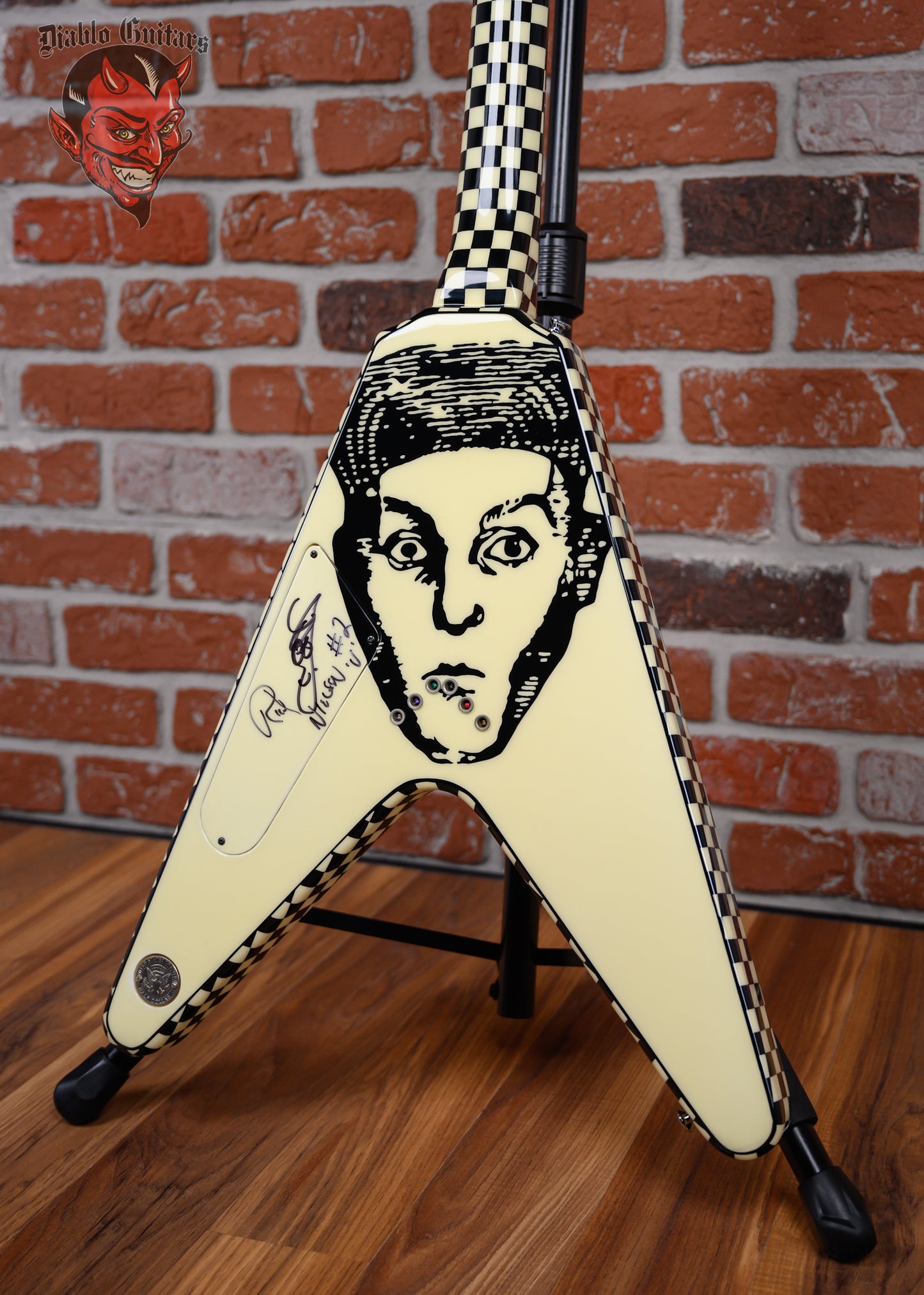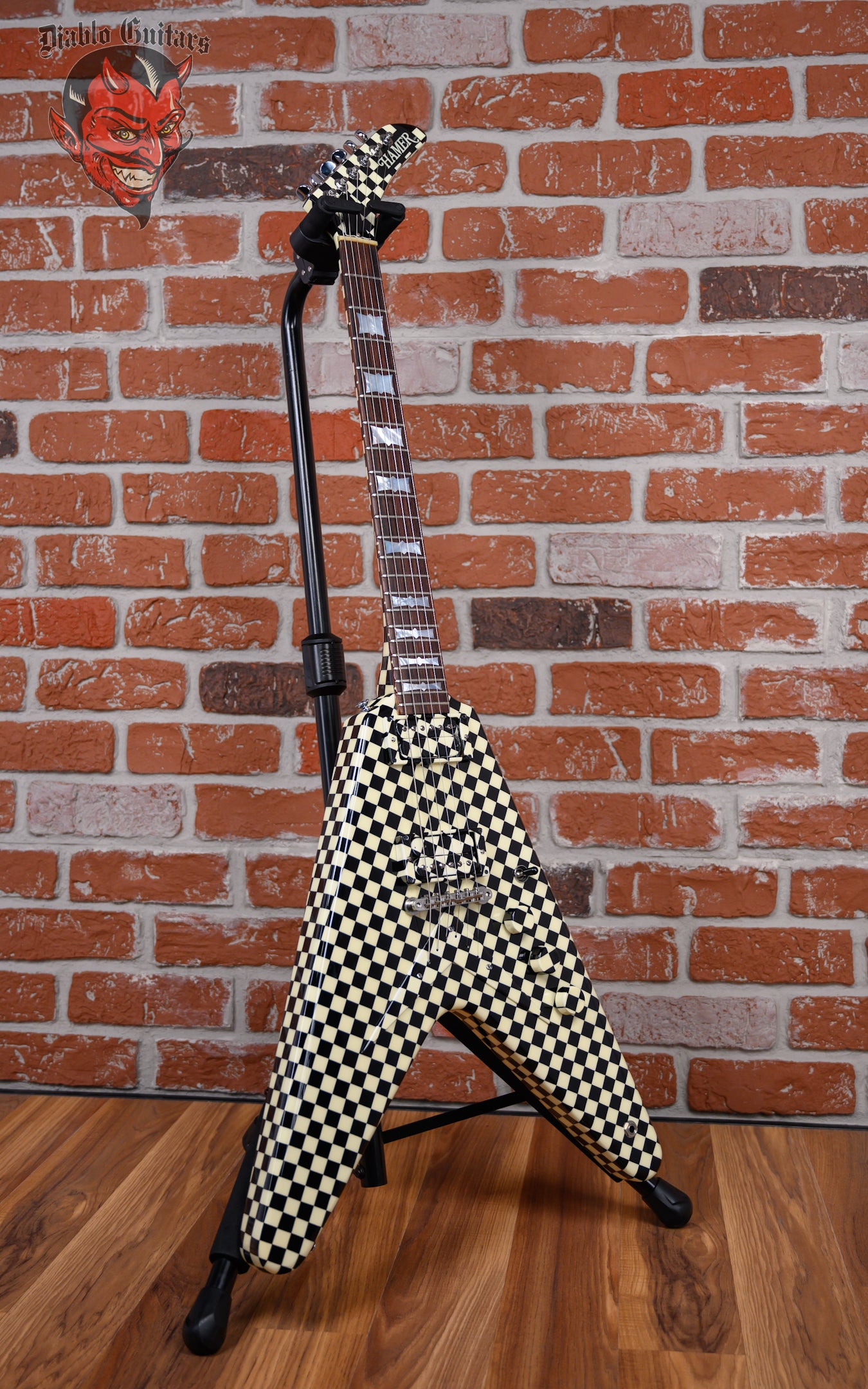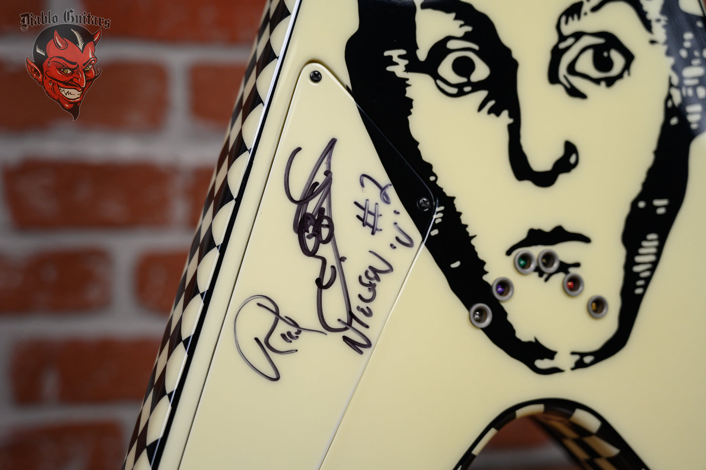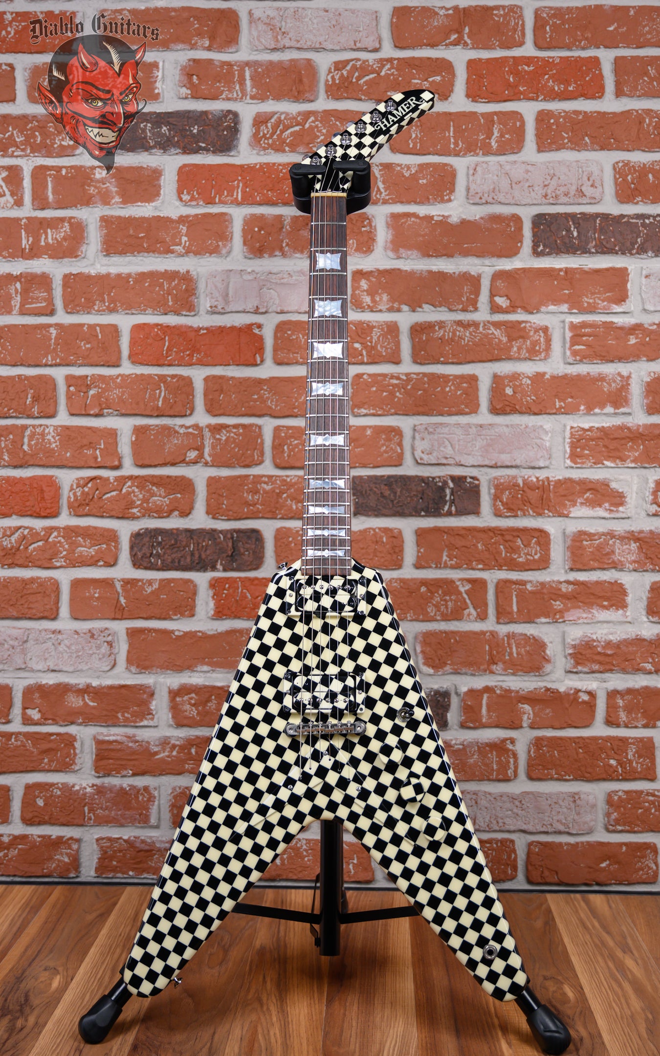 Vintage Hamer Custom Shop Vector V #2 Rick Nick Nielsen Signature Artist Signed in Black & White Checkerboard finish made in 1983 with Original Hard Shell Case. This guitar features a solid mahogany body, mahogany neck and rosewood fingerboard with a color matched headstock. Equipped with its original pair of color matched Hamer Slammer Humbuckers in the neck position and bridge position. Controlled by 2 volume, 1 tone pots and a 3-Way toggle switch comprised of its original CTS pots dating to the 37th week of 1983. The 24.75" scale length neck has mother of pearl bowtie inlays and White side markers with 22 medium jumbo frets on a 12" radius with a medium "C" profile. The hardware is comprised of nickel Grover Mini-Rotomatic tuning machines with mini kidney bean heads, a bone nut, a Hamer ABR-1 Tune-o-matic bridge and color matched speed knobs.