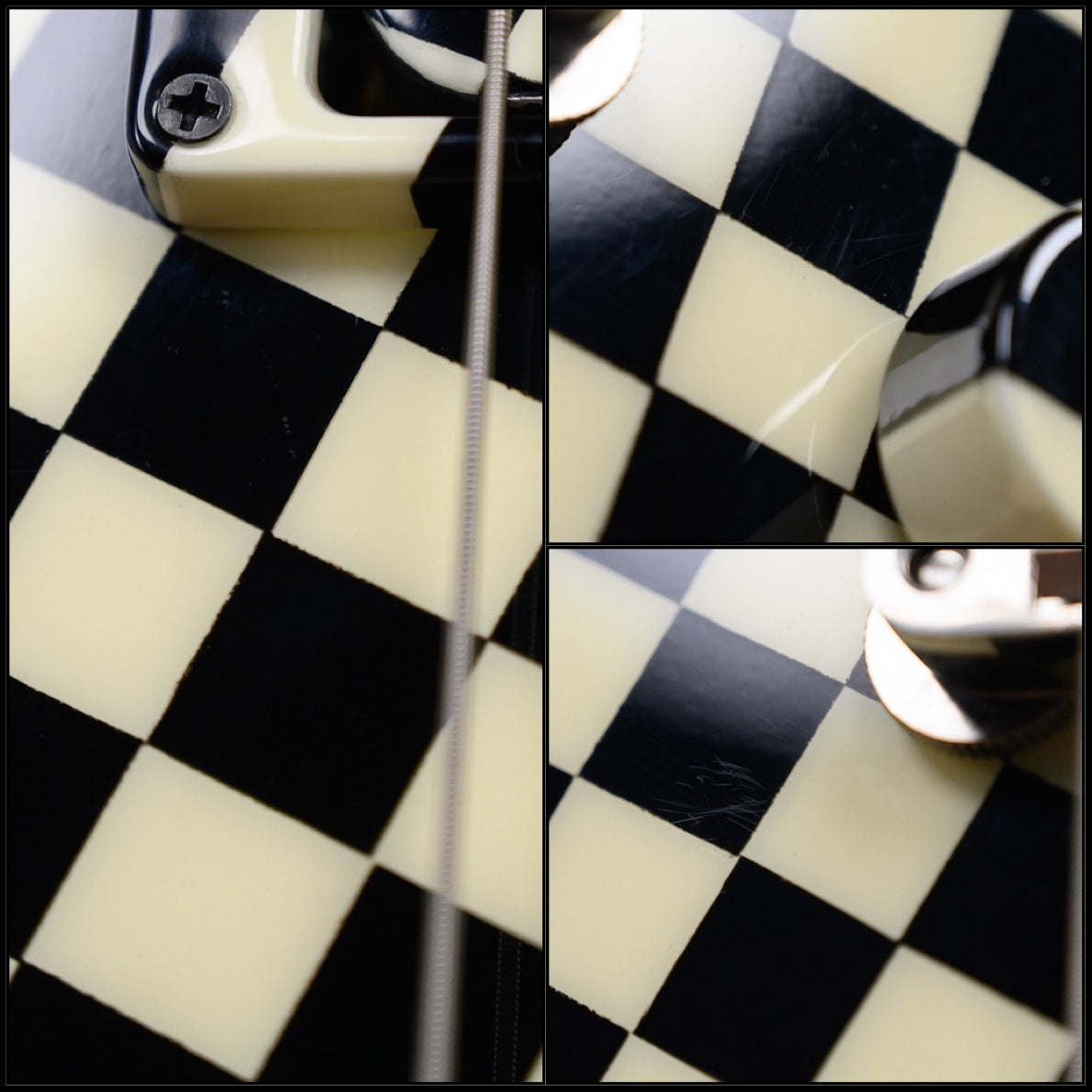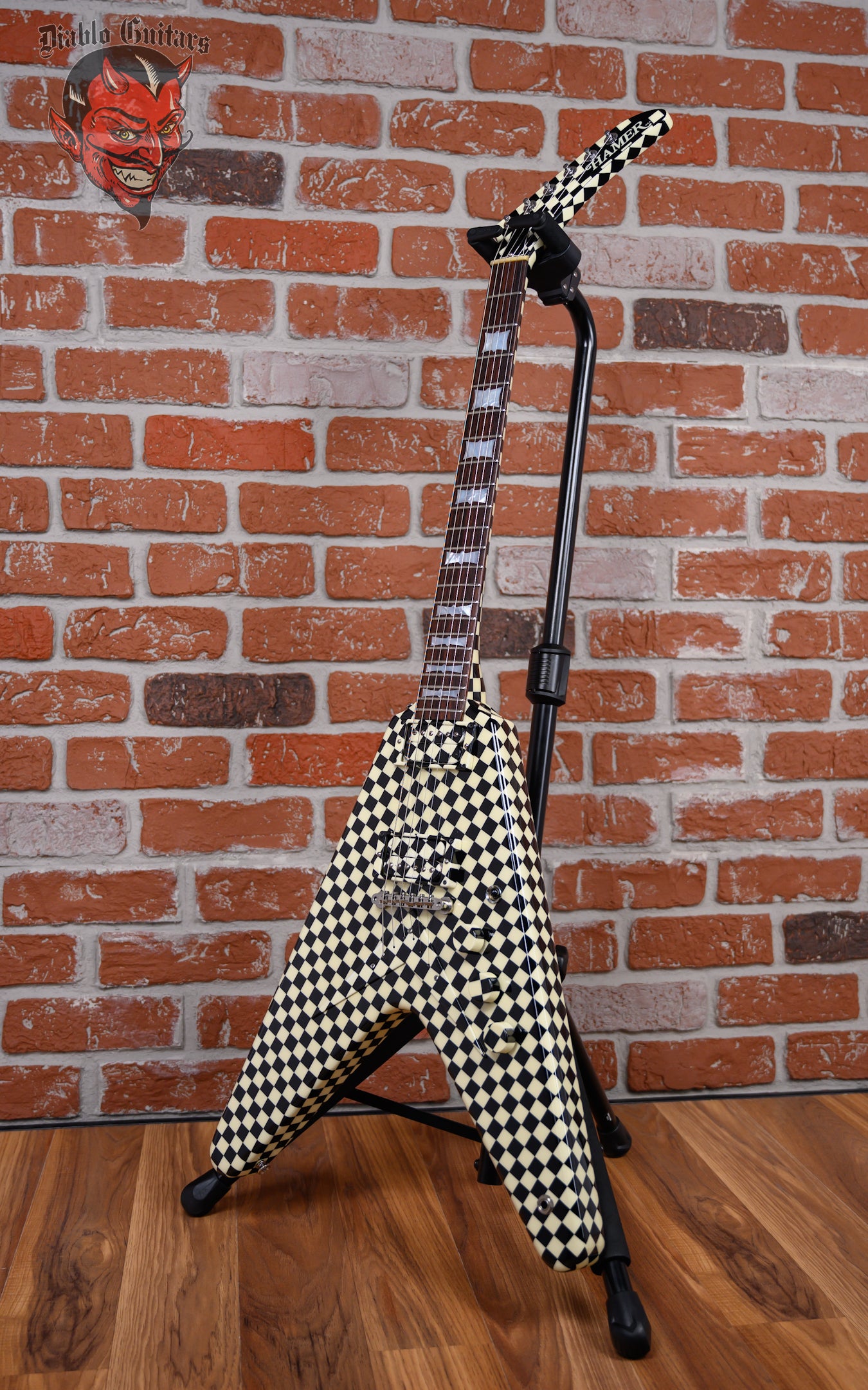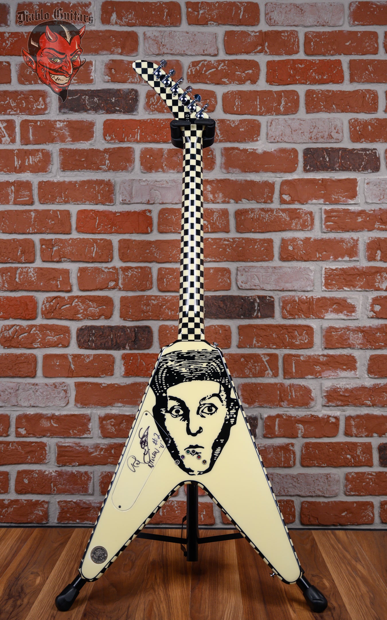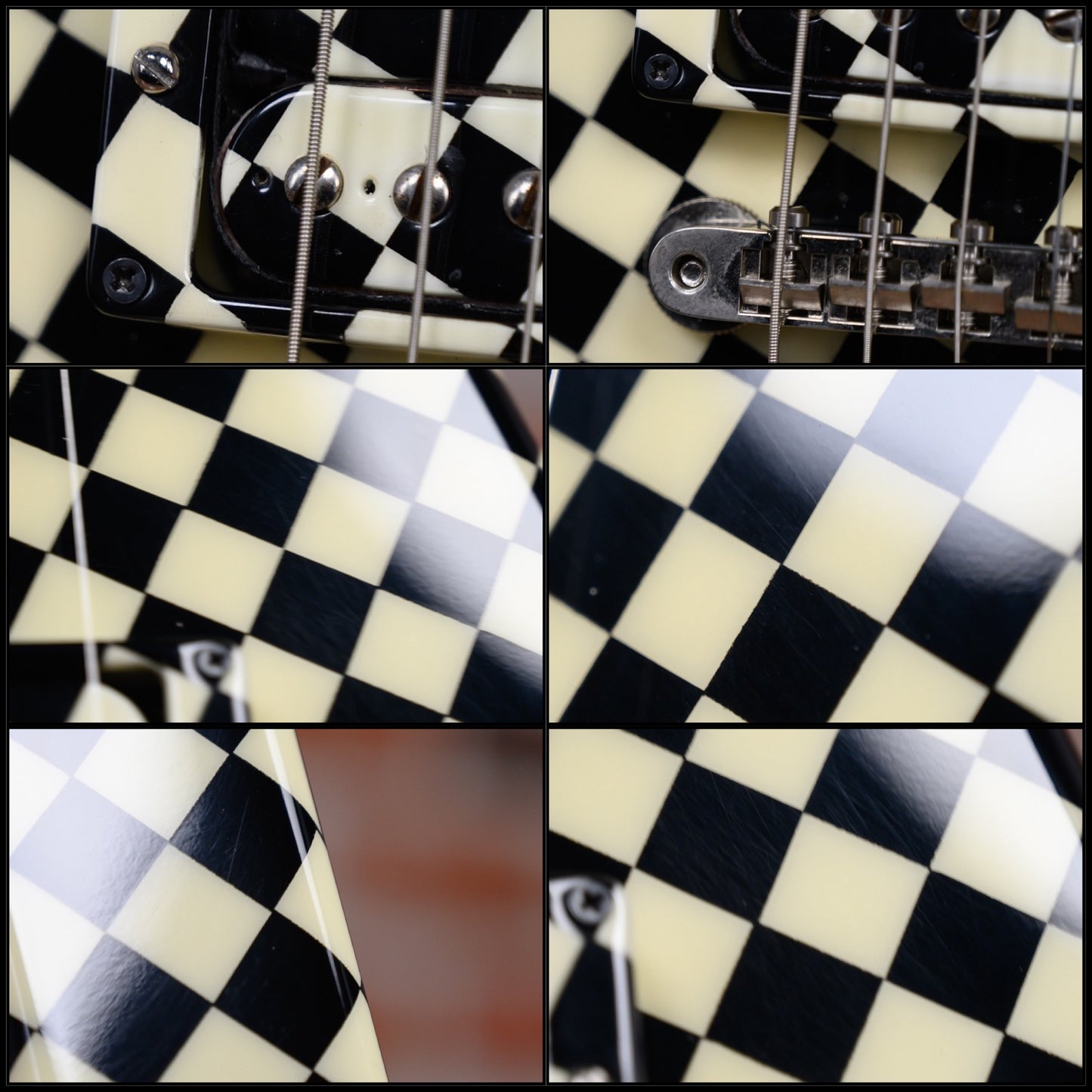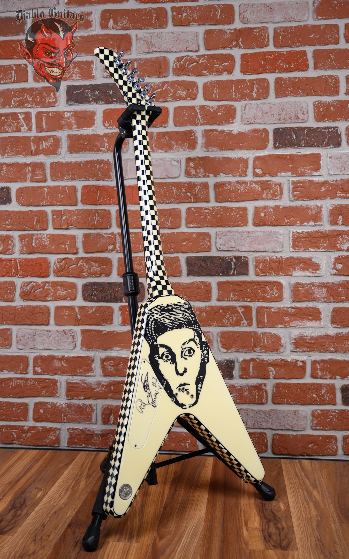 Vintage Hamer Custom Shop Vector V #2 Rick Nick Nielsen Signature Artist Signed in Black & White Checkerboard finish made in 1983 with Original Hard Shell Case. This guitar features a solid mahogany body, mahogany neck and rosewood fingerboard with a color matched headstock. Equipped with its original pair of color matched Hamer Slammer Humbuckers in the neck position and bridge position. Controlled by 2 volume, 1 tone pots and a 3-Way toggle switch comprised of its original CTS pots dating to the 37th week of 1983. The 24.75" scale length neck has mother of pearl bowtie inlays and White side markers with 22 medium jumbo frets on a 12" radius with a medium "C" profile. The hardware is comprised of nickel Grover Mini-Rotomatic tuning machines with mini kidney bean heads, a bone nut, a Hamer ABR-1 Tune-o-matic bridge and color matched speed knobs.