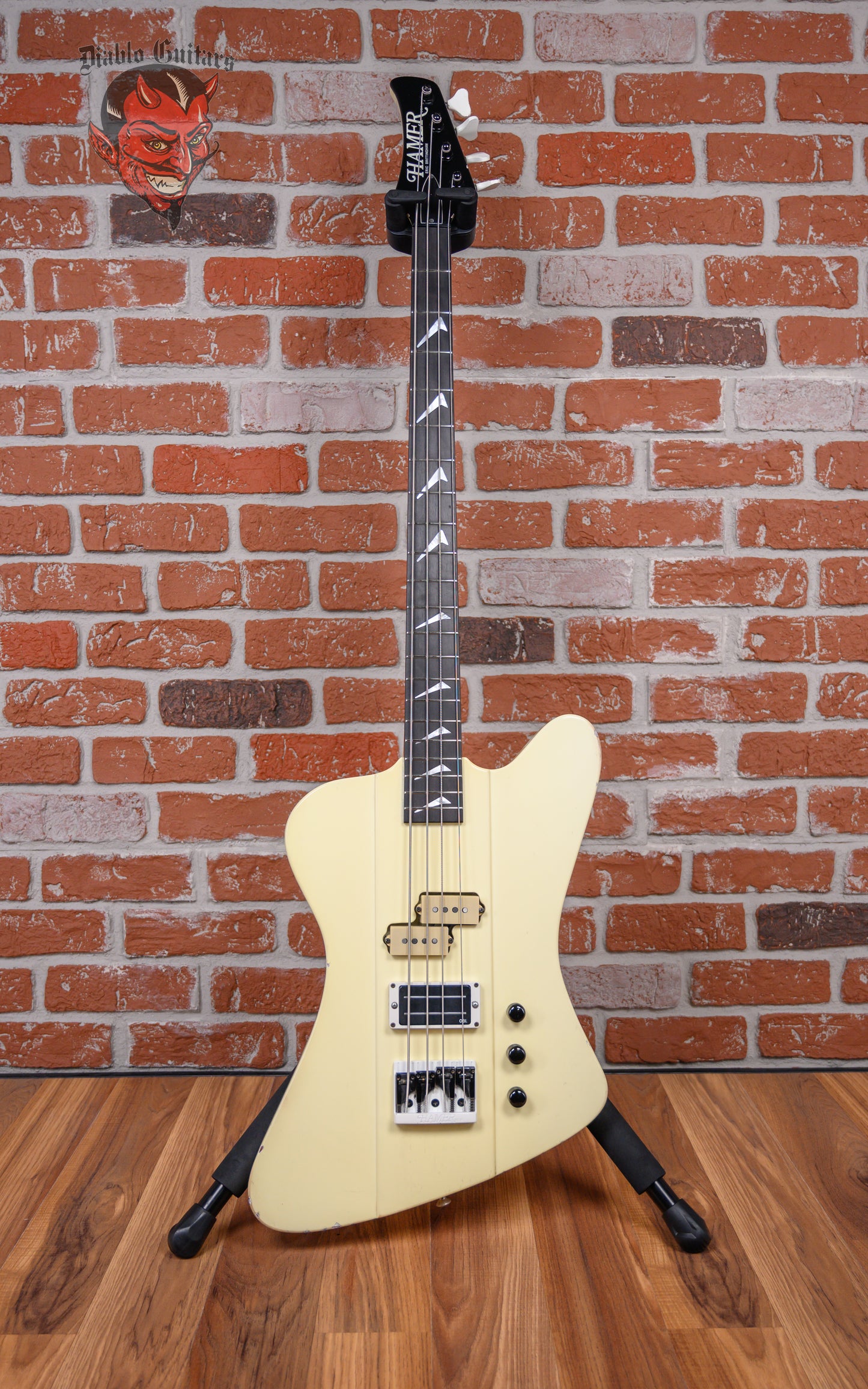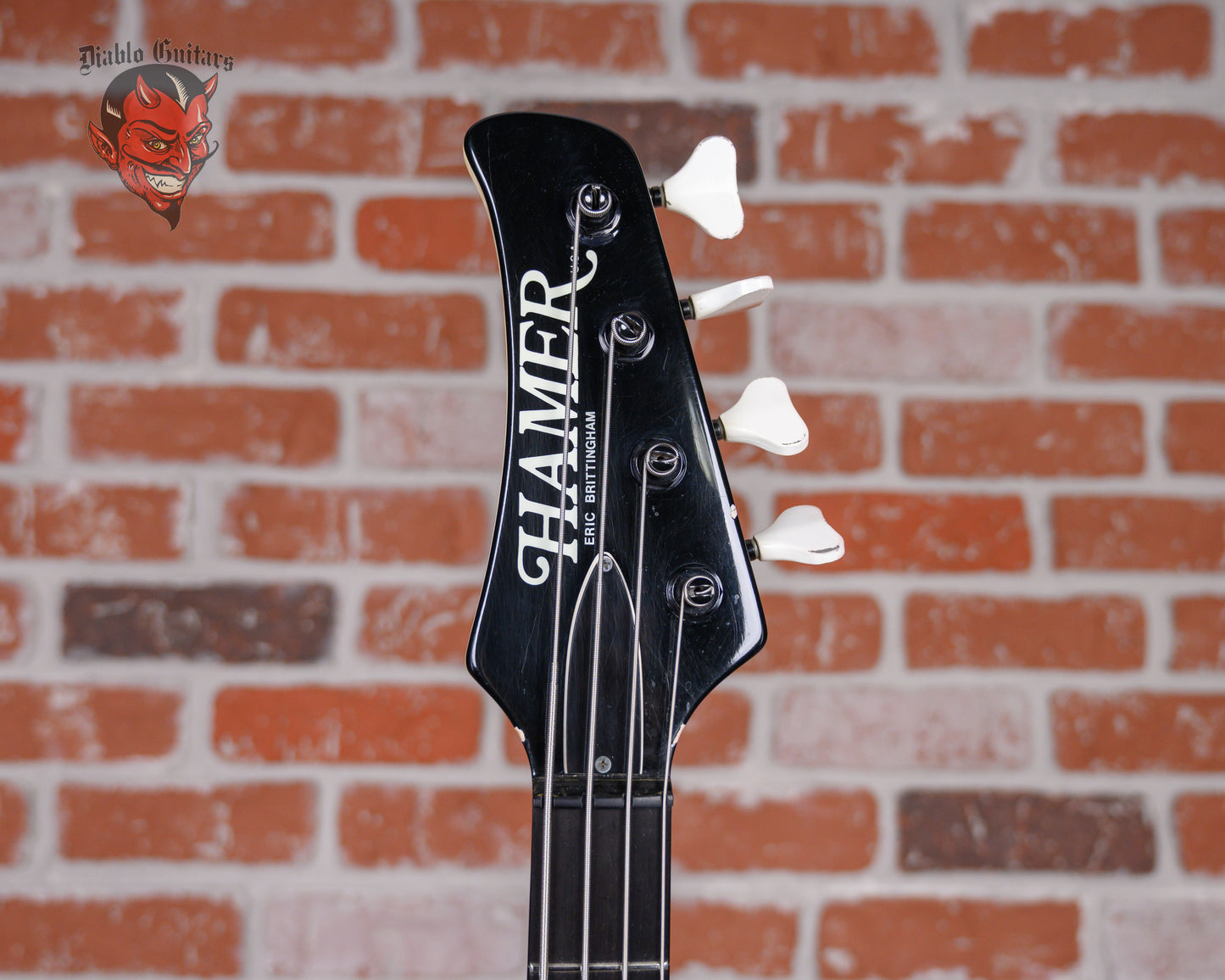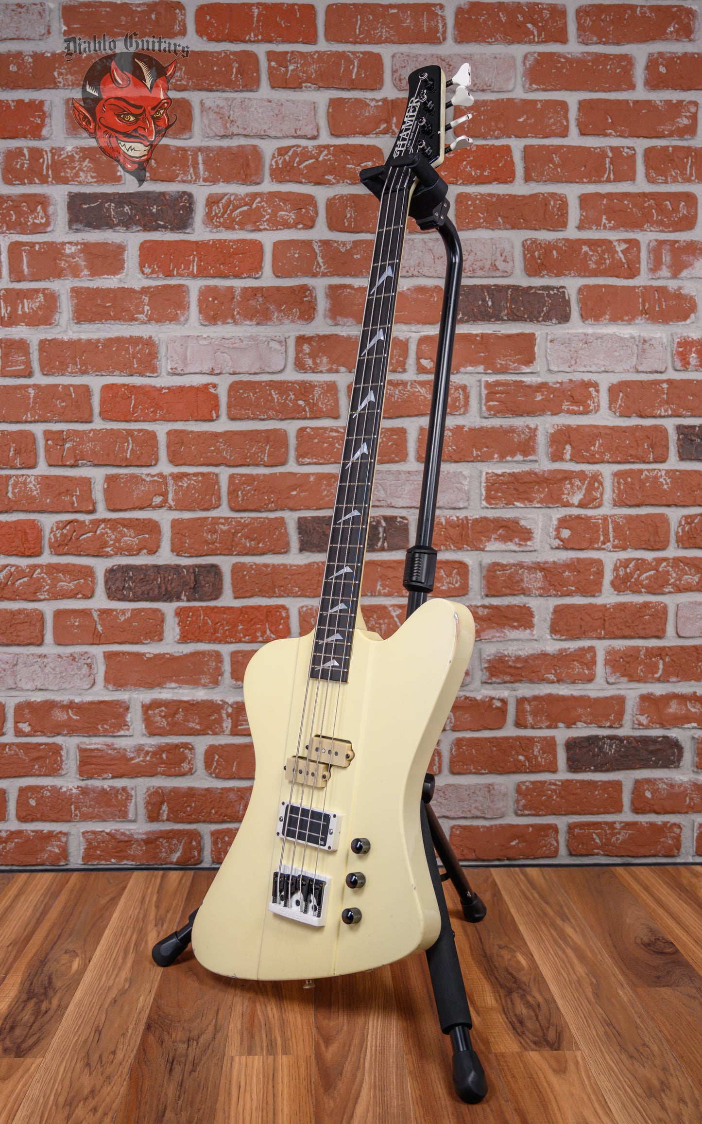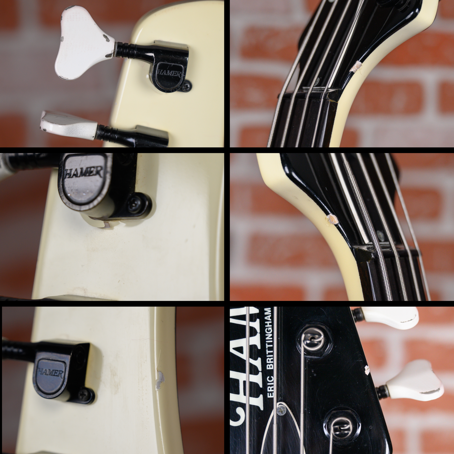 Vintage Hamer FBIV built for Eric Brittingham of Cinderella in Classic White finish made in 1988 with Hard Shell Case. This bass guitar features a solid mahogany body, mahogany neck and ebony fingerboard with a reverse headstock. Equipped with a Seymour Duncan Vintage P-Bass in the neck position and a Bill Lawrence 900 R in the bridge position. Controlled by 1 neck volume pot, 1 bridge volume pot and 1 tone pot comprised of its original CTS pots dating to the 31st week of 1987. The 34" scale length neck has mother of pearl boomerang inlays and mother of pearl side markers with 21 medium jumbo frets on a 12" radius with a medium C profile. The hardware is comprised of white/black Hamer sealed die-cast tuning machines with Y heads, a synthetic nut, a Hamer 4-saddle adjustable bridge and black knurled dome knobs.