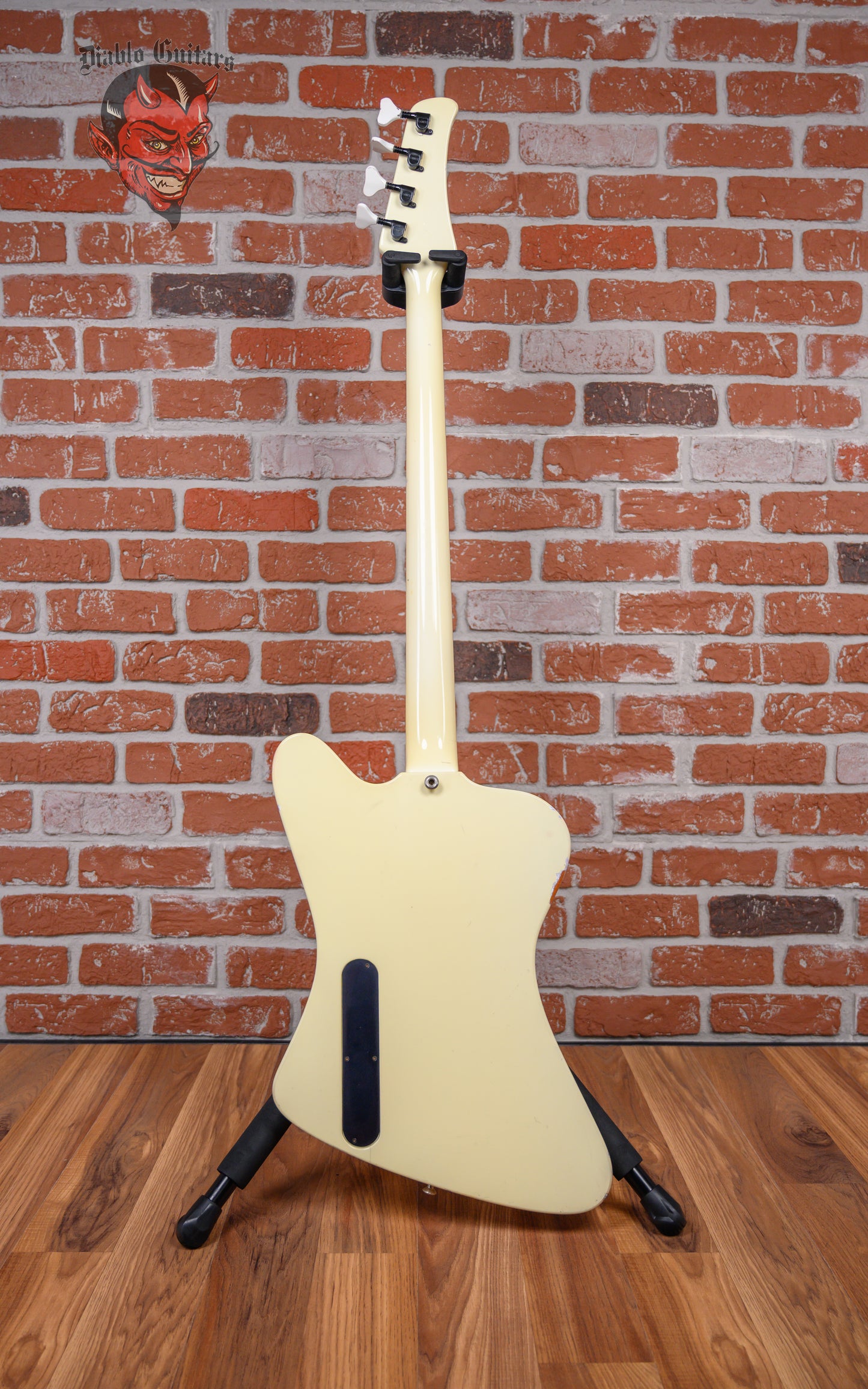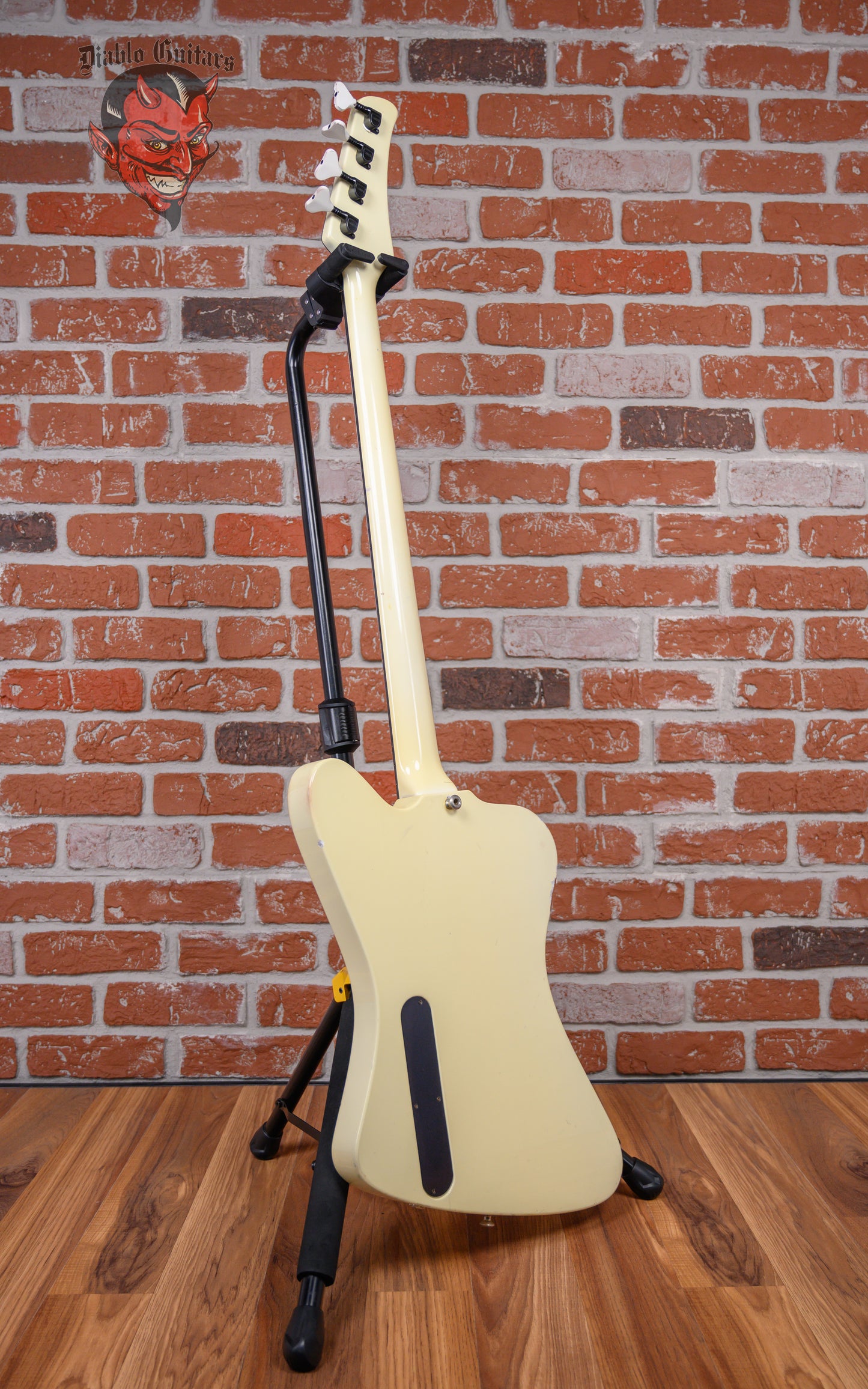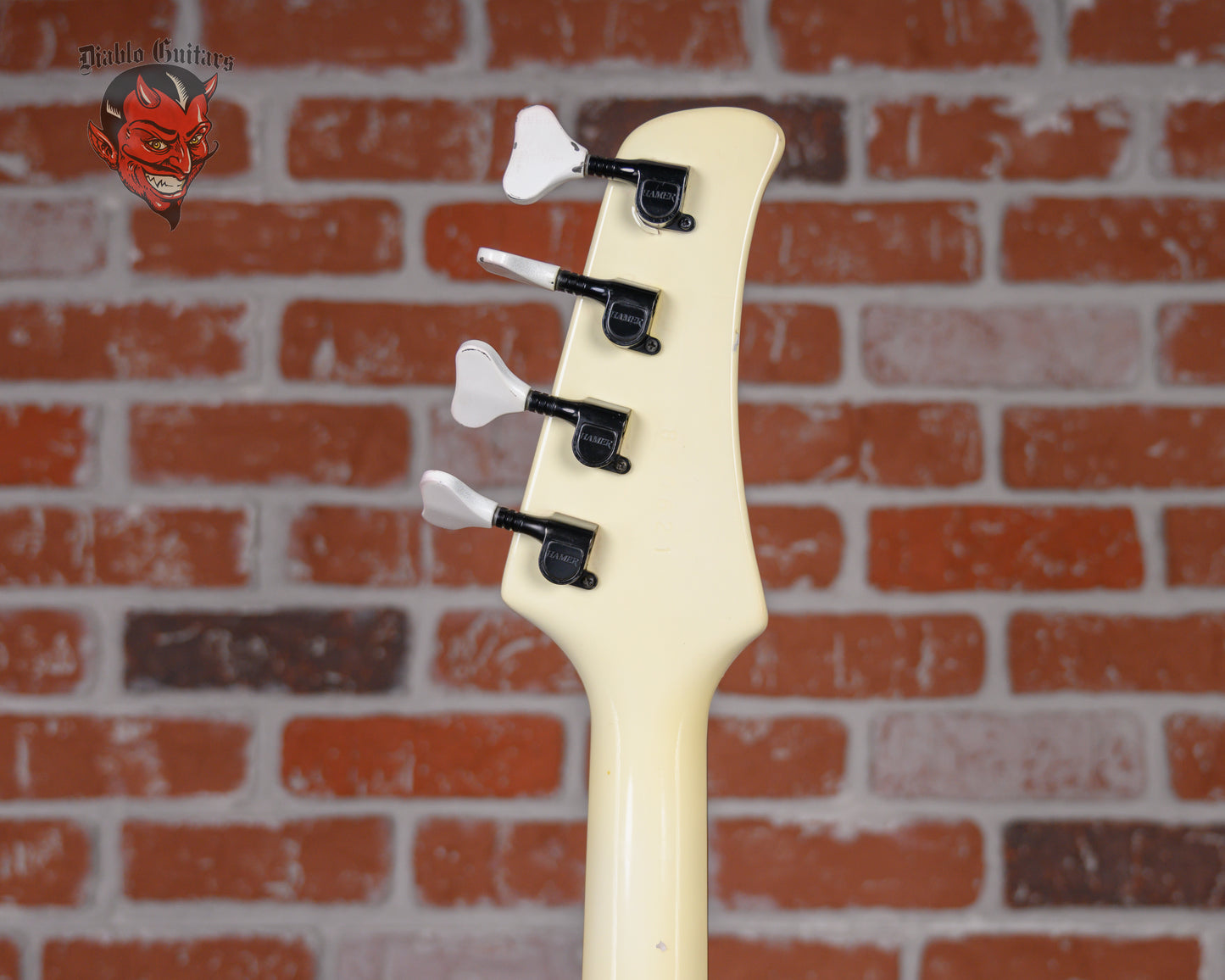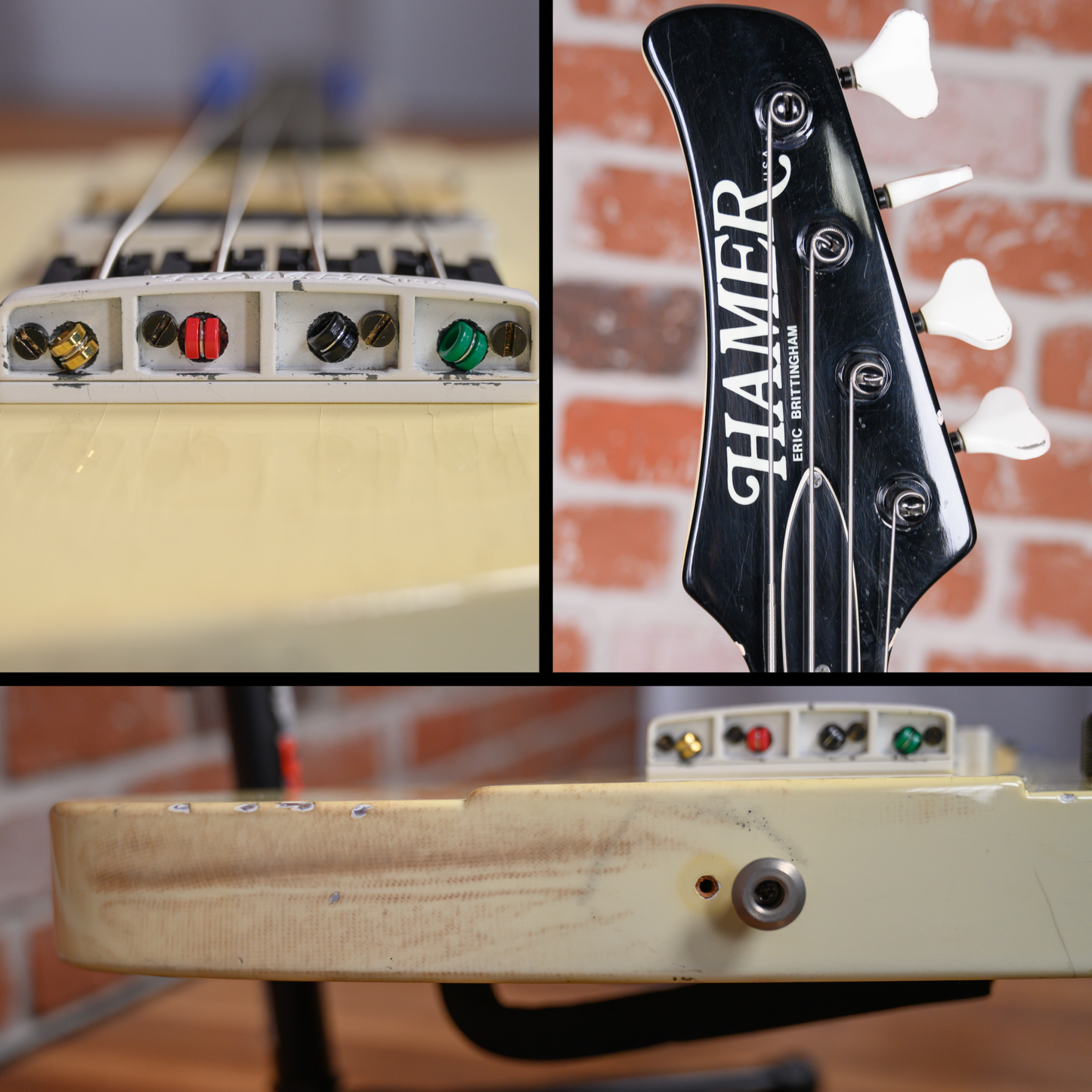 Vintage Hamer FBIV built for Eric Brittingham of Cinderella in Classic White finish made in 1988 with Hard Shell Case. This bass guitar features a solid mahogany body, mahogany neck and ebony fingerboard with a reverse headstock. Equipped with a Seymour Duncan Vintage P-Bass in the neck position and a Bill Lawrence 900 R in the bridge position. Controlled by 1 neck volume pot, 1 bridge volume pot and 1 tone pot comprised of its original CTS pots dating to the 31st week of 1987. The 34" scale length neck has mother of pearl boomerang inlays and mother of pearl side markers with 21 medium jumbo frets on a 12" radius with a medium C profile. The hardware is comprised of white/black Hamer sealed die-cast tuning machines with Y heads, a synthetic nut, a Hamer 4-saddle adjustable bridge and black knurled dome knobs.