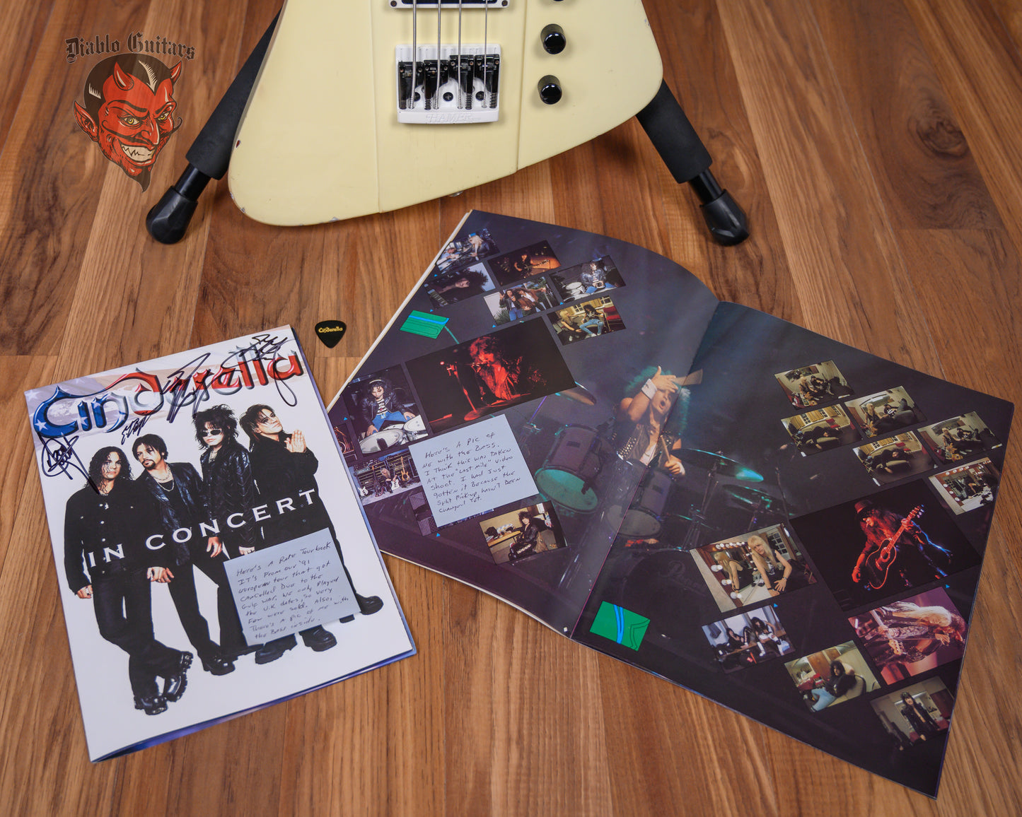 This bass was built for Eric Brittingham of Cinderella. His name adorns the headstock and it includes a Cinderella pick, signed poster and tour book featuring a photo of Eric with the bass.