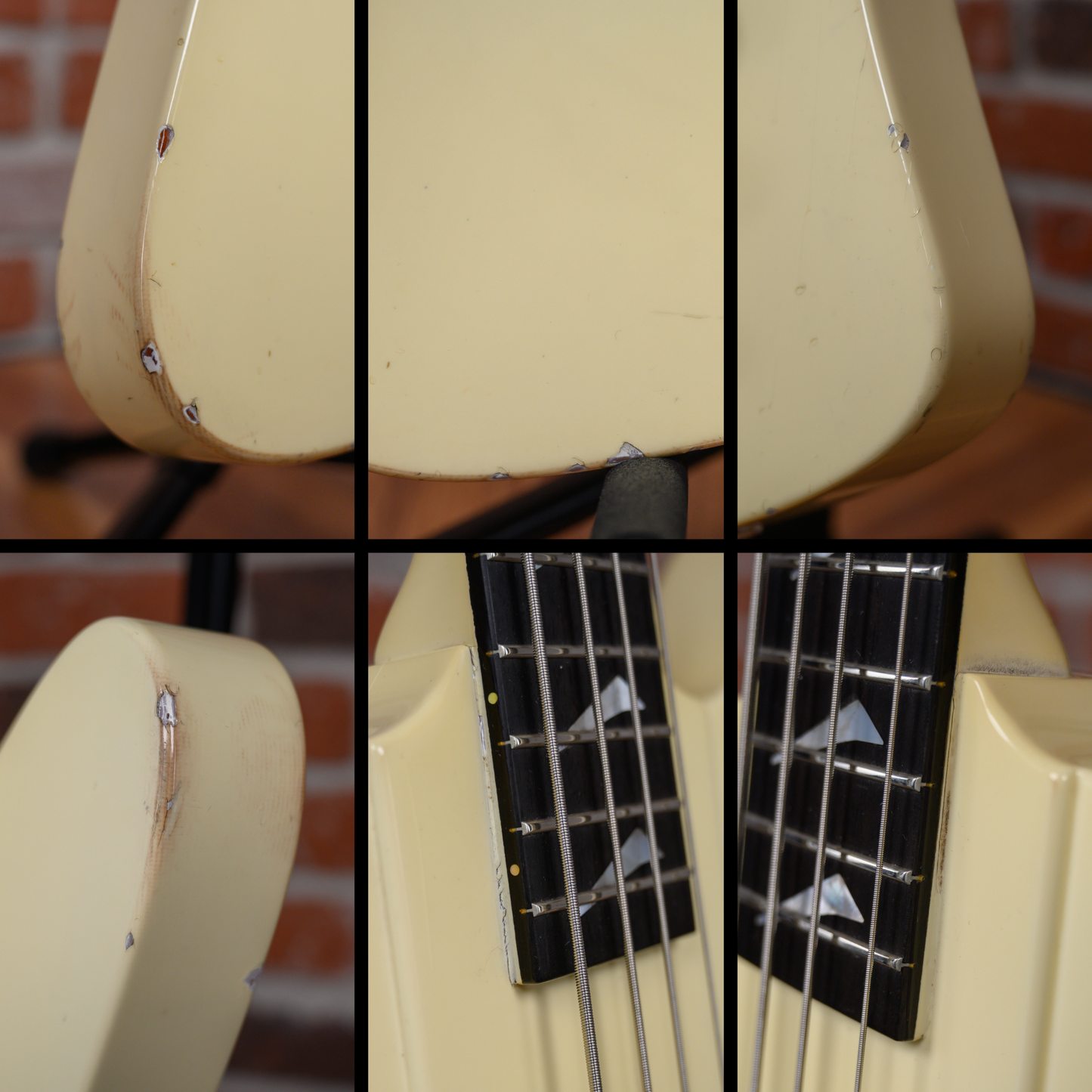 This bass guitar is in overall very good condition. The finish is lightly discolored and lightly checked throughout. There are some small chips in the finish around the hardware. The headstock has some small chips. There are some finish chips on the back of the neck with some darker marks. There are some dings and finish chips throughout the body with some dark marks on the bottom. The lower strap button was moved at some point in its life to its current position, leaving the original hole. (See Pics)