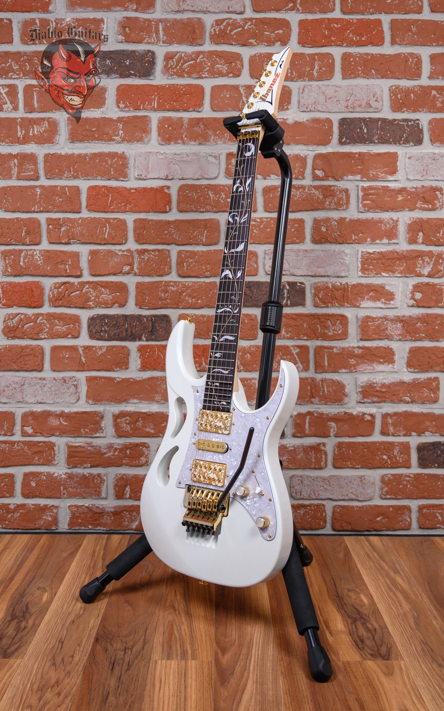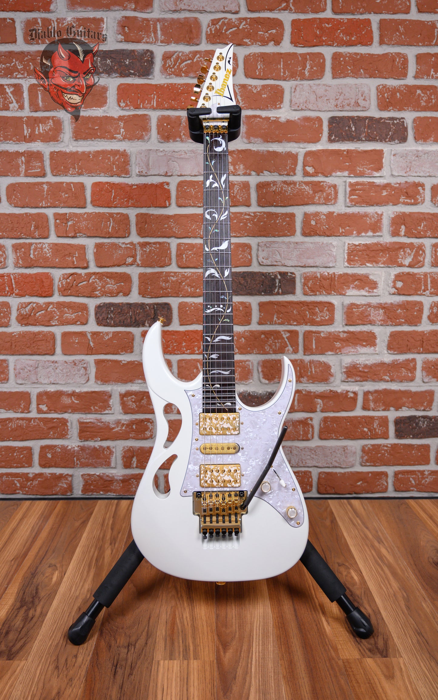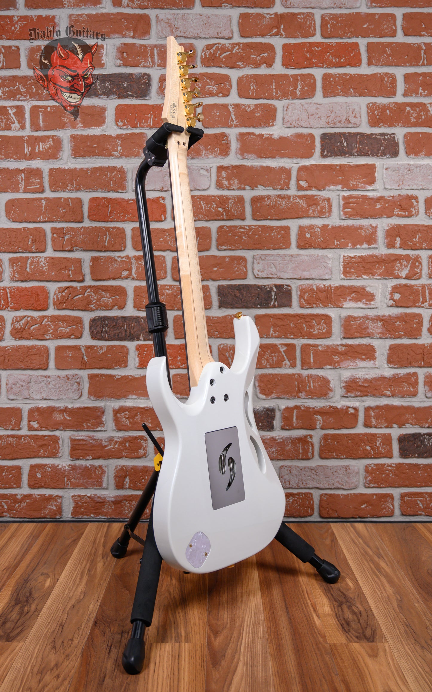 Ibanez PIA3761 in Stallion White finish made in 2021 with Original Hard Shell Case. This guitar features a solid alder body, 5-piece maple/walnut neck and rosewood fingerboard with a color matched headstock. Equipped with a set of passive DiMarzio UtoPIA pickups in an HSH configuration, controlled by 1 volume pot with push/pull High Pass Filter, 1 tone pot and a 5-way blade switch. The 25.5" scale length neck has pearloid & abalone PIA Blossom inlays and luminlay side markers with 24 jumbo stainless steel frets with scalloping between frets 21-24 on a 430mm radius with a PIA profile. The hardware is comprised of gold Gotoh Sealed Die-Cast tuning machines with cloche heads, a top lok III nut, a Ibanez Edge Double Locking Tremolo bridge w/ Ultralite Tremolo Arm, gold knurled dome knobs w/ pearl inserts and a 3-ply pearloid pickguard.