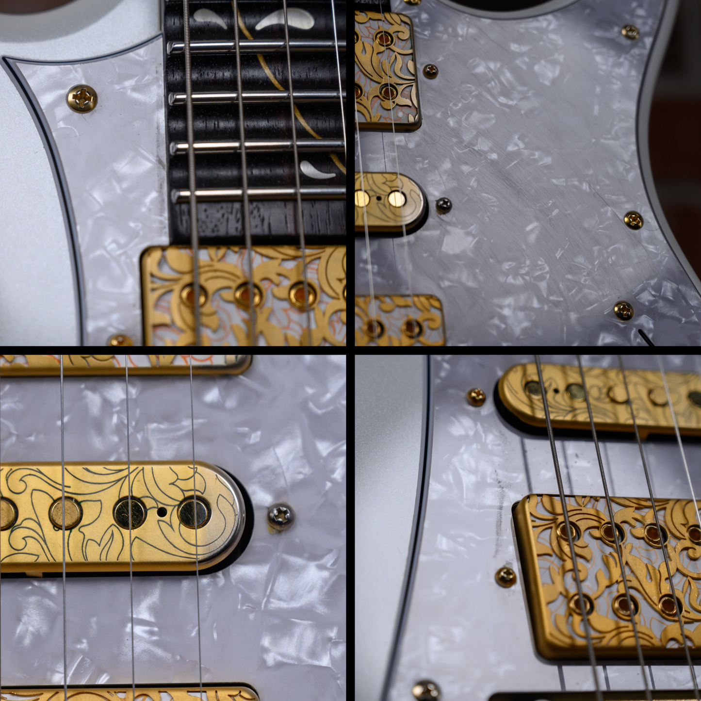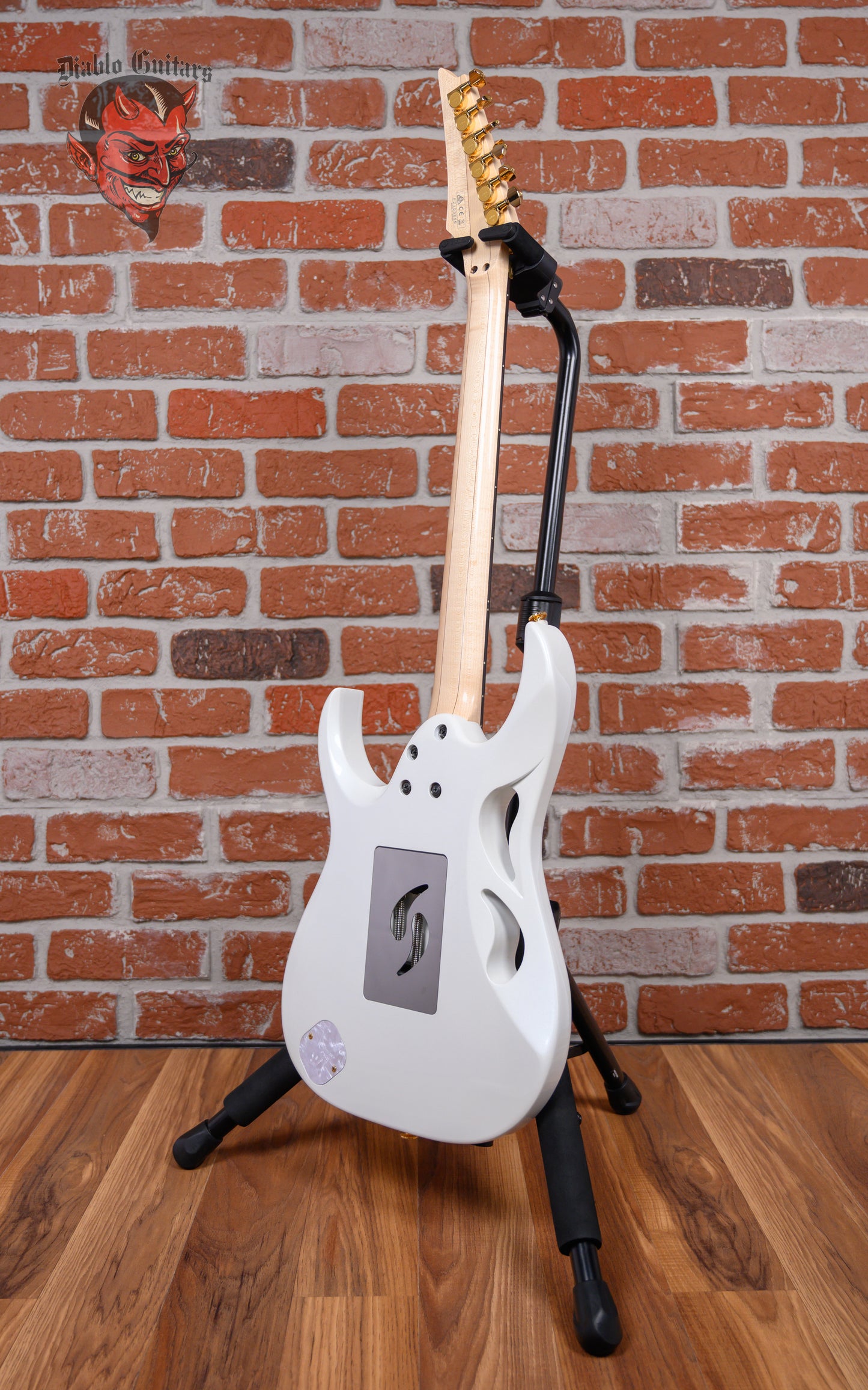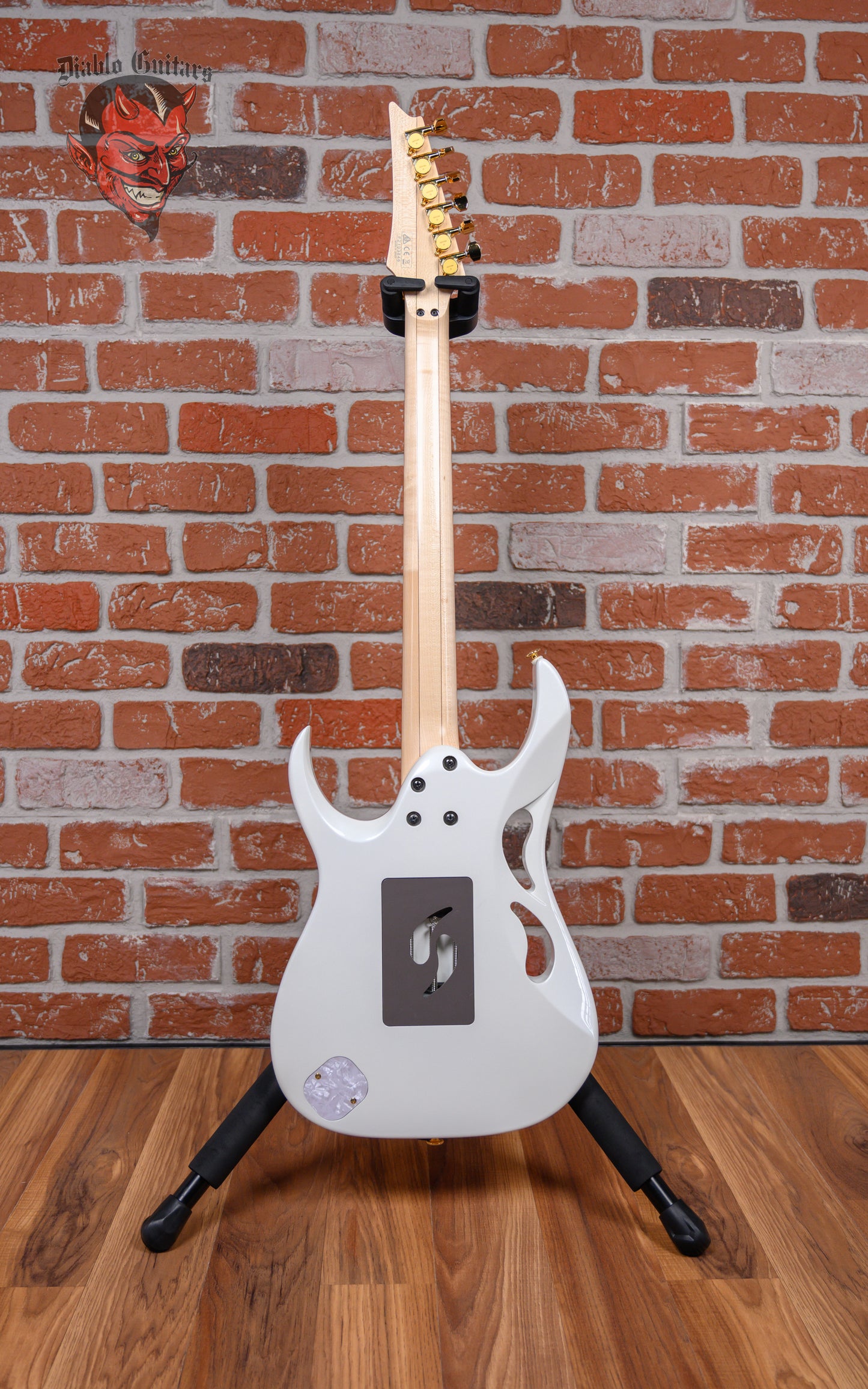Ibanez PIA3761 in Stallion White finish made in 2021 with Original Hard Shell Case. This guitar features a solid alder body, 5-piece maple/walnut neck and rosewood fingerboard with a color matched headstock. Equipped with a set of passive DiMarzio UtoPIA pickups in an HSH configuration, controlled by 1 volume pot with push/pull High Pass Filter, 1 tone pot and a 5-way blade switch. The 25.5" scale length neck has pearloid & abalone PIA Blossom inlays and luminlay side markers with 24 jumbo stainless steel frets with scalloping between frets 21-24 on a 430mm radius with a PIA profile. The hardware is comprised of gold Gotoh Sealed Die-Cast tuning machines with cloche heads, a top lok III nut, a Ibanez Edge Double Locking Tremolo bridge w/ Ultralite Tremolo Arm, gold knurled dome knobs w/ pearl inserts and a 3-ply pearloid pickguard.