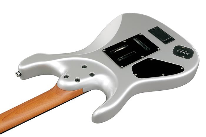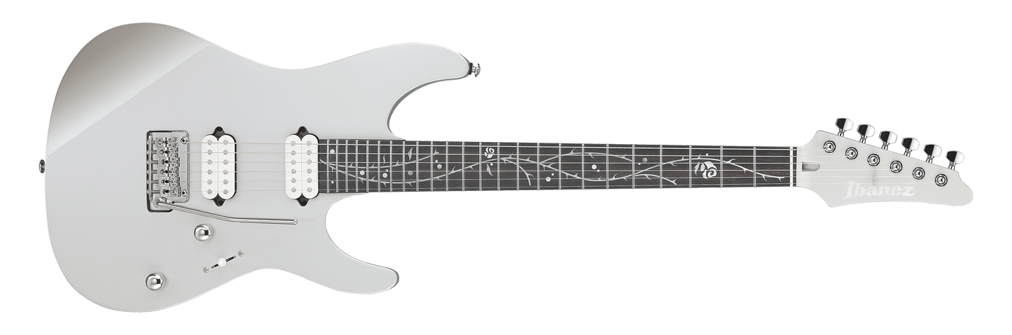 New Ibanez TOD10 Tim Henson Signature in Classic Silver finish made in 2025 with Original Gigbag. This guitar features a solid american basswood body, roasted maple neck and ebony fingerboard with a color matched headstock. Equipped with a pair of Fishman Fluence™ Tim Henson Signature Series active Alnico humbuckers in the neck and bridge position. Controlled by 1 volume, 1 tone pot with push/push 2nd voicing and a 5-Way blade switch with position's 2&4 coil tapping. The 25.5" scale length neck has pearloid tree of death inlays and luminlay side markers with 24 jumbo stainless steel frets on a 305mm radius with a AZ7 oval C profile. The hardware is comprised of chrome Gotoh MG-T Locking tuning machines with cloche heads, a graph tech nut, a Gotoh T1502S tremolo bridge and chrome knurled dome knobs.