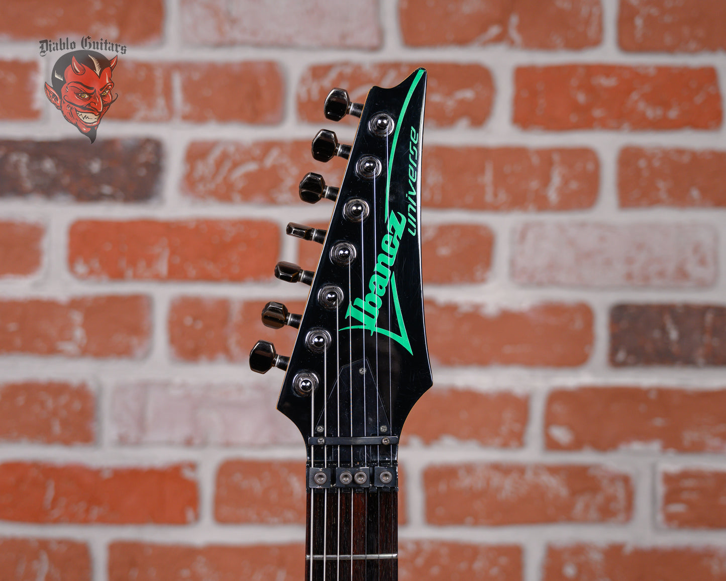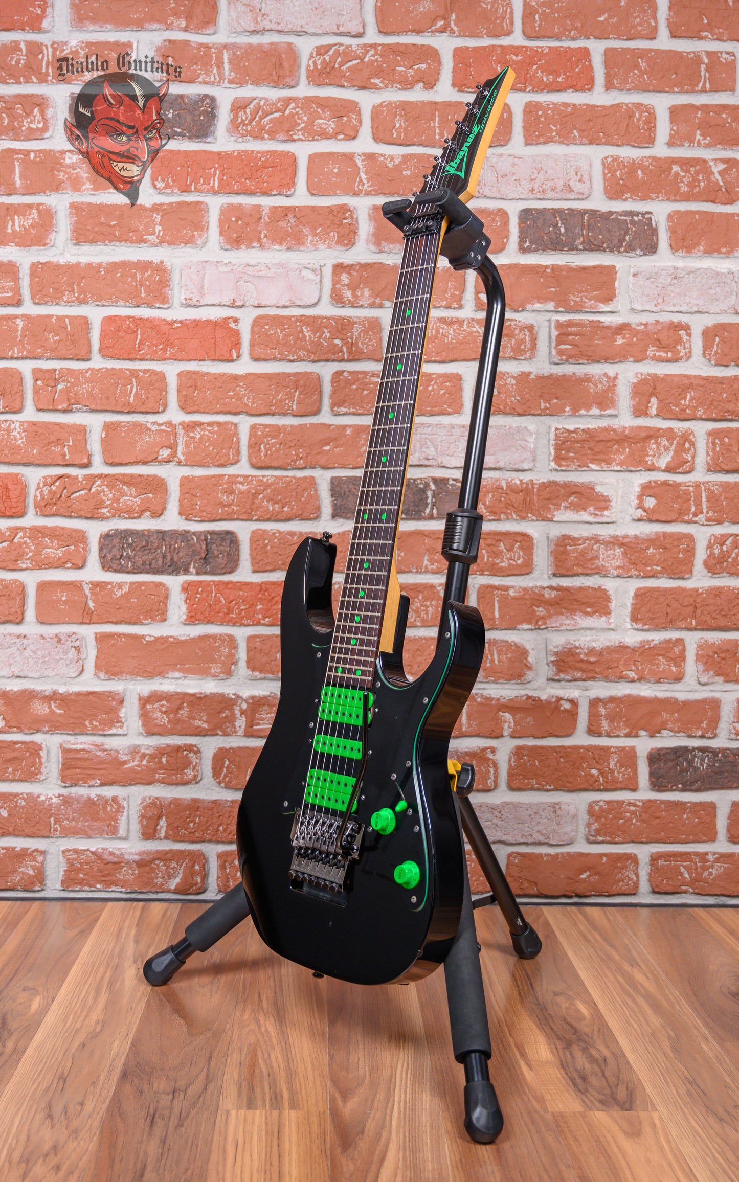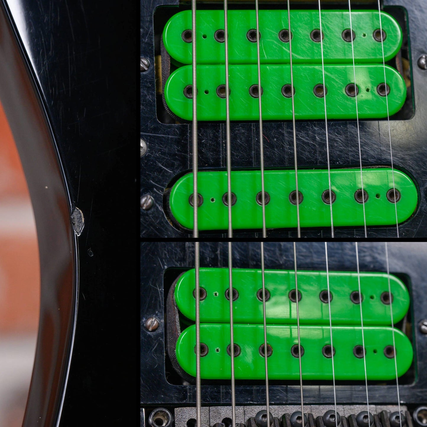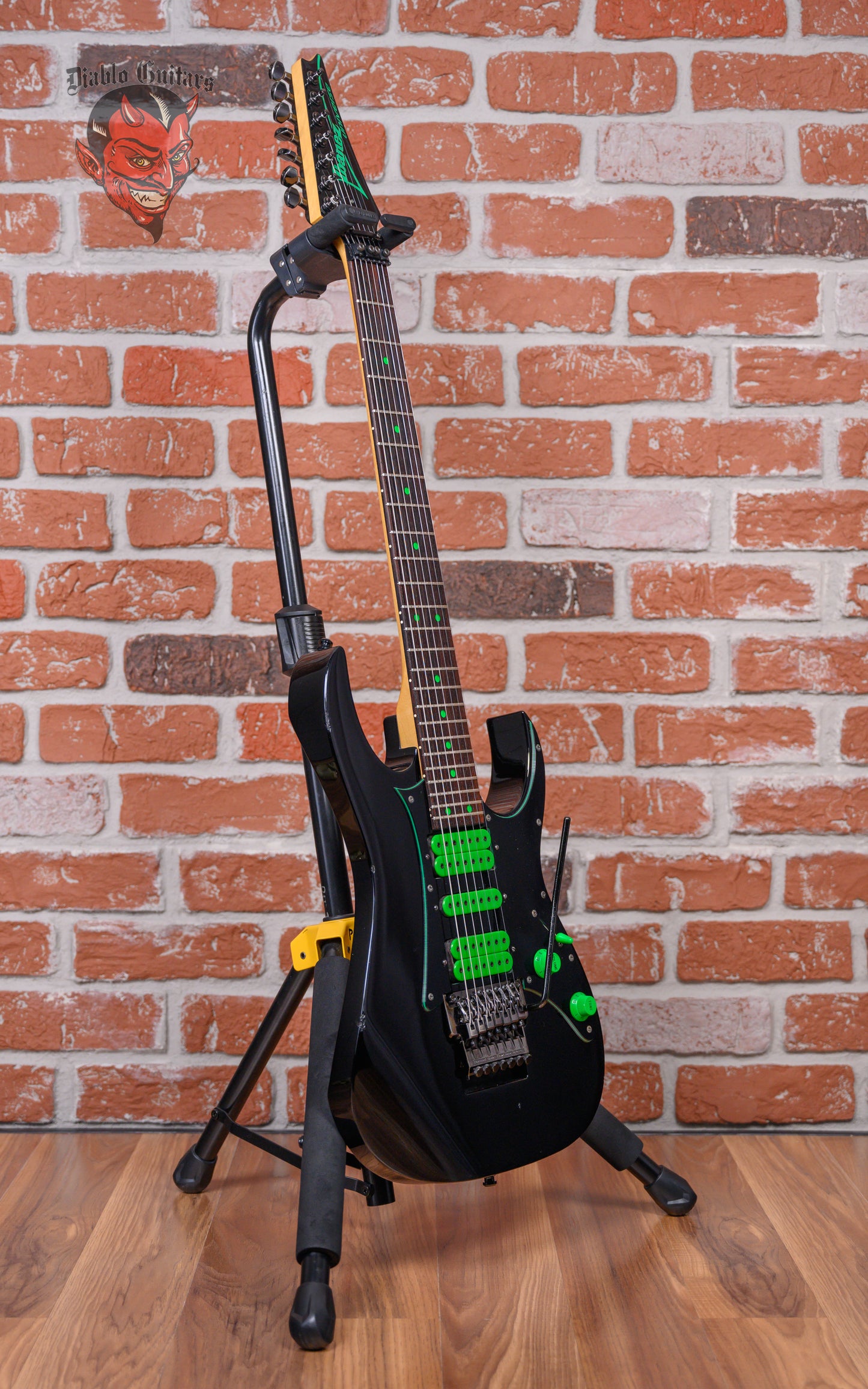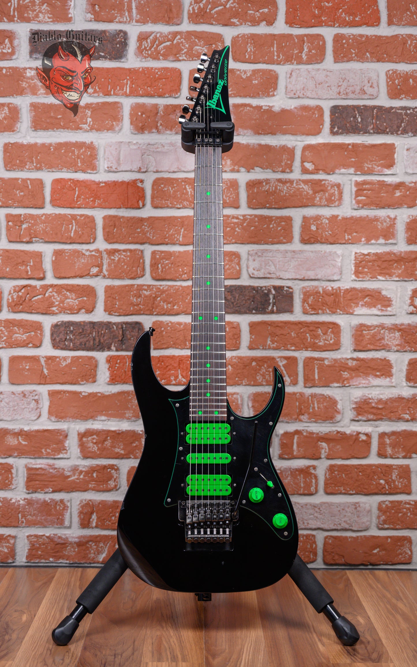 Ibanez UV7 Steve Vai Signature in Black finish made in 1991 with Original Hard Shell Case. This guitar features a solid basswood body, 2-piece maple neck and rosewood fingerboard with a color matched headstock. Equipped with a set of green Ibanez Blaze II humbuckers in the neck and bridge position and an Ibanez Blaze II single coil in the middle position. Controlled by 1 volume pot, 1 tone pot and a 5-way blade switch. The 25.5" scale length neck has green dot inlays and white side markers with 24 jumbo frets on a 430mm radius with a UV profile. The hardware is comprised of cosmo black Gotoh sealed die-cast tuning machines with cloche heads, a Top Lok III nut, an Ibanez Lo Pro Edge 7 Double Locking Tremolo bridge and green top hat knobs with a 3 ply black on green pickguard.