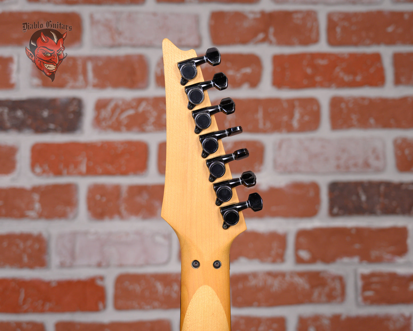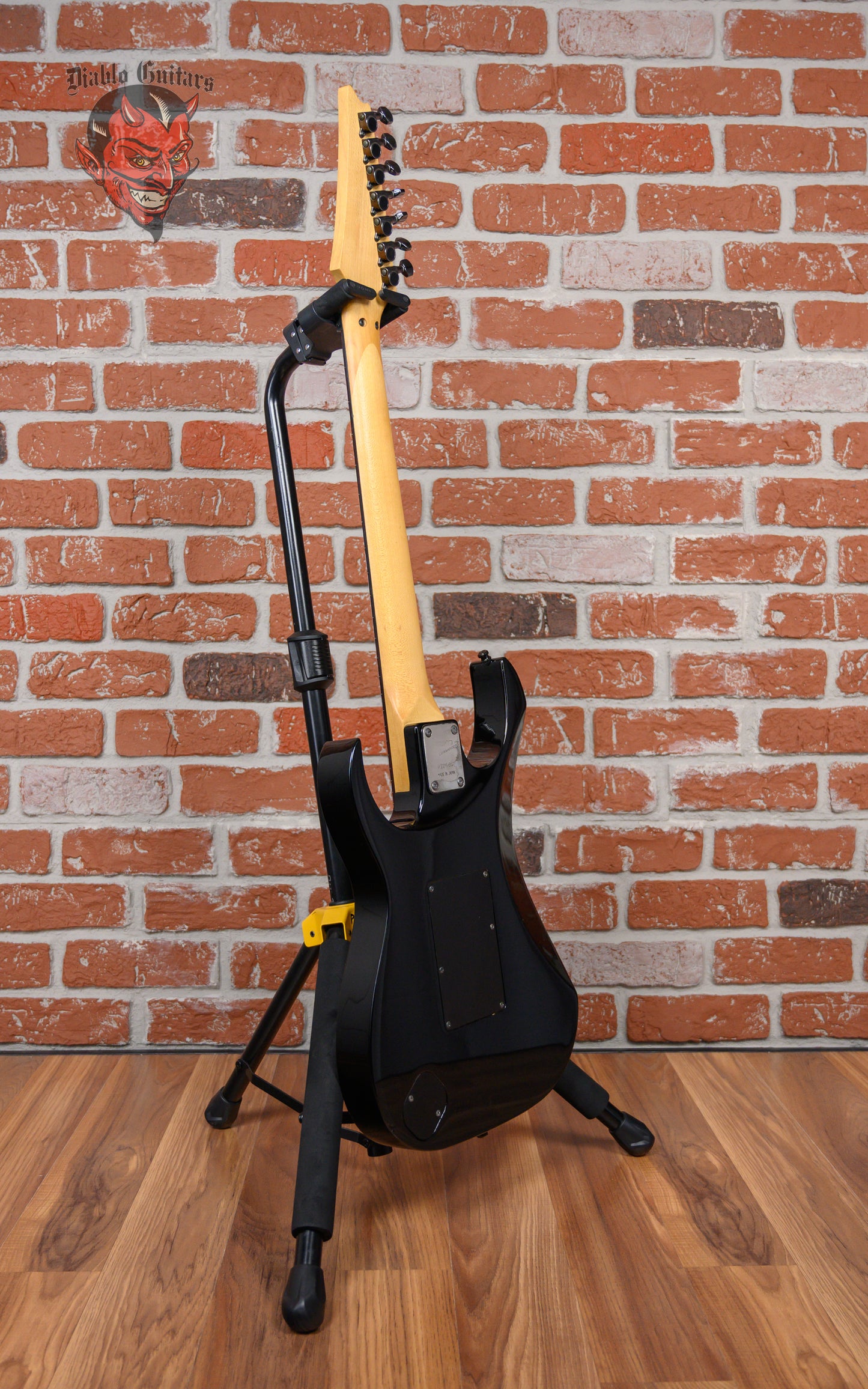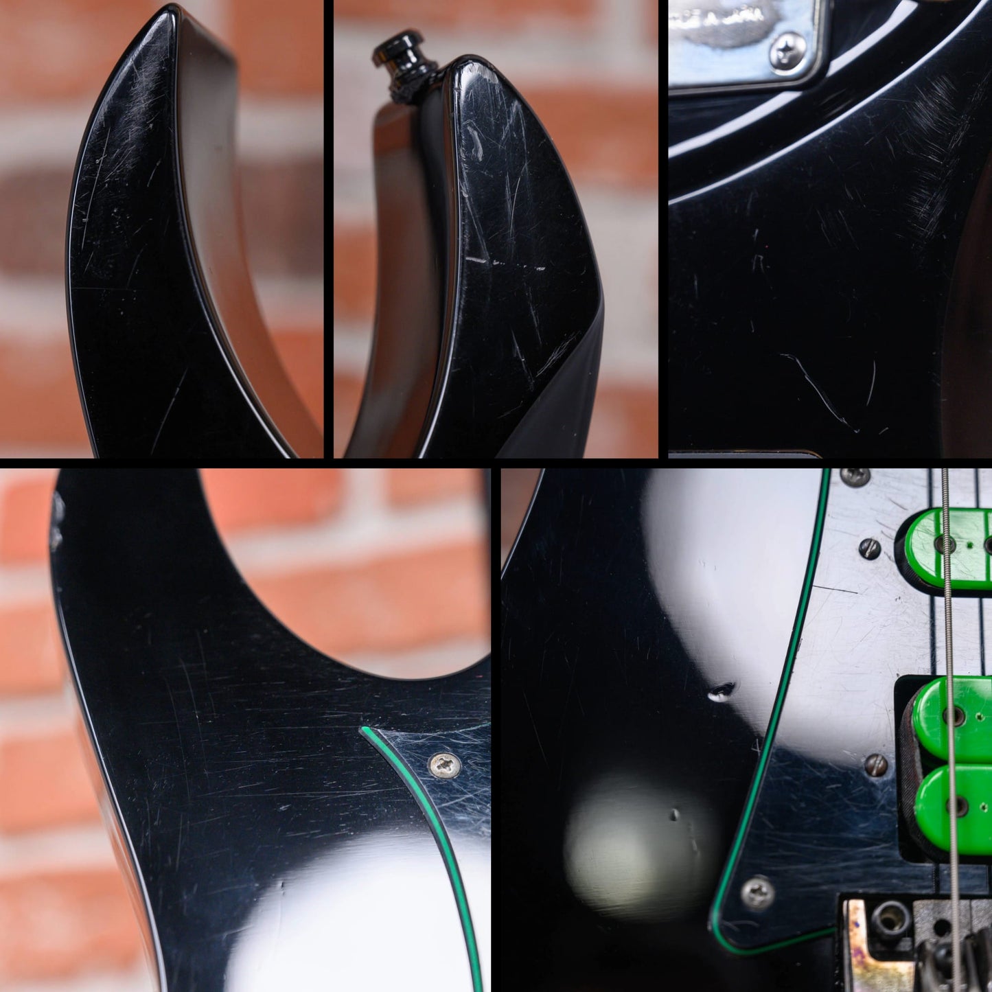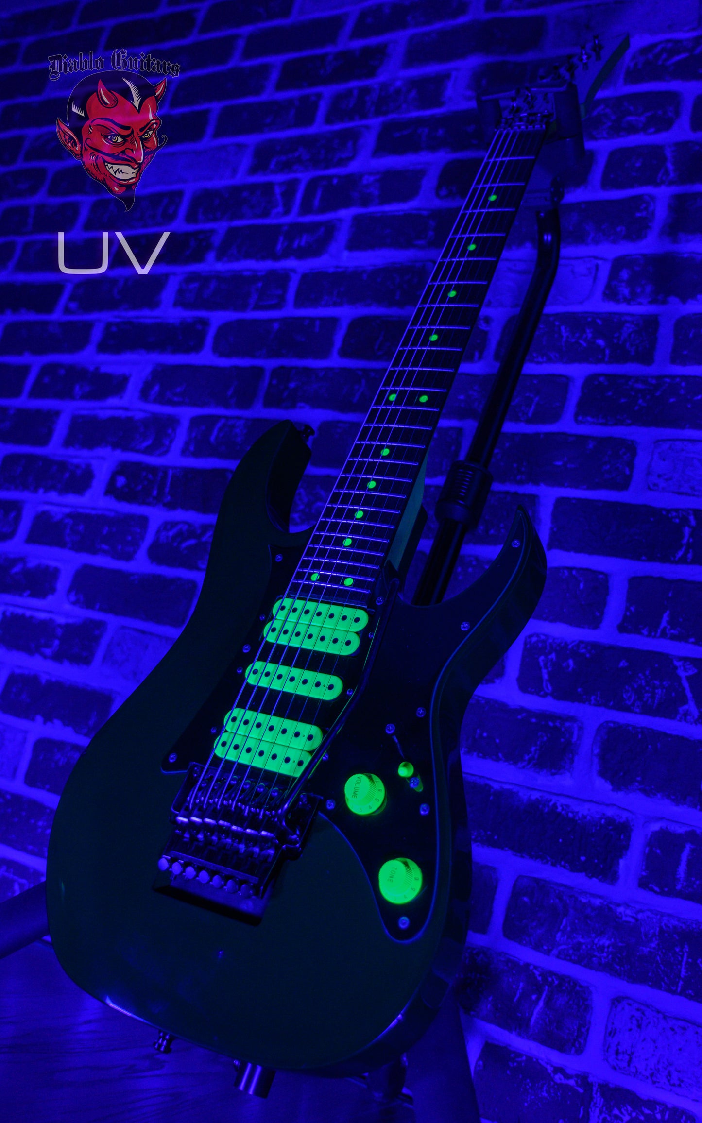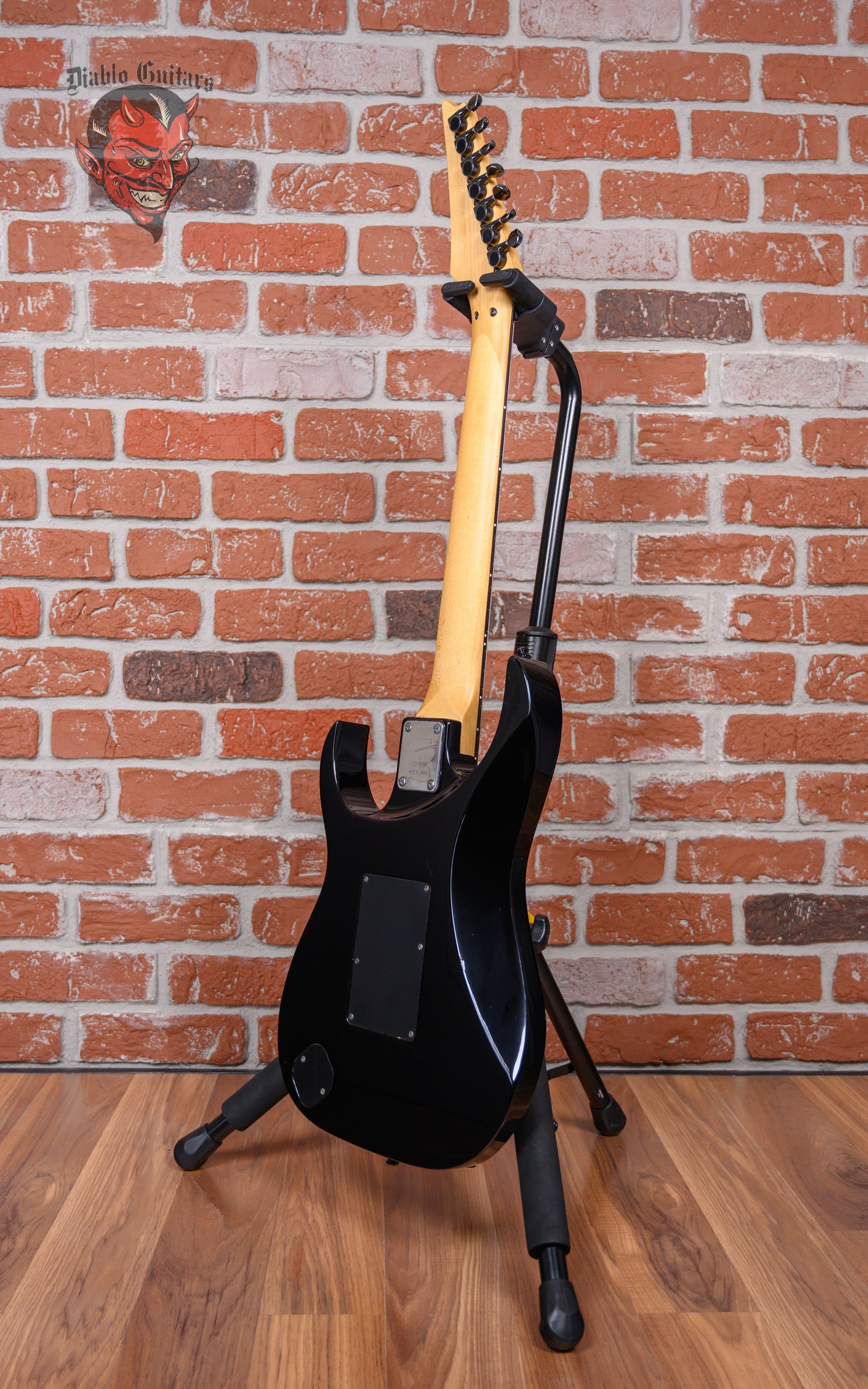 Ibanez UV7 Steve Vai Signature in Black finish made in 1991 with Original Hard Shell Case. This guitar features a solid basswood body, 2-piece maple neck and rosewood fingerboard with a color matched headstock. Equipped with a set of green Ibanez Blaze II humbuckers in the neck and bridge position and an Ibanez Blaze II single coil in the middle position. Controlled by 1 volume pot, 1 tone pot and a 5-way blade switch. The 25.5" scale length neck has green dot inlays and white side markers with 24 jumbo frets on a 430mm radius with a UV profile. The hardware is comprised of cosmo black Gotoh sealed die-cast tuning machines with cloche heads, a Top Lok III nut, an Ibanez Lo Pro Edge 7 Double Locking Tremolo bridge and green top hat knobs with a 3 ply black on green pickguard.