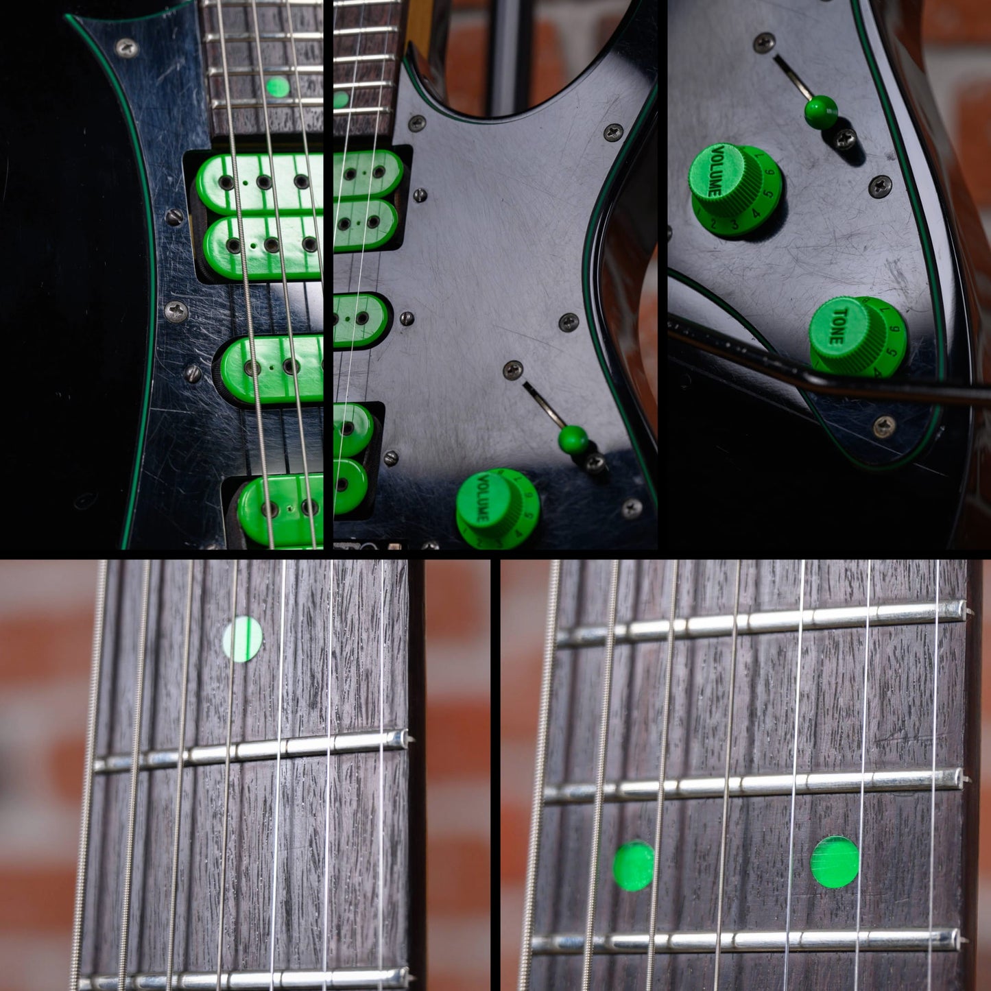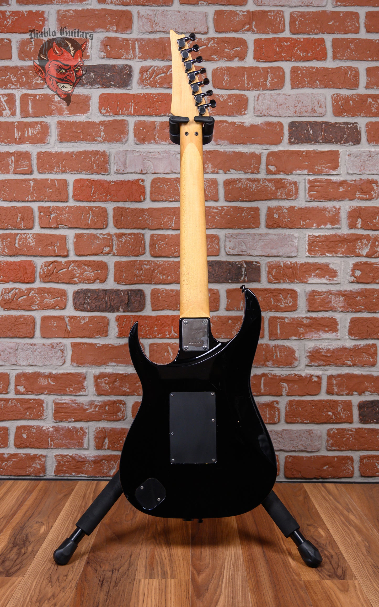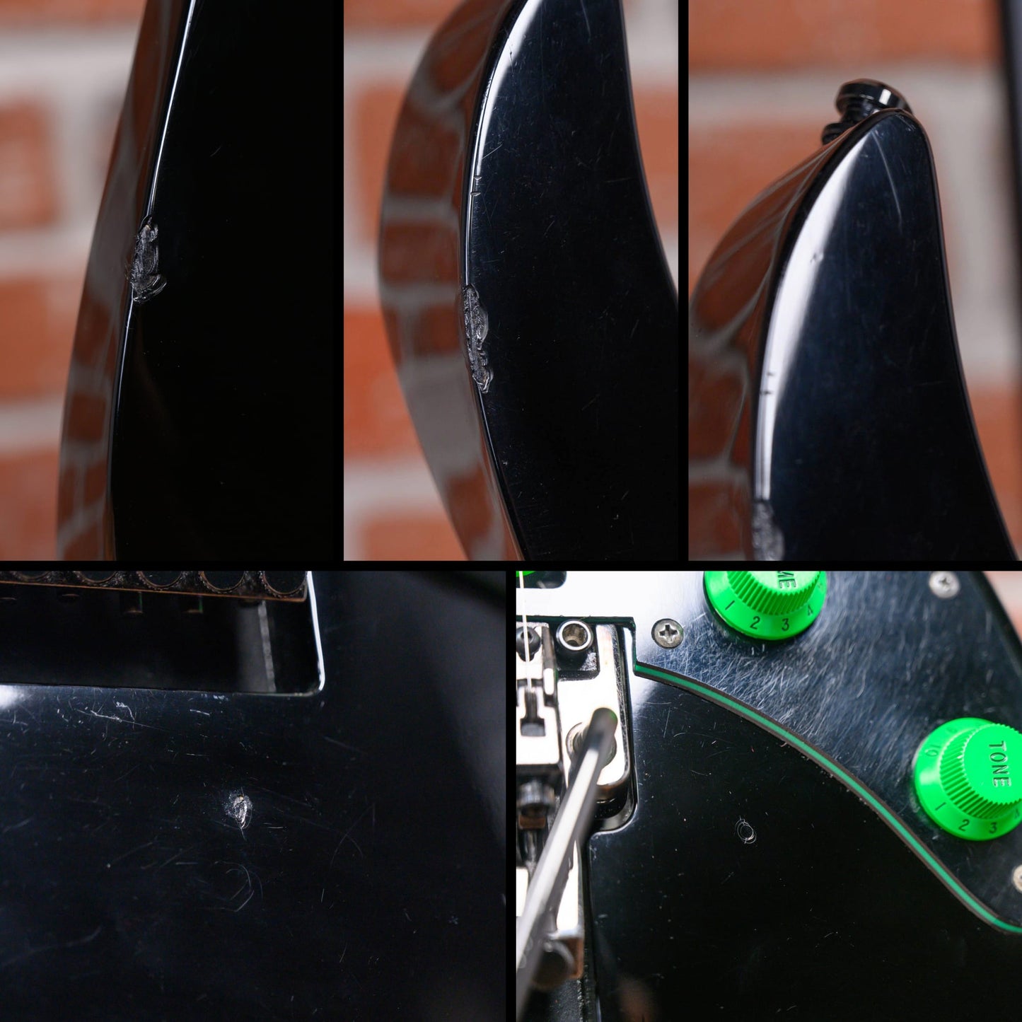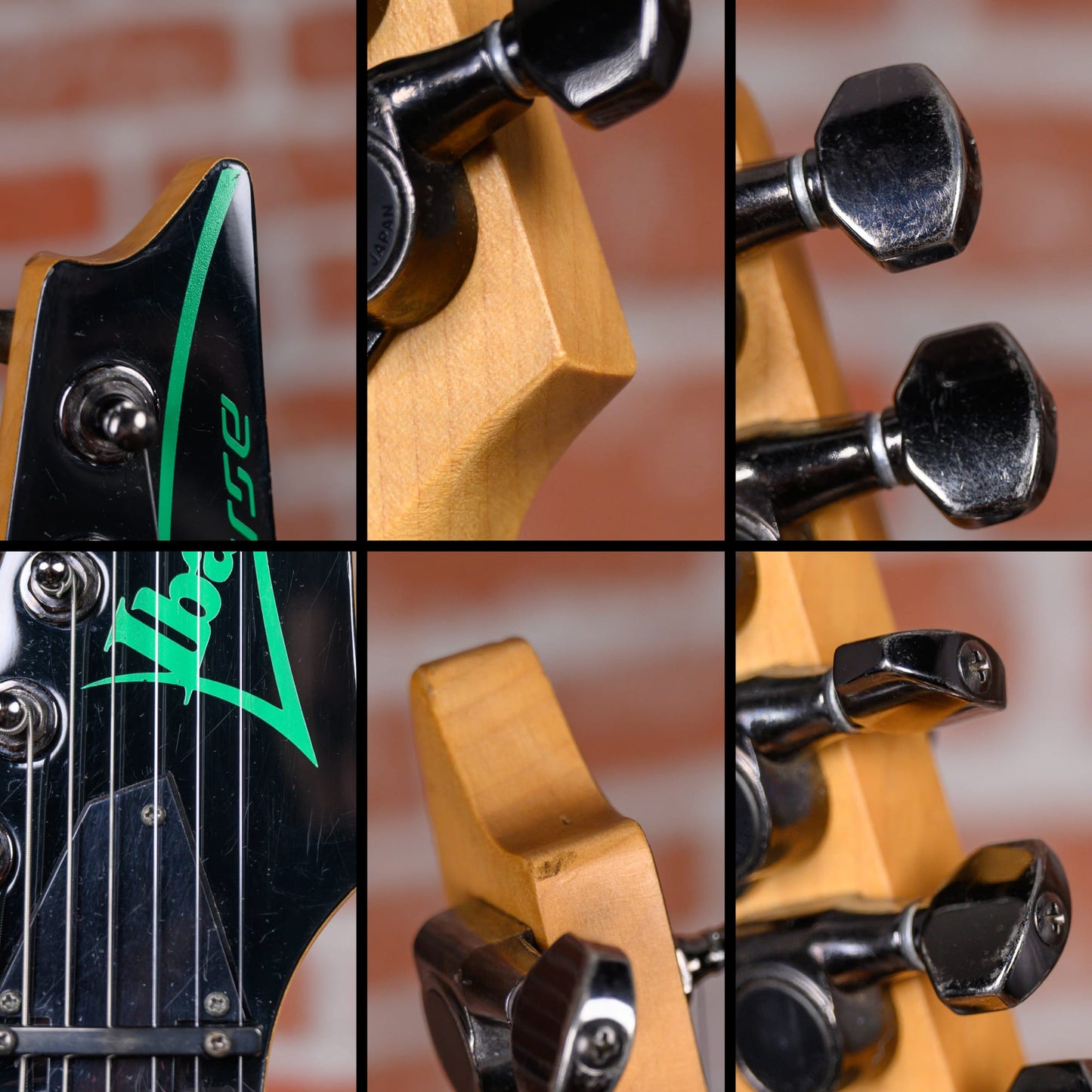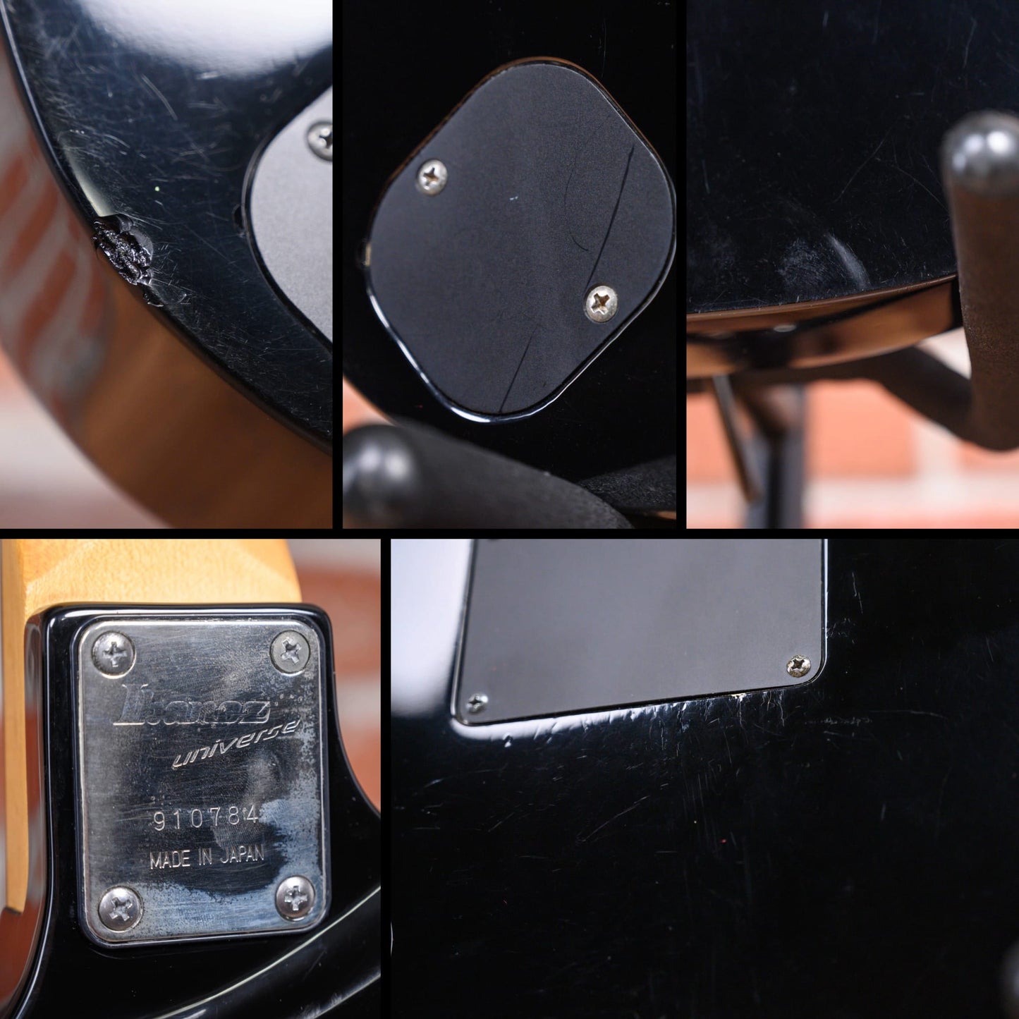 Ibanez UV7 Steve Vai Signature in Black finish made in 1991 with Original Hard Shell Case. This guitar features a solid basswood body, 2-piece maple neck and rosewood fingerboard with a color matched headstock. Equipped with a set of green Ibanez Blaze II humbuckers in the neck and bridge position and an Ibanez Blaze II single coil in the middle position. Controlled by 1 volume pot, 1 tone pot and a 5-way blade switch. The 25.5" scale length neck has green dot inlays and white side markers with 24 jumbo frets on a 430mm radius with a UV profile. The hardware is comprised of cosmo black Gotoh sealed die-cast tuning machines with cloche heads, a Top Lok III nut, an Ibanez Lo Pro Edge 7 Double Locking Tremolo bridge and green top hat knobs with a 3 ply black on green pickguard.