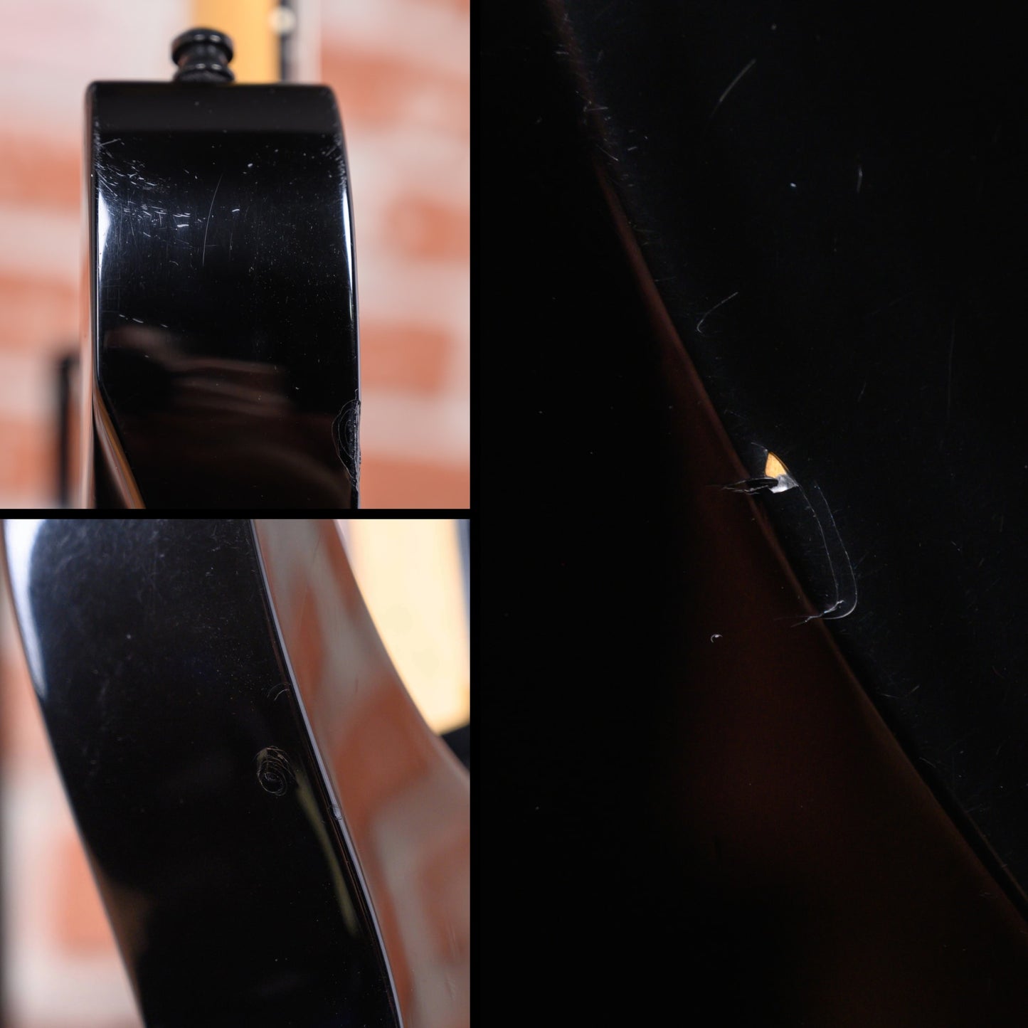 This guitar is in overall very good condition. The body has some dents on all sides including a couple of small finish chips. There are surface marks and light scuffs throughout. The fretboard has some light indentations and the pickguard/pickups show light marks and signs of play. The plating on the hardware shows some wear. (See pics)