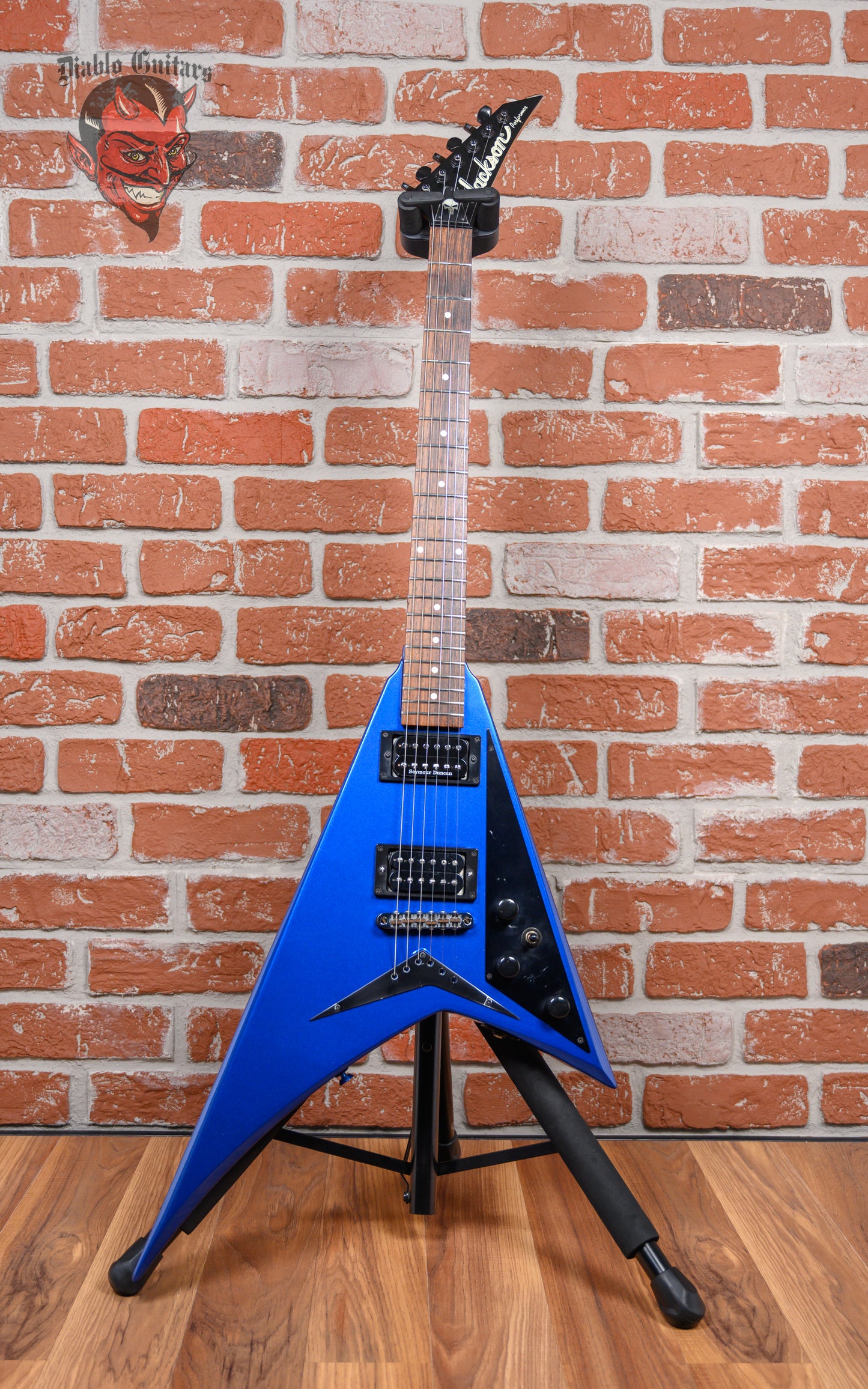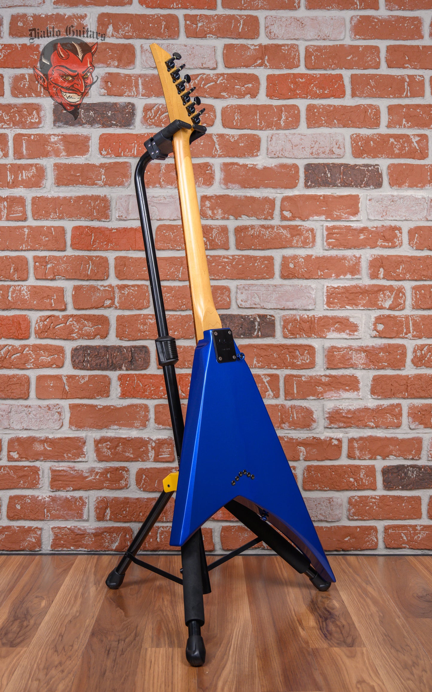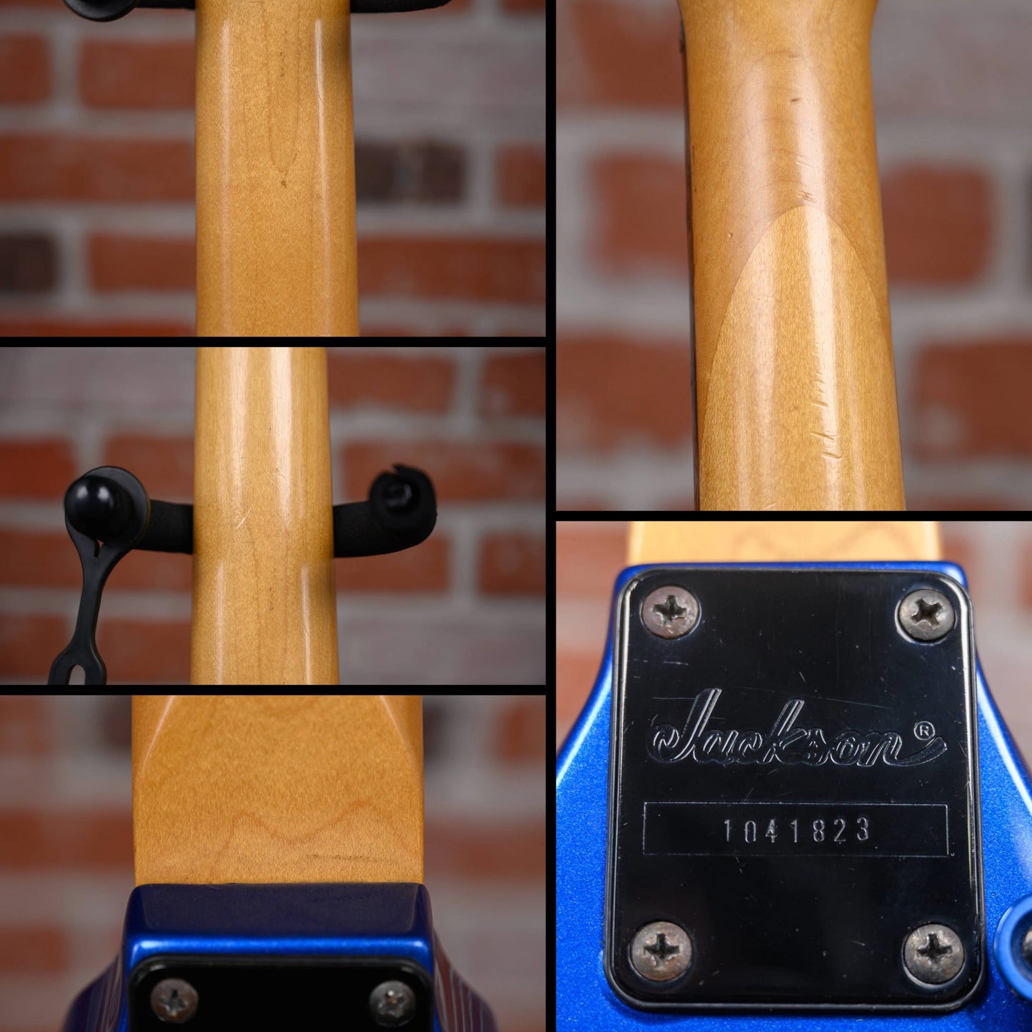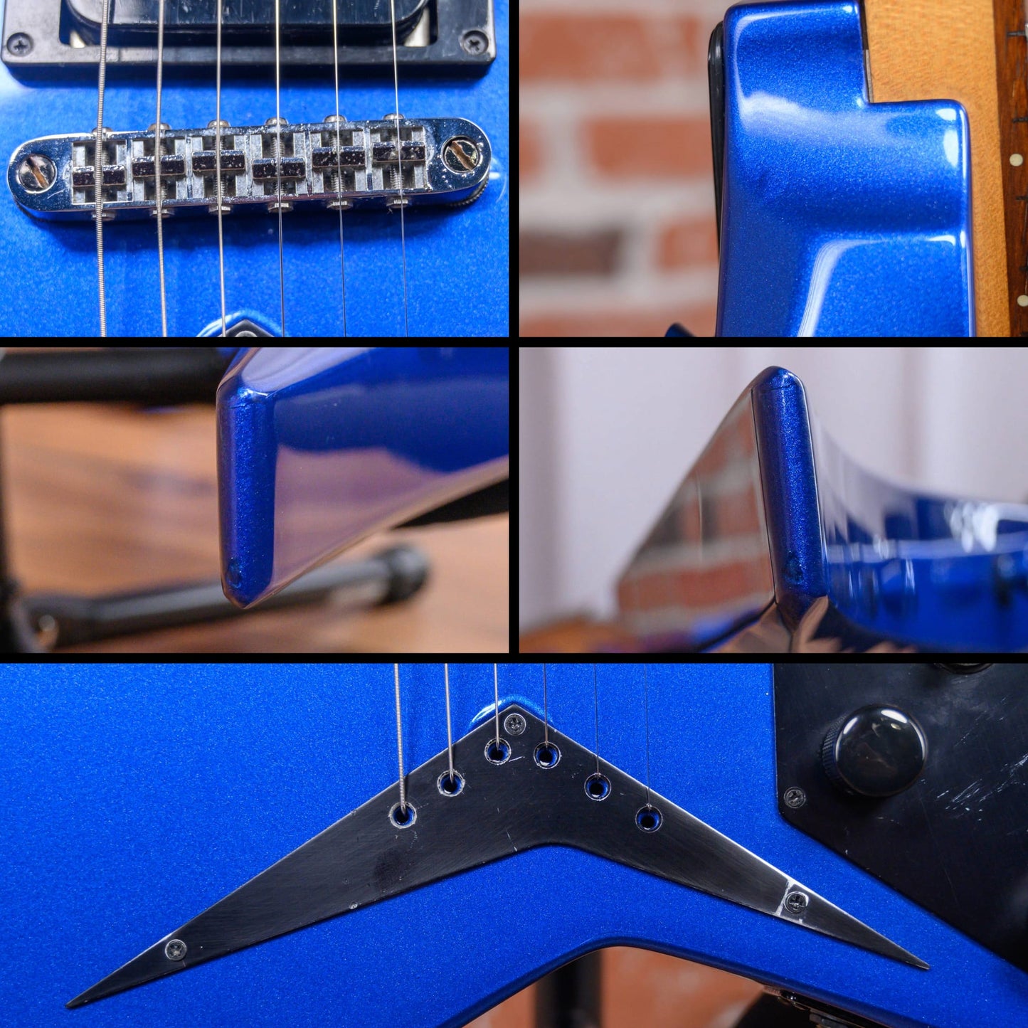 Jackson MIJ Rhoads Performer in Metallic Blue finish (Refin) made in 1990s with Jackson Fitted Foam Core Case. This guitar features a solid basswood body, maple neck and rosewood fingerboard. Equipped with a Seymour Duncan SH-4 in the neck position and a Seymour Duncan SH-1B in the bridge position. Controlled by 2 volume pots, 1 tone pot and a 3-Way toggle switch. The 25.5" scale length neck has white dot inlays and white side markers with 22 jumbo frets on a compound 12"-16" radius with a speed profile. The hardware is comprised of black Jackson sealed die-cast tuning machines with cloche heads, a plastic nut, a Tune-O-Matic bridge w/ strings thru body and black knurled dome knobs with a black anodized pickguard.
