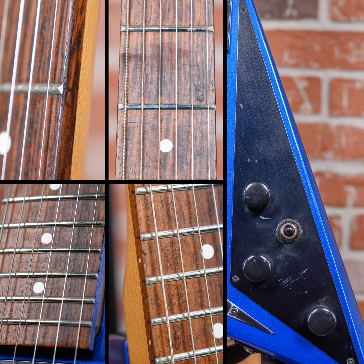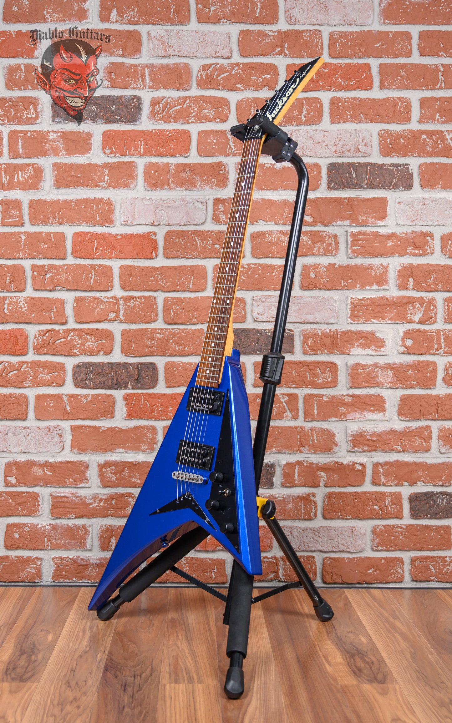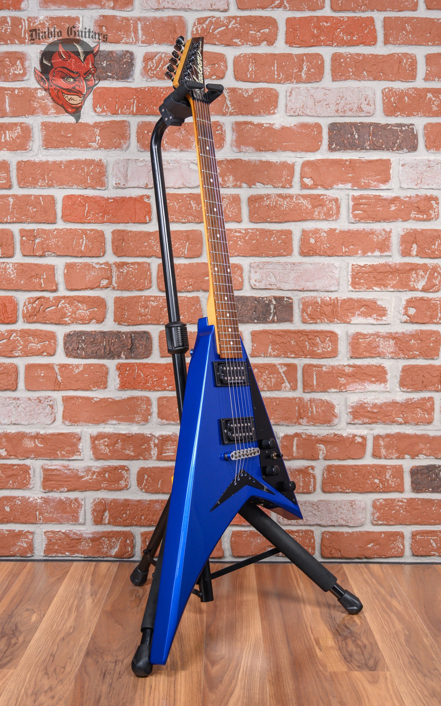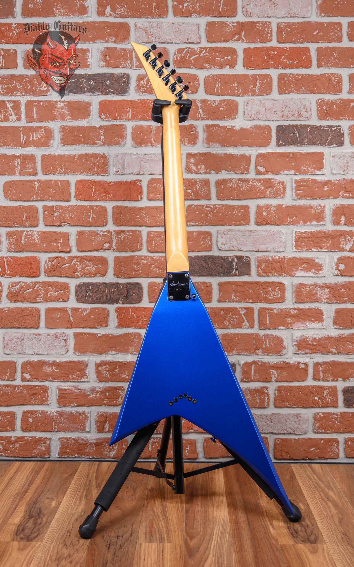 Jackson MIJ Rhoads Performer in Metallic Blue finish (Refin) made in 1990s with Jackson Fitted Foam Core Case. This guitar features a solid basswood body, maple neck and rosewood fingerboard. Equipped with a Seymour Duncan SH-4 in the neck position and a Seymour Duncan SH-1B in the bridge position. Controlled by 2 volume pots, 1 tone pot and a 3-Way toggle switch. The 25.5" scale length neck has white dot inlays and white side markers with 22 jumbo frets on a compound 12"-16" radius with a speed profile. The hardware is comprised of black Jackson sealed die-cast tuning machines with cloche heads, a plastic nut, a Tune-O-Matic bridge w/ strings thru body and black knurled dome knobs with a black anodized pickguard.